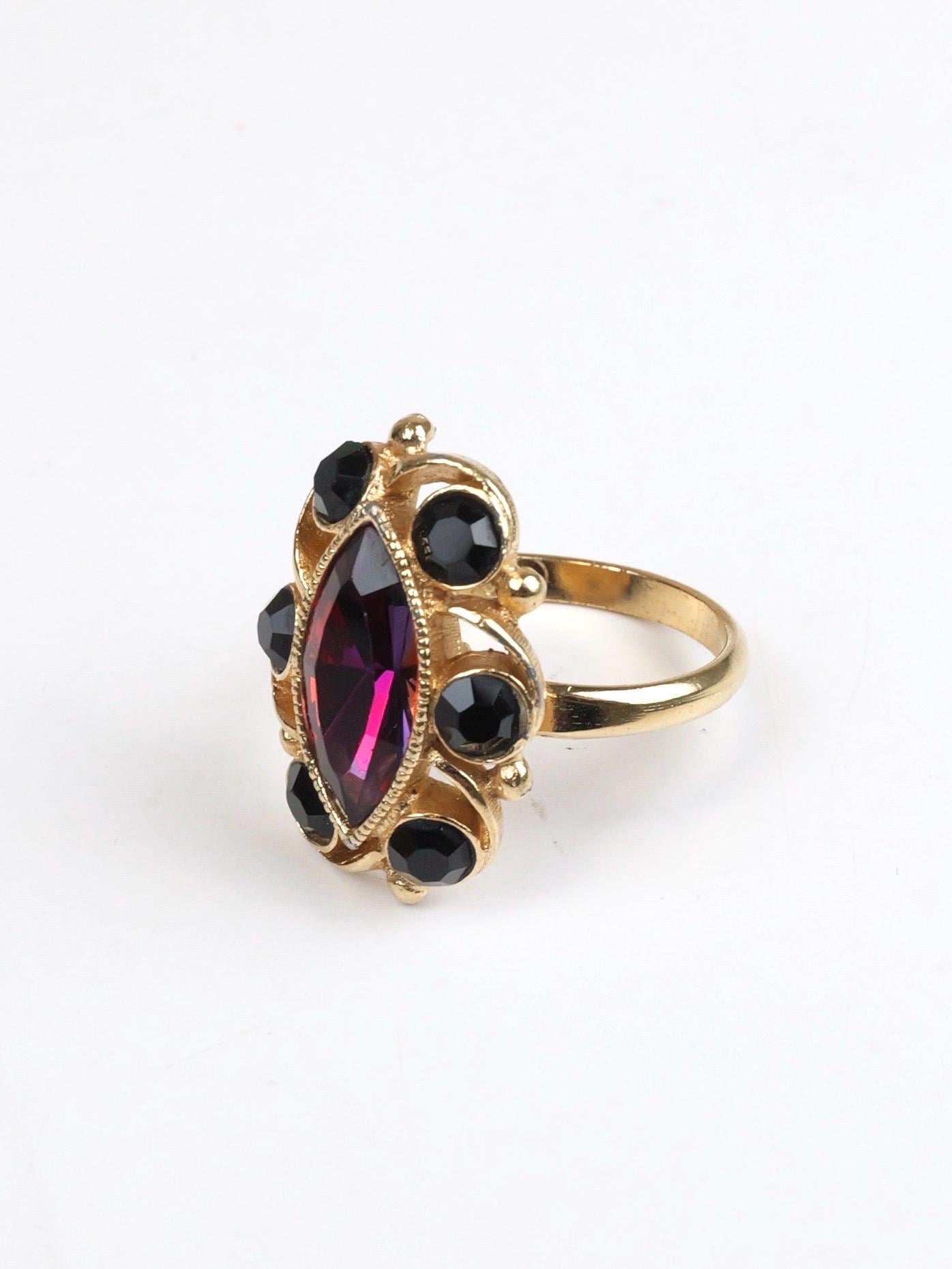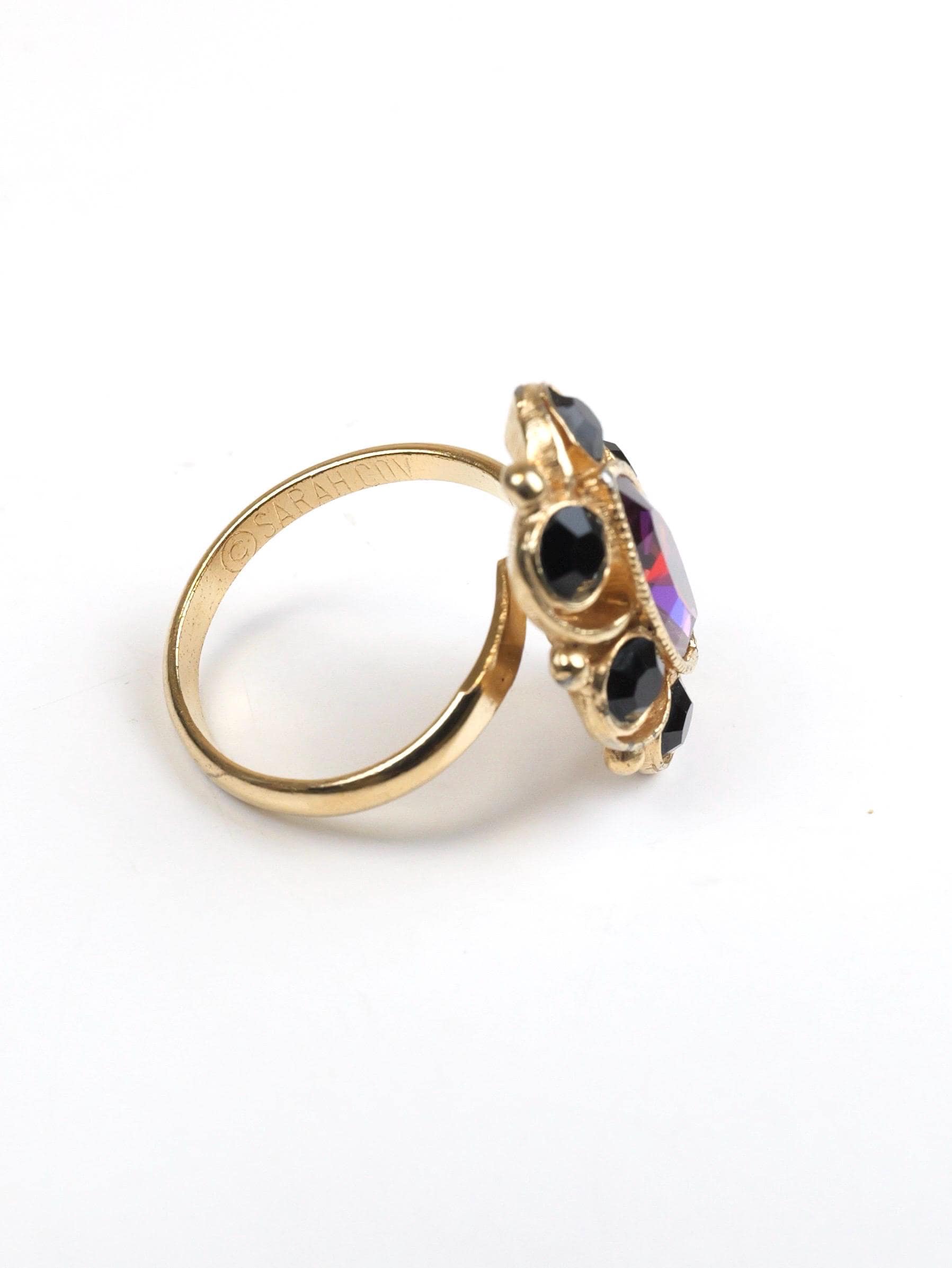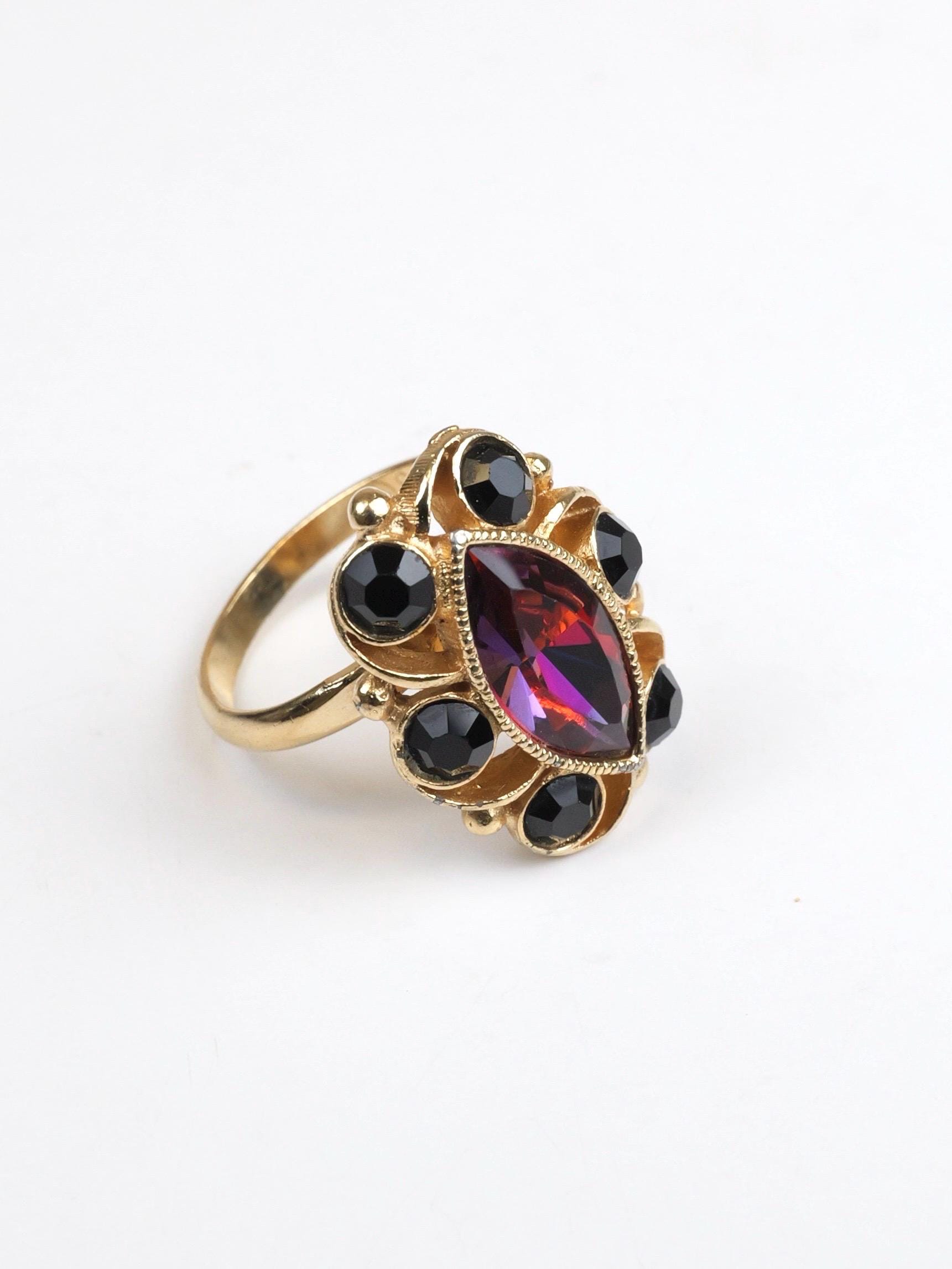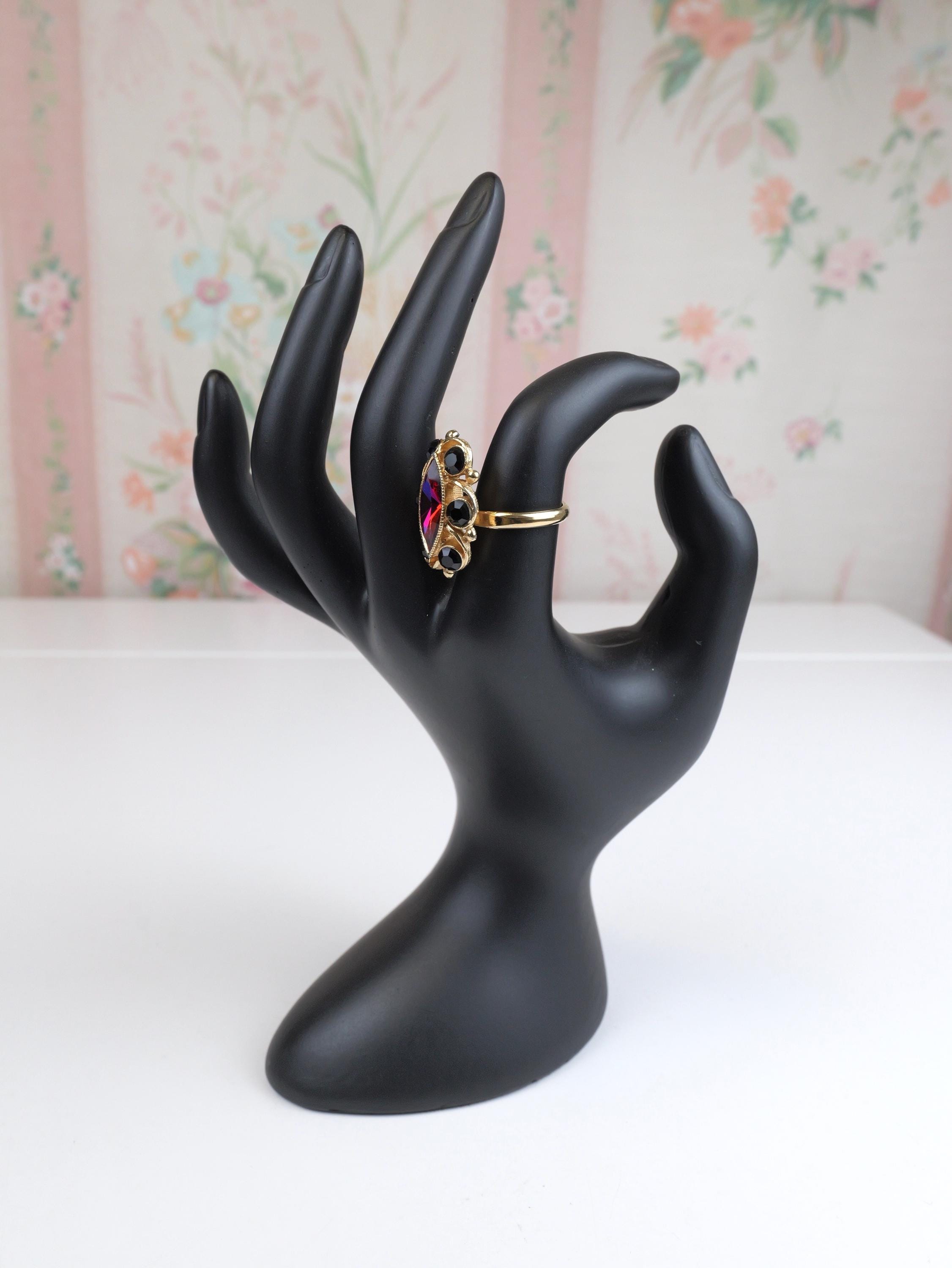 Vintage Signed “SARAH COVENTRY” Java ring, issued in 1974. Adjustable size. This is a lovely ring comprised of a purple marquise stone surrounded by black round rhinestones. All in a gold tone metal. In very very good condition. The face measures 1” x 3/4”. Adjustable size ring, split shank.