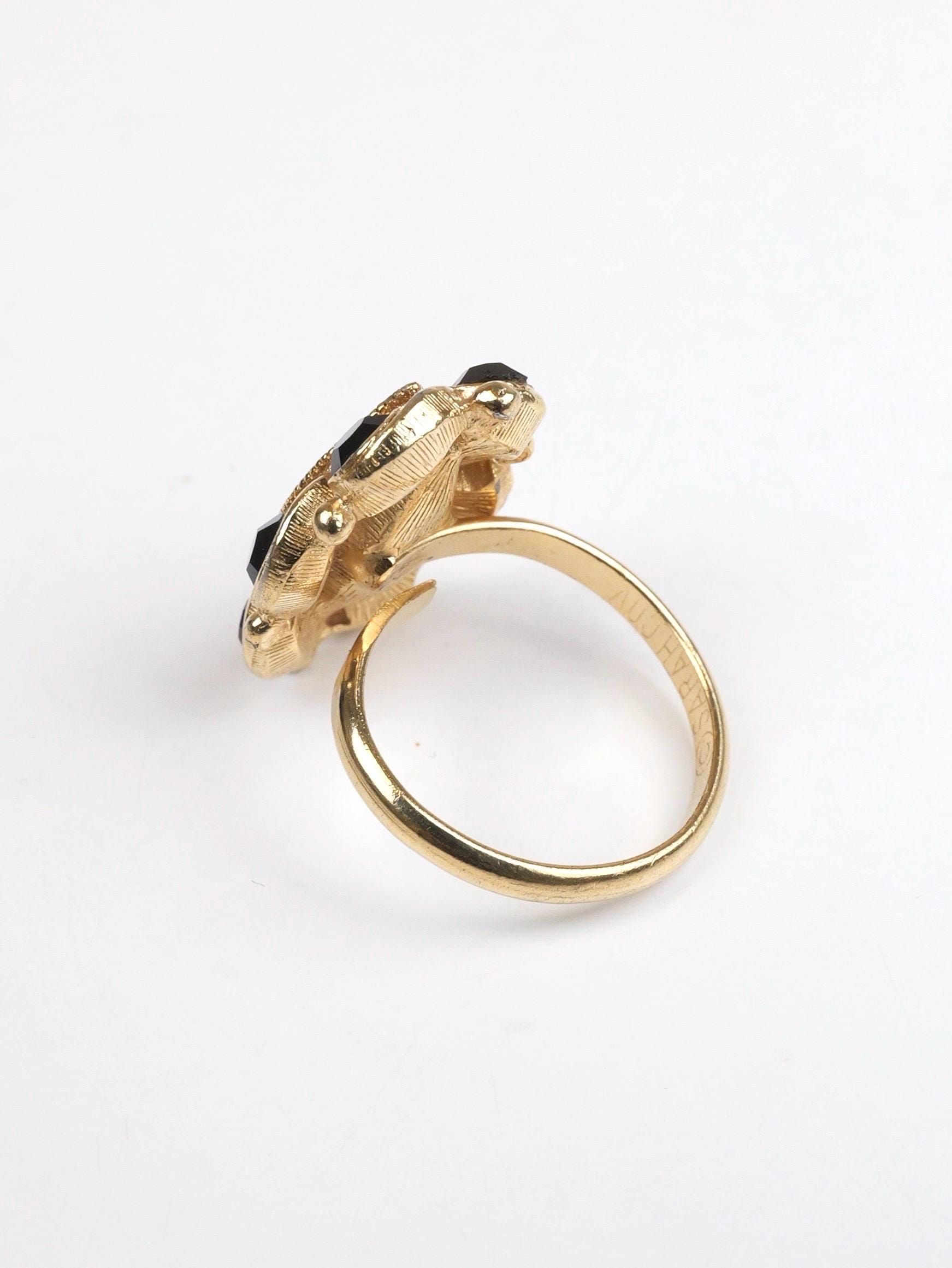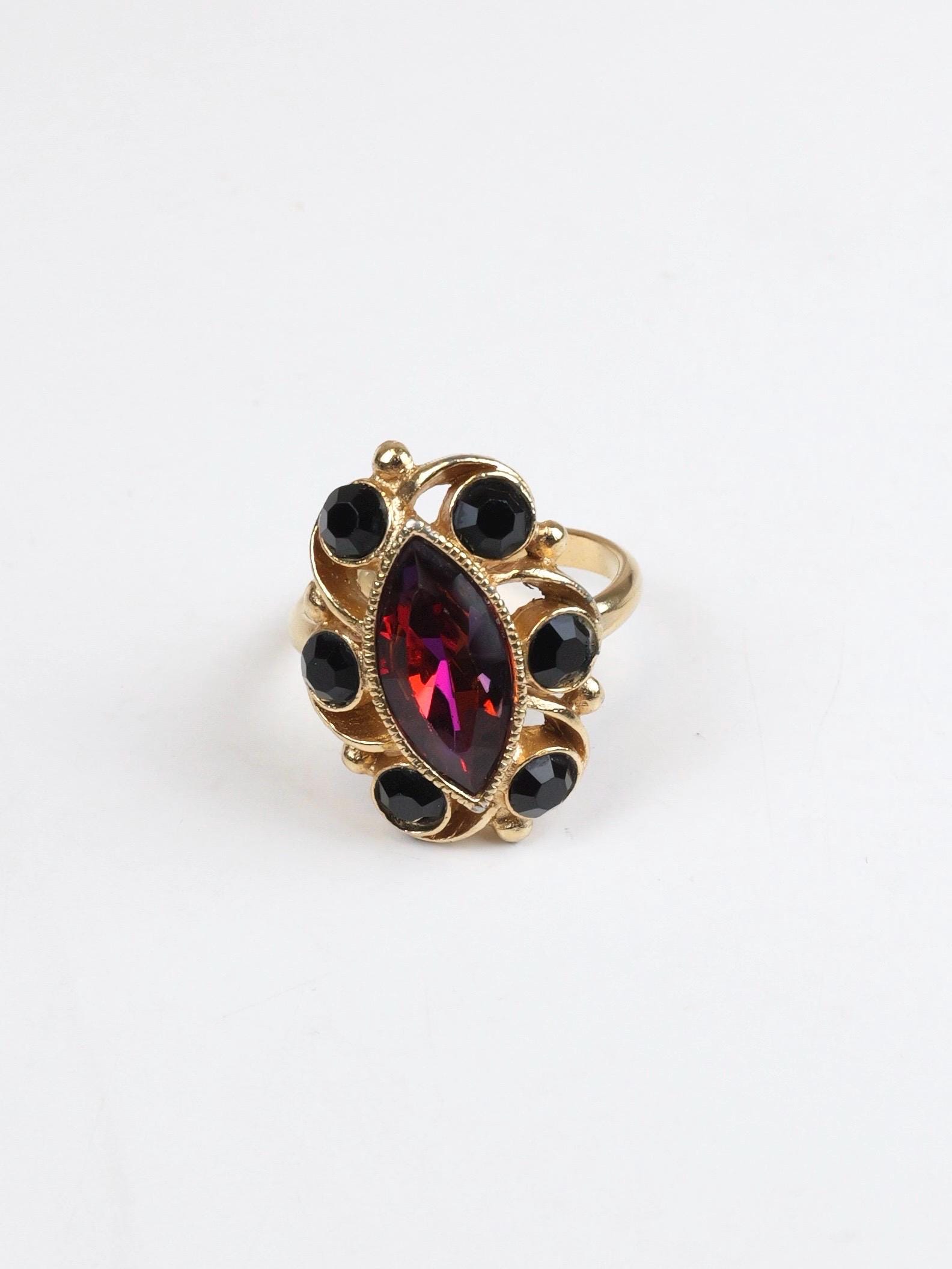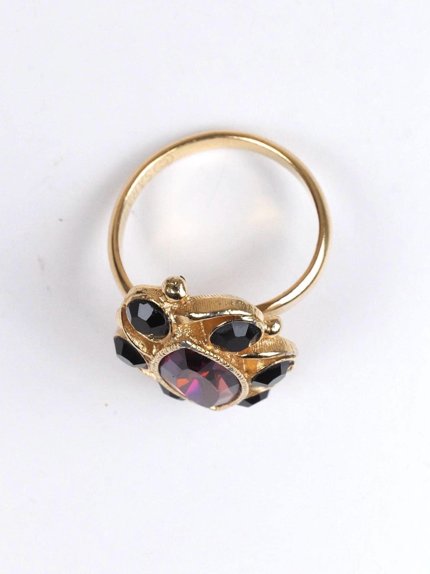 Vintage Signed “SARAH COVENTRY” Java ring, issued in 1974. Adjustable size. This is a lovely ring comprised of a purple marquise stone surrounded by black round rhinestones. All in a gold tone metal. In very very good condition. The face measures 1” x 3/4”. Adjustable size ring, split shank.