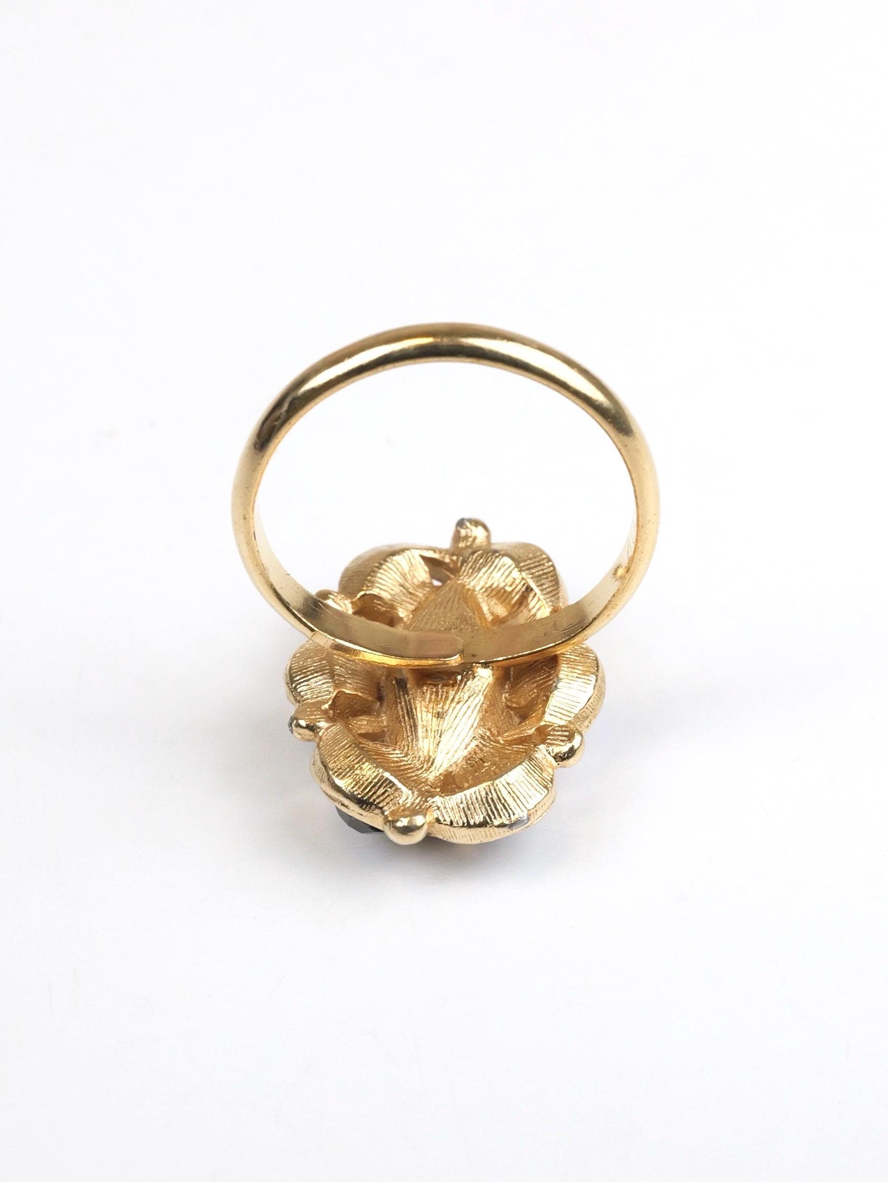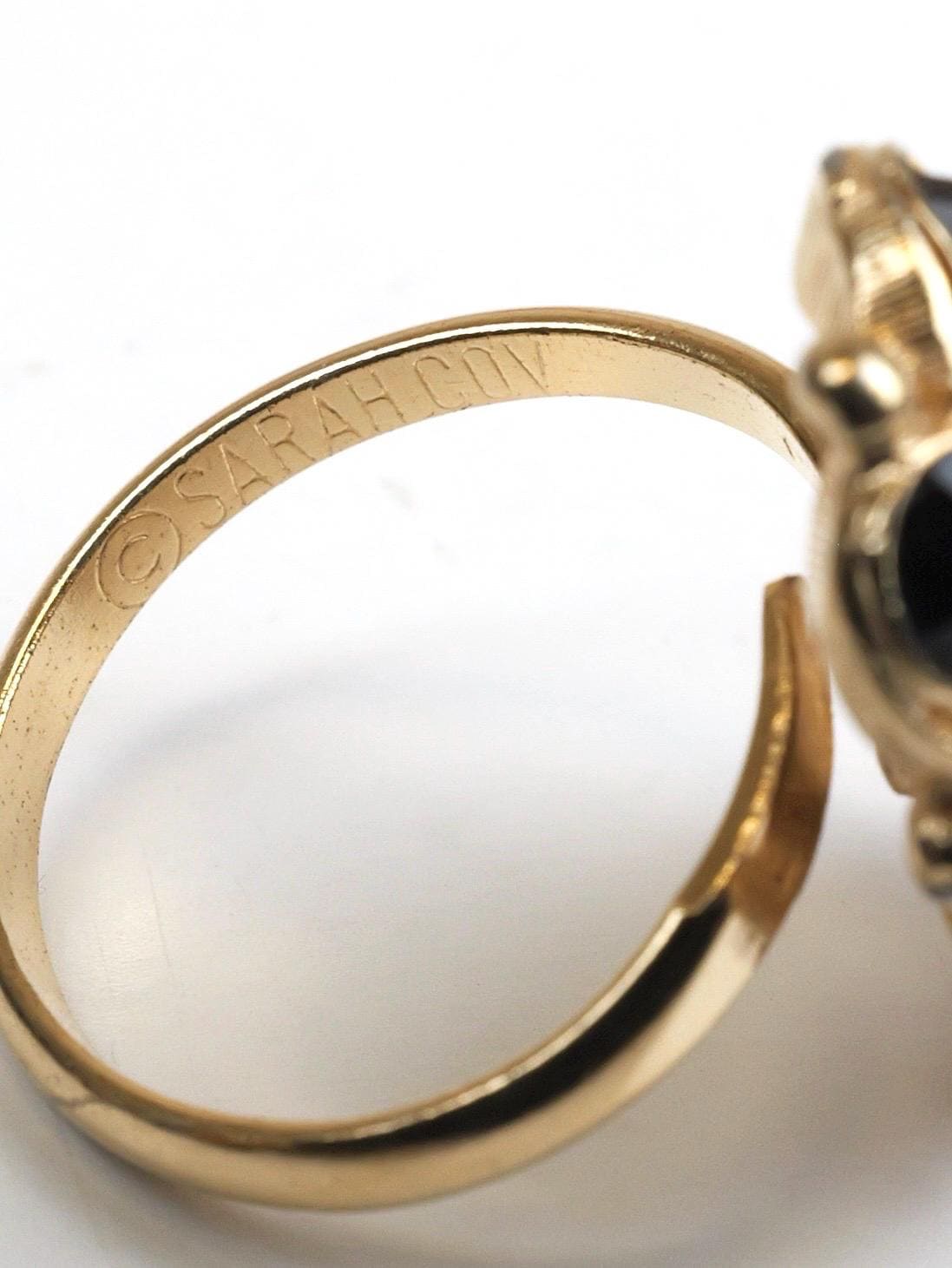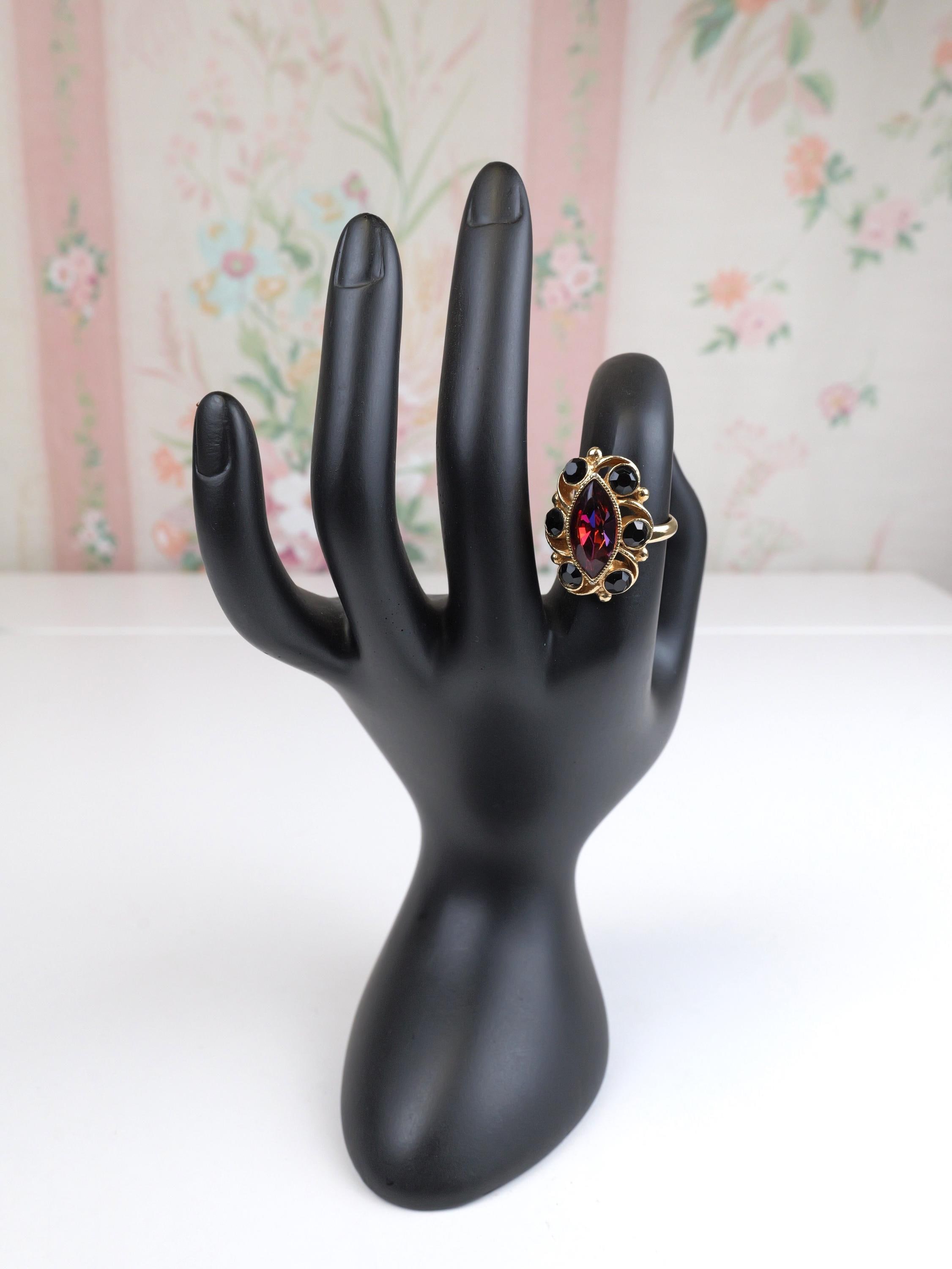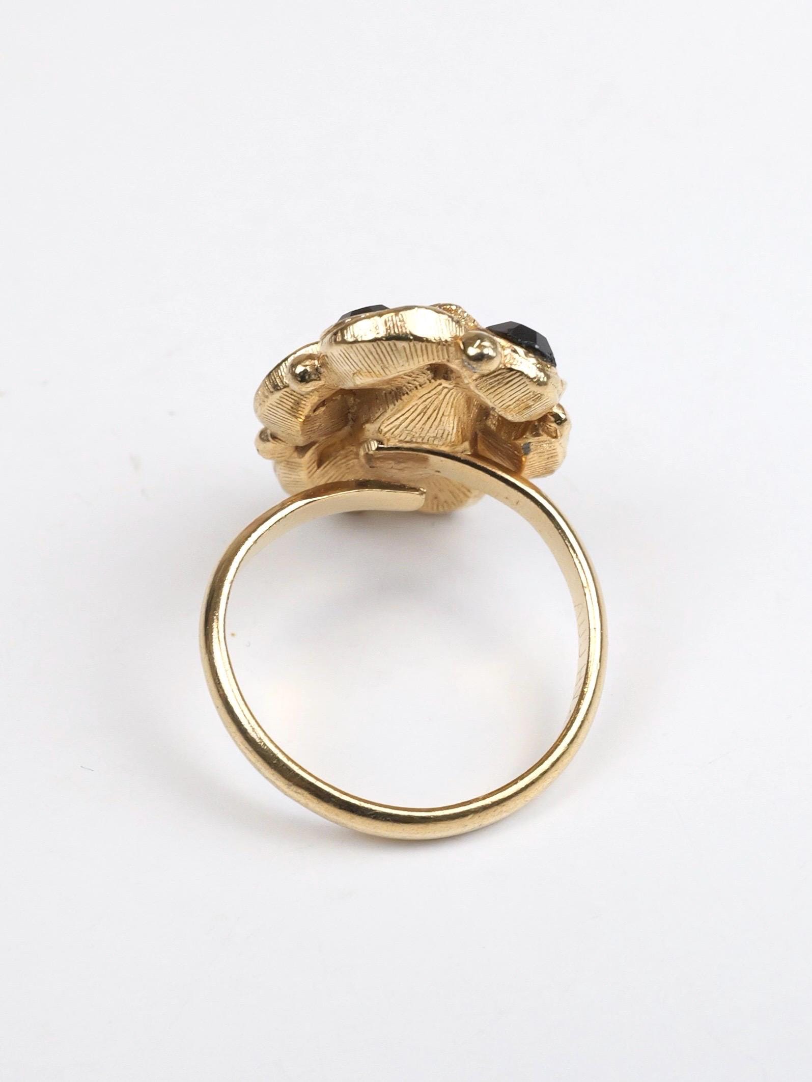 Vintage Signed “SARAH COVENTRY” Java ring, issued in 1974. Adjustable size. This is a lovely ring comprised of a purple marquise stone surrounded by black round rhinestones. All in a gold tone metal. In very very good condition. The face measures 1” x 3/4”. Adjustable size ring, split shank.