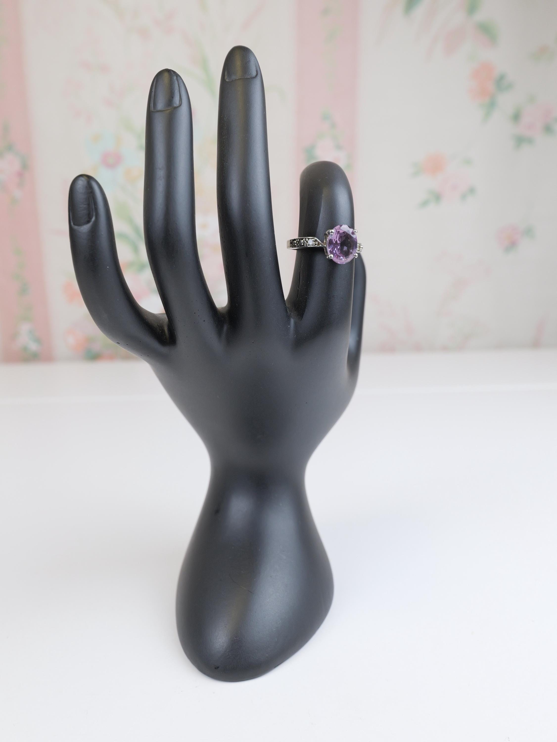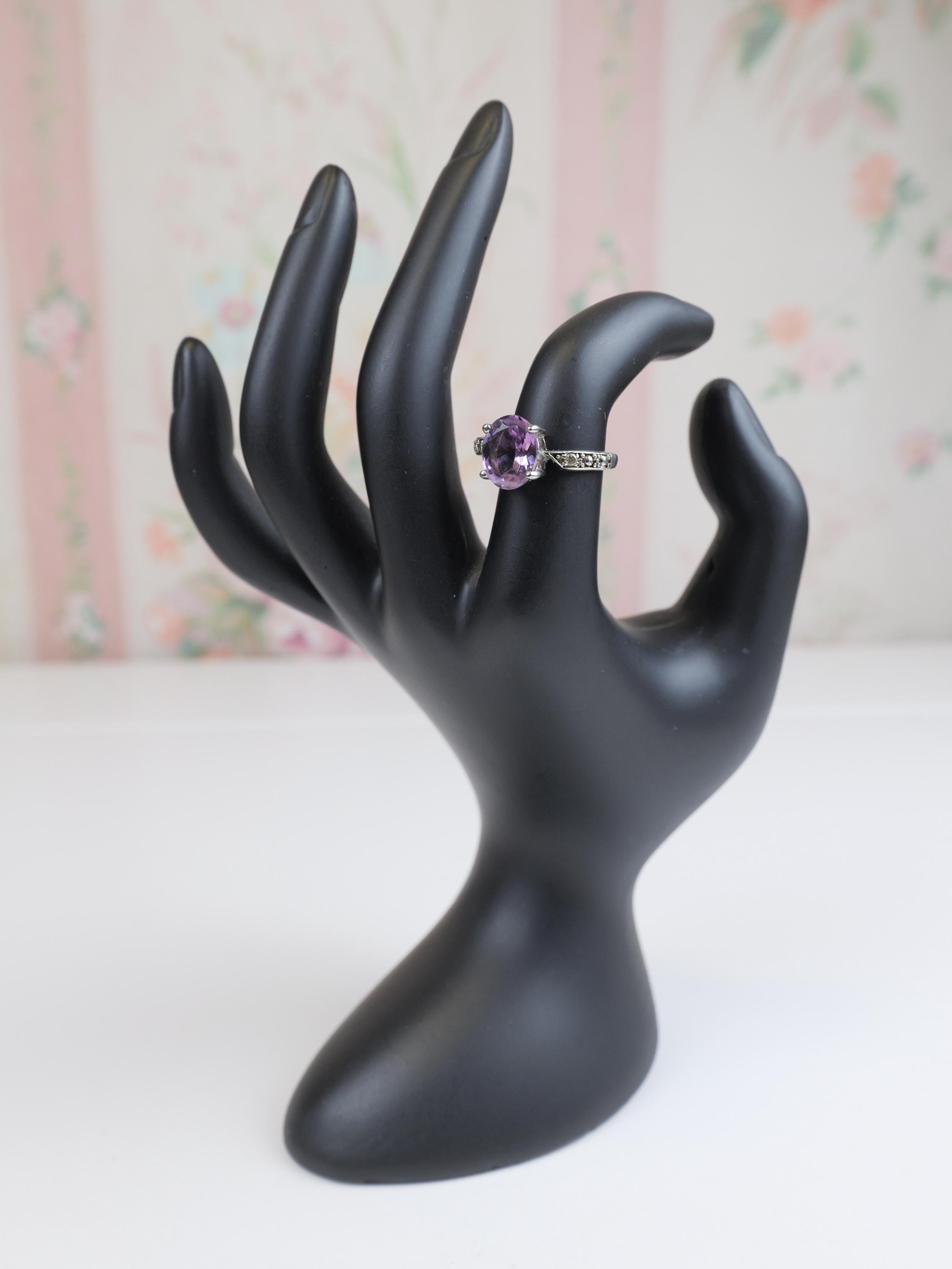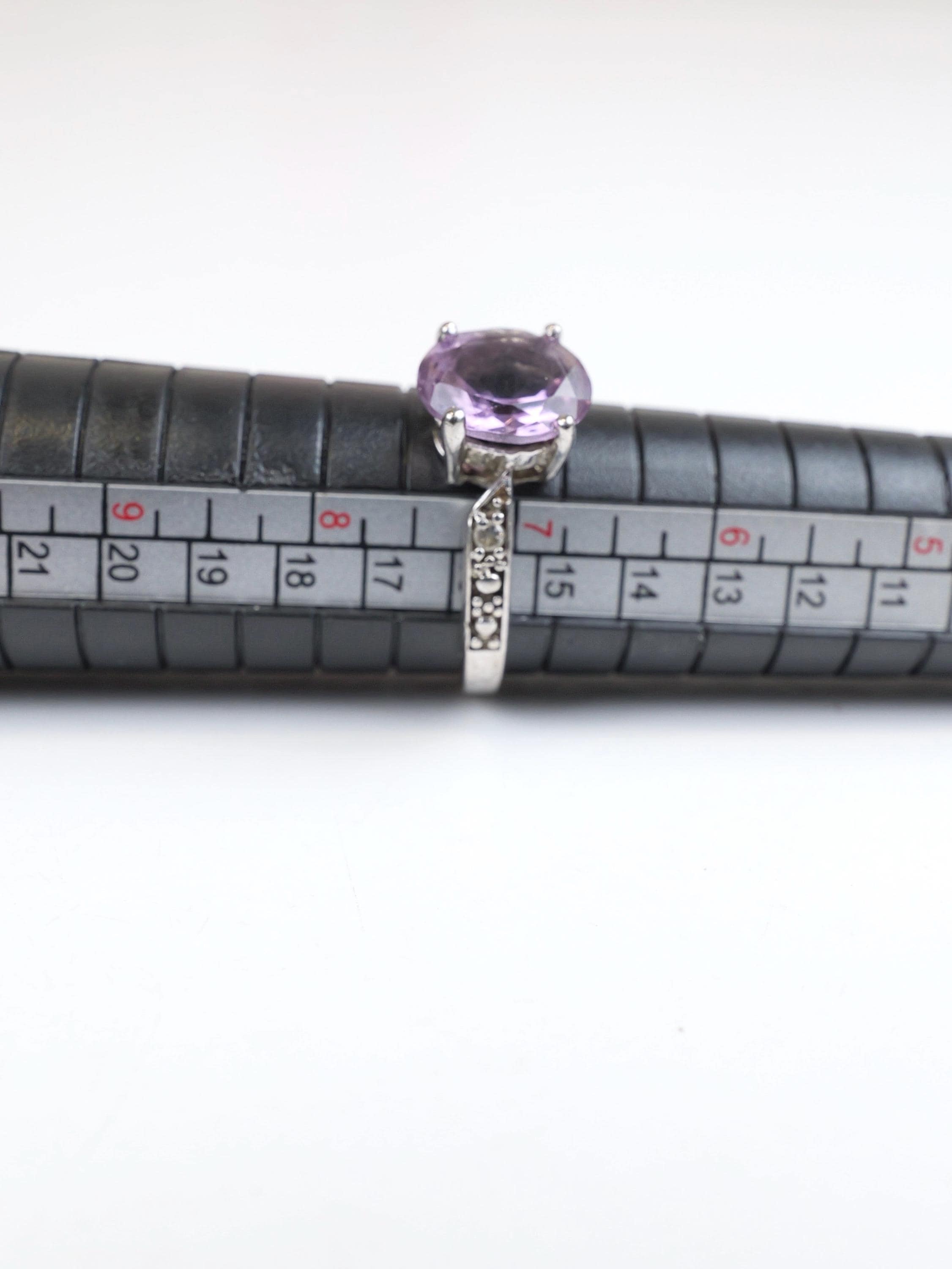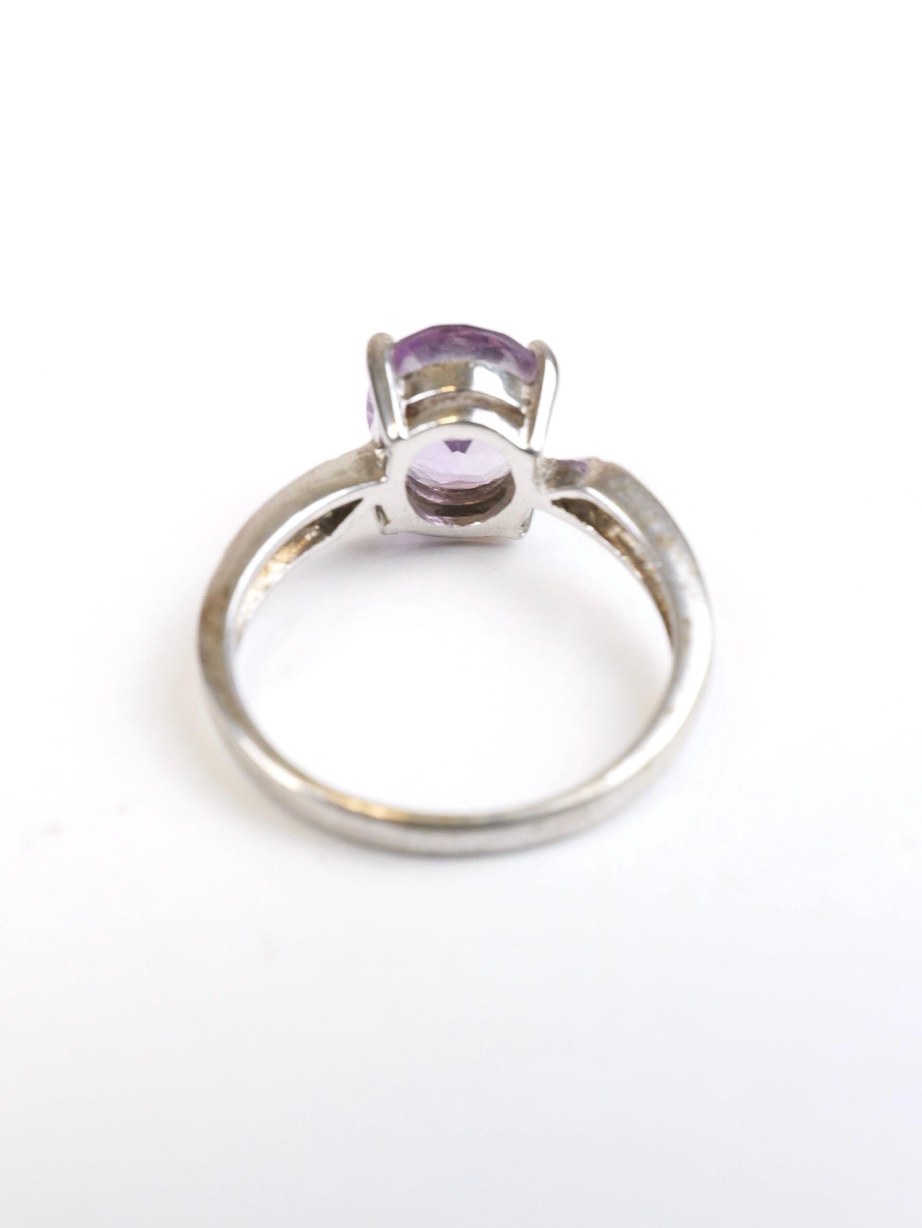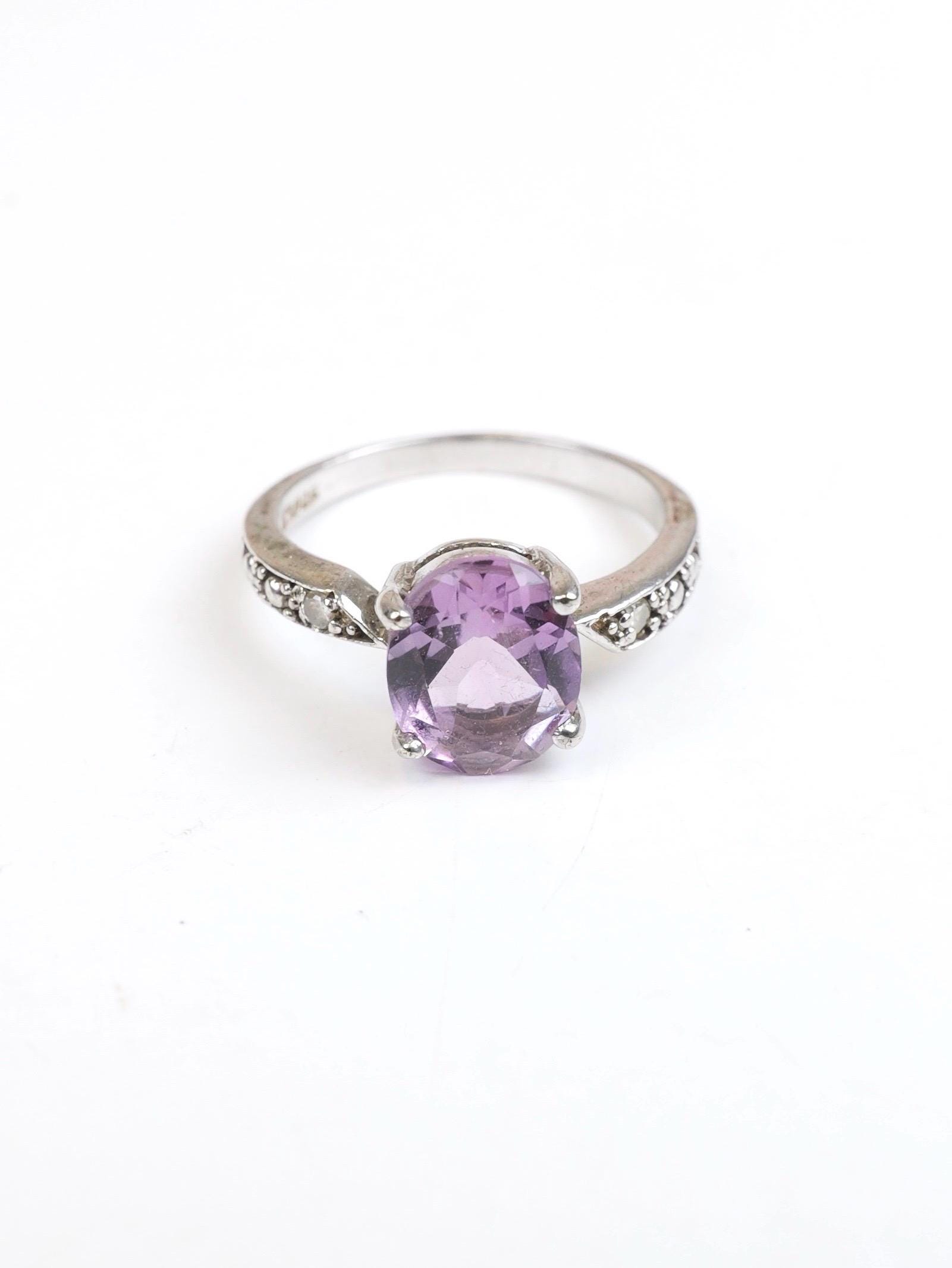 Slim band. The amethyst stone is oval shaped and brilliant cut, purple pink in colour.