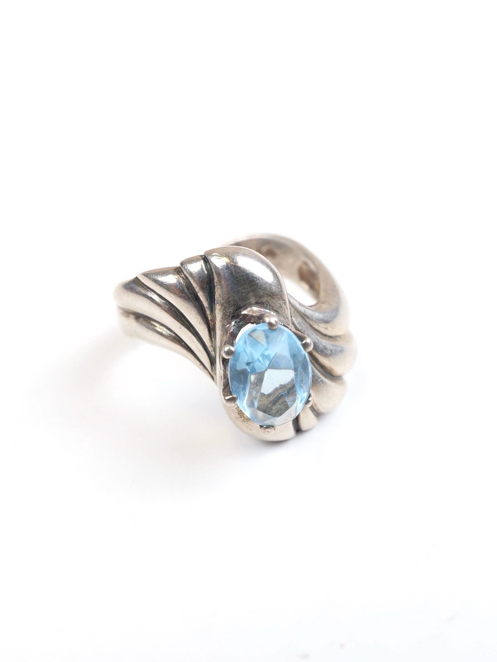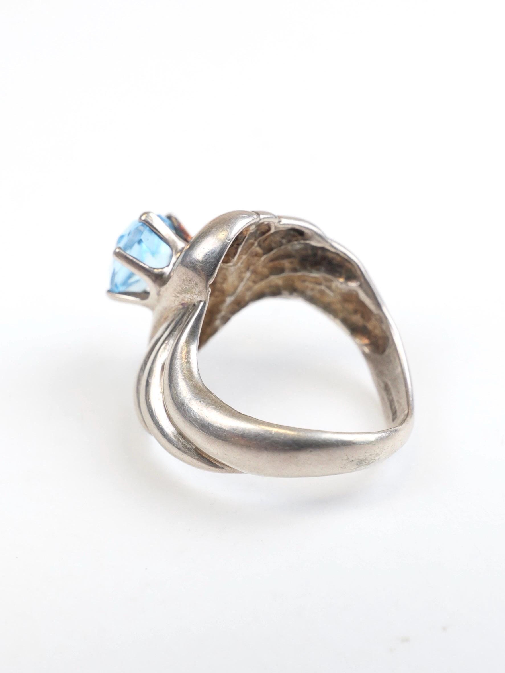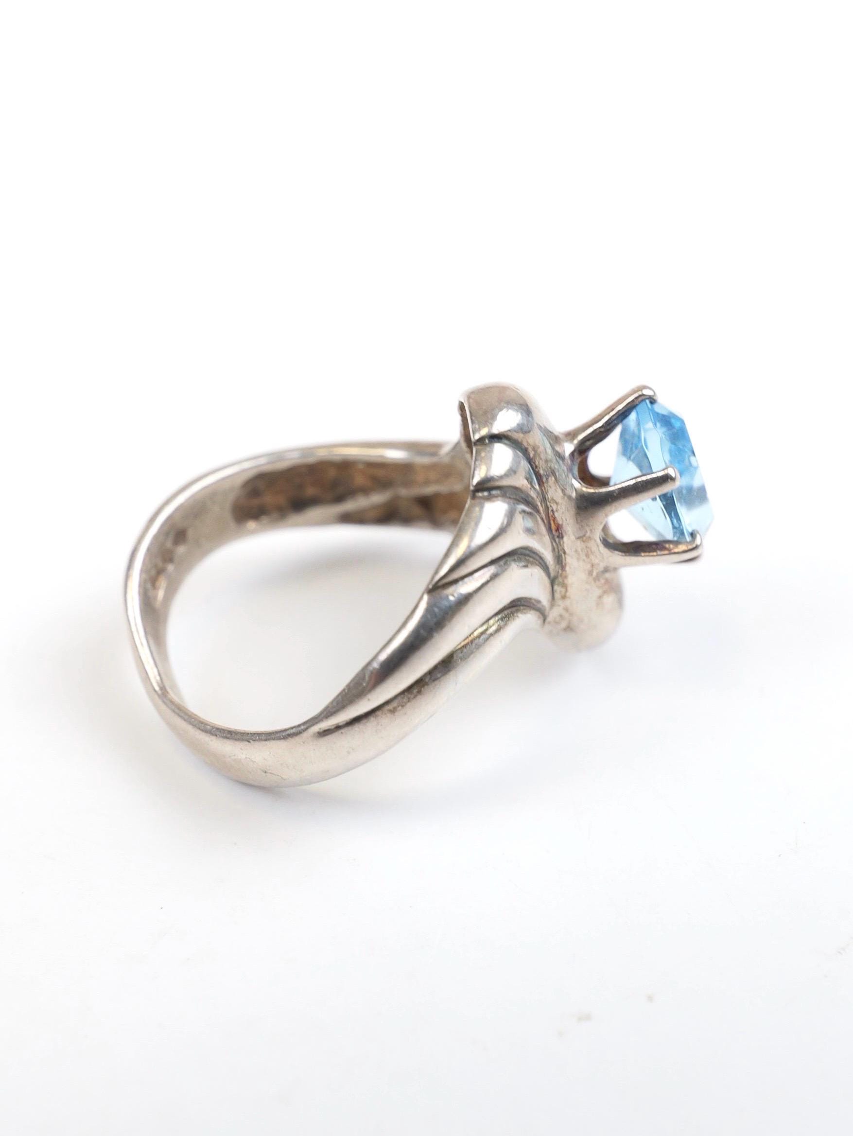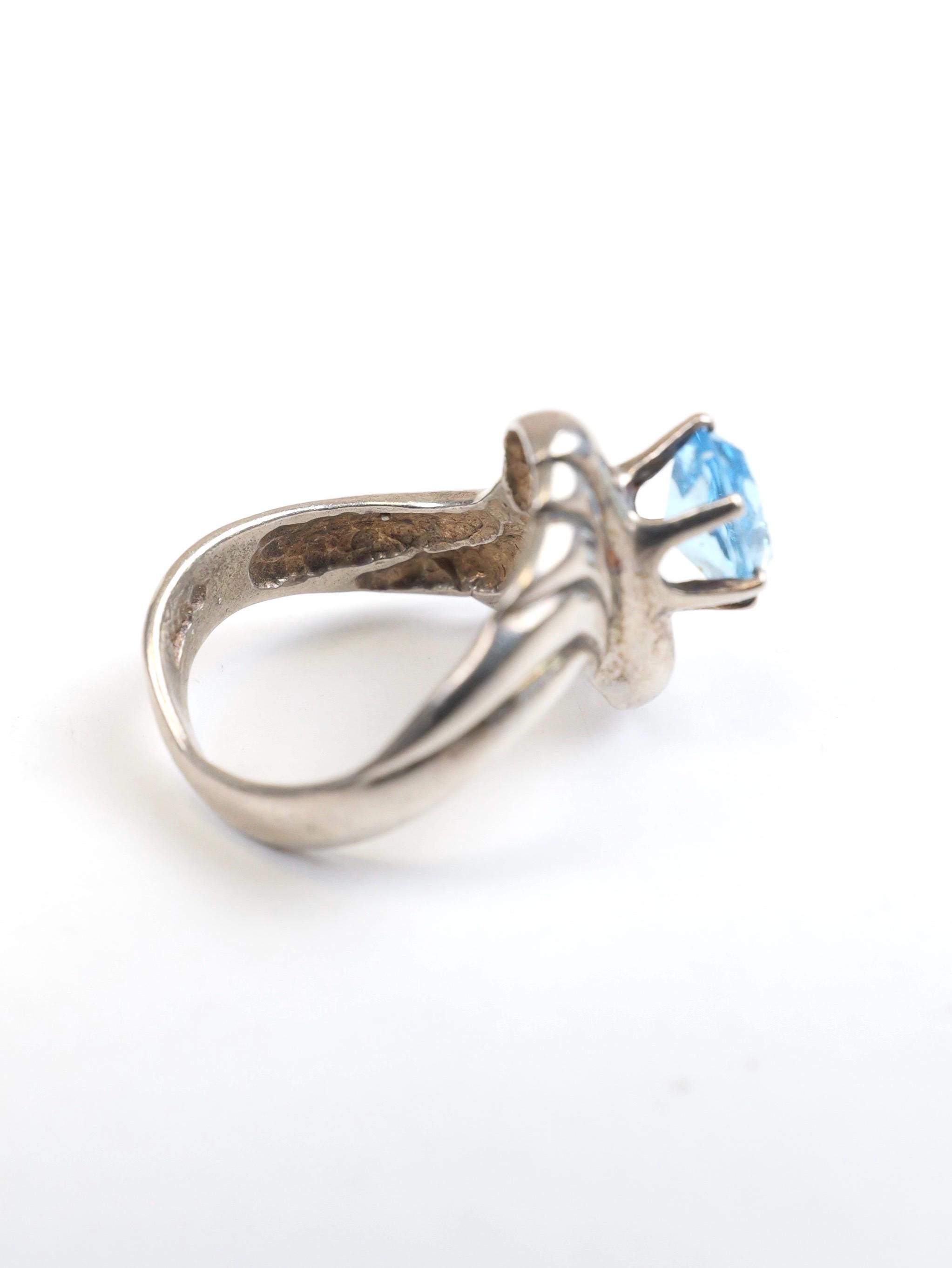 Swirly unique and pretty vintage 1970's sterling silver faceted blue glass stone ring. Thinner shank wider setting. Little bit tarnished in the crevices. Stone is scratch free and in a high setting. Open back setting allowing light to shine through the stone. In very good condition. Some surface scratching on the setting from use and age. Size 5 1/4.