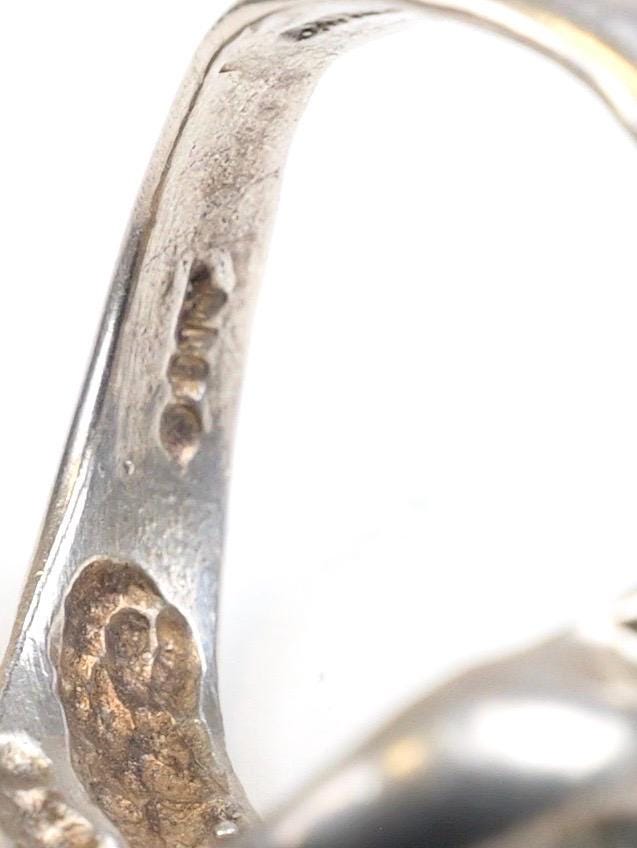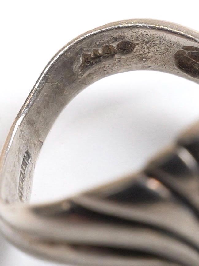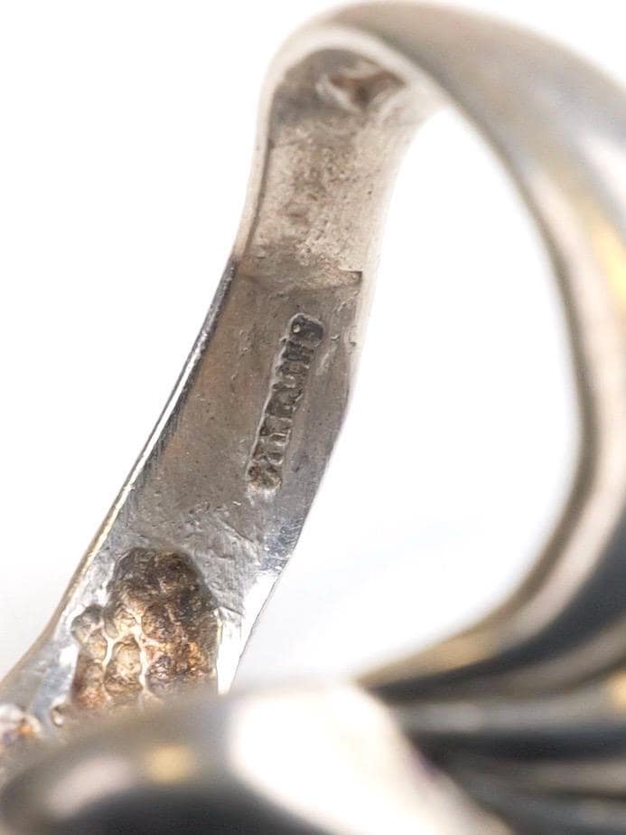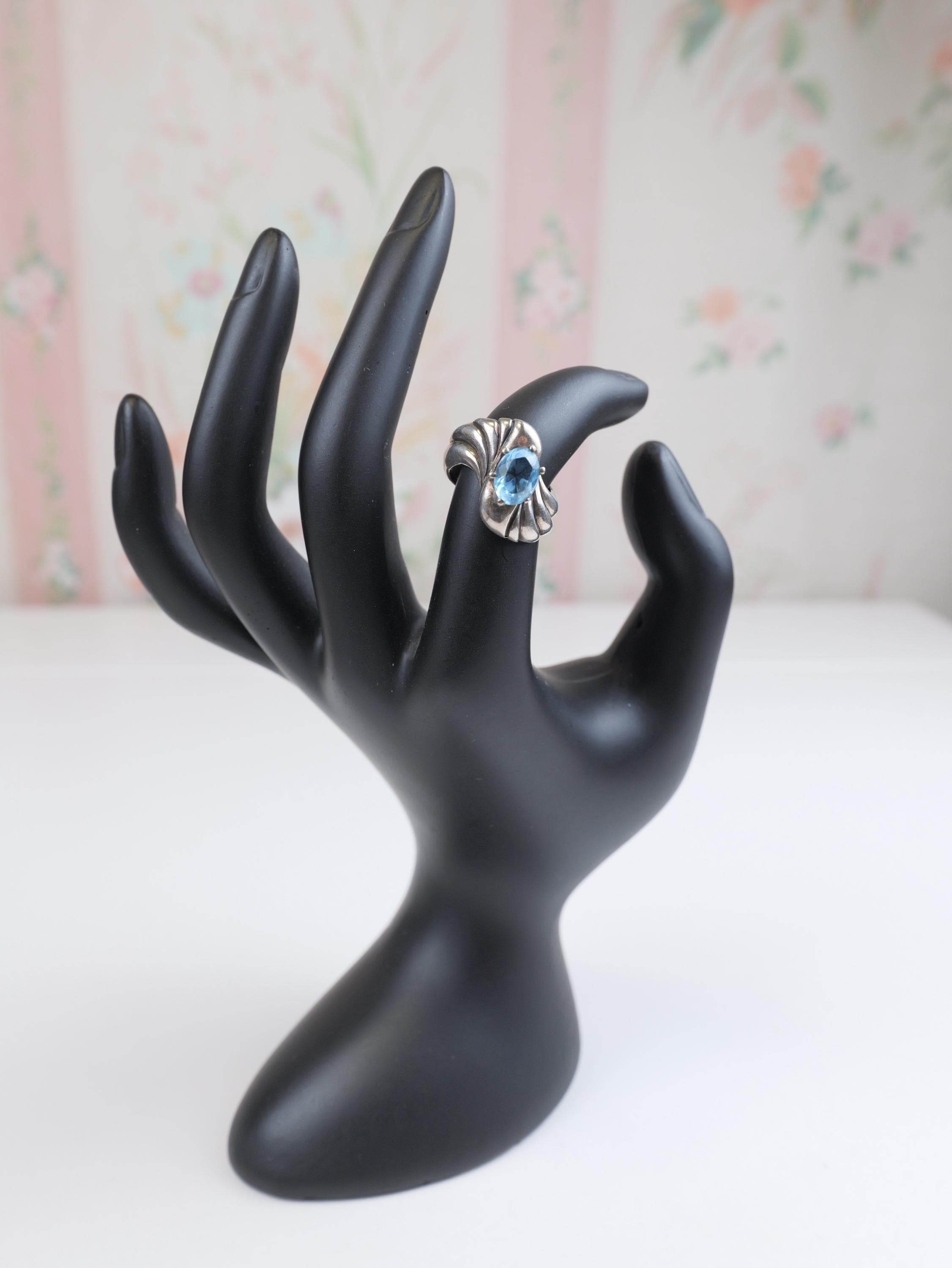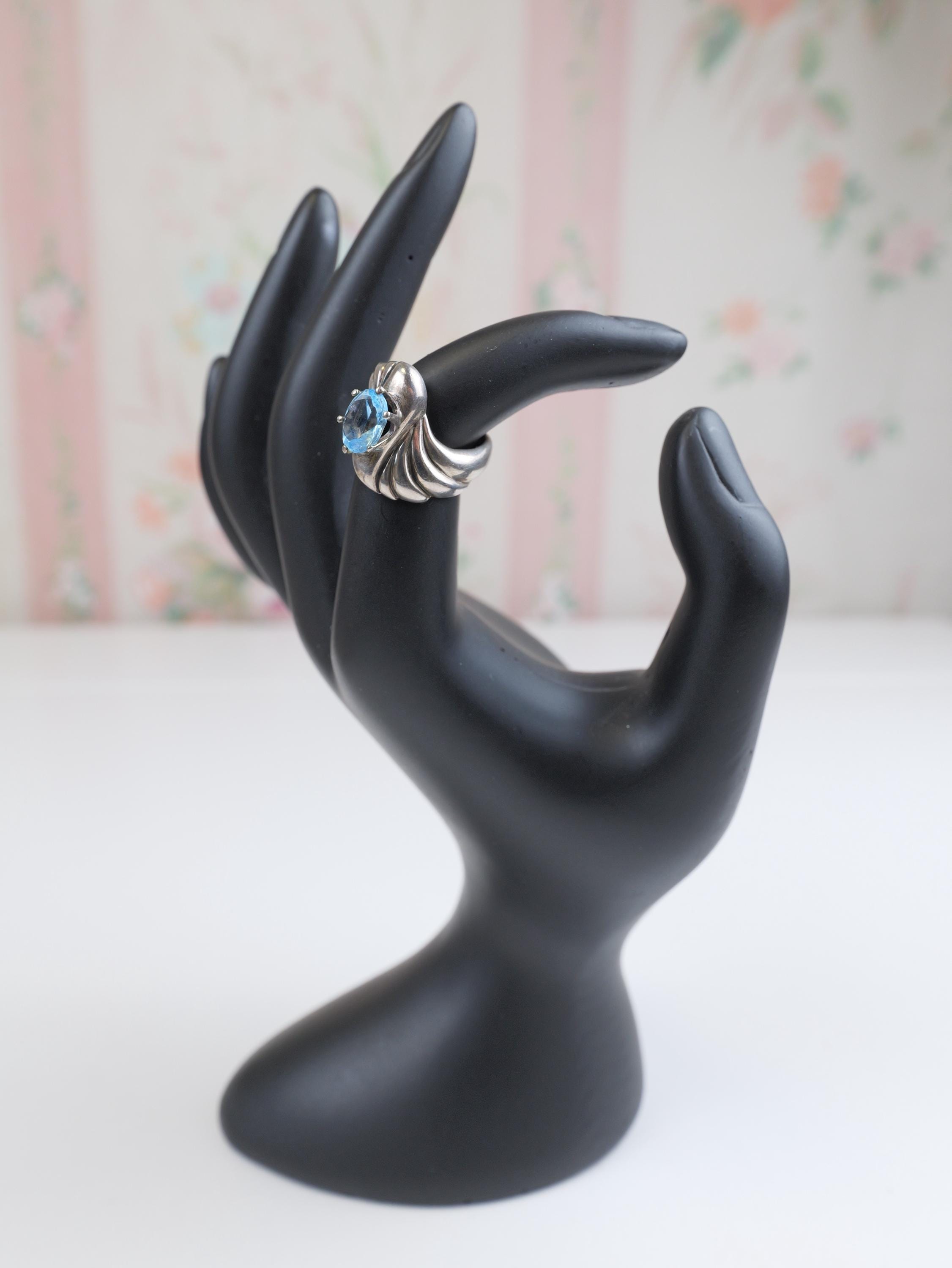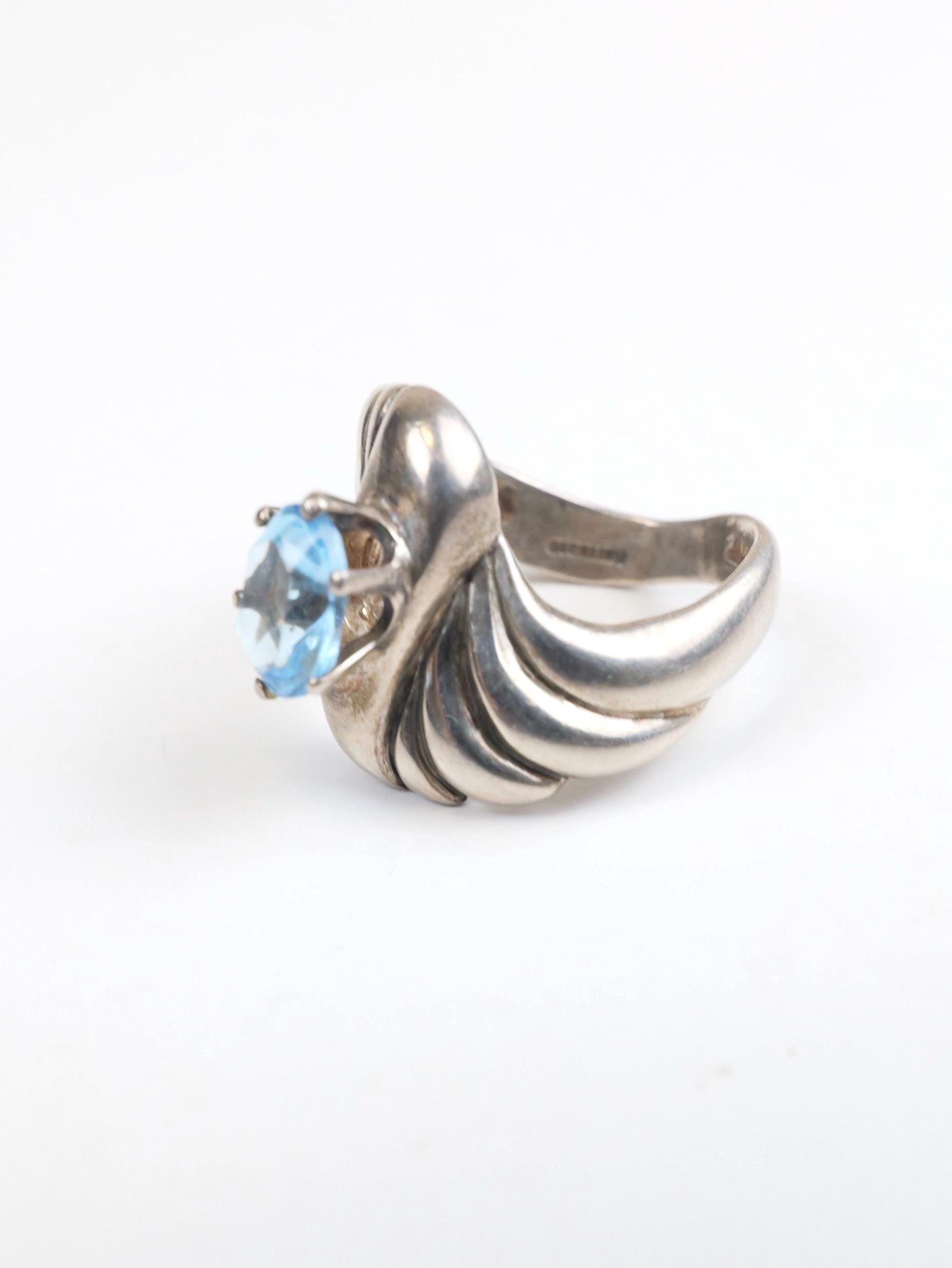 Swirly unique and pretty vintage 1970's sterling silver faceted blue glass stone ring. Thinner shank wider setting. Little bit tarnished in the crevices. Stone is scratch free and in a high setting. Open back setting allowing light to shine through the stone. In very good condition. Some surface scratching on the setting from use and age. Size 5 1/4.
