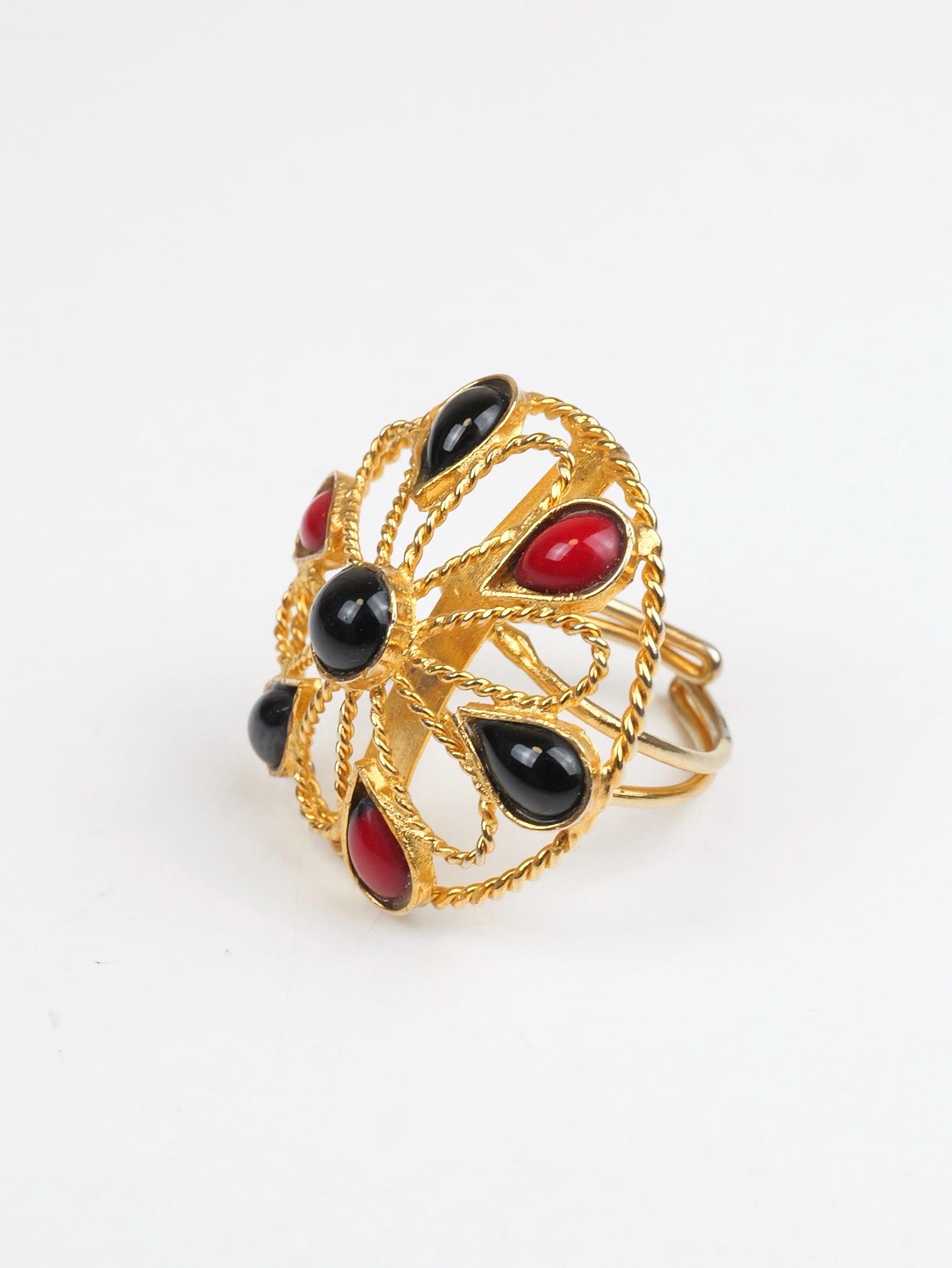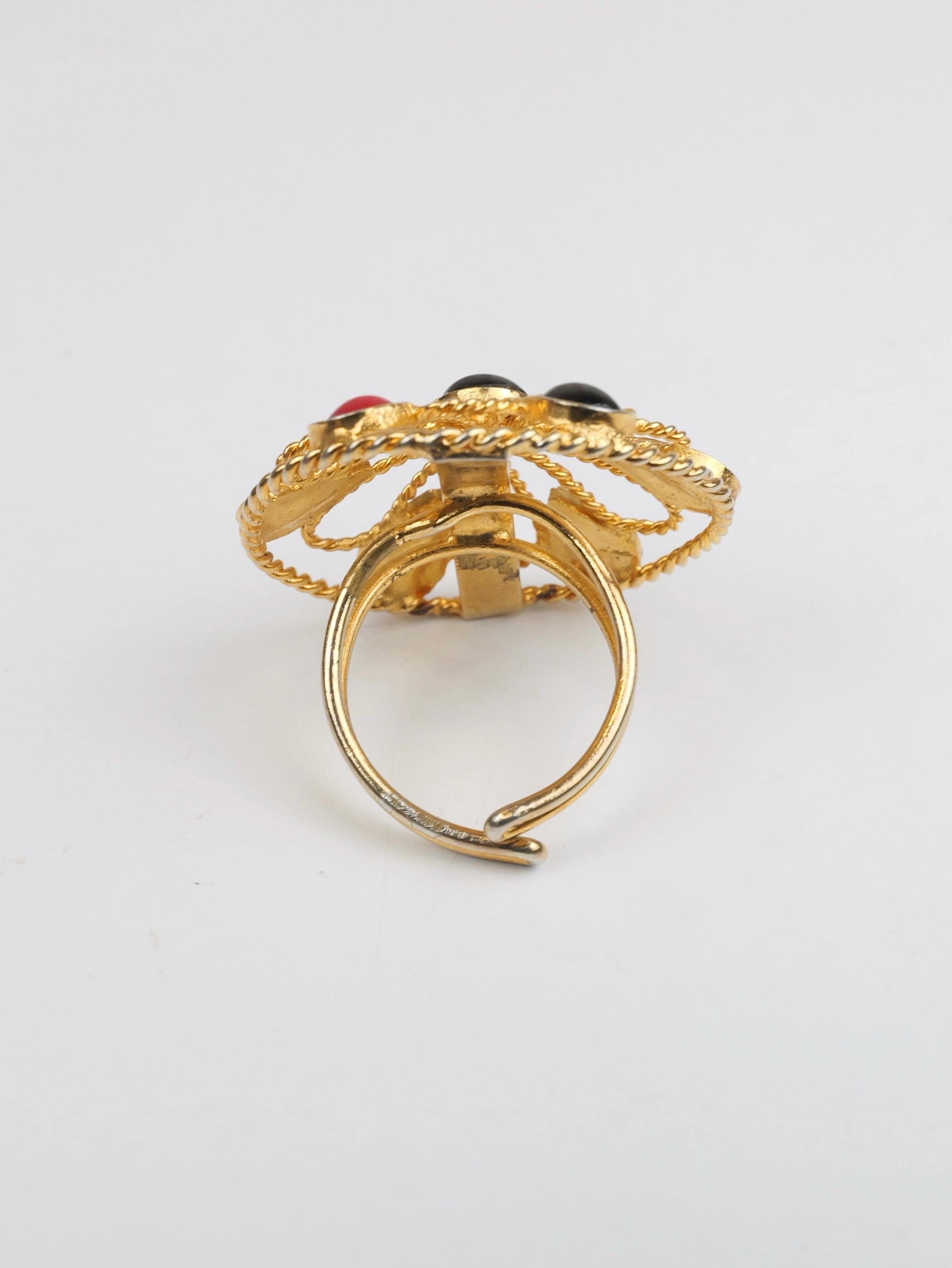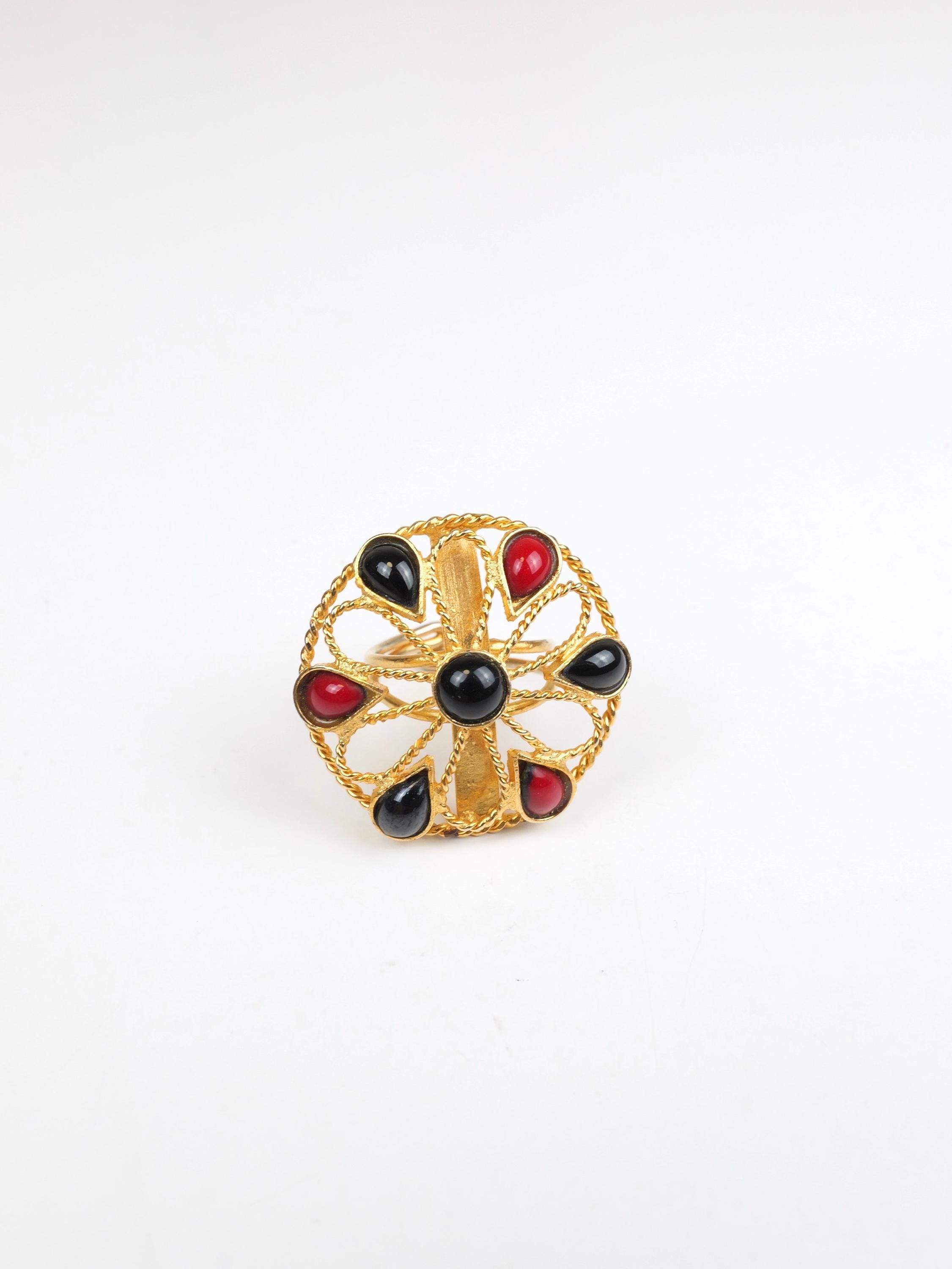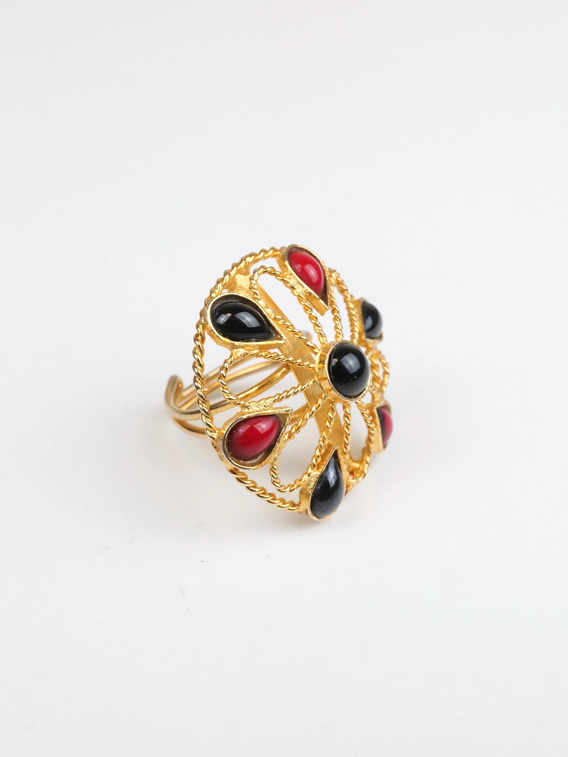 Vintage red and black cabochon and gold tone flower patterned ring. Adjustable size. The flower is open work gold tone metal dotted with the red and black teardrop cabs. Doubled wire band that can be pulled and pushed to adjust the size. In very good condition. Some of the gold tone finish has been rubbed off the ring shank. Adjustable up and down.