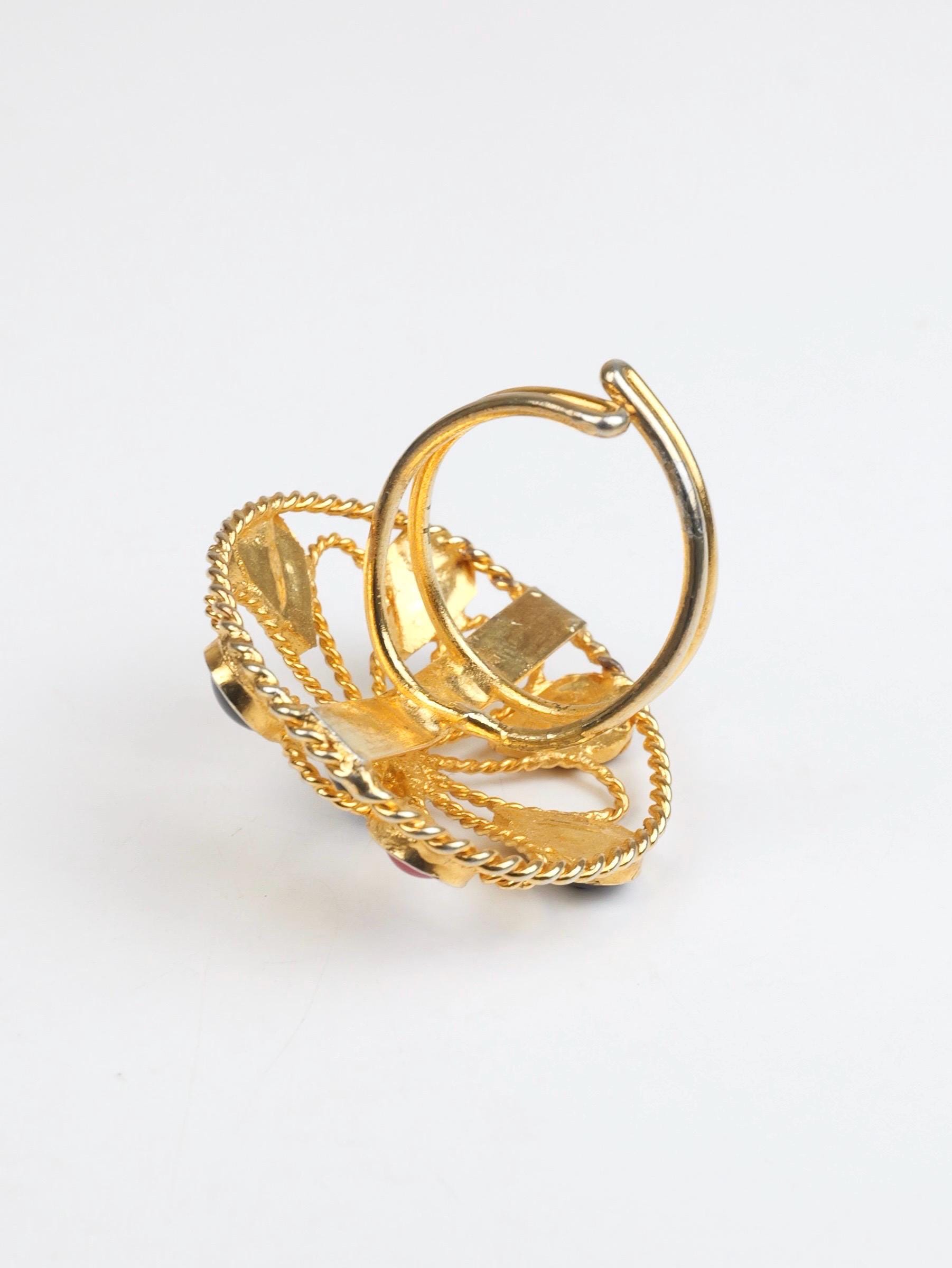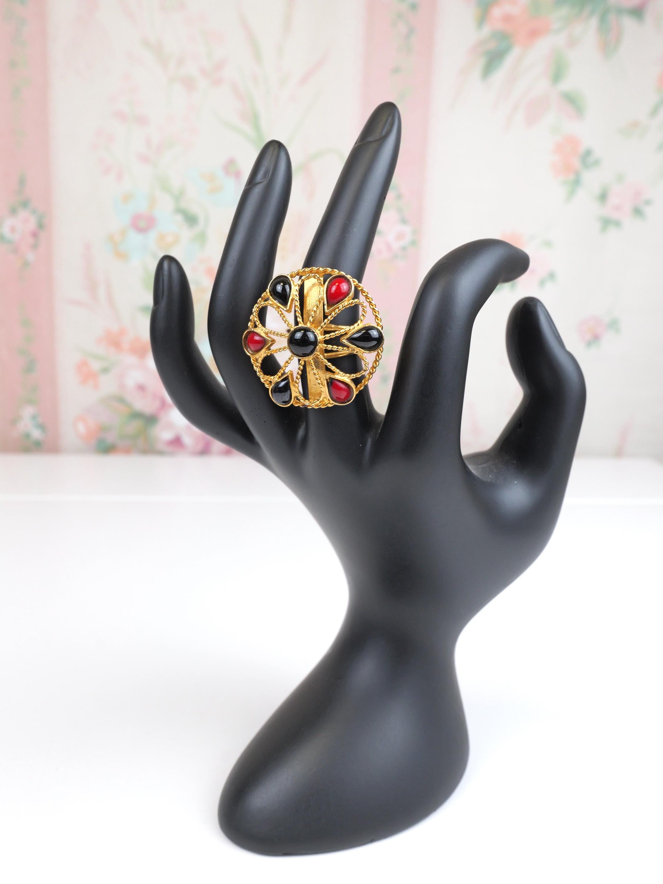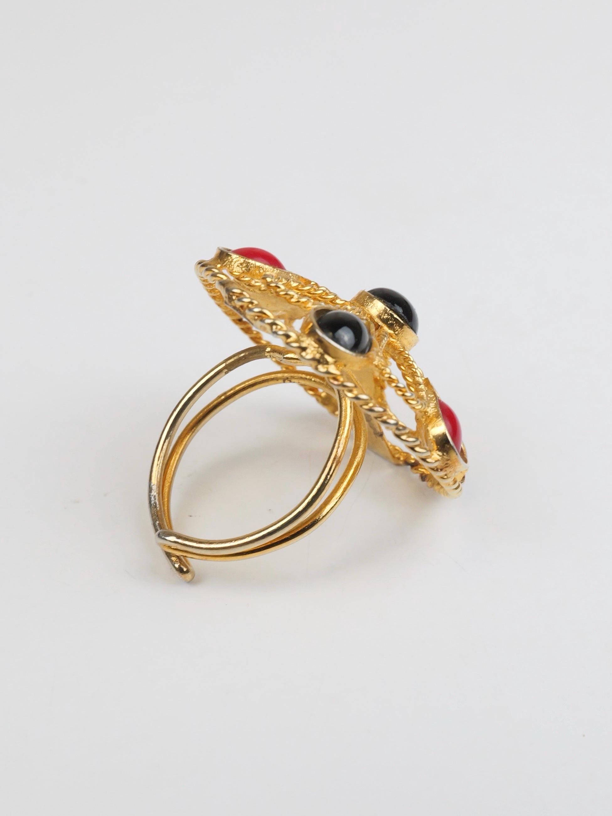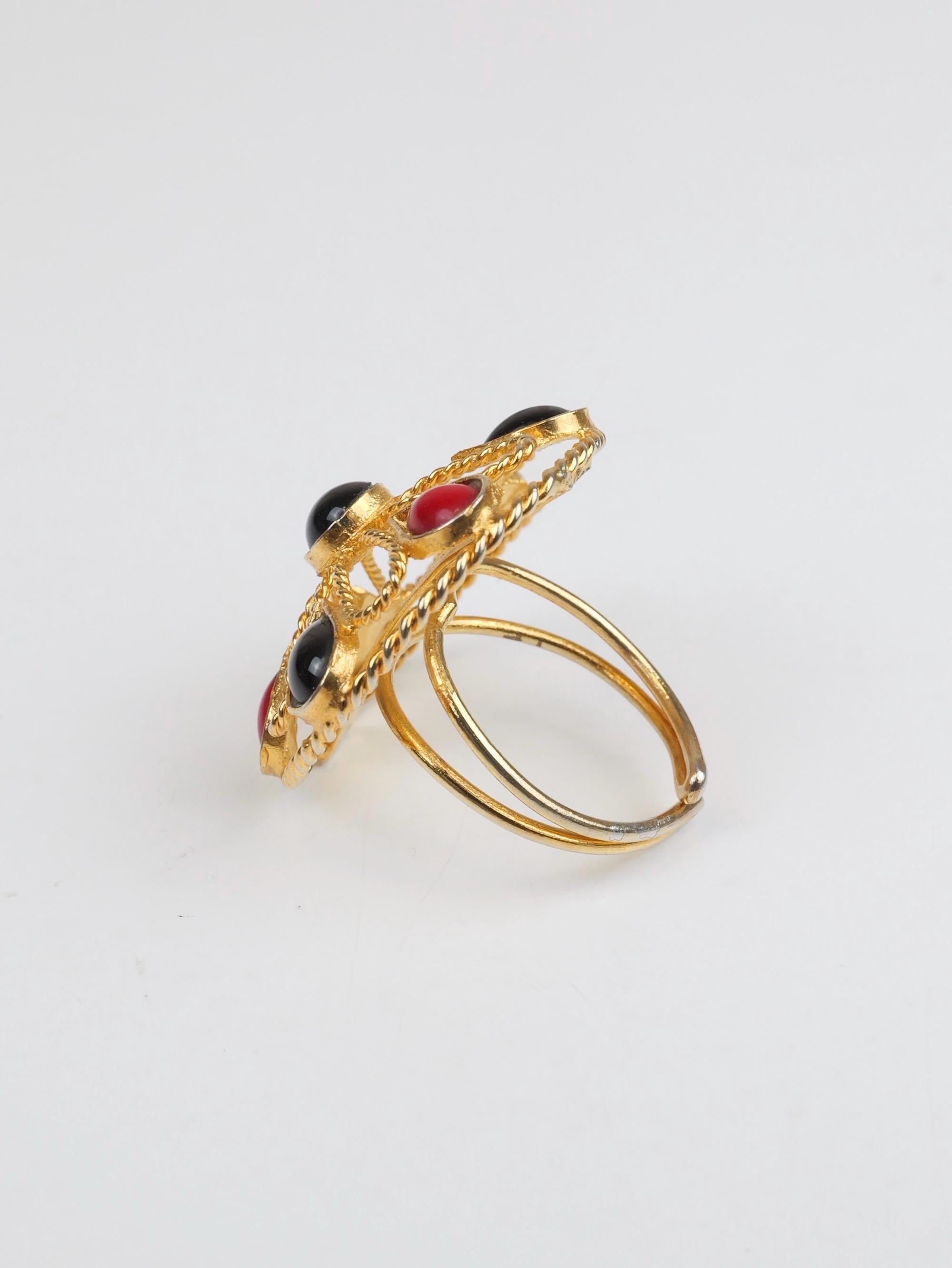Vintage red and black cabochon and gold tone flower patterned ring. Adjustable size. The flower is open work gold tone metal dotted with the red and black teardrop cabs. Doubled wire band that can be pulled and pushed to adjust the size. In very good condition. Some of the gold tone finish has been rubbed off the ring shank. Adjustable up and down.