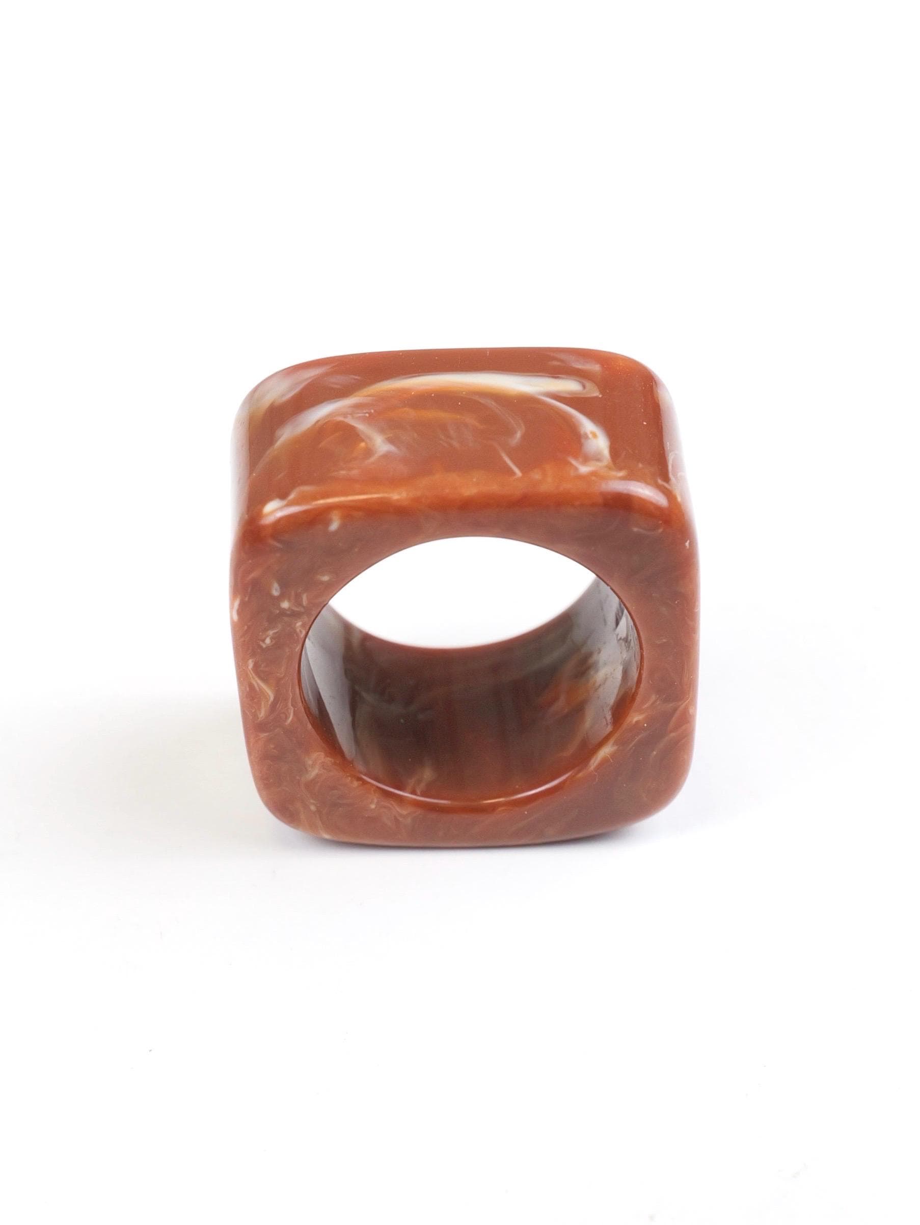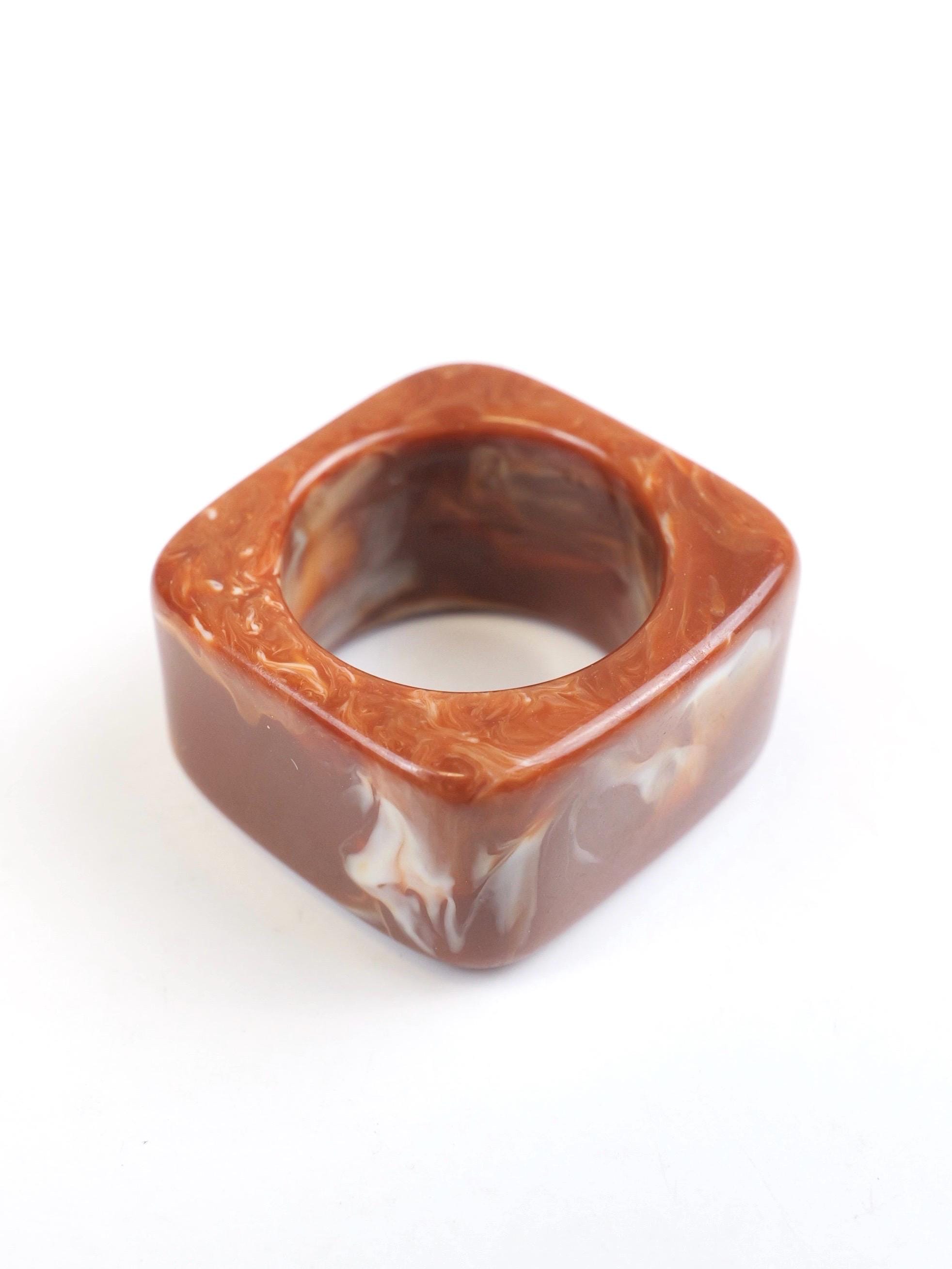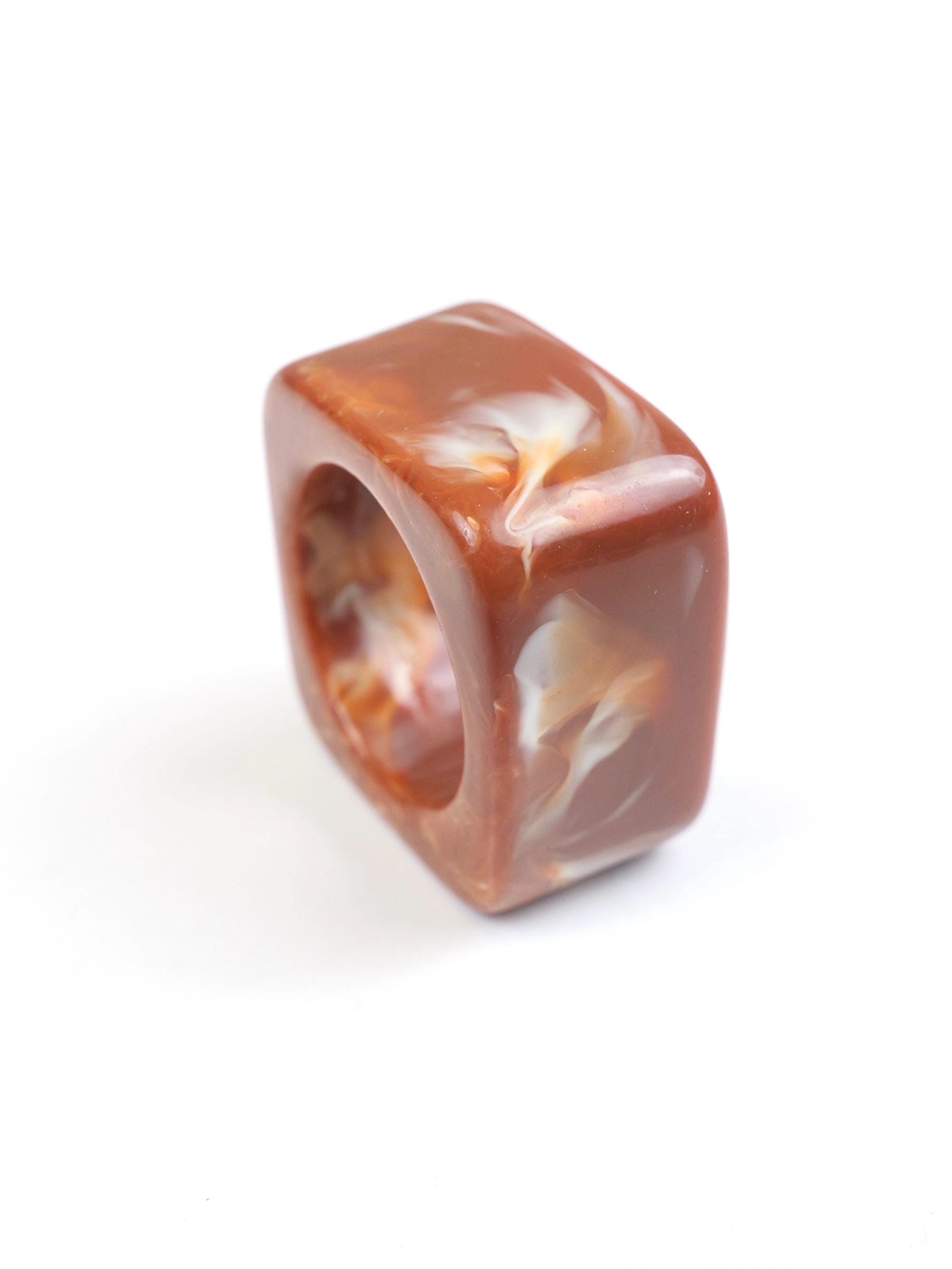 Vintage Mod square mottled swirled clay brown lucite ring. Circa 1960’s.