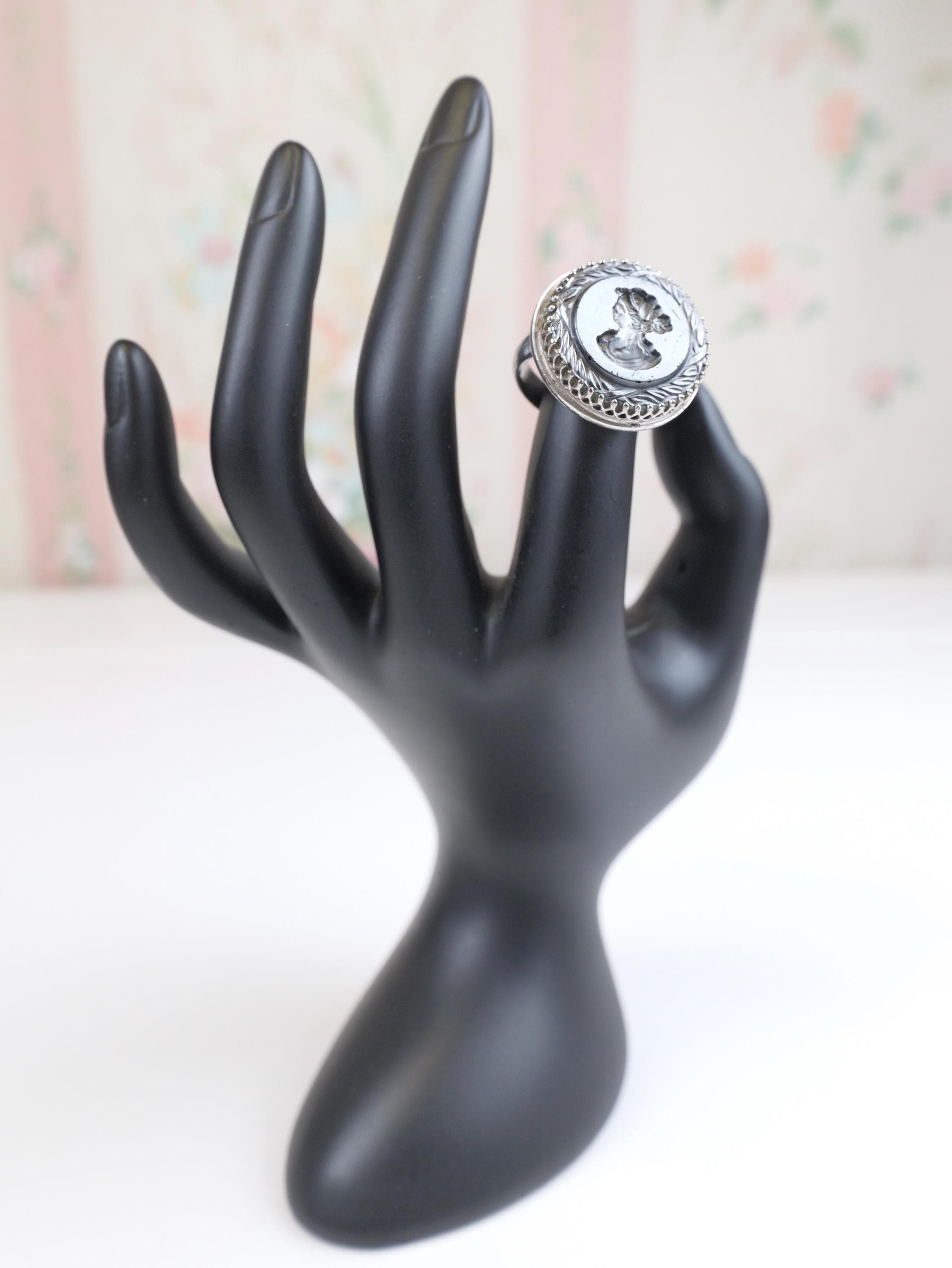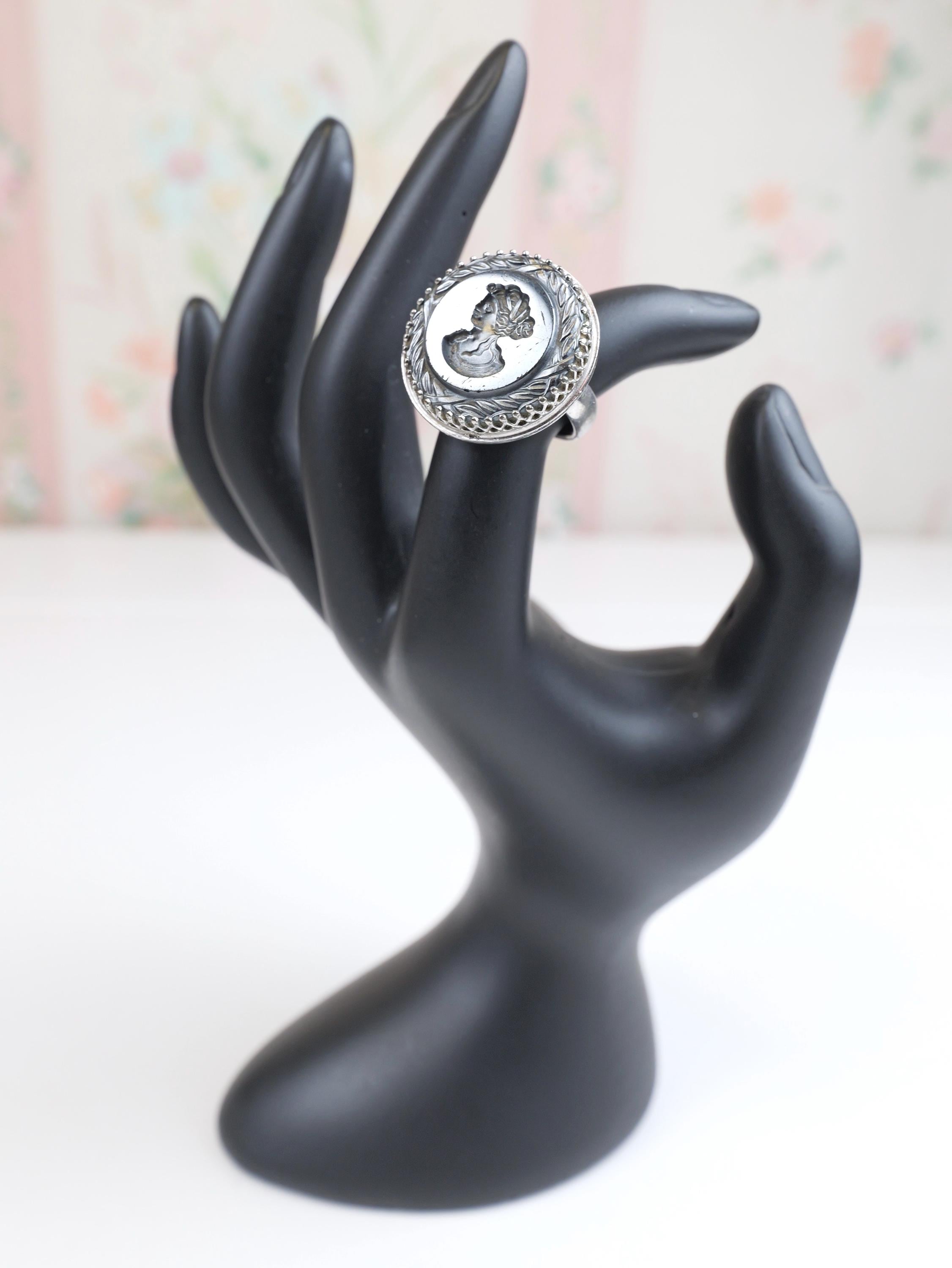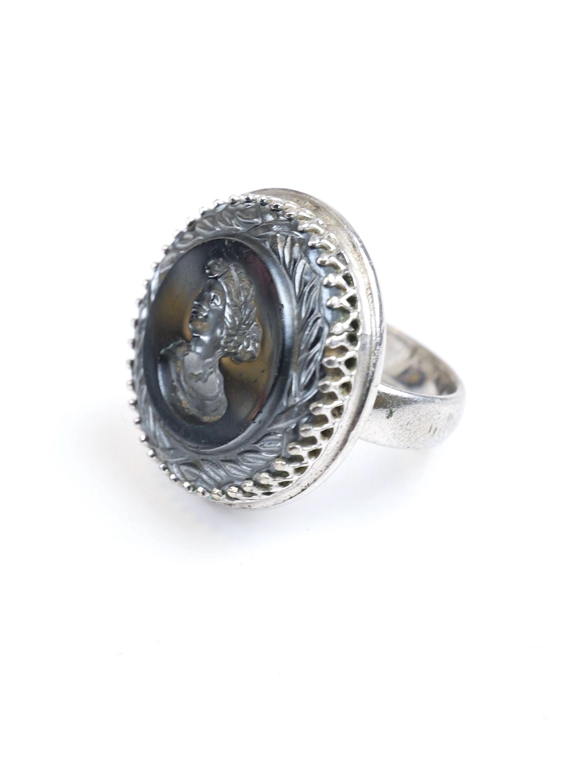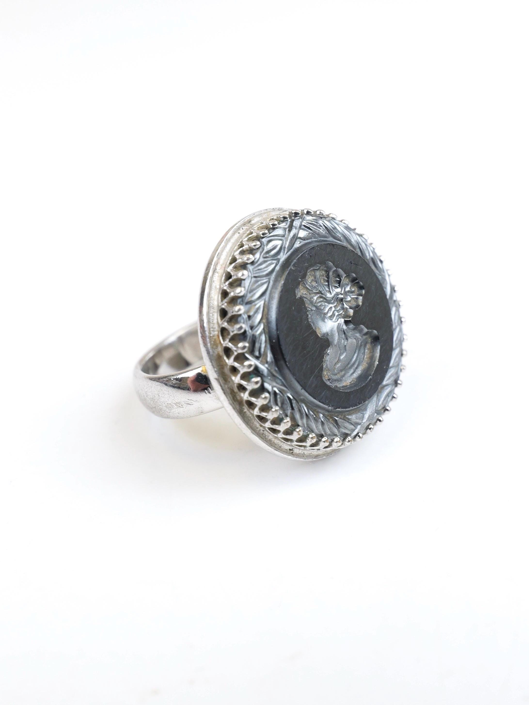 Hard to find! Signed "Whiting & Davis" intaglio hematite or black glass ring. Round shape, substantial silver tone setting. The edge of the intaglio appears to be etched in a laurel wreath pattern. Female silhouette. Circa 1950's 1960's. In very good condition. There are a few light surface scratches on the face of the ring. The setting is lightly tarnished but still shiny silver in most spots. Size 5 1/2.