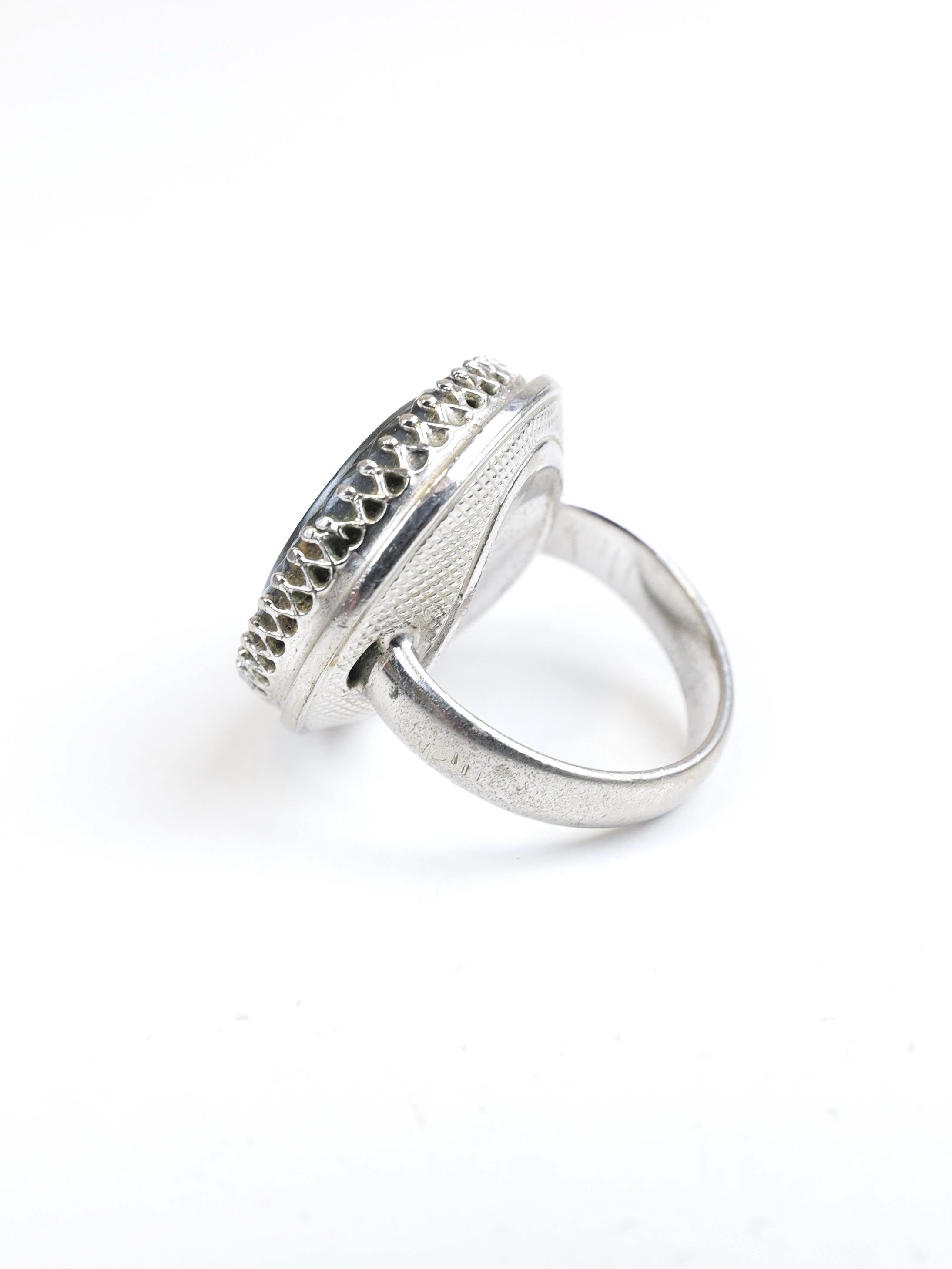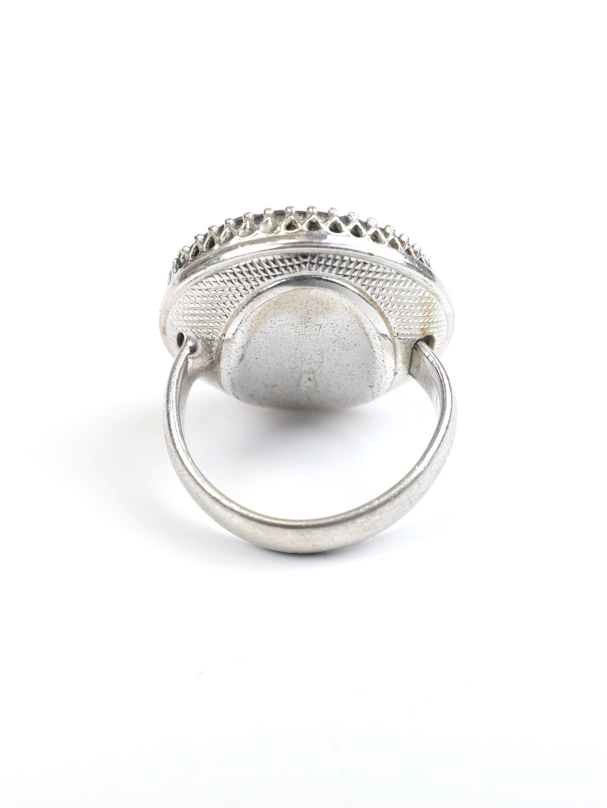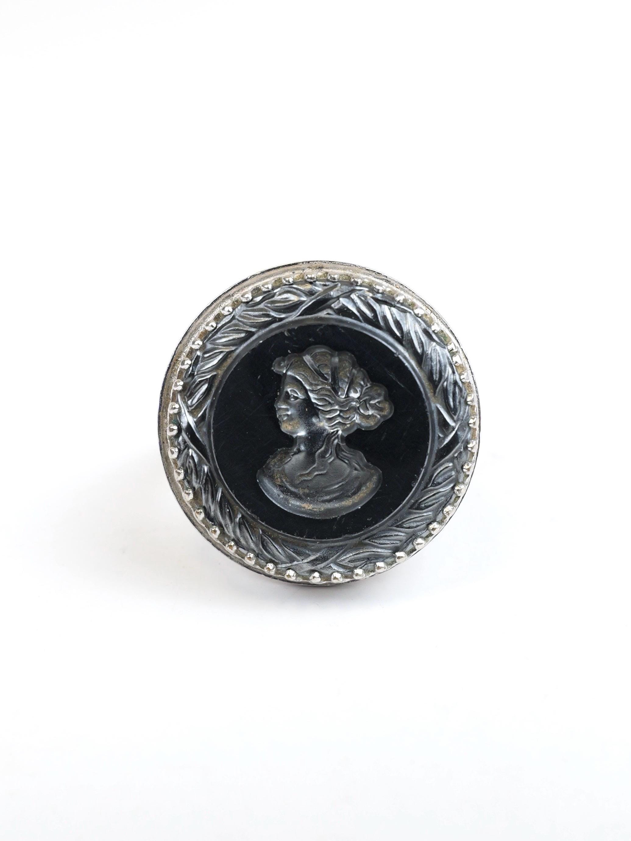 Hard to find! Signed "Whiting & Davis" intaglio hematite or black glass ring. Round shape, substantial silver tone setting. The edge of the intaglio appears to be etched in a laurel wreath pattern. Female silhouette. Circa 1950's 1960's. In very good condition. There are a few light surface scratches on the face of the ring. The setting is lightly tarnished but still shiny silver in most spots. Size 5 1/2.