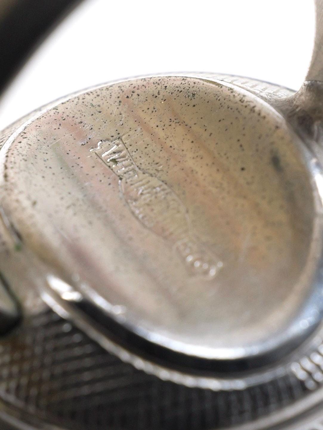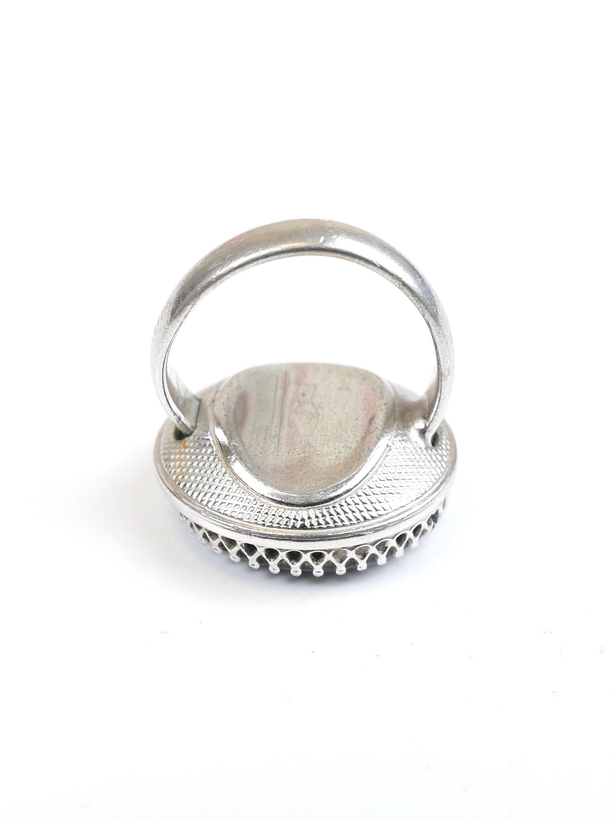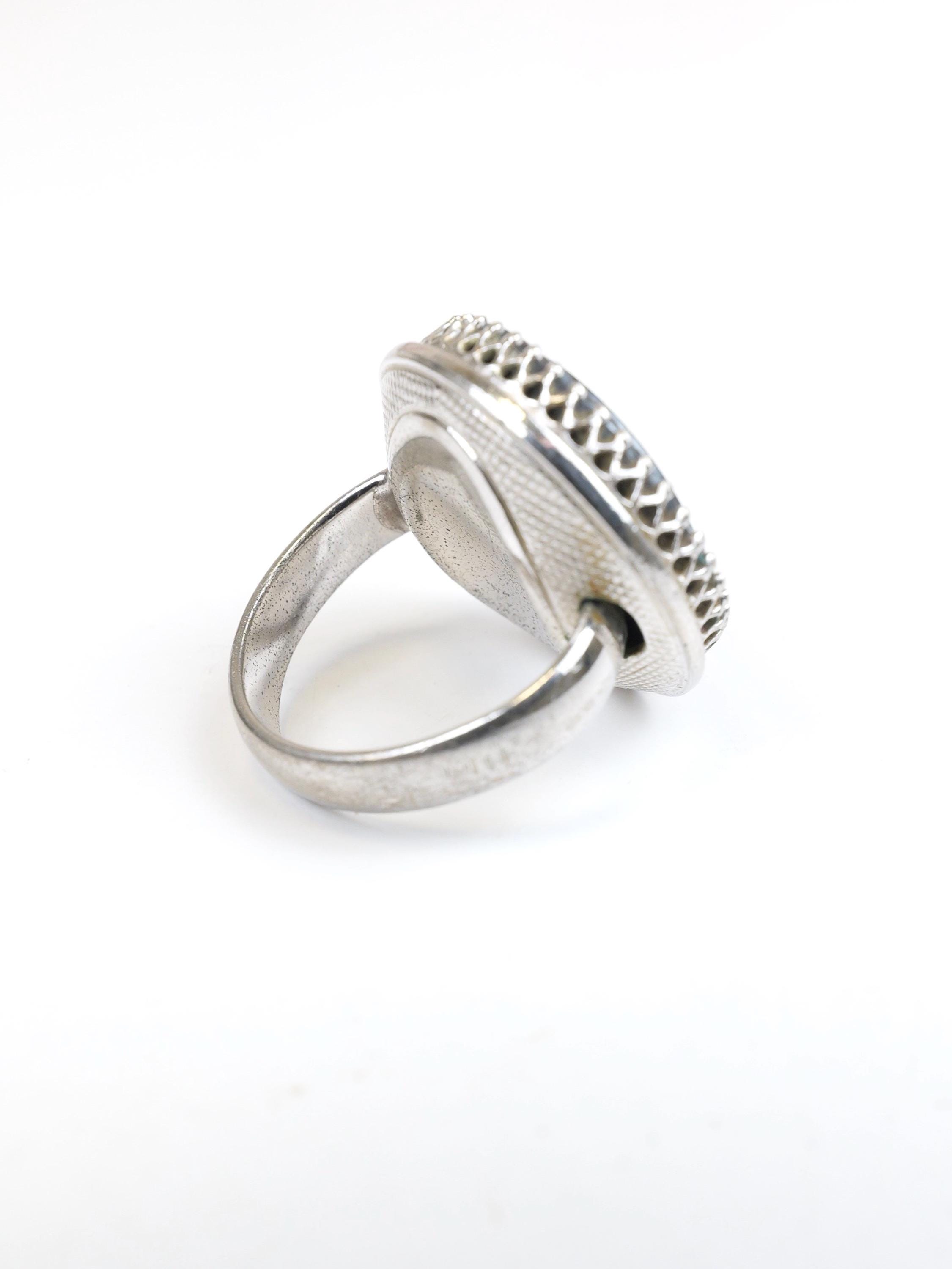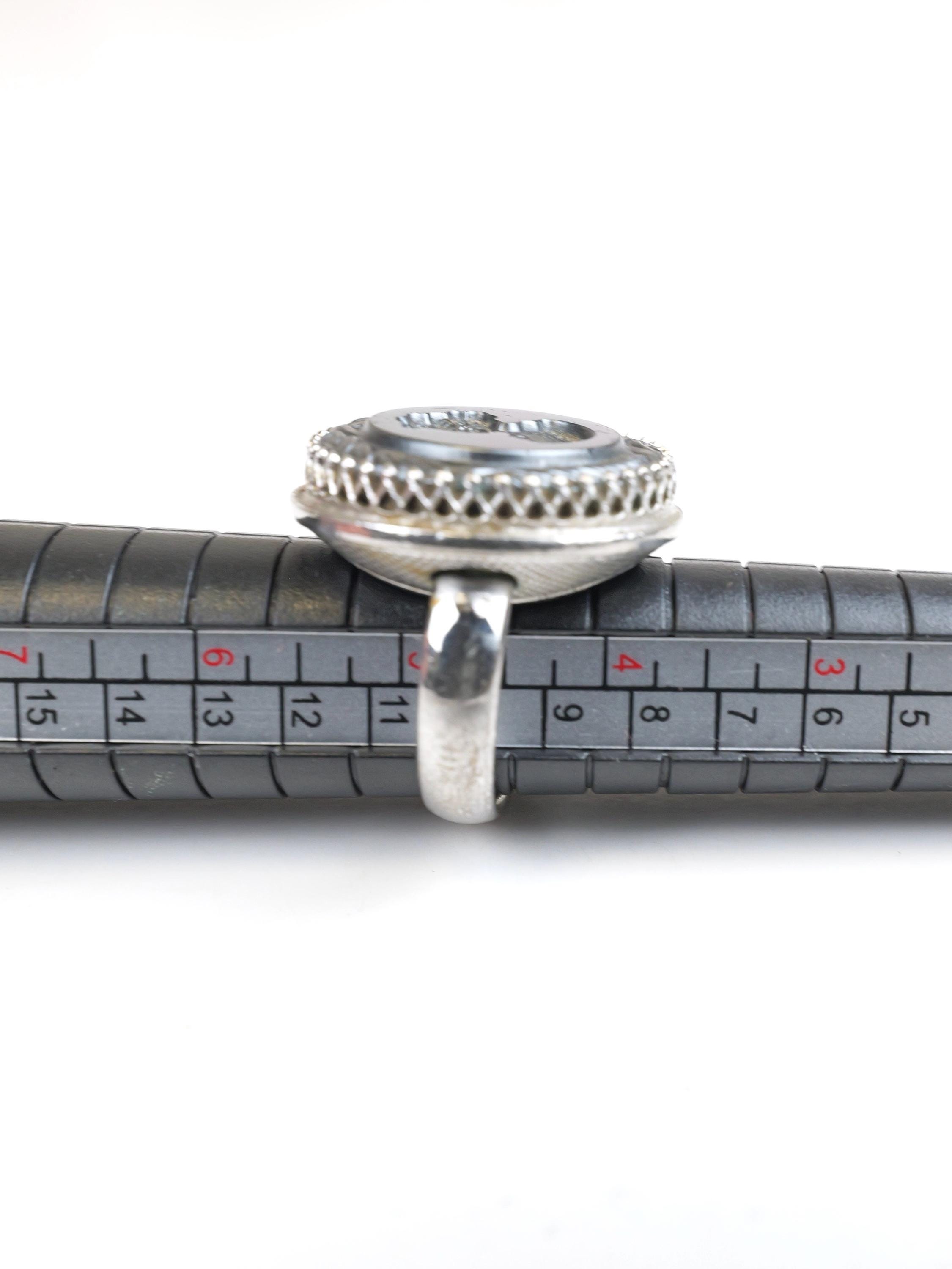 Hard to find! Signed "Whiting & Davis" intaglio hematite or black glass ring. Round shape, substantial silver tone setting. The edge of the intaglio appears to be etched in a laurel wreath pattern. Female silhouette. Circa 1950's 1960's. In very good condition. There are a few light surface scratches on the face of the ring. The setting is lightly tarnished but still shiny silver in most spots. Size 5 1/2.