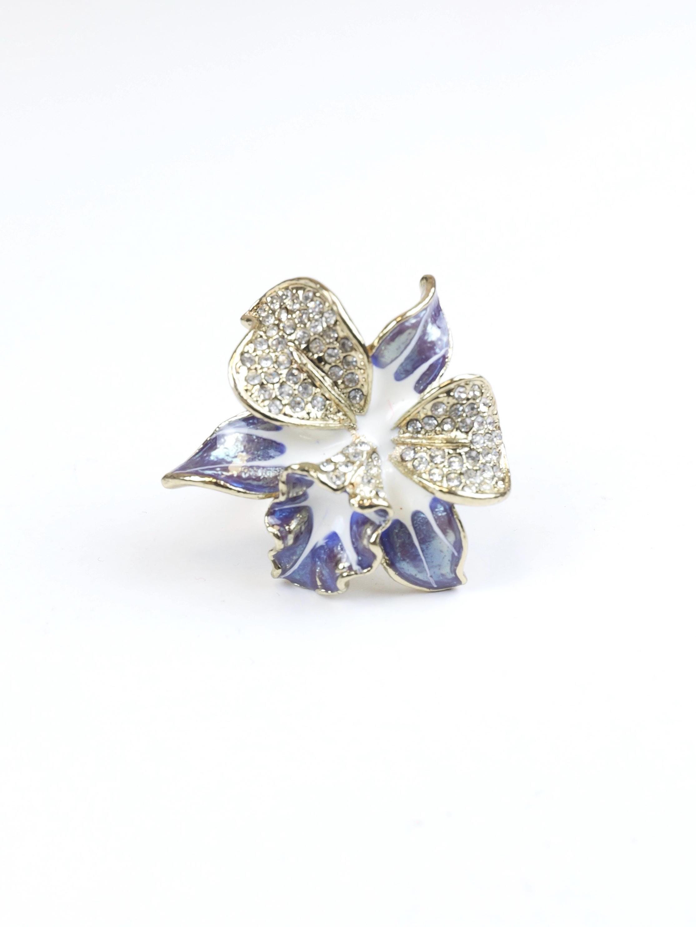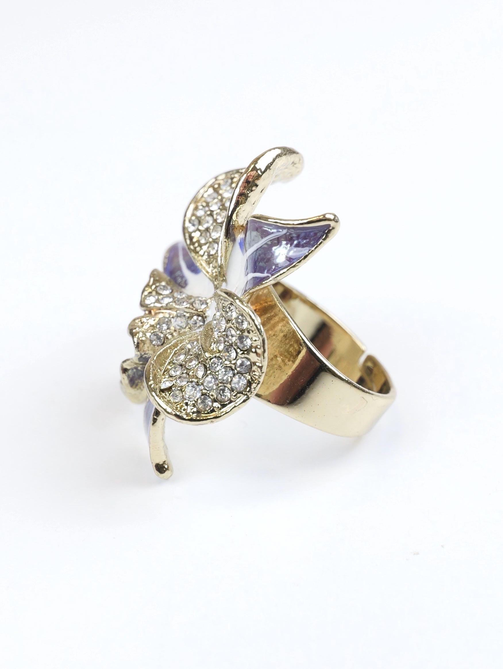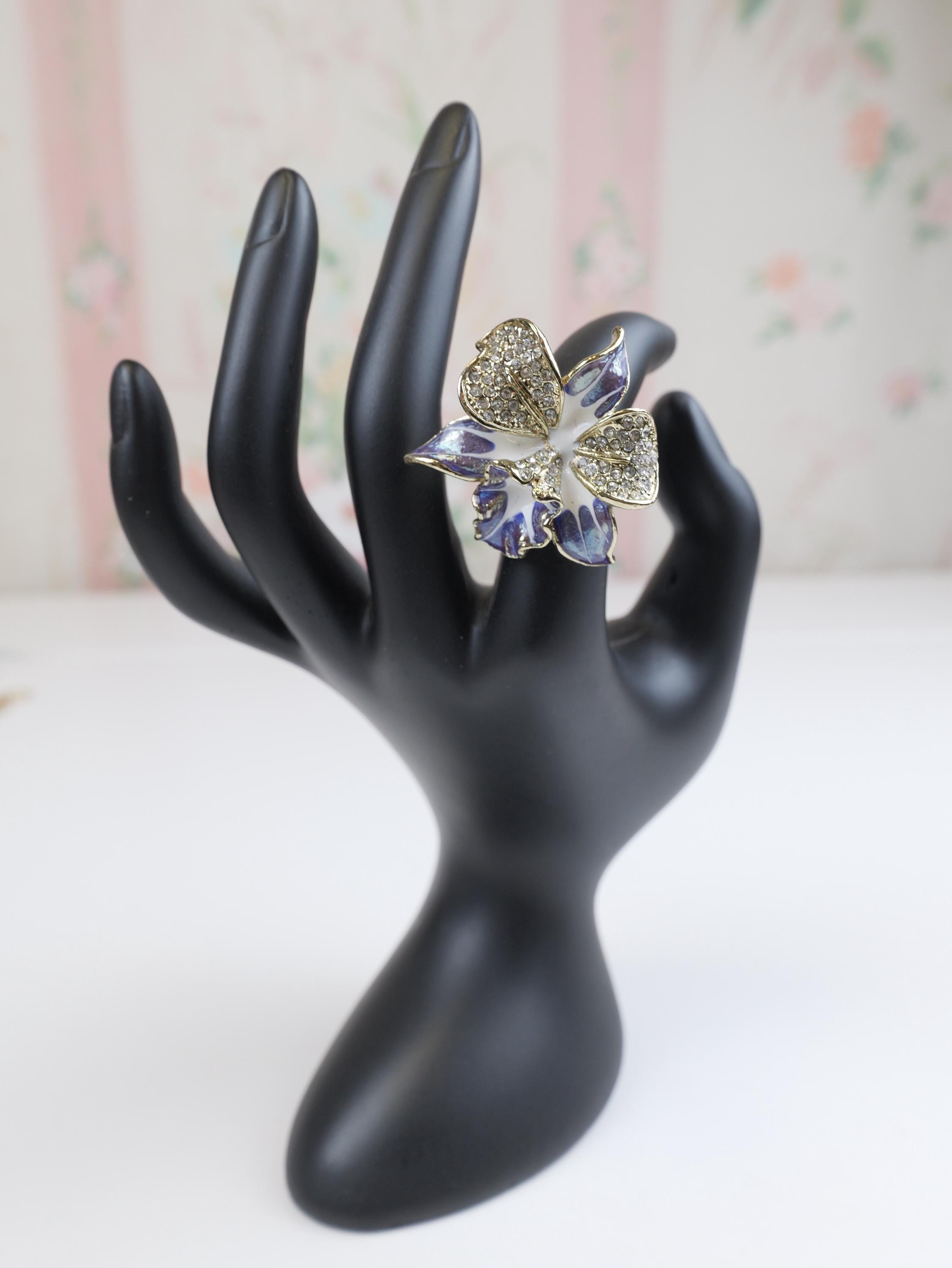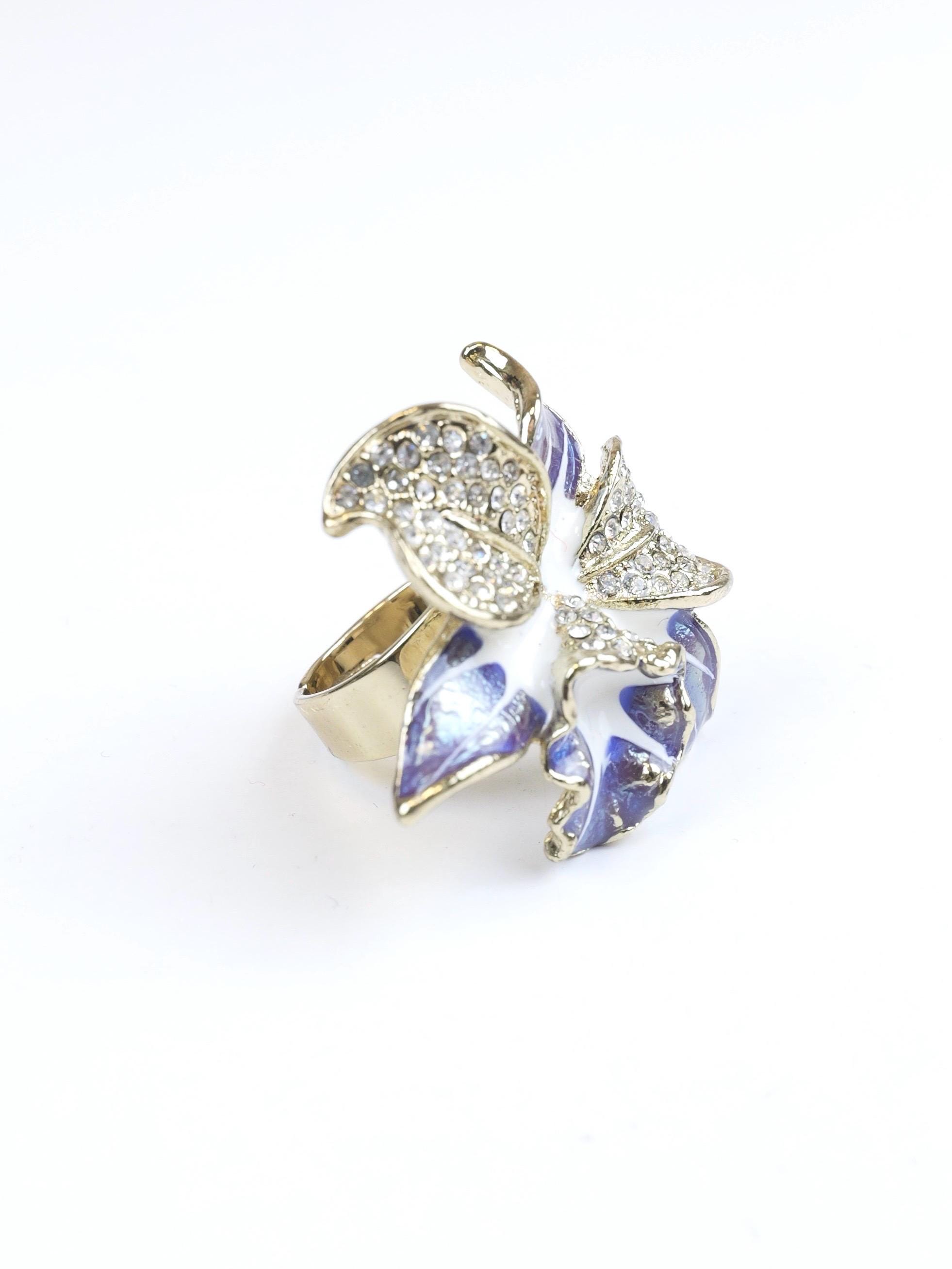 Stunning pave rhinestone and blue and white enamel orchid ring. Highly detailed. I believe the signature on the back of the ring face is the Swarovski "Swan" but is very difficult to make out. The ring setting and shank are gold tone.