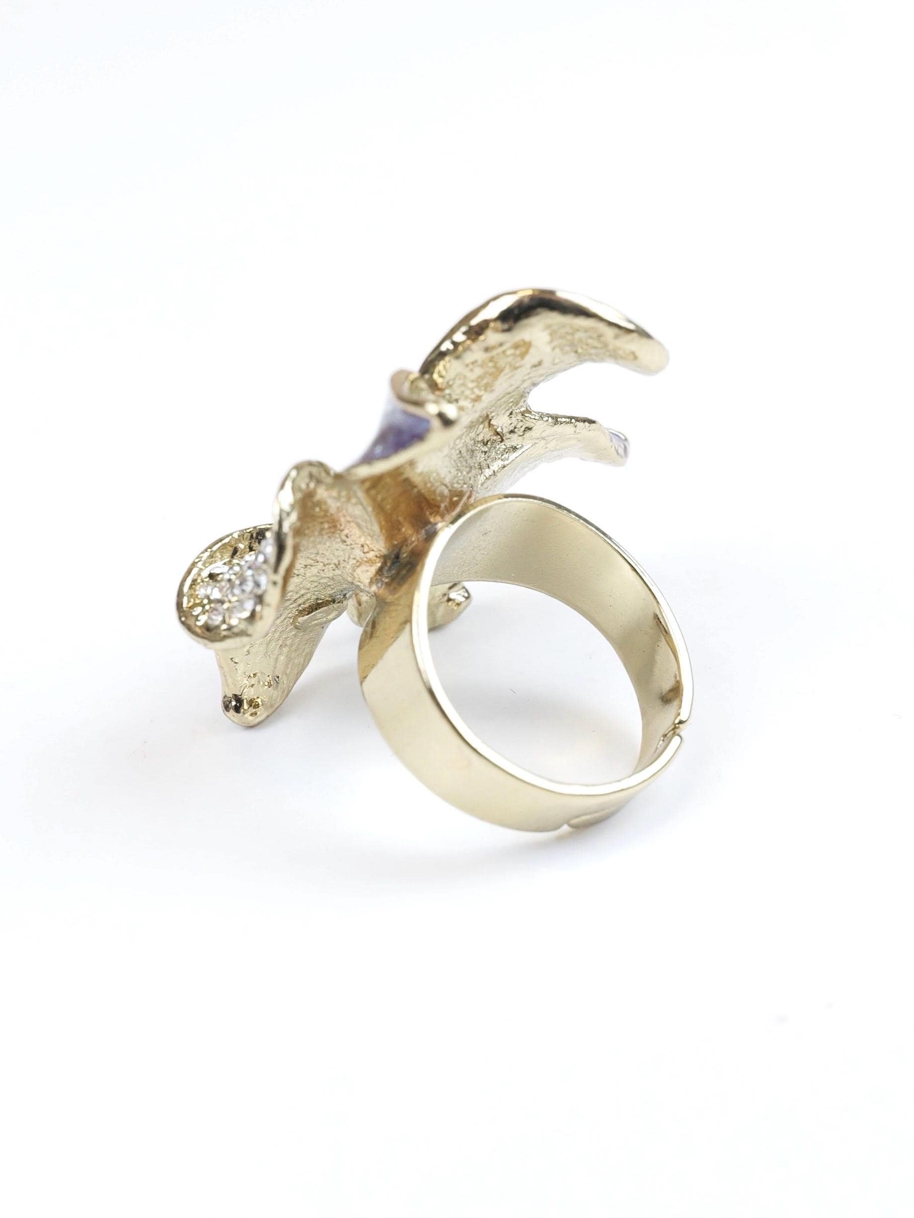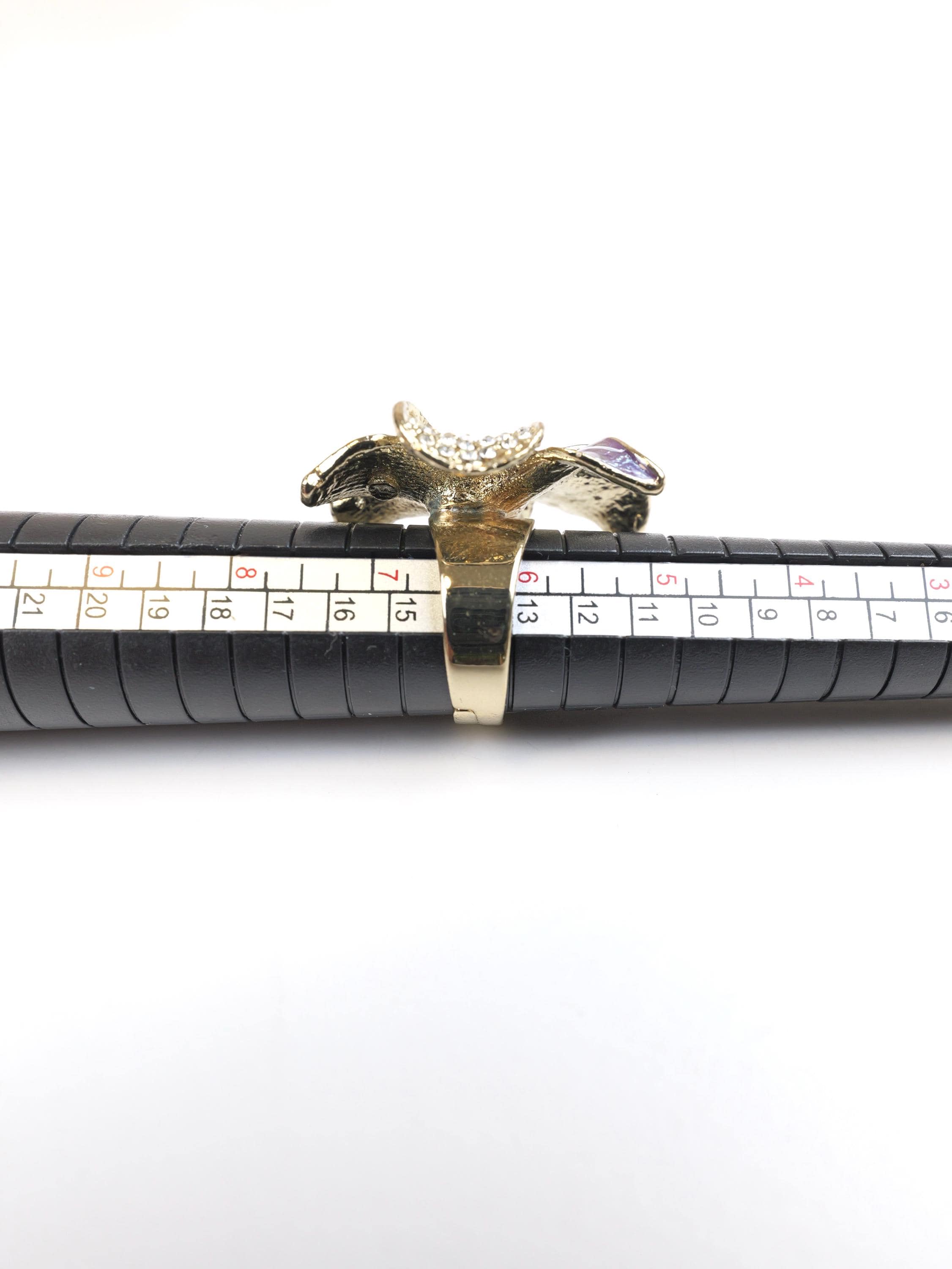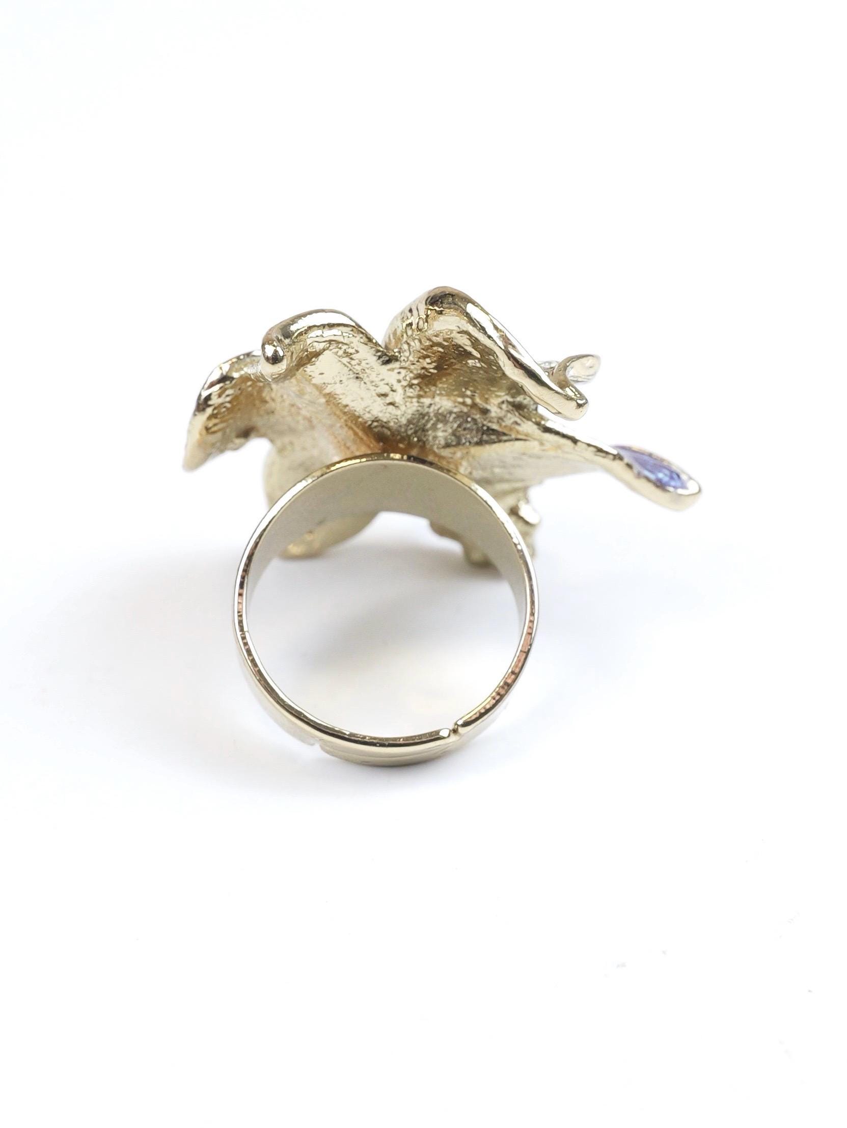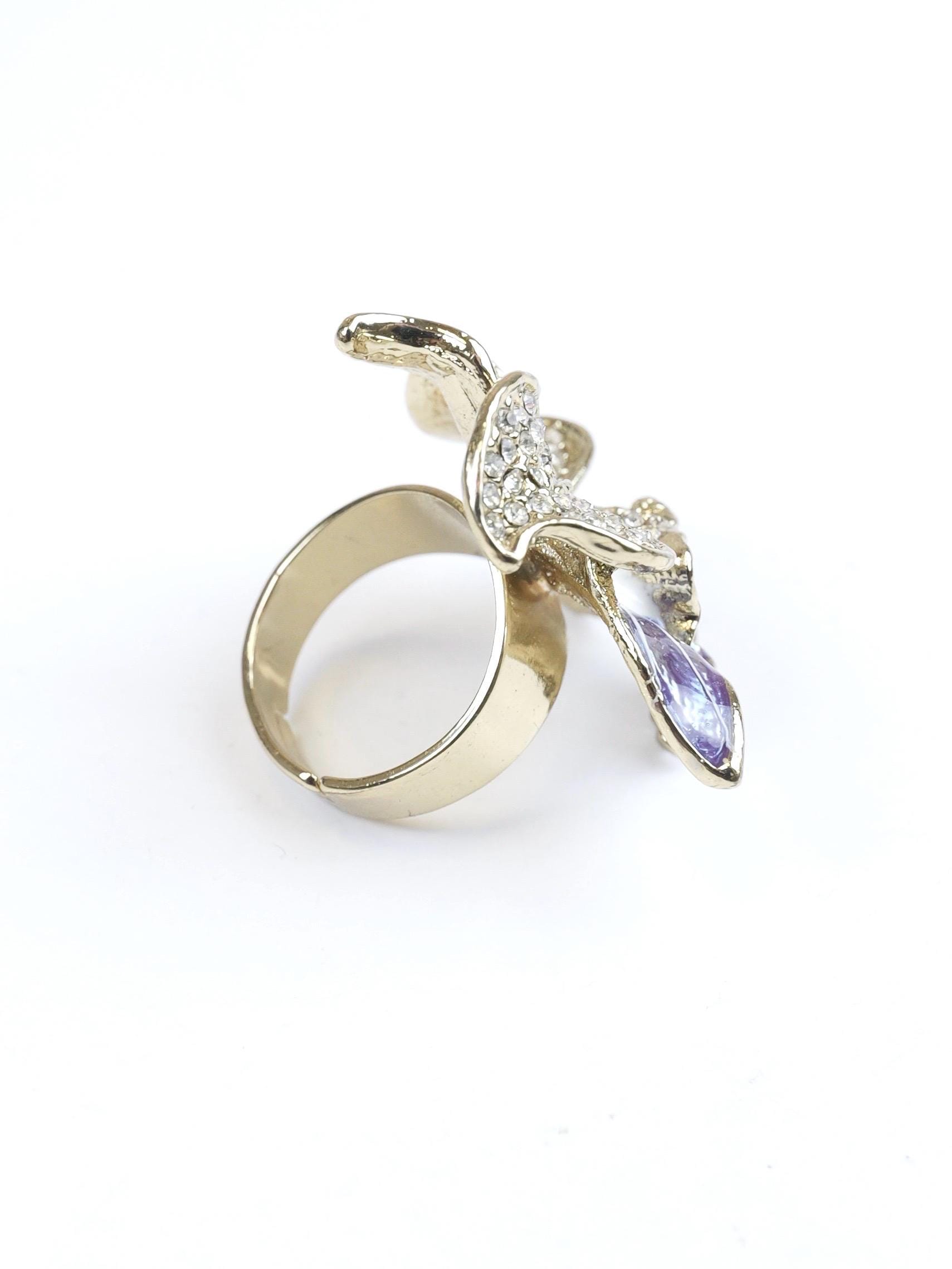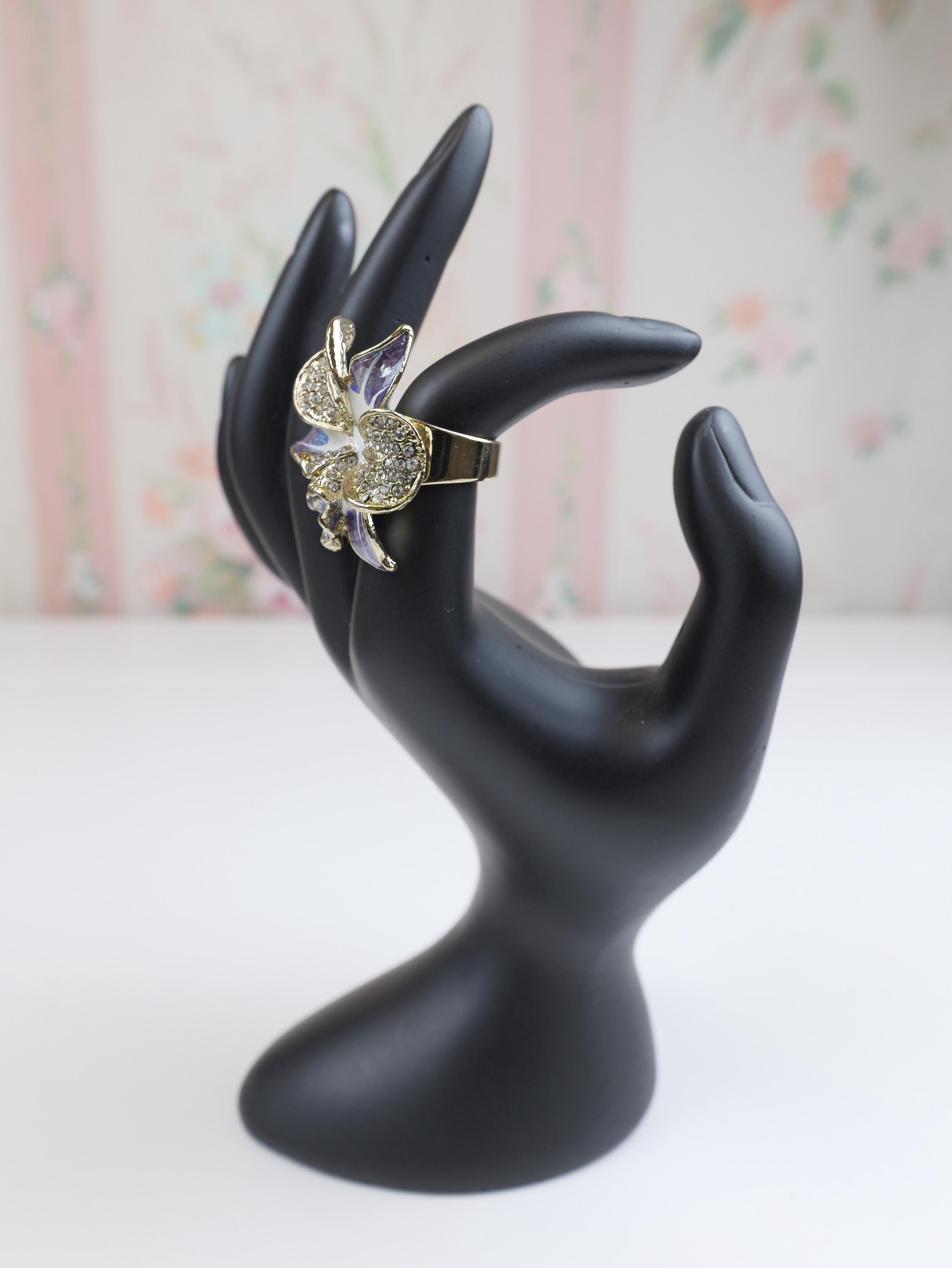 Stunning pave rhinestone and blue and white enamel orchid ring. Highly detailed. I believe the signature on the back of the ring face is the Swarovski "Swan" but is very difficult to make out. The ring setting and shank are gold tone.