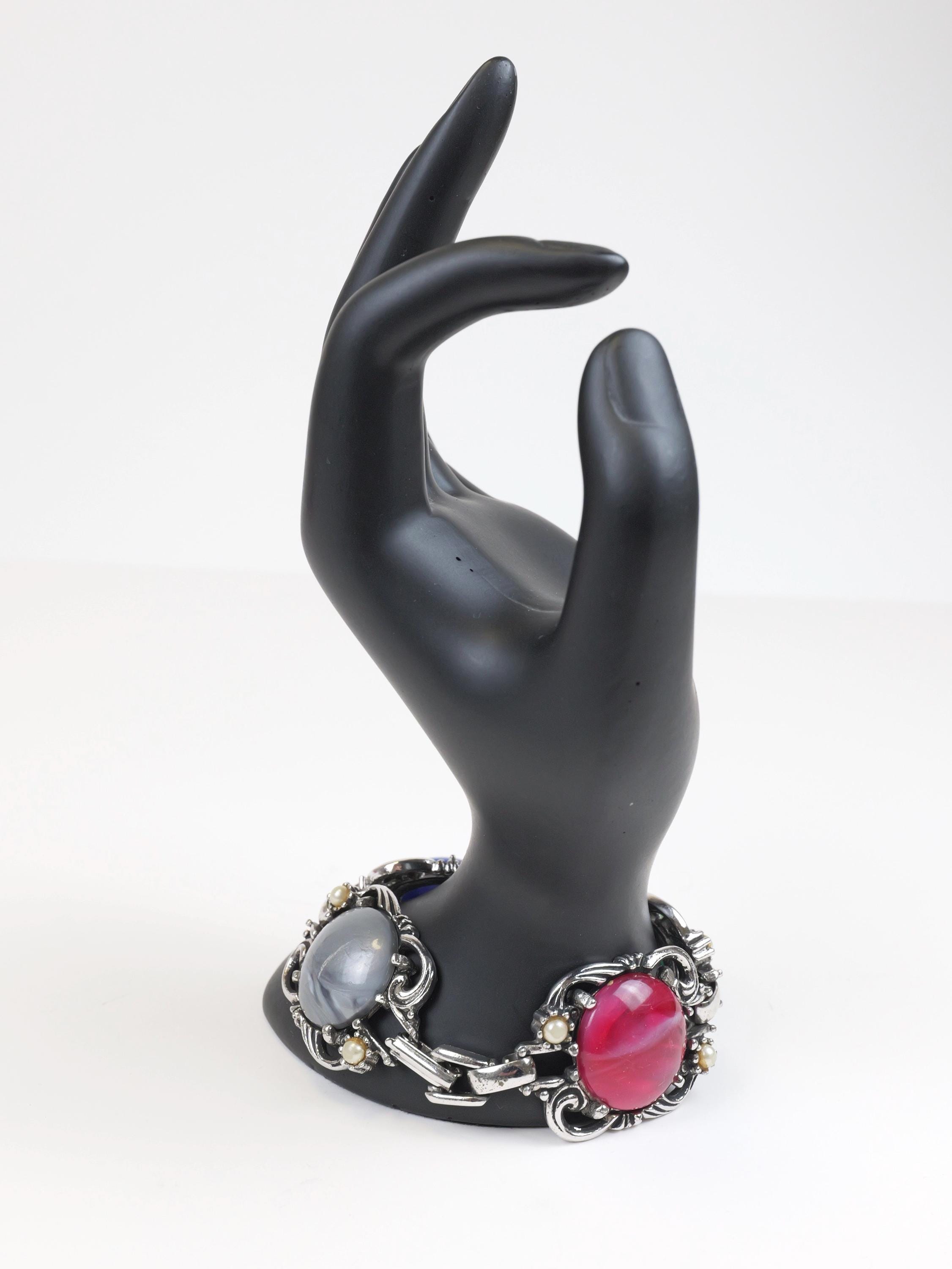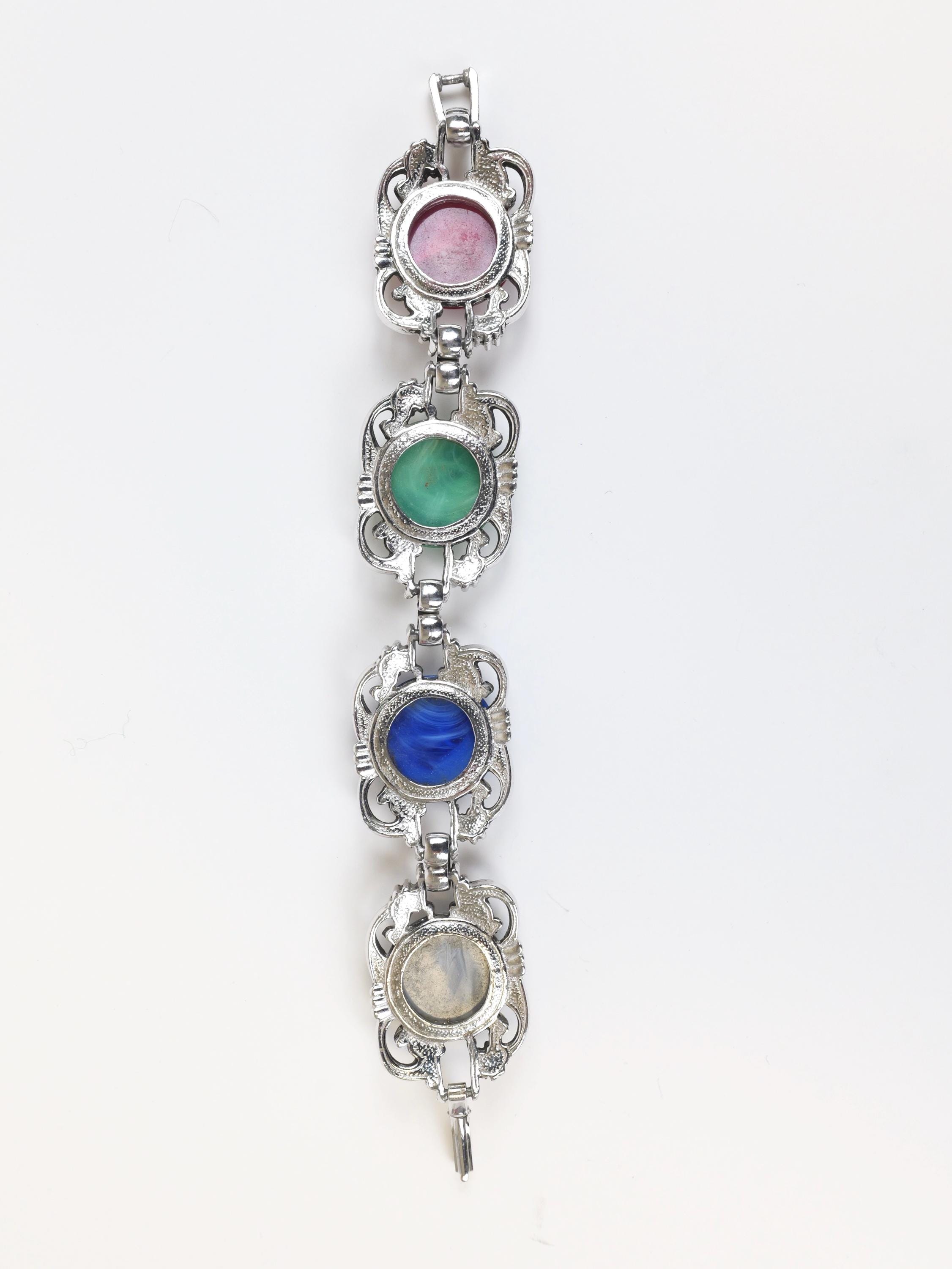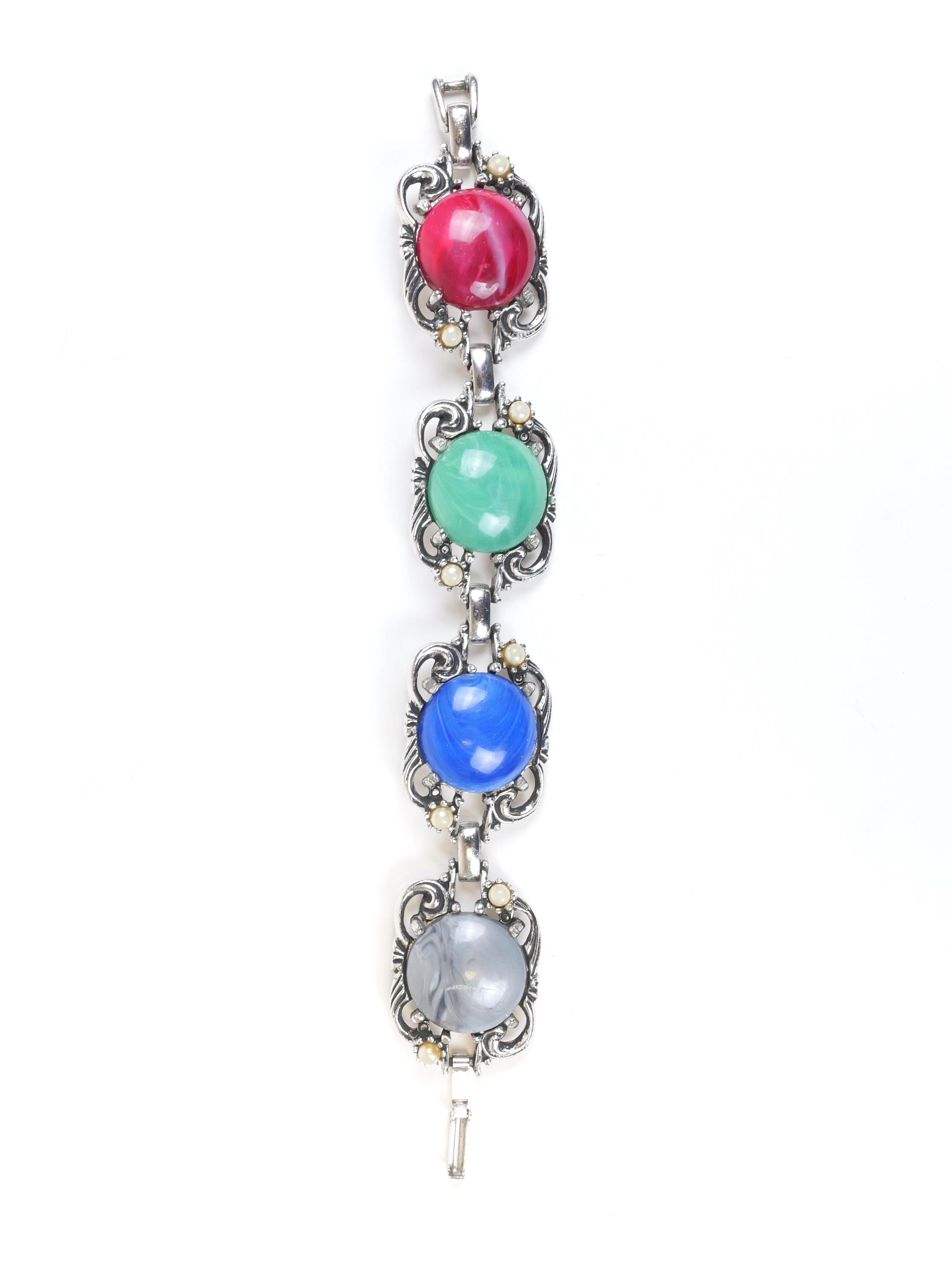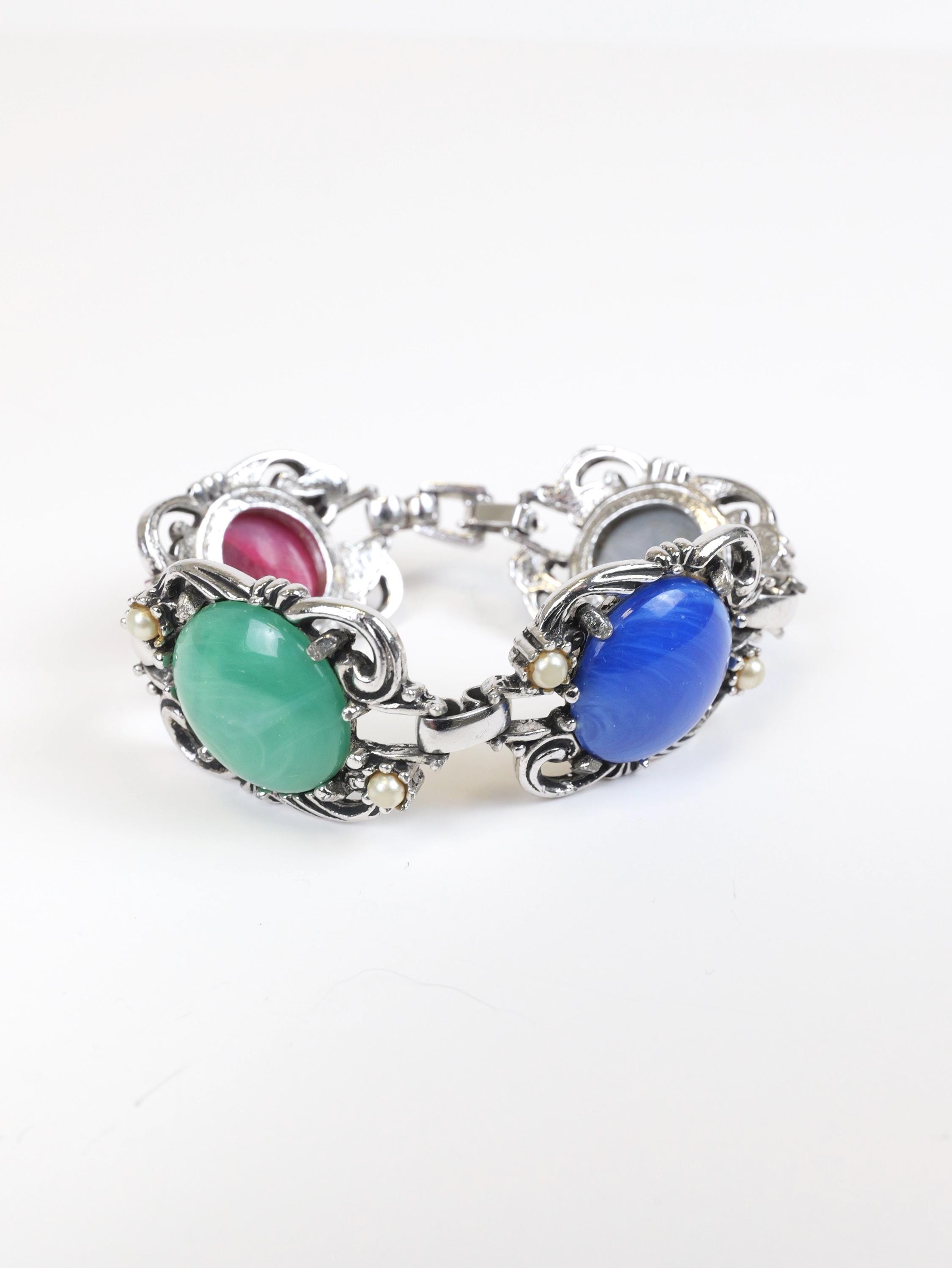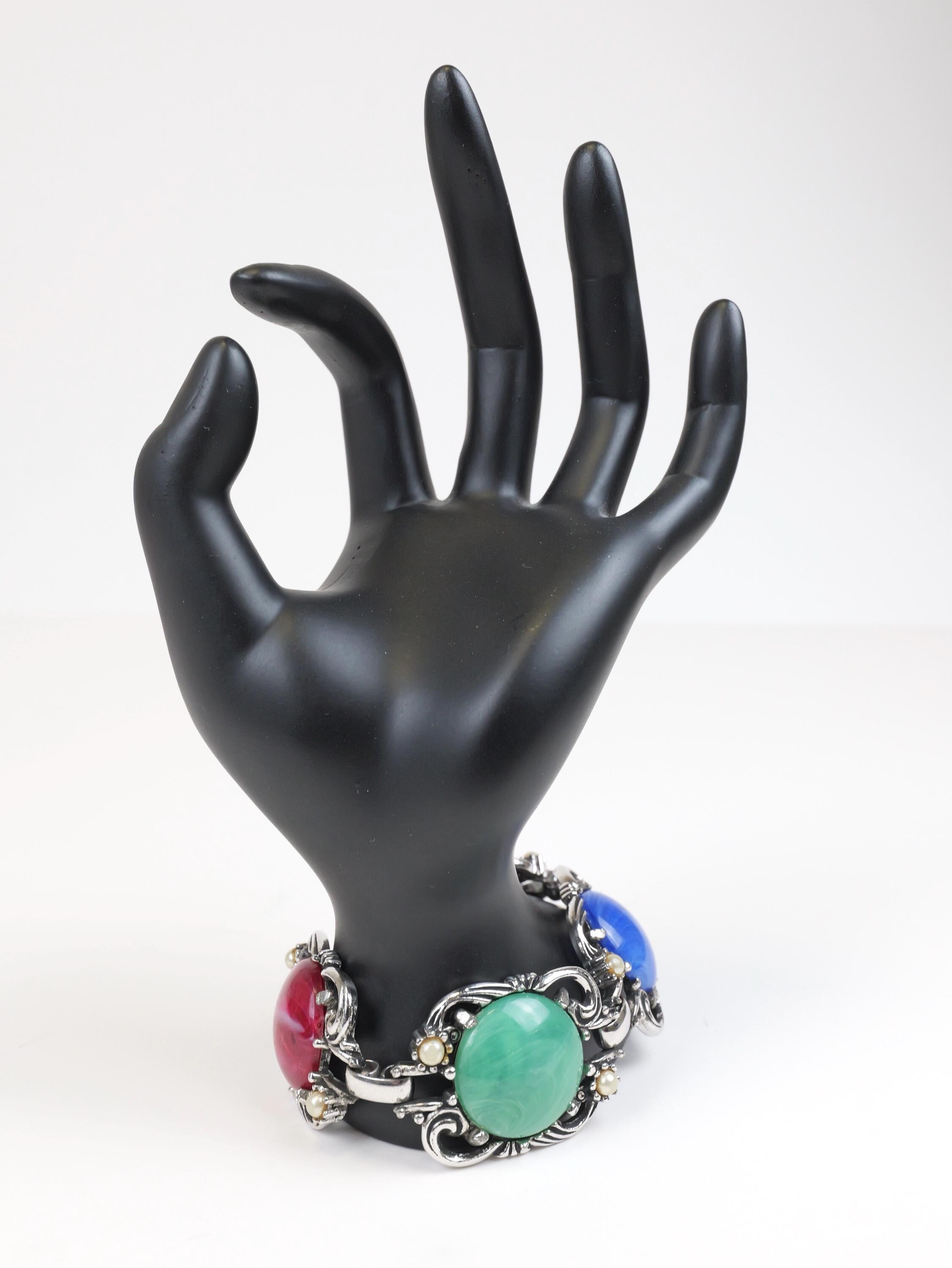 Lovely Florenza styled lucite cabochon and faux pearl wide link bracelet. Unsigned. Circa 1960’s 1970’s. Very ornate styling, perhaps Renaissance Revival era. In very very good condition. 7 1/4” long, 1” wide. Some light scratches.