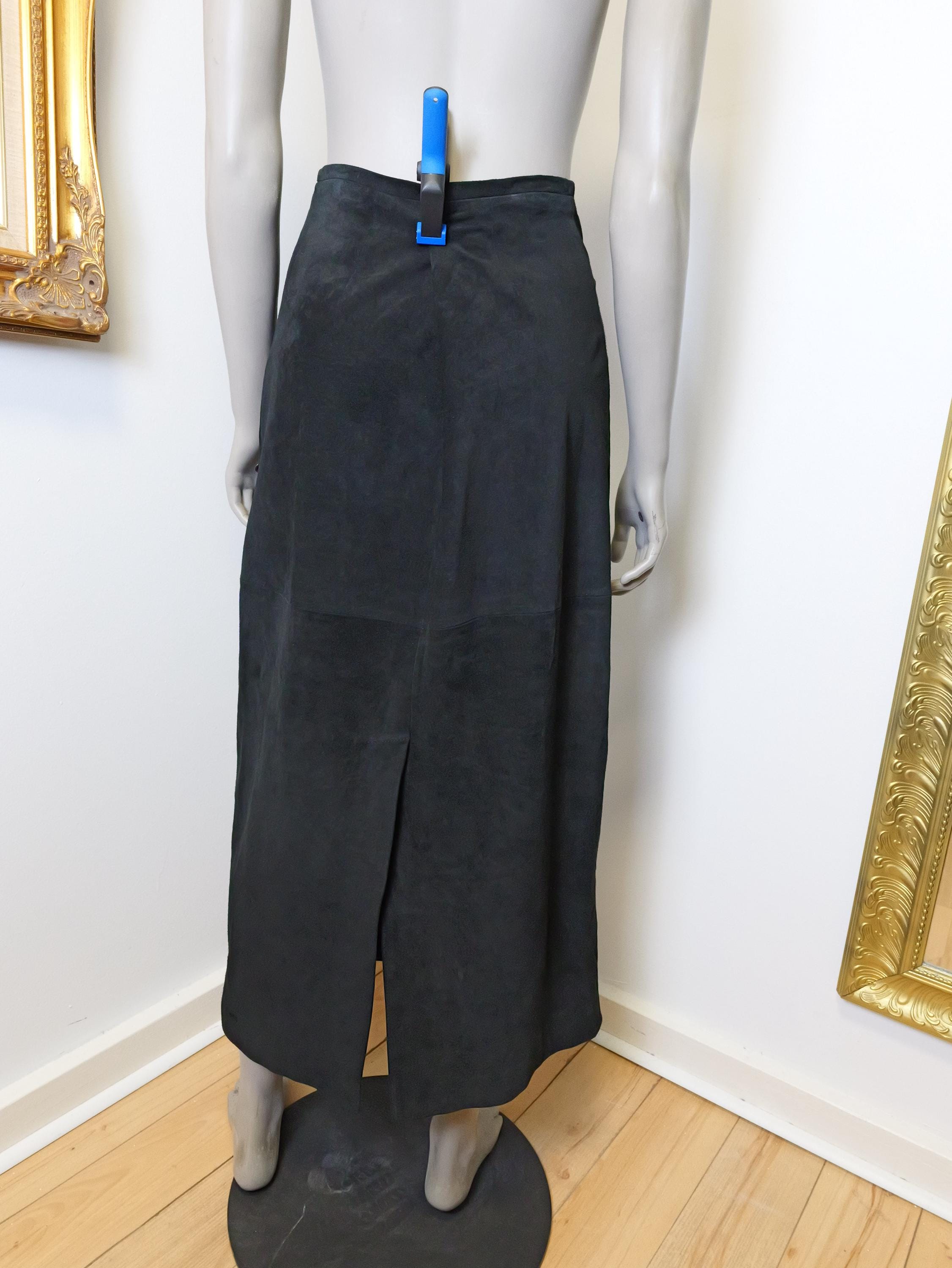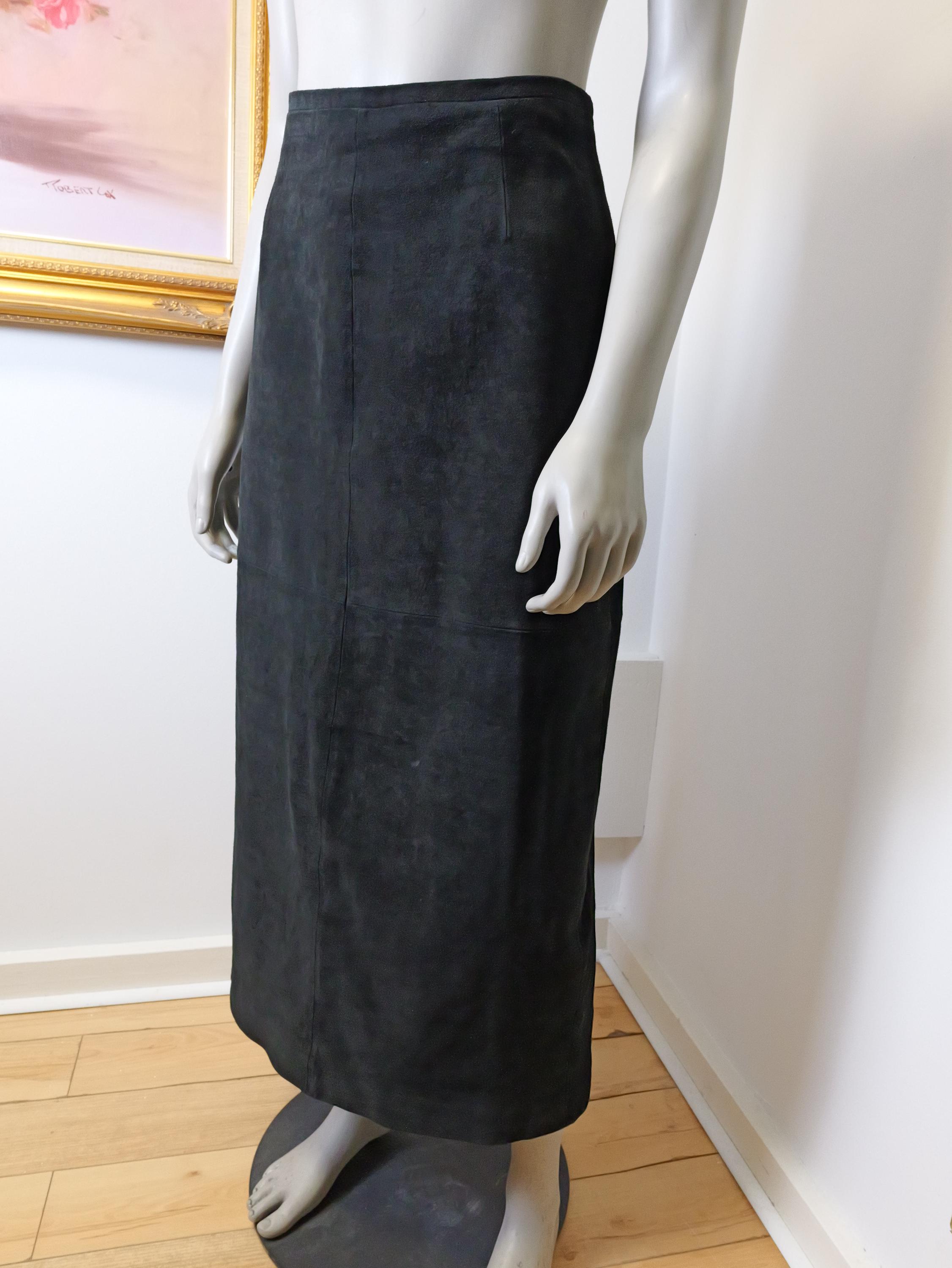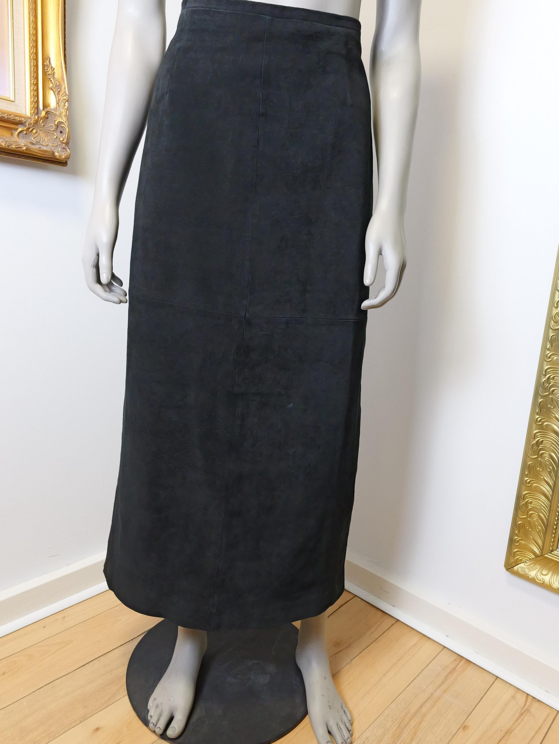 Classic long black suede leather skirt.