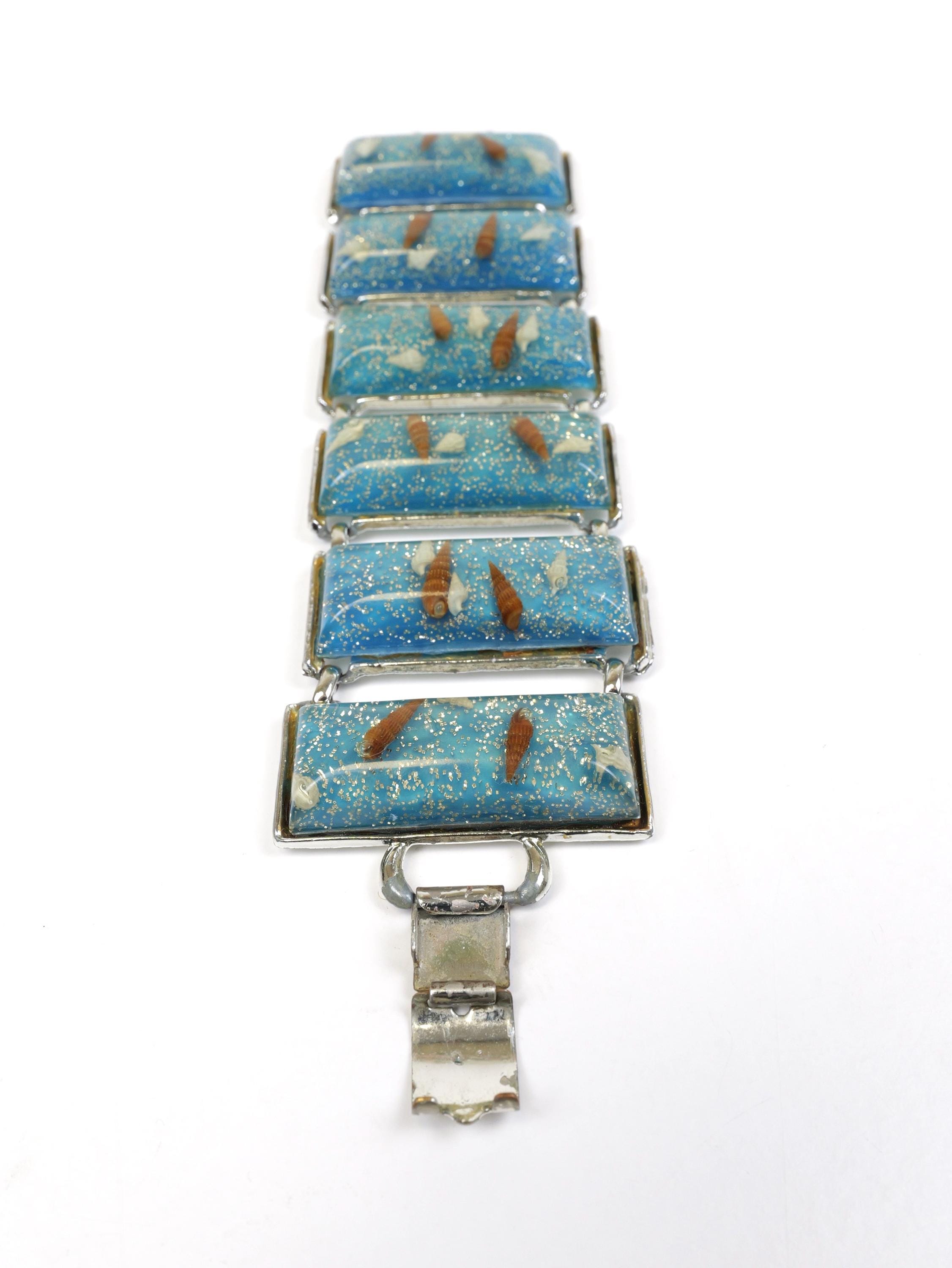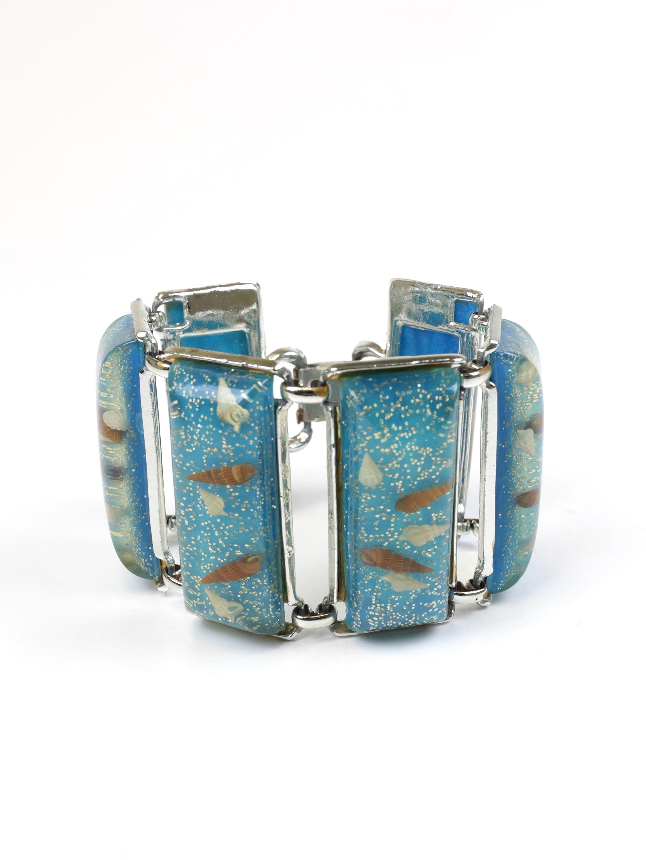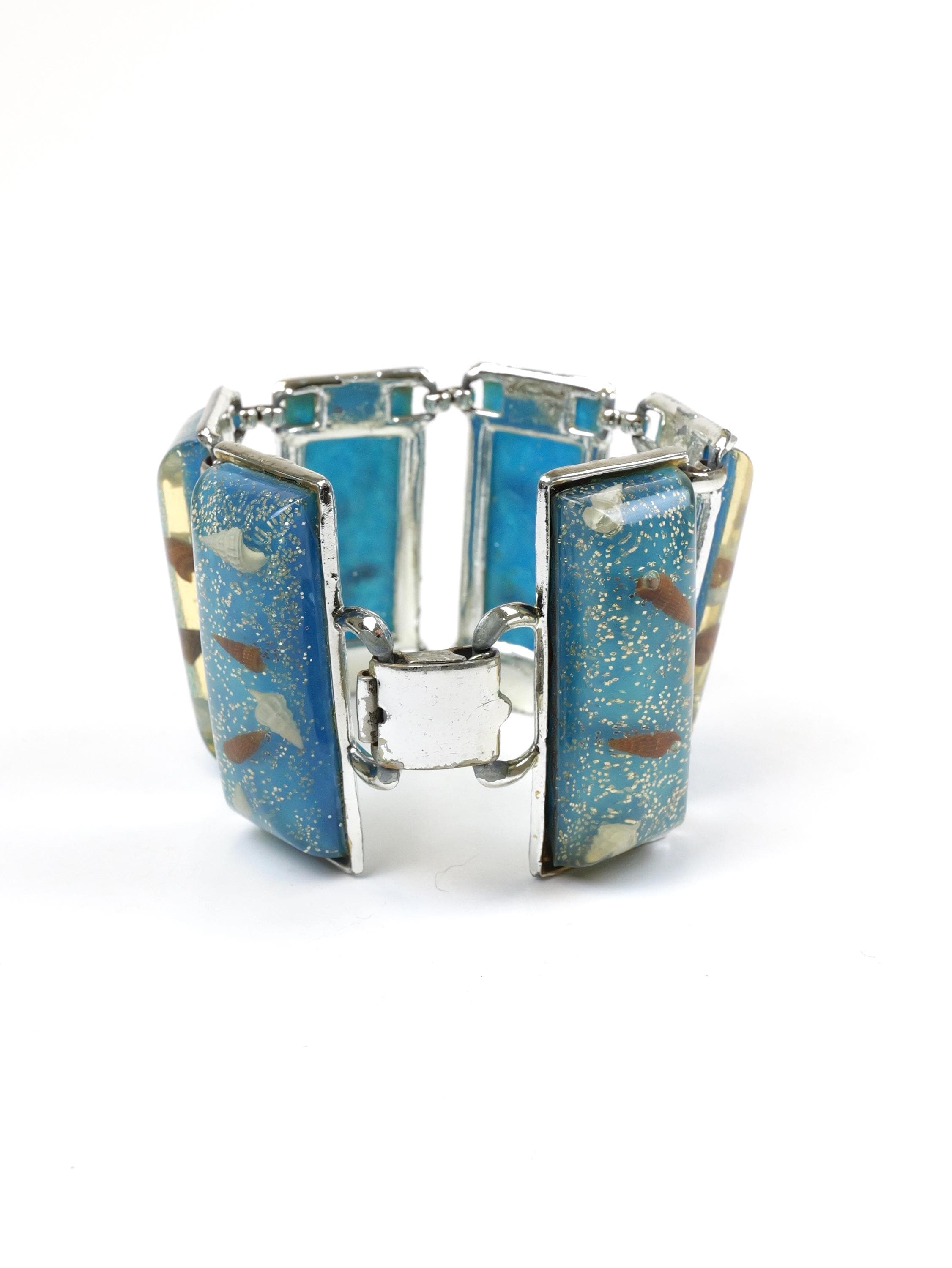 Uber wide clear acrylic and blue lucite seashell link bracelet. Unsigned. Circa 1950’s. Wide, eye catching bracelet. Cream and brown tiny seashells and silver confetti/sprinkles are sealed in acrylic and mounted in a silver tone frame. Playful, sea inspired, statement jewelry. In good condition. There is some silver plating loss on the links and clasp mechanism. 7 1/2” long, each link is 2” x 7/8".
