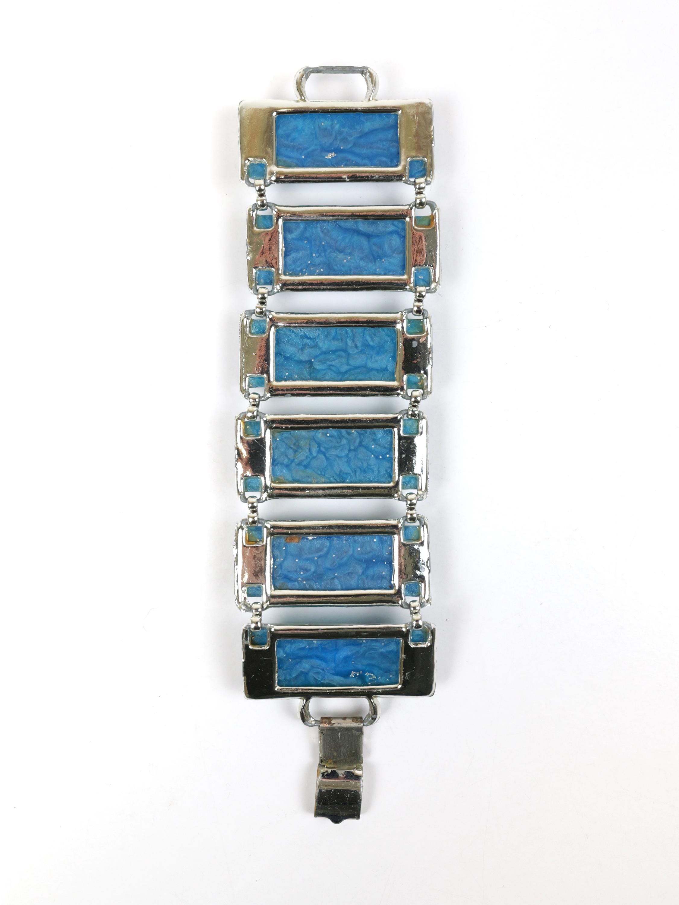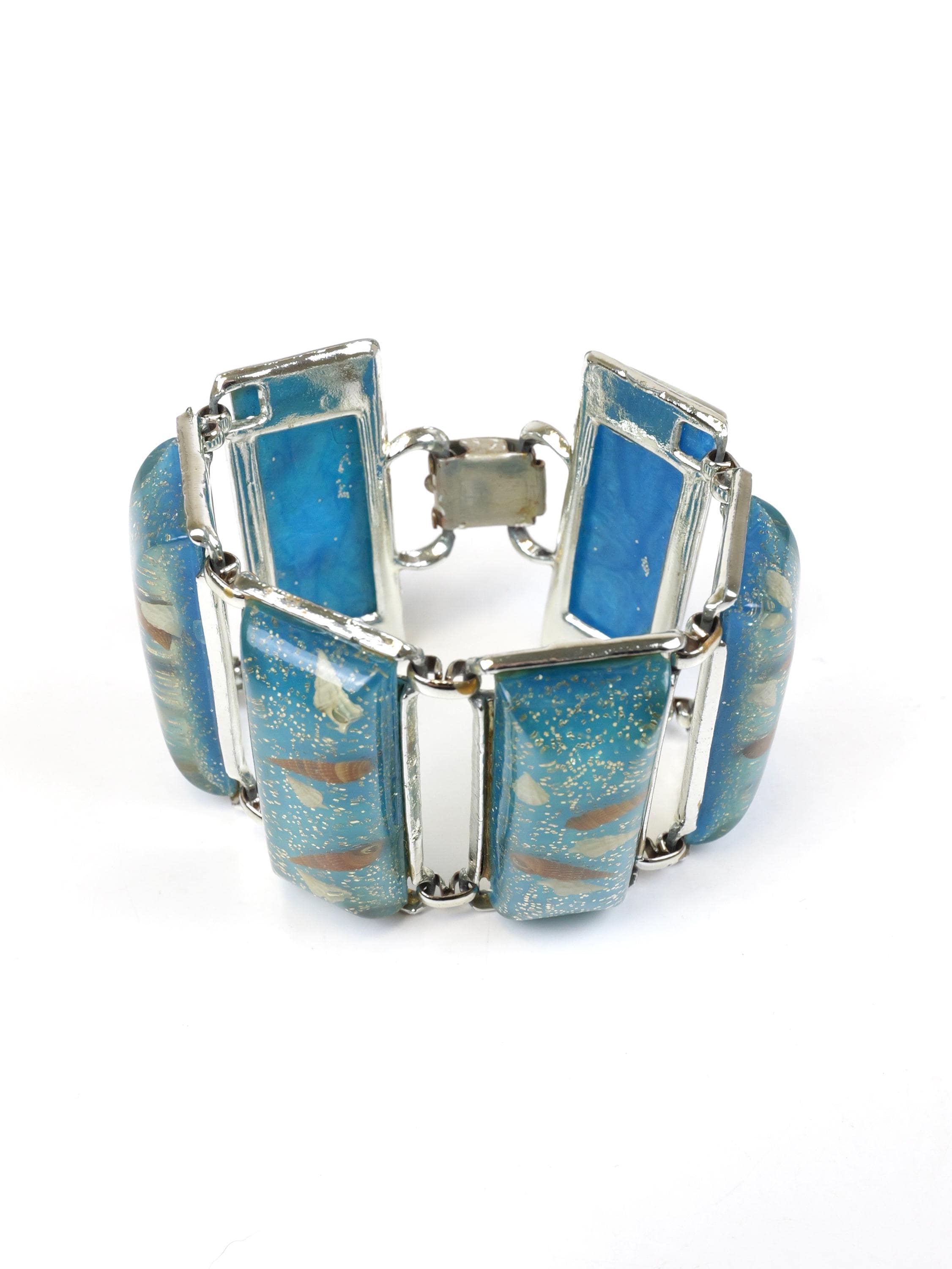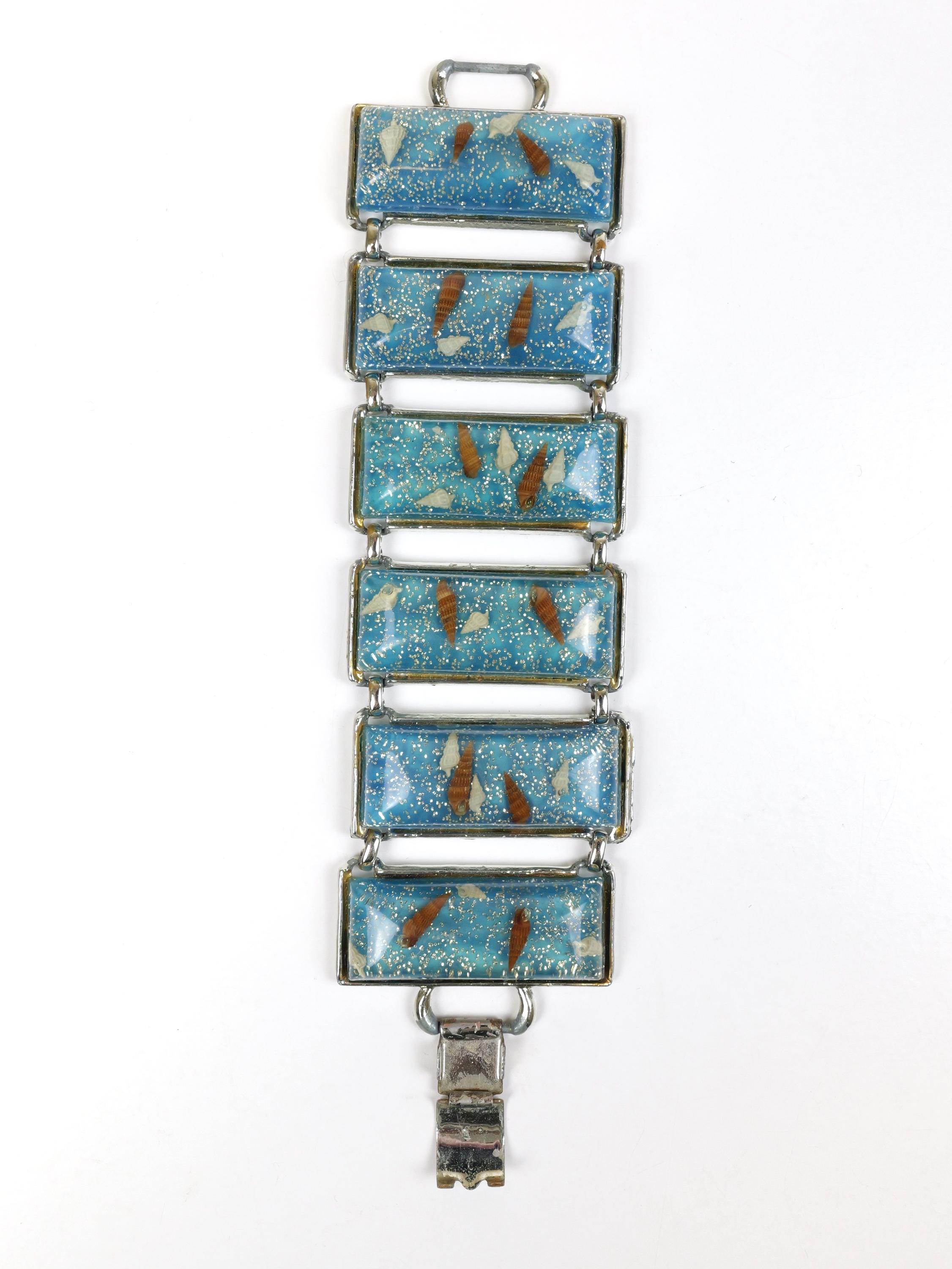 Uber wide clear acrylic and blue lucite seashell link bracelet. Unsigned. Circa 1950’s. Wide, eye catching bracelet. Cream and brown tiny seashells and silver confetti/sprinkles are sealed in acrylic and mounted in a silver tone frame. Playful, sea inspired, statement jewelry. In good condition. There is some silver plating loss on the links and clasp mechanism. 7 1/2” long, each link is 2” x 7/8".