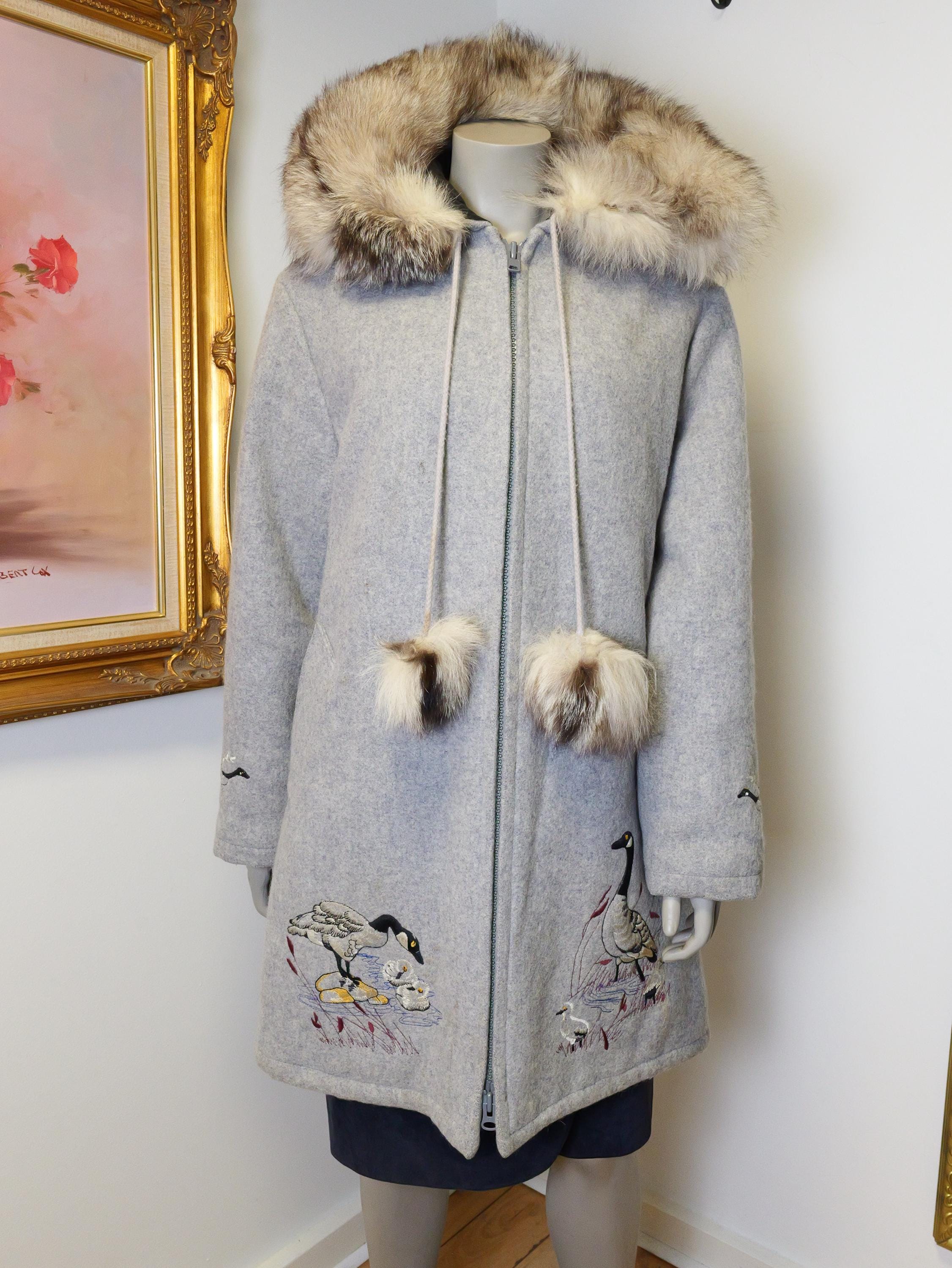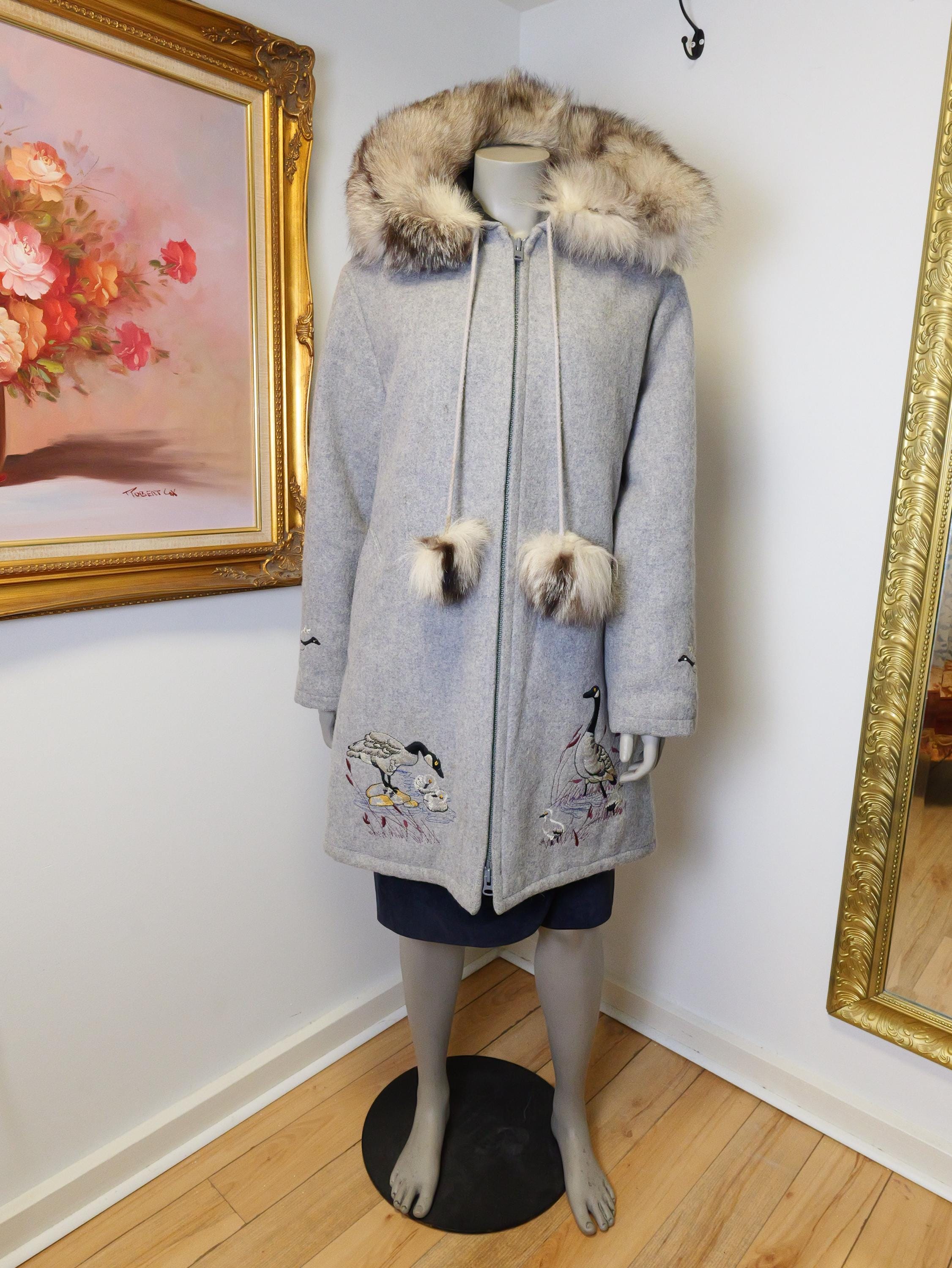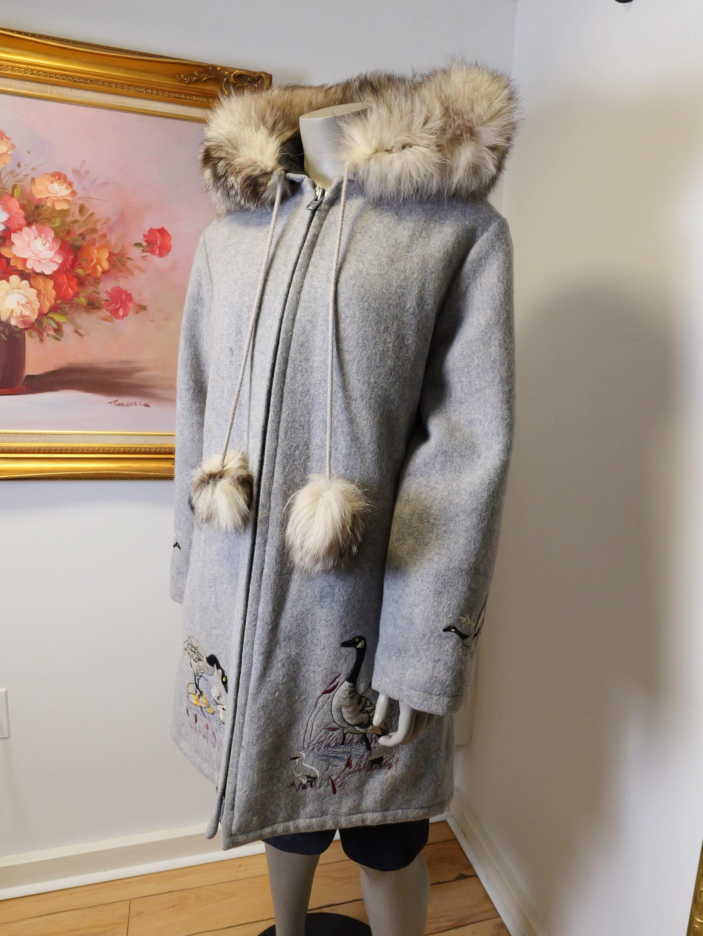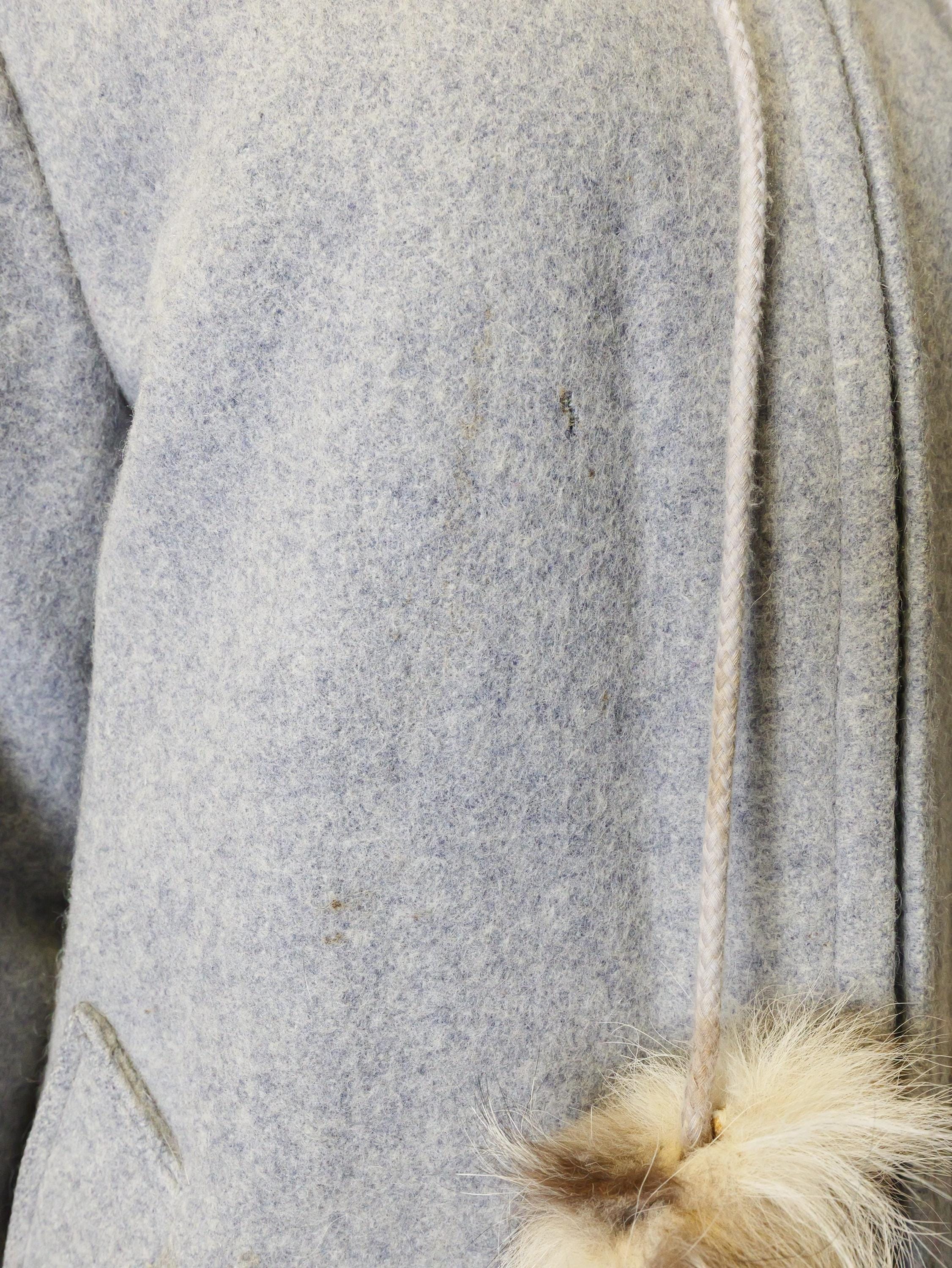 100% wool. Great quality vintage Winter coat, shows some light past use and wear. Can still be worn many years to come!