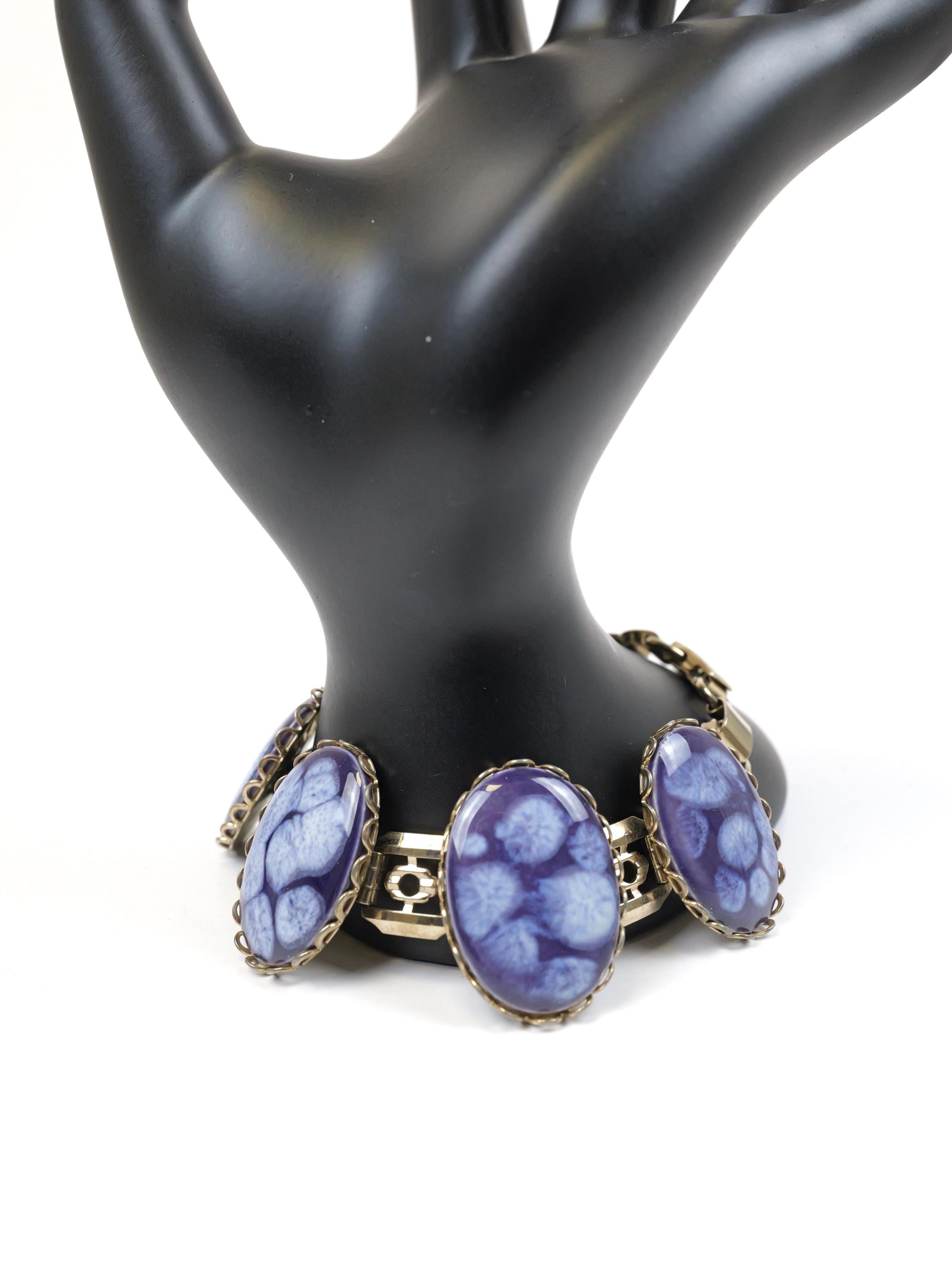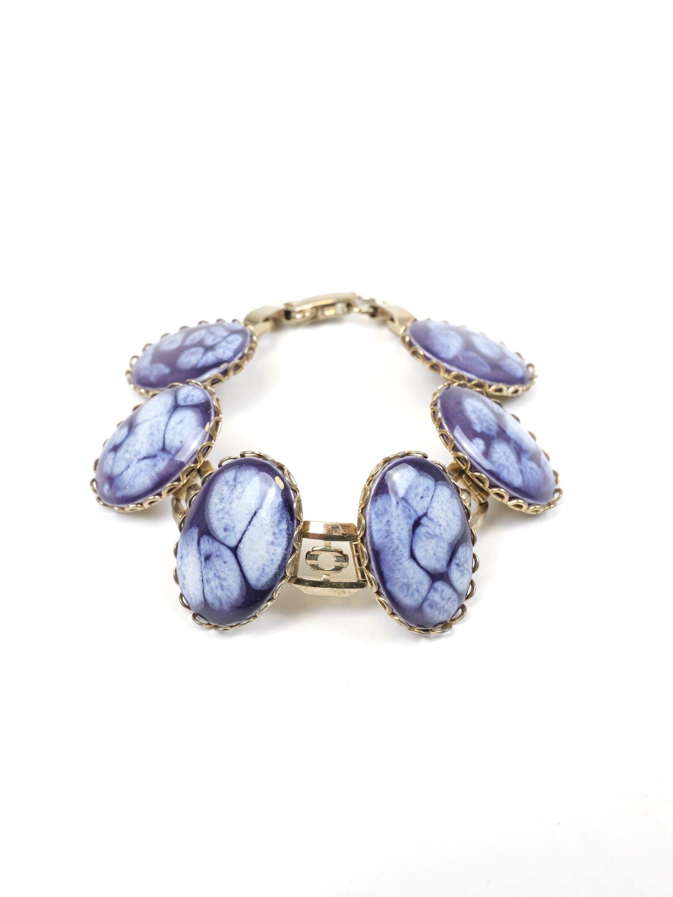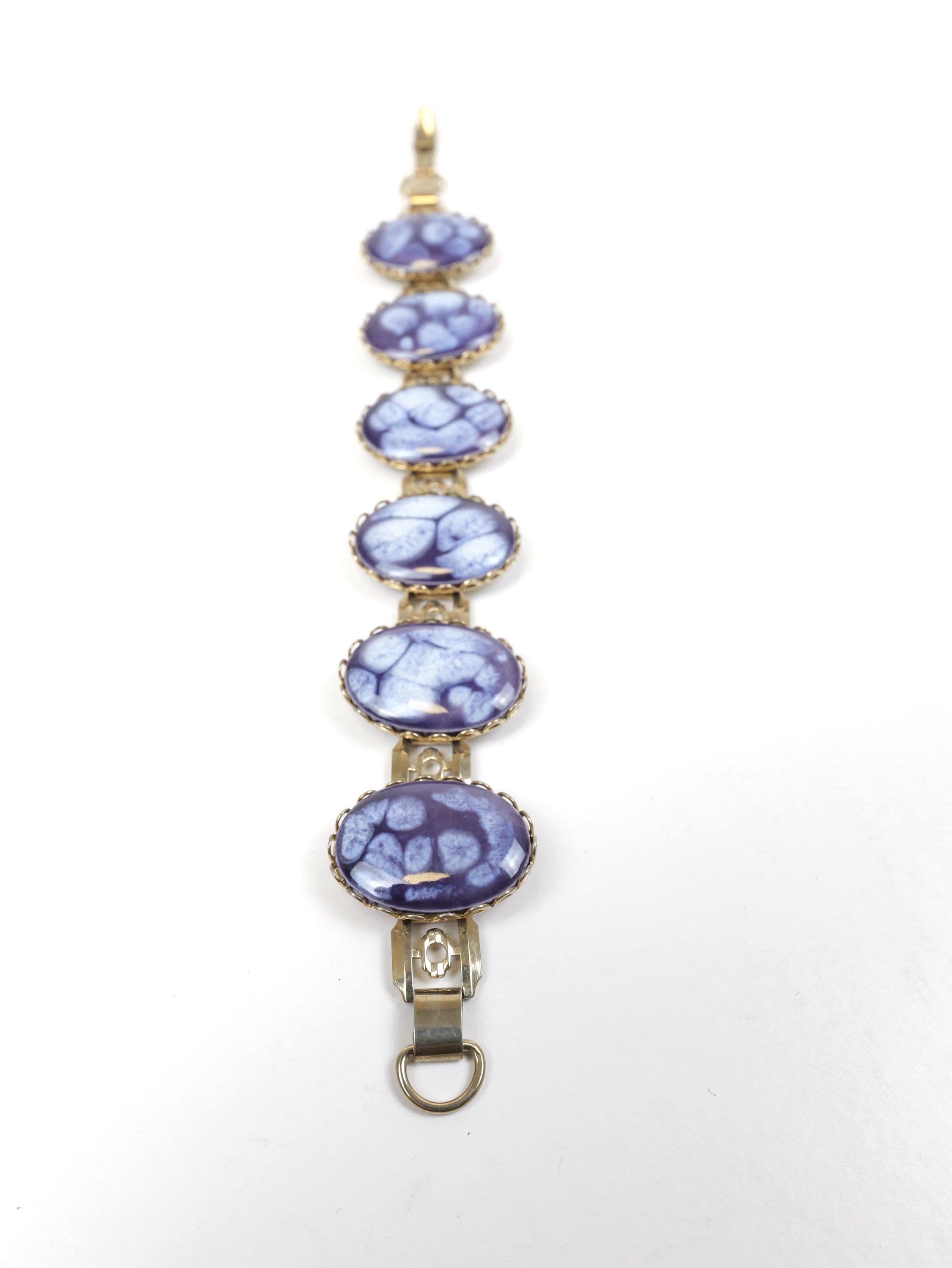 Pretty and unique Periwinkle and purple splotched glass oval cabochon and gold tone link bracelet.
