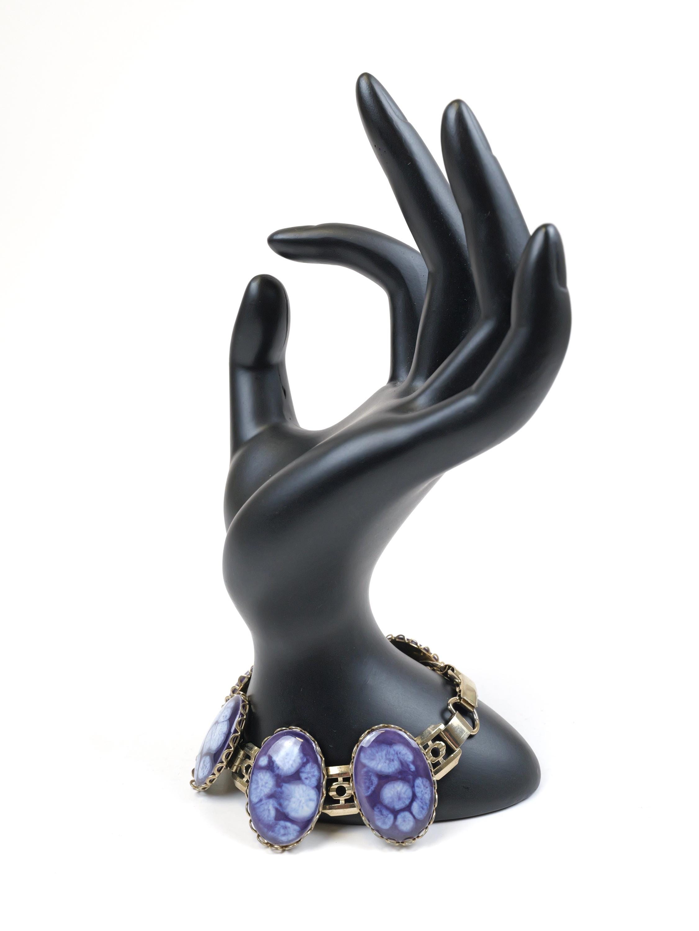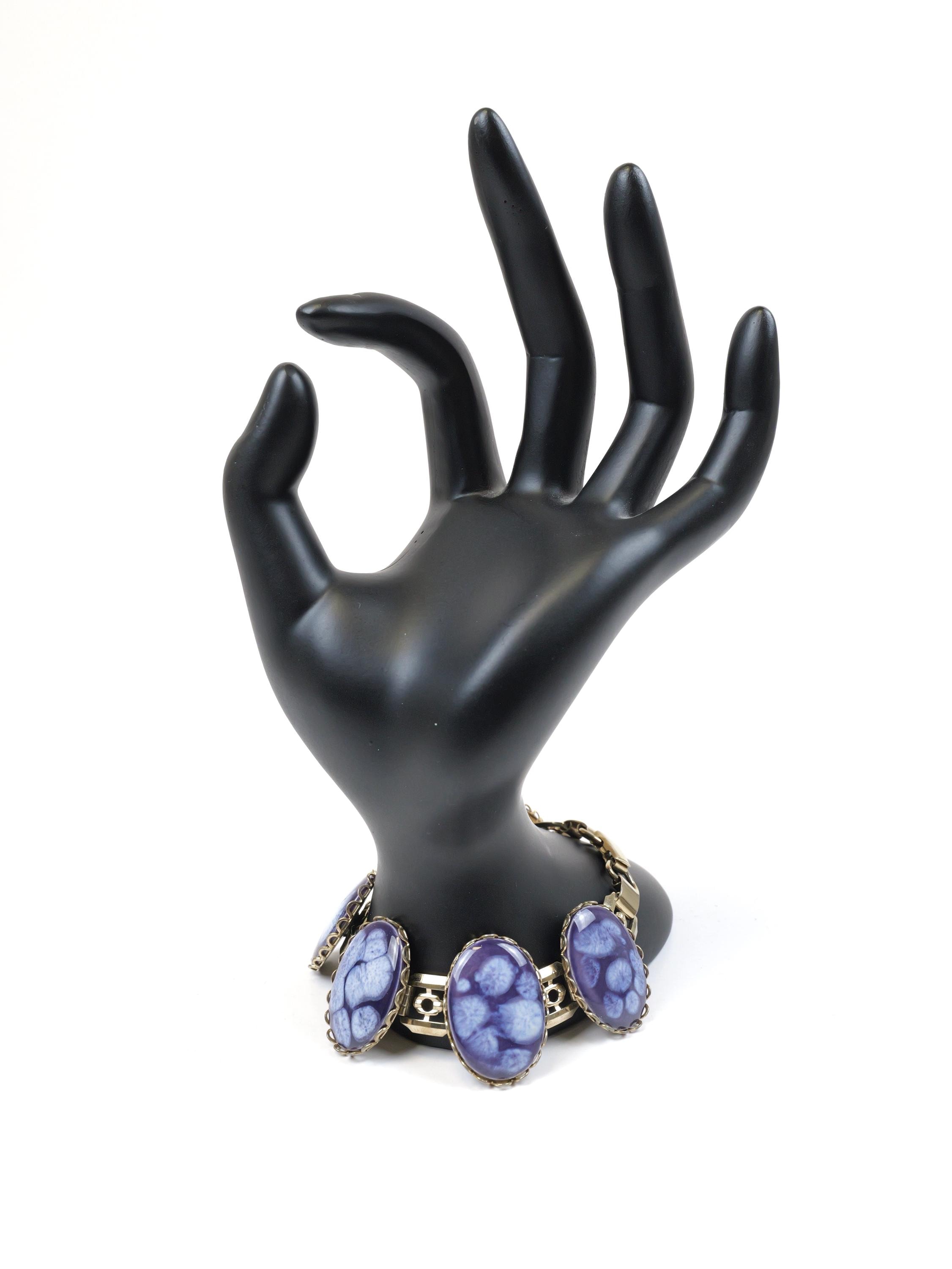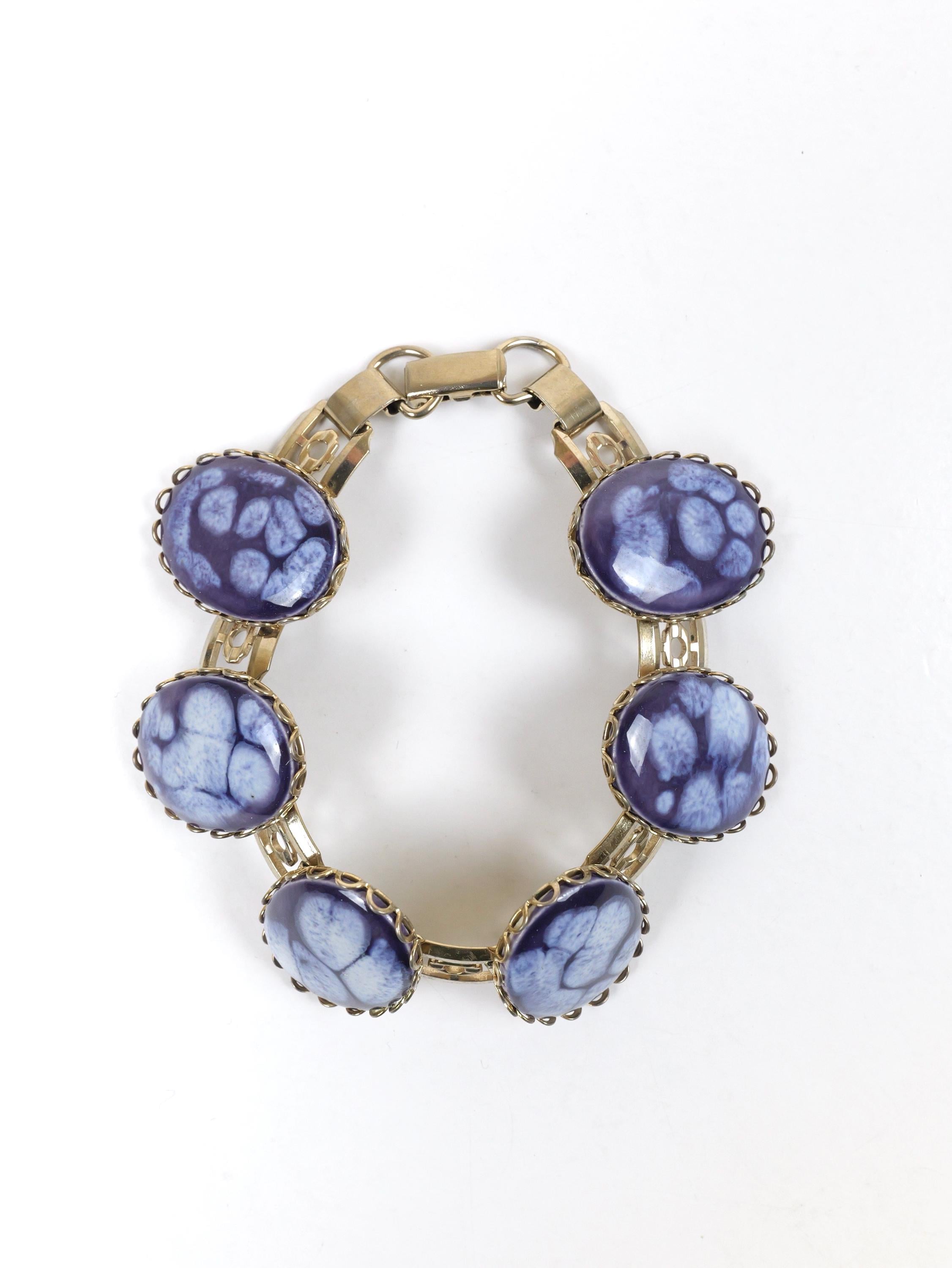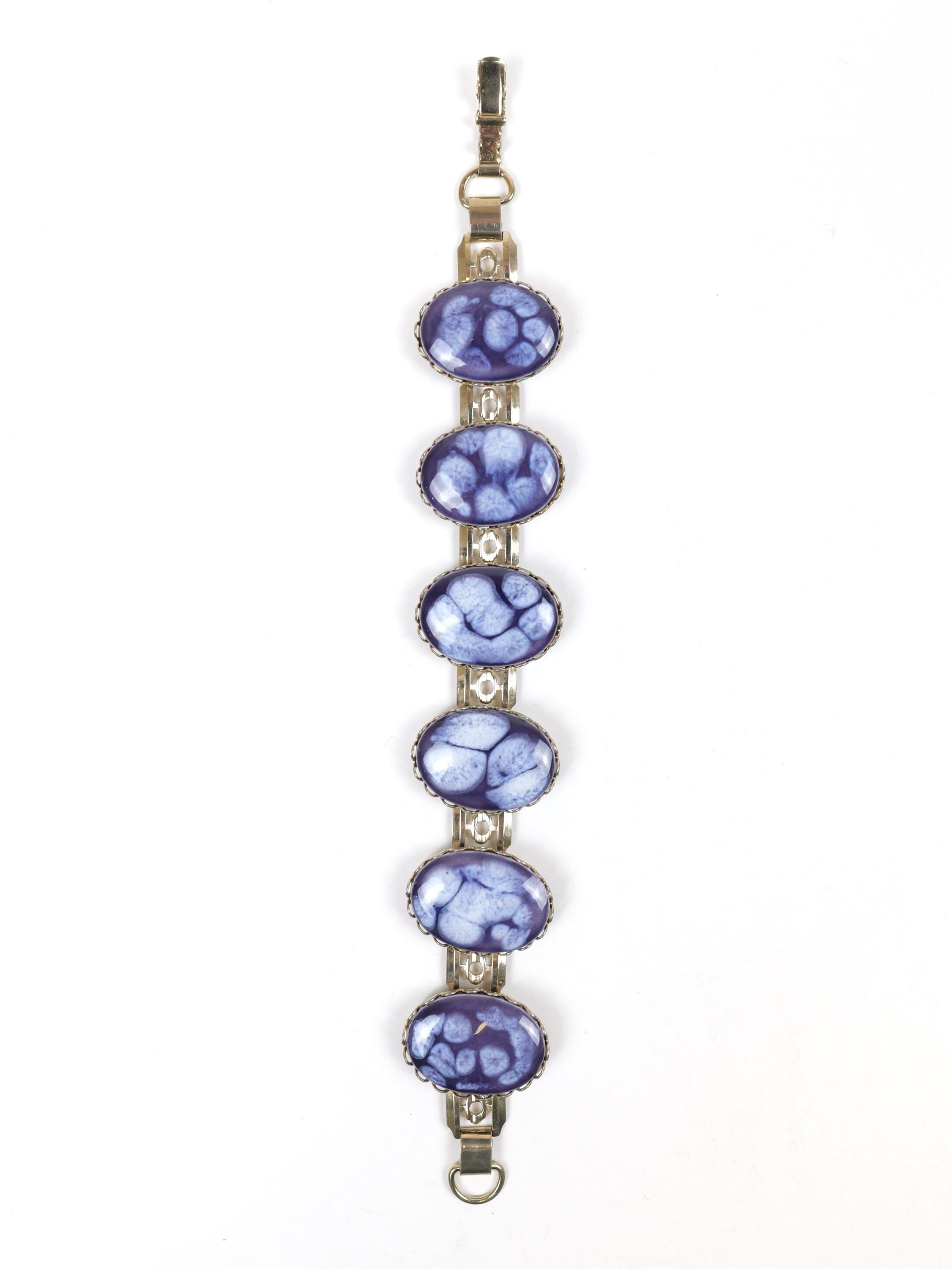 Pretty and unique Periwinkle and purple splotched glass oval cabochon and gold tone link bracelet.