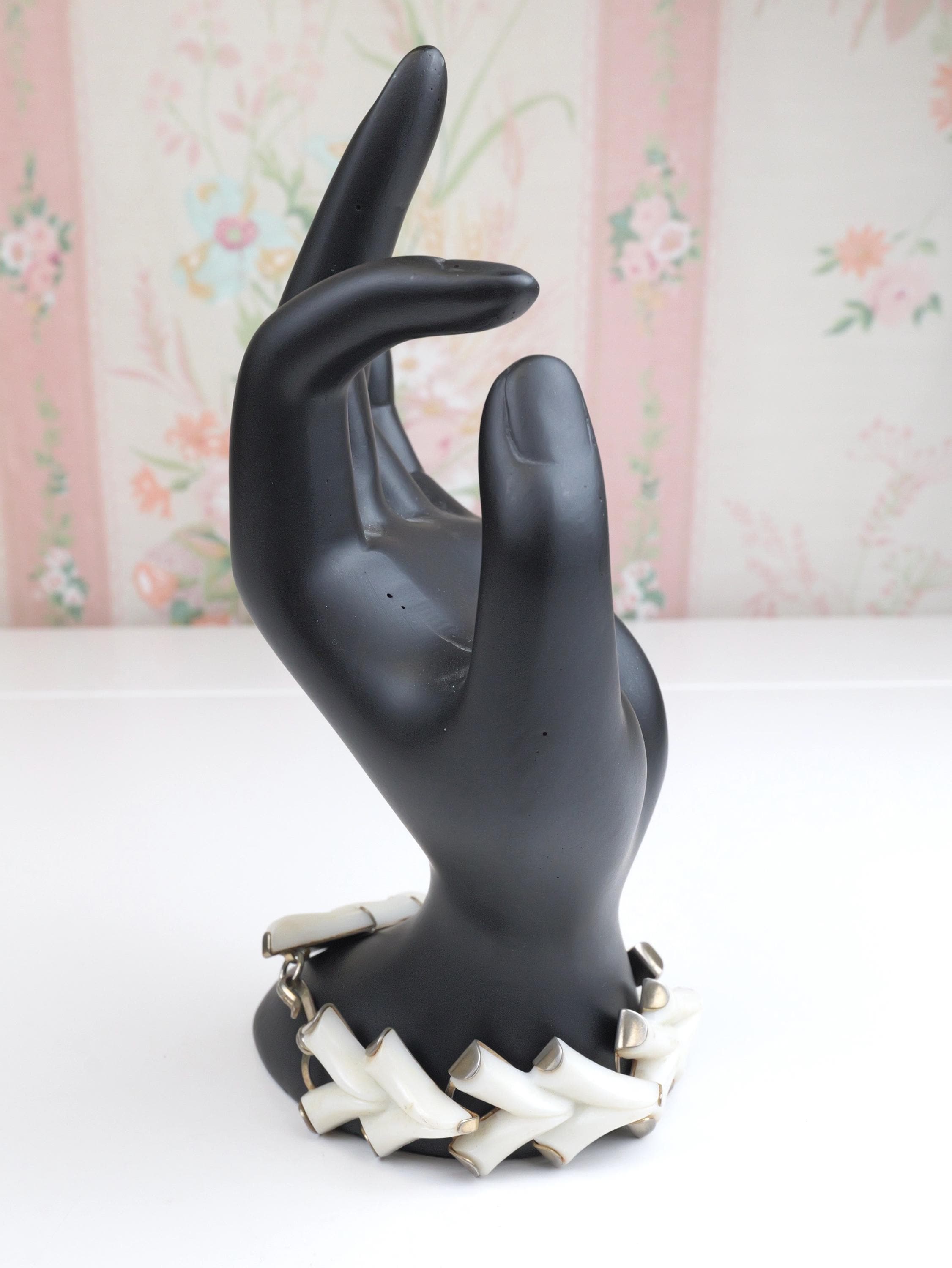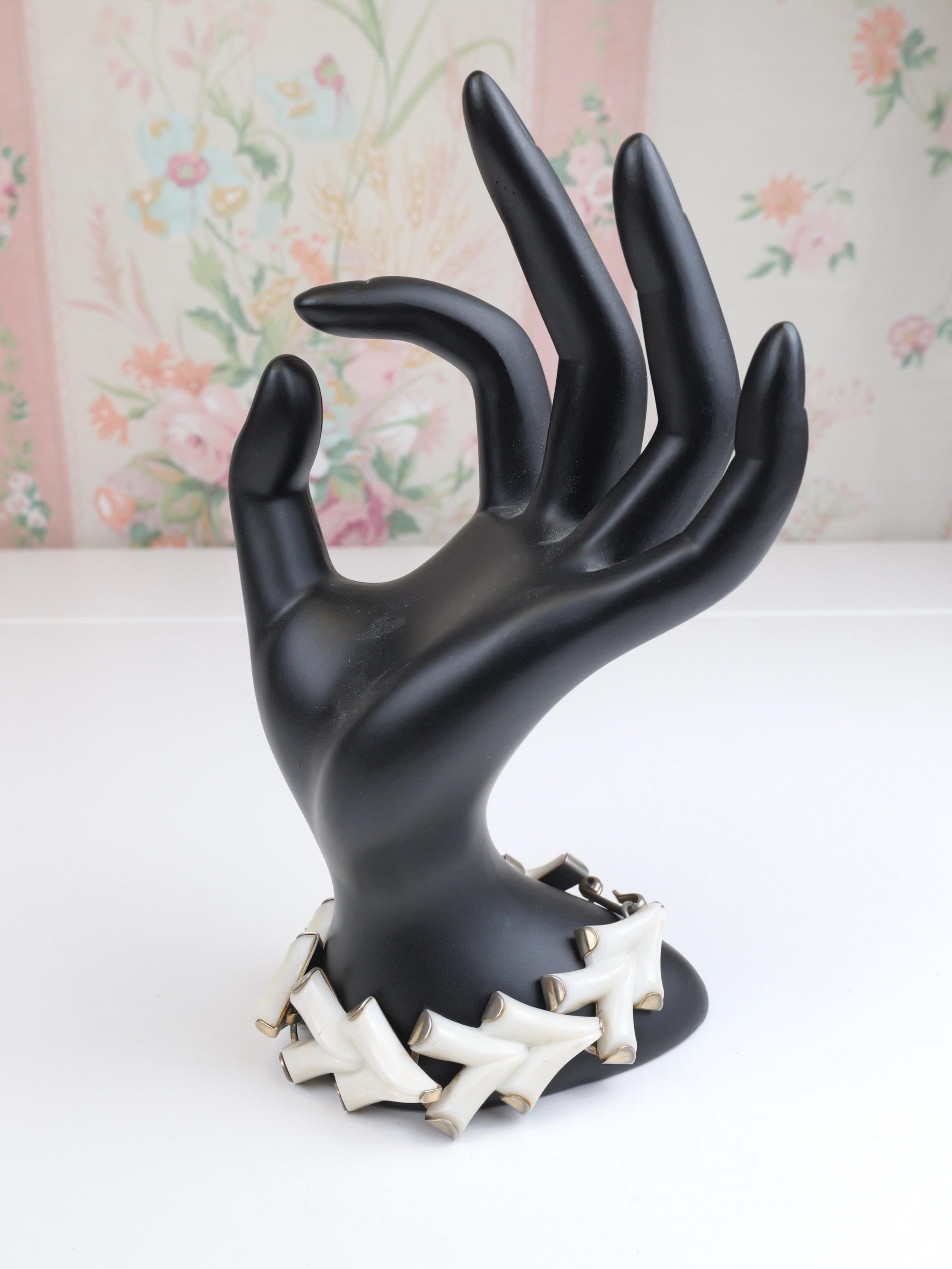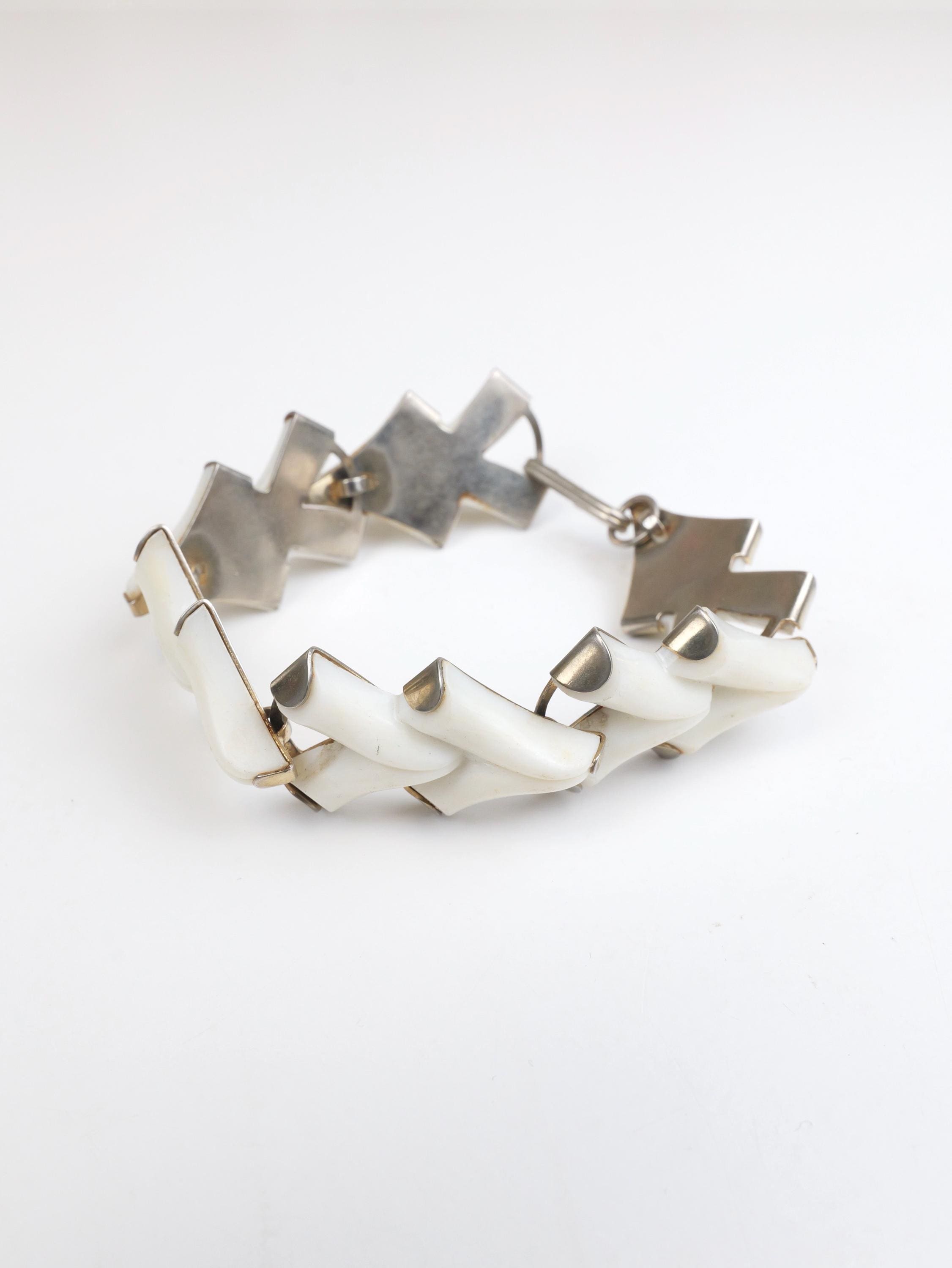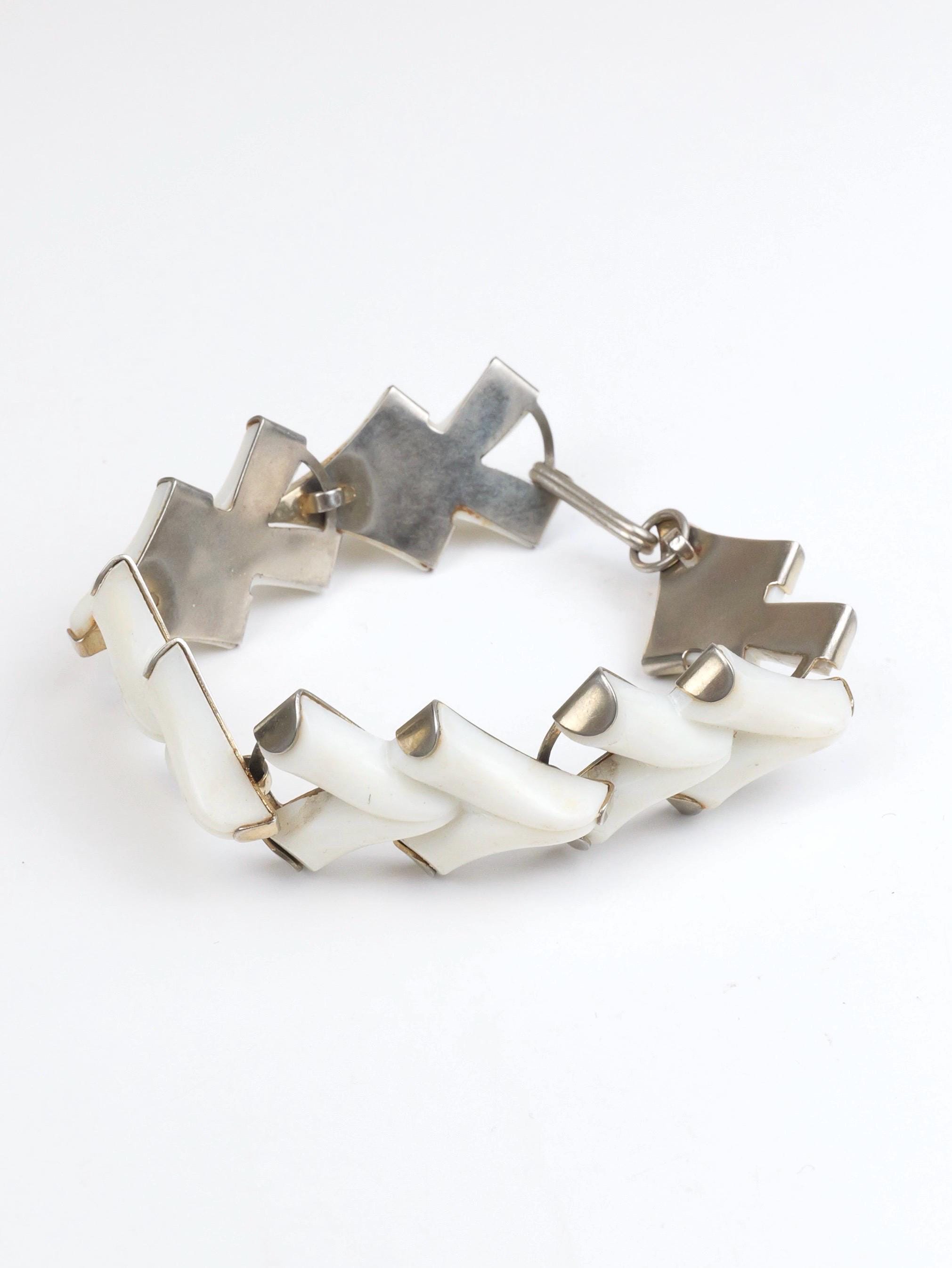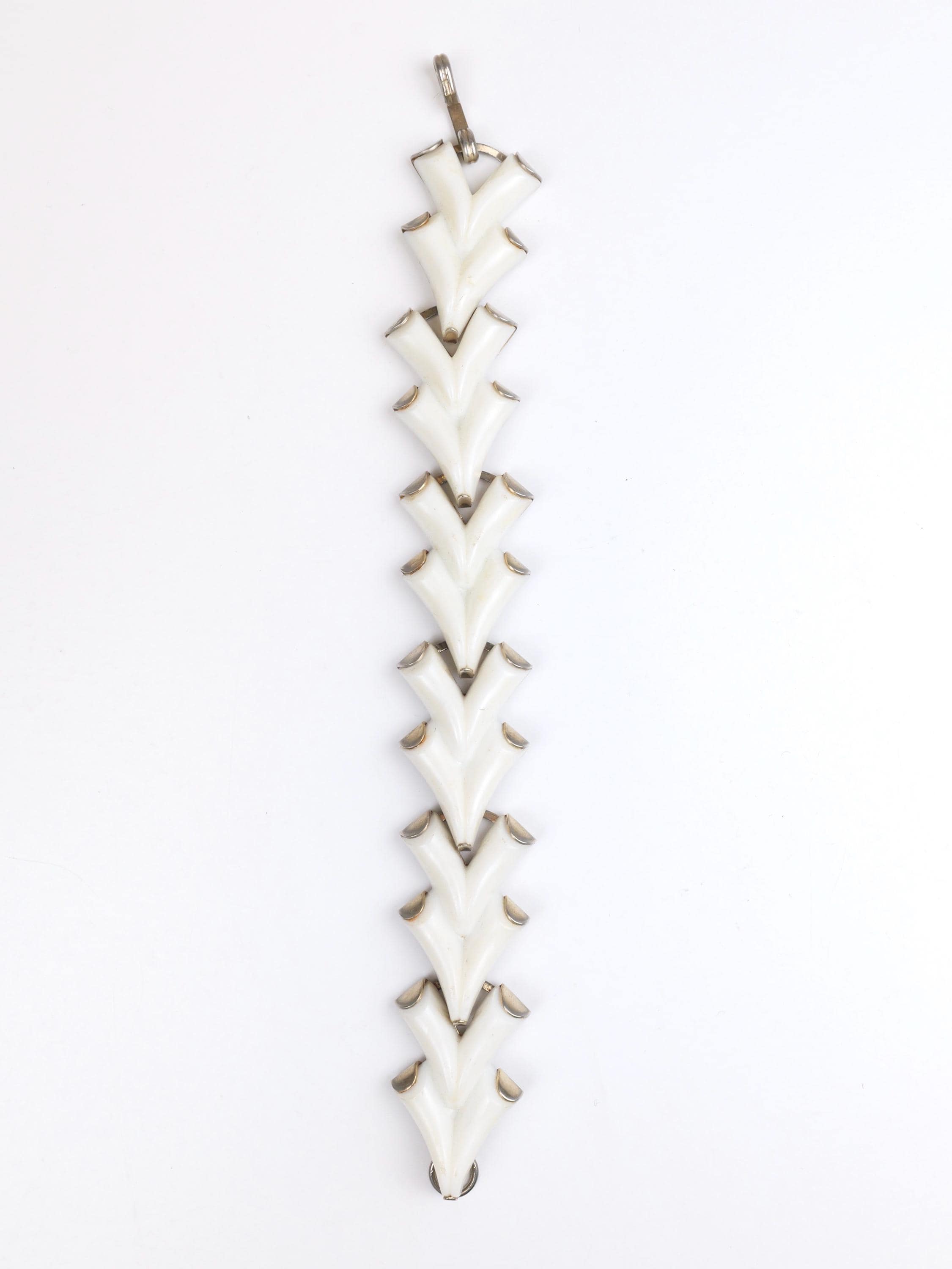 Perfect for a cruise or beach vacation! Coral style White lucite and silver tone arrow head shaped link bracelet. Unsigned. Circa 1950’s 1960’s. Very interesting design to this bracelet, each link is bright white double arrow head cabochons. Closes securely with a hook. In very good condition. 7 1/2” long, 1” wide.