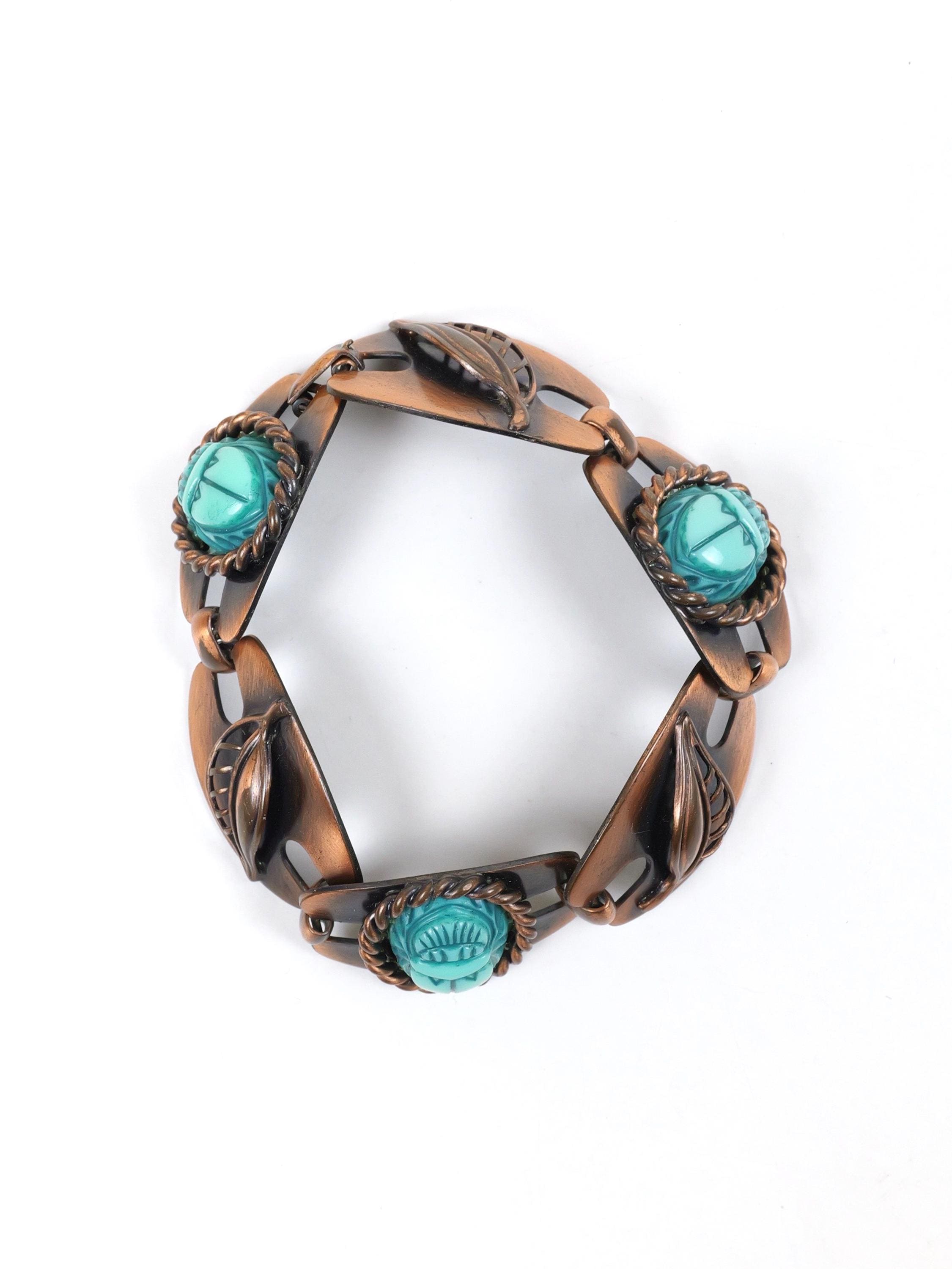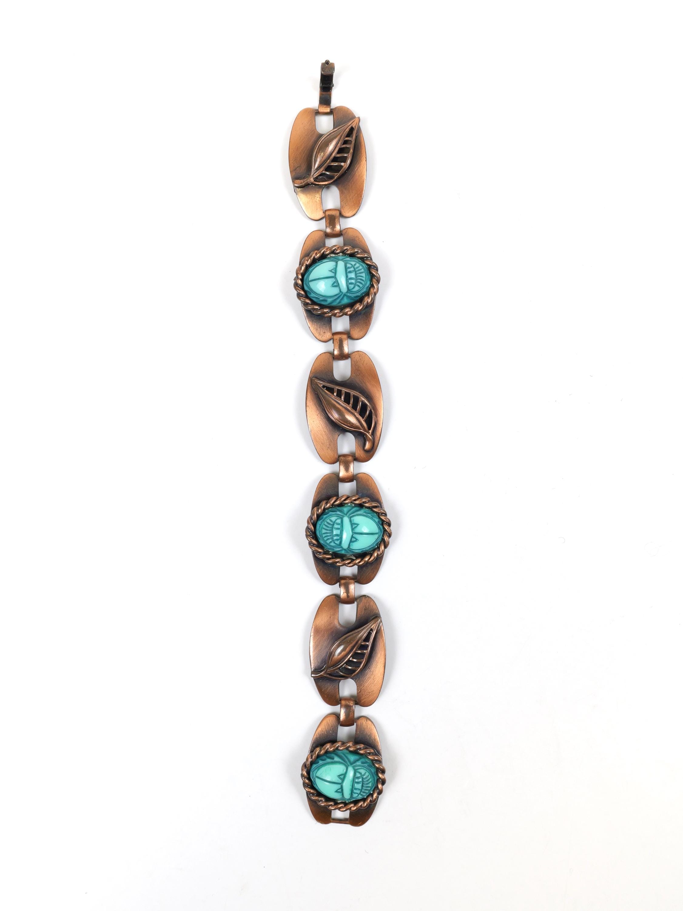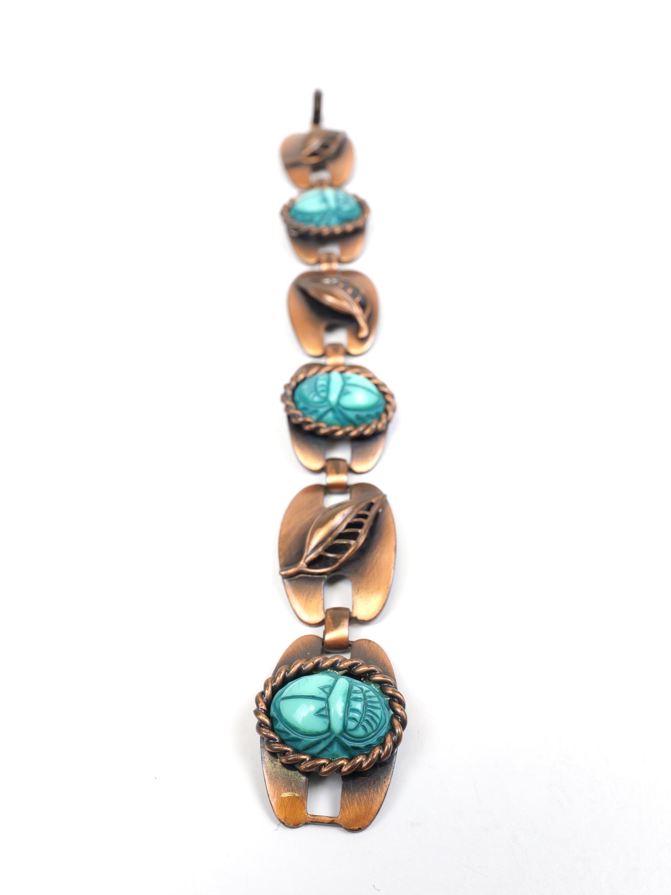 Egyptian Revival turquoise resin scarab and leaf embellished copper link bracelet. Unsigned. Circa 1960’s 1970’s. Beautiful eye catching scarab bracelet for the “anything Egyptian” lover. Alternating scarab and leaf links. In very good condition. There is some scratches and nicks on the copper surfaces. The scarabs are in perfect condition. 7 1/2” long, 3/4” wide.