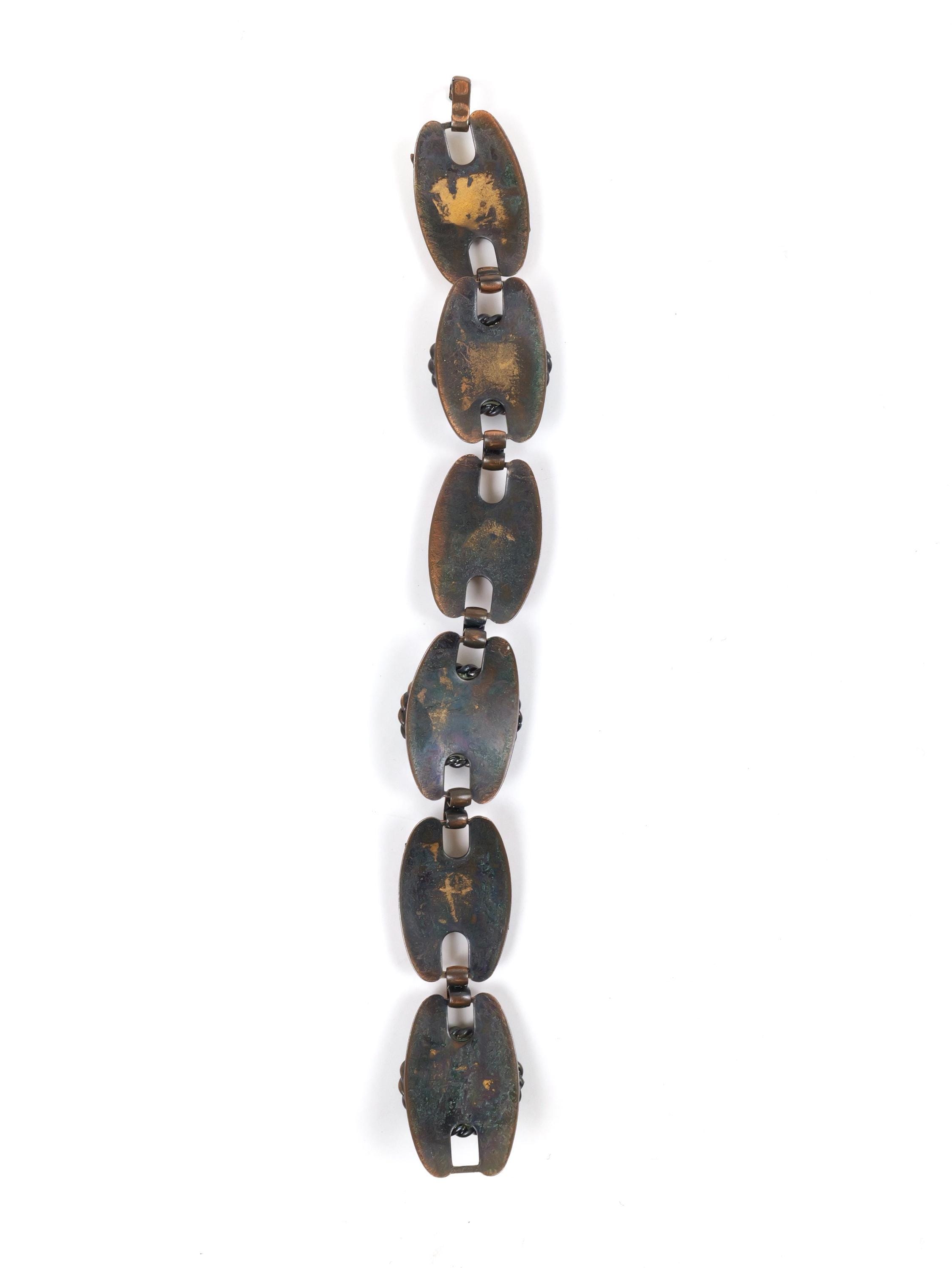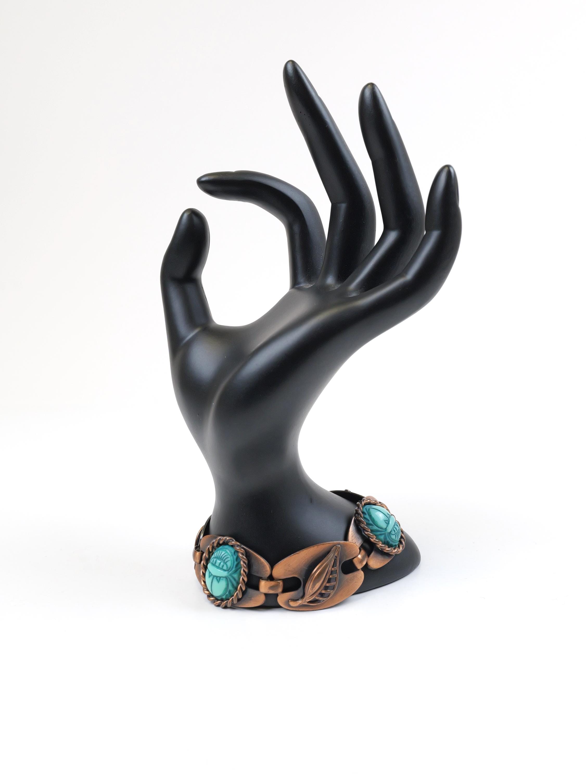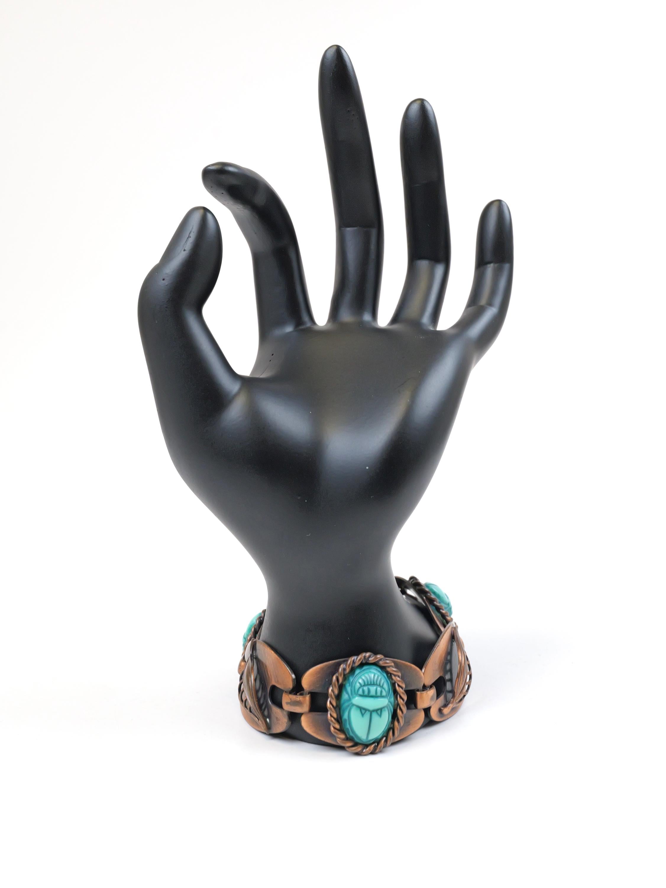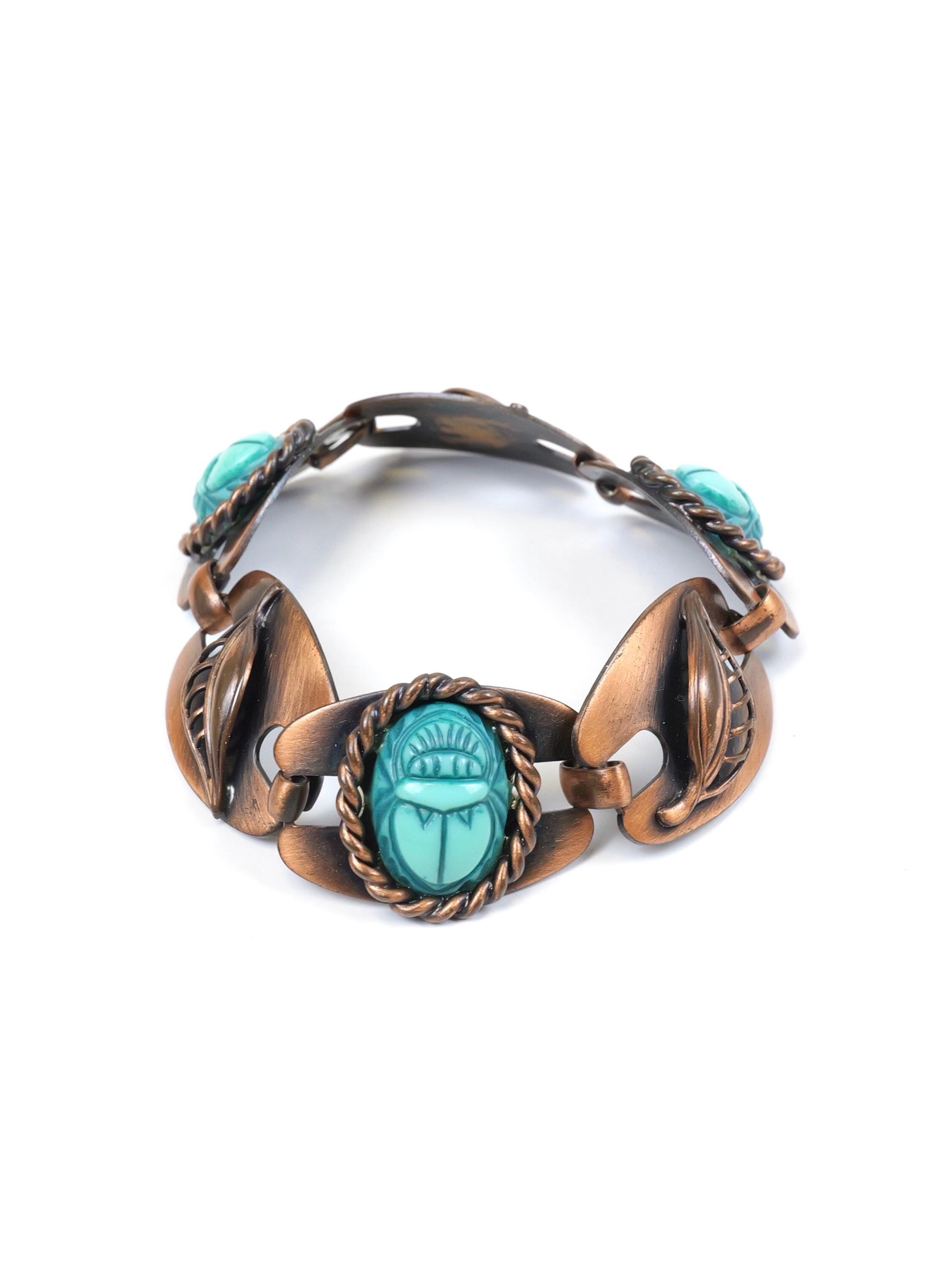 Egyptian Revival turquoise resin scarab and leaf embellished copper link bracelet. Unsigned. Circa 1960’s 1970’s. Beautiful eye catching scarab bracelet for the “anything Egyptian” lover. Alternating scarab and leaf links. In very good condition. There is some scratches and nicks on the copper surfaces. The scarabs are in perfect condition. 7 1/2” long, 3/4” wide.
