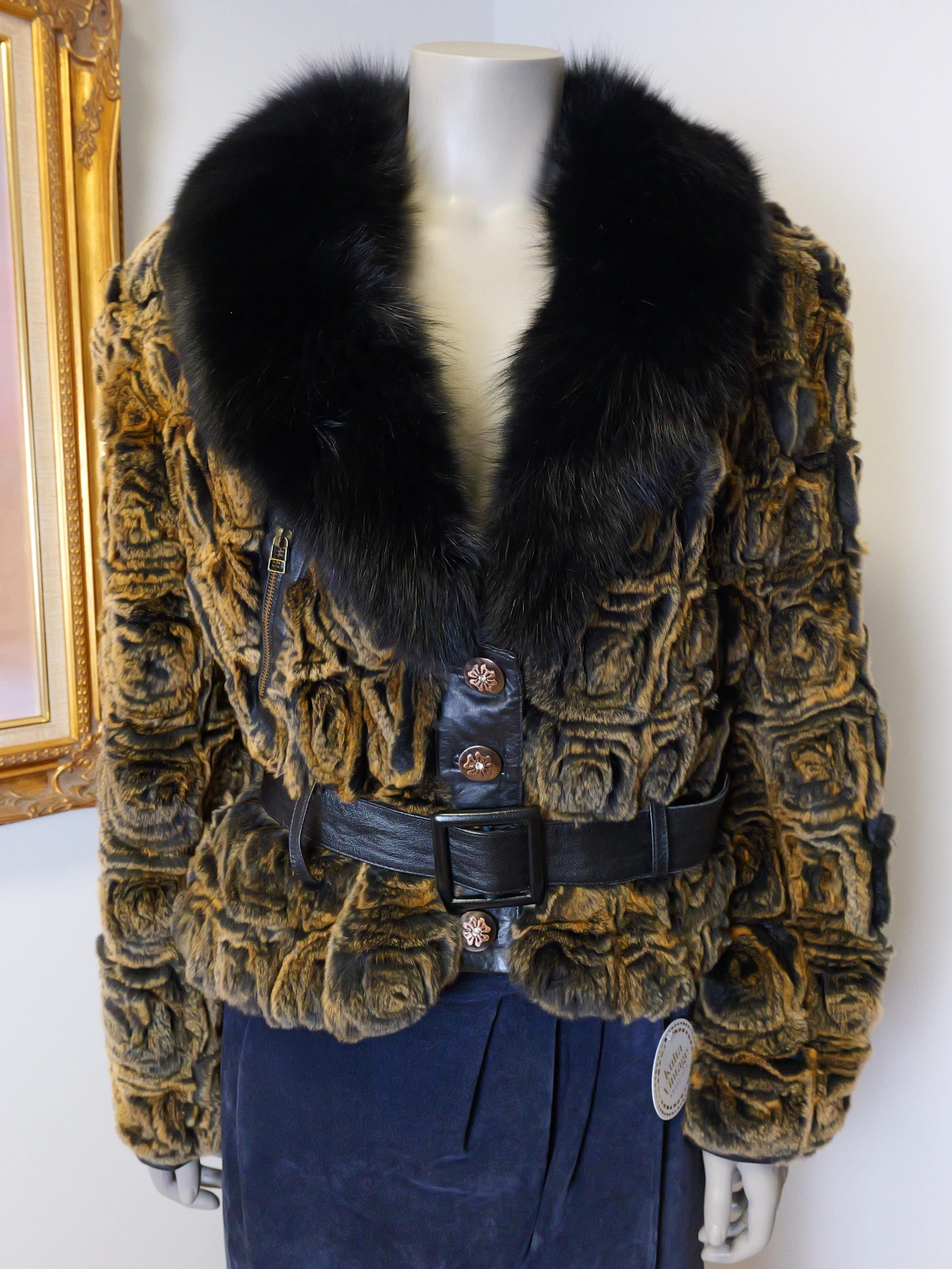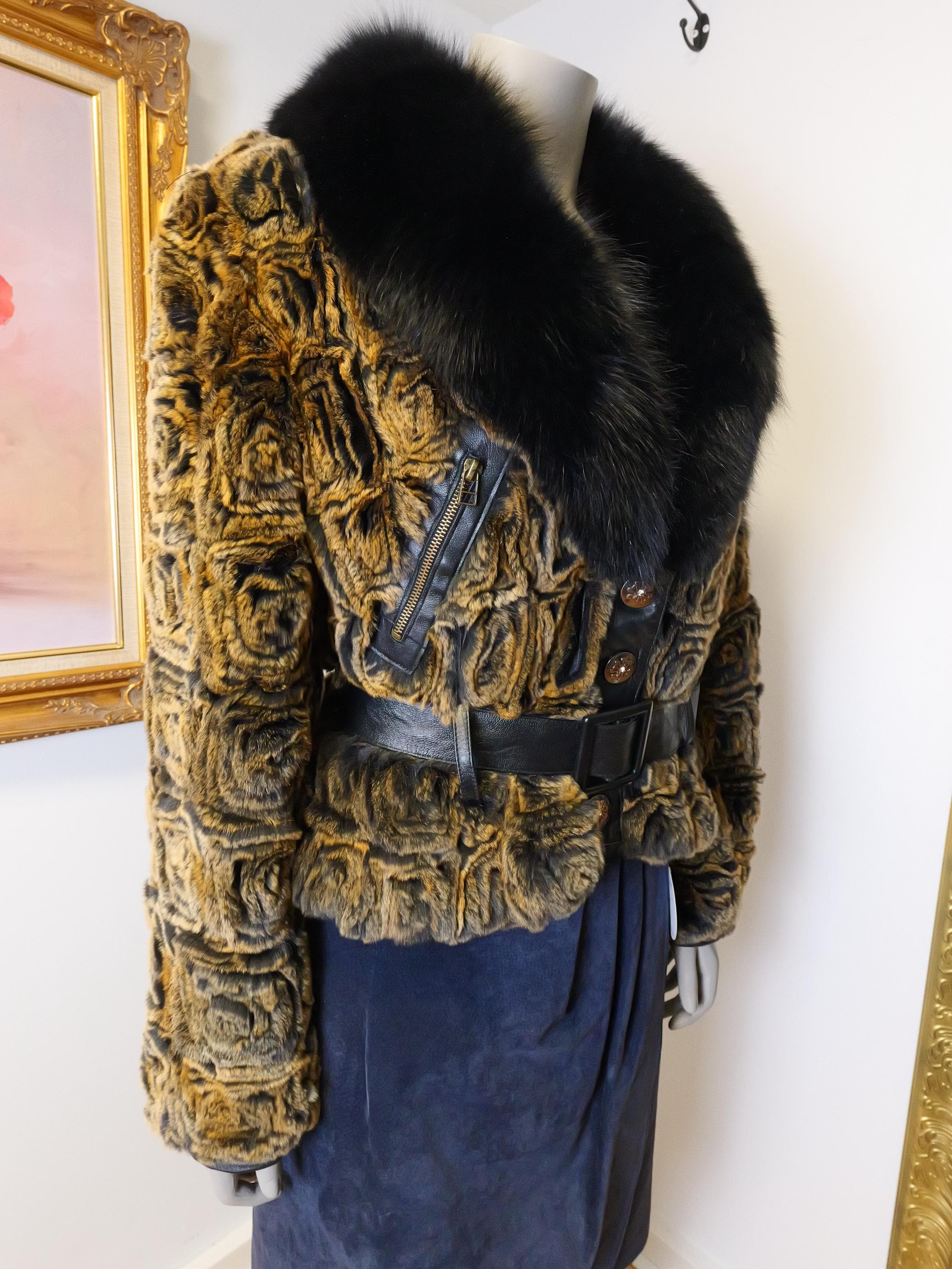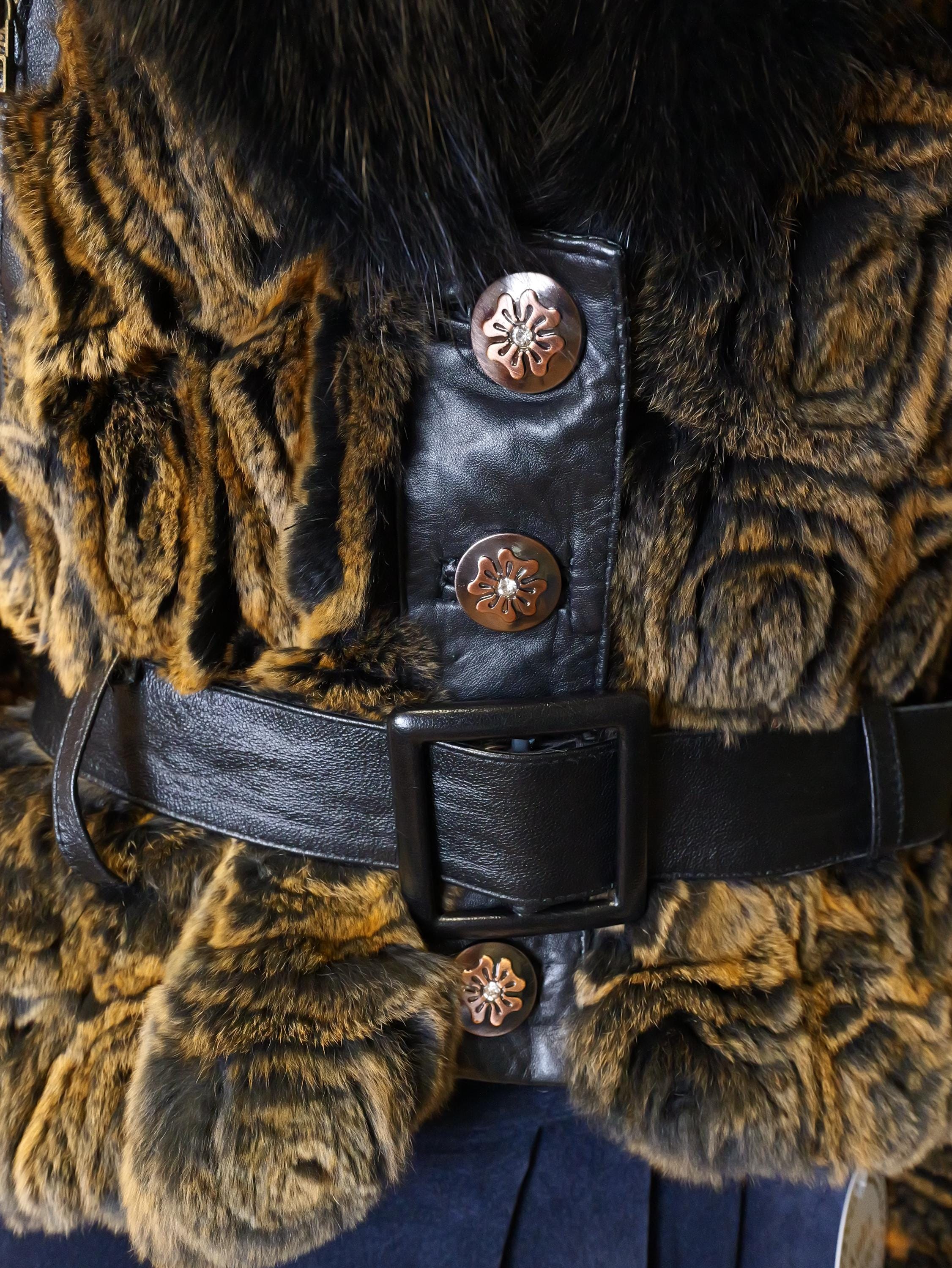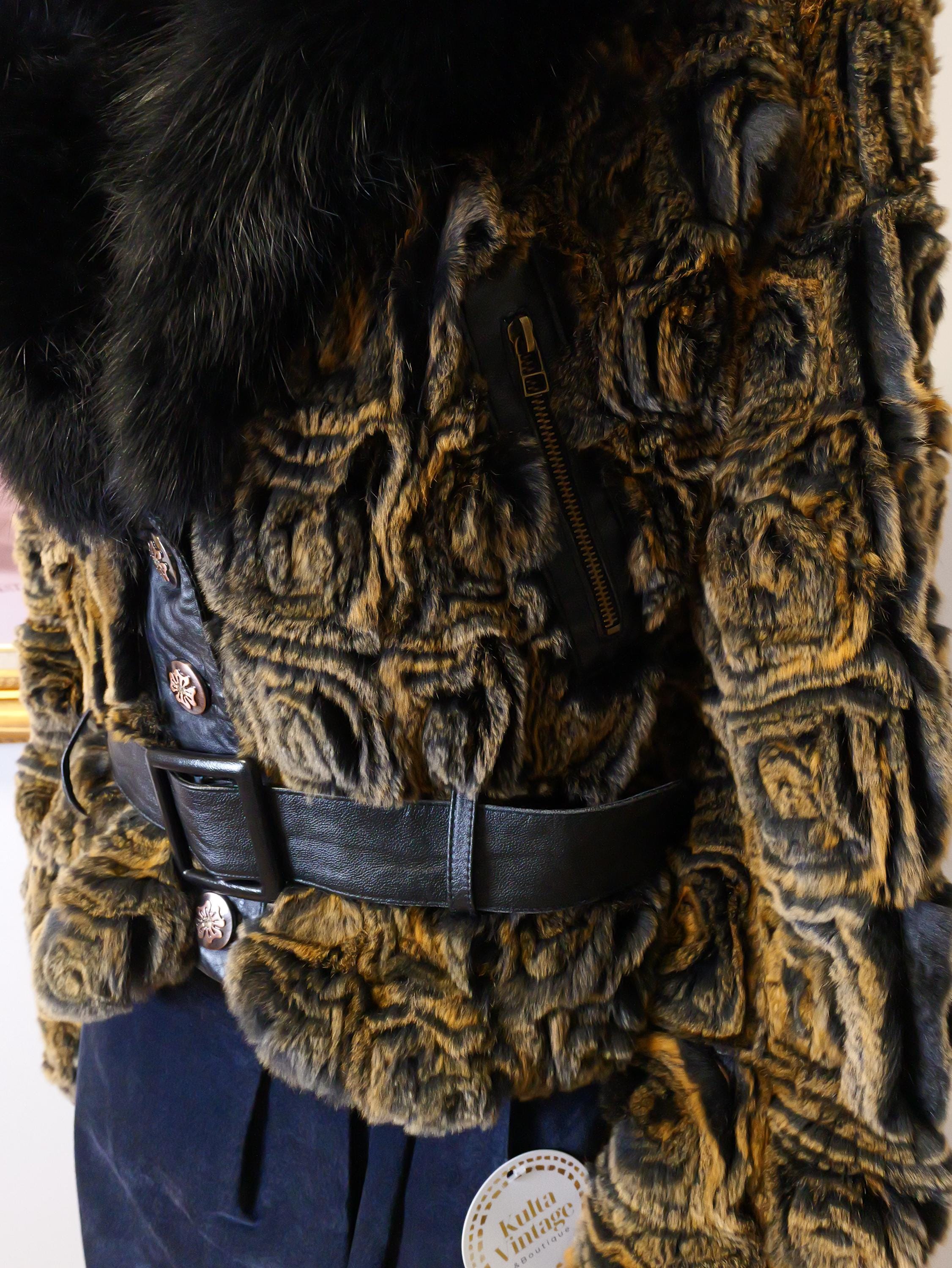 Stunning rabbit fur coat with fluffy black collar and butter soft black leather belt.