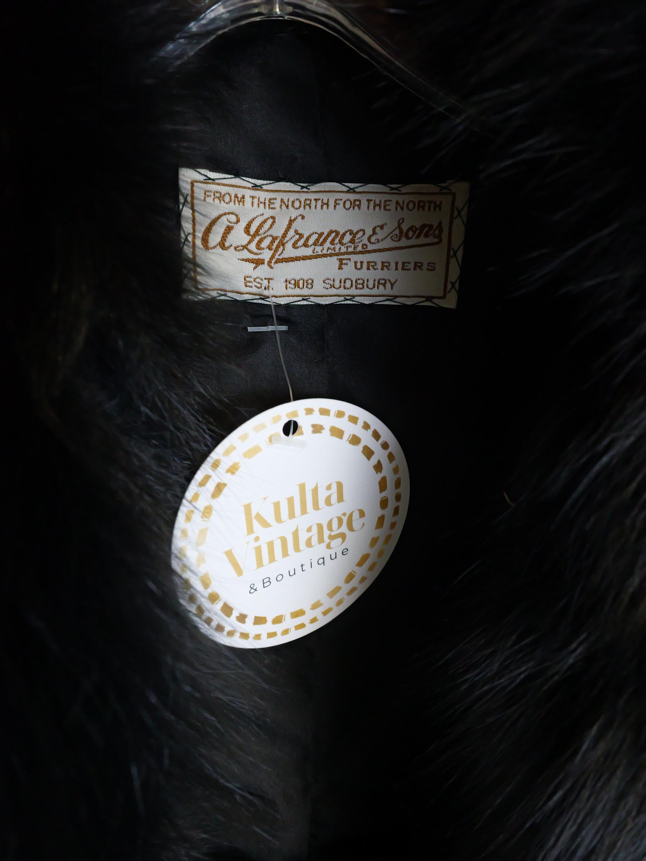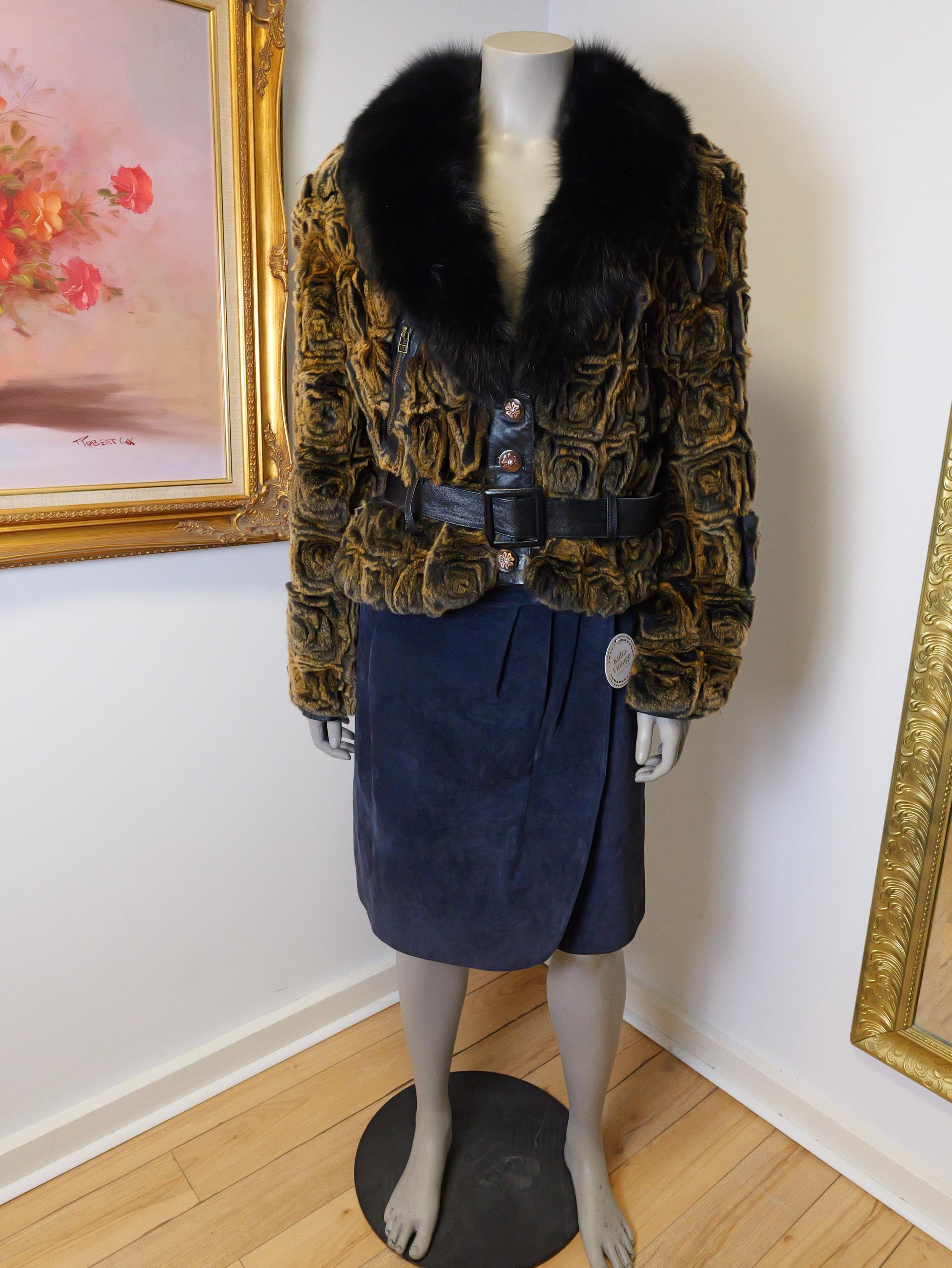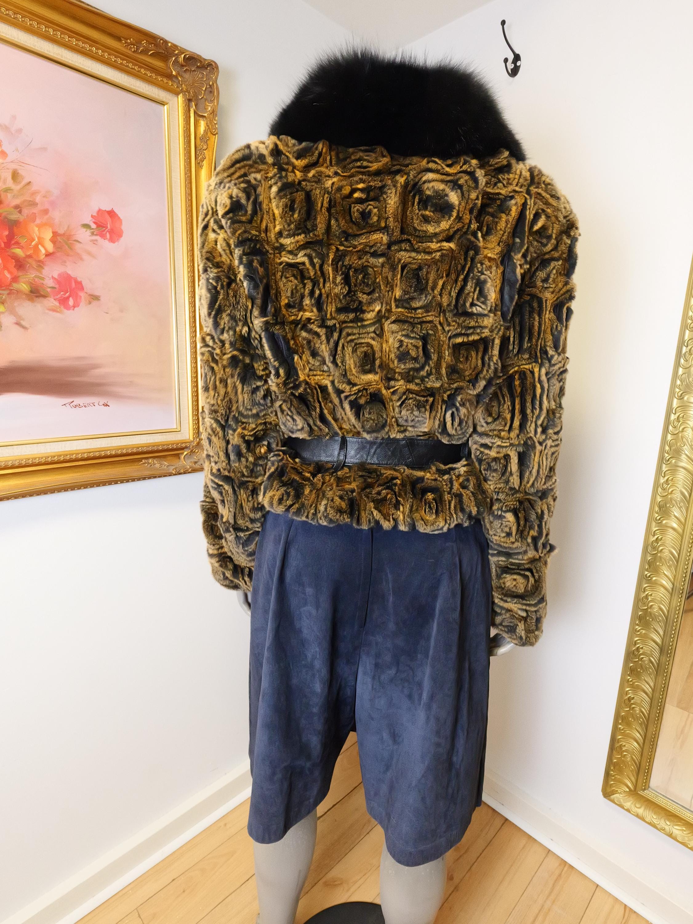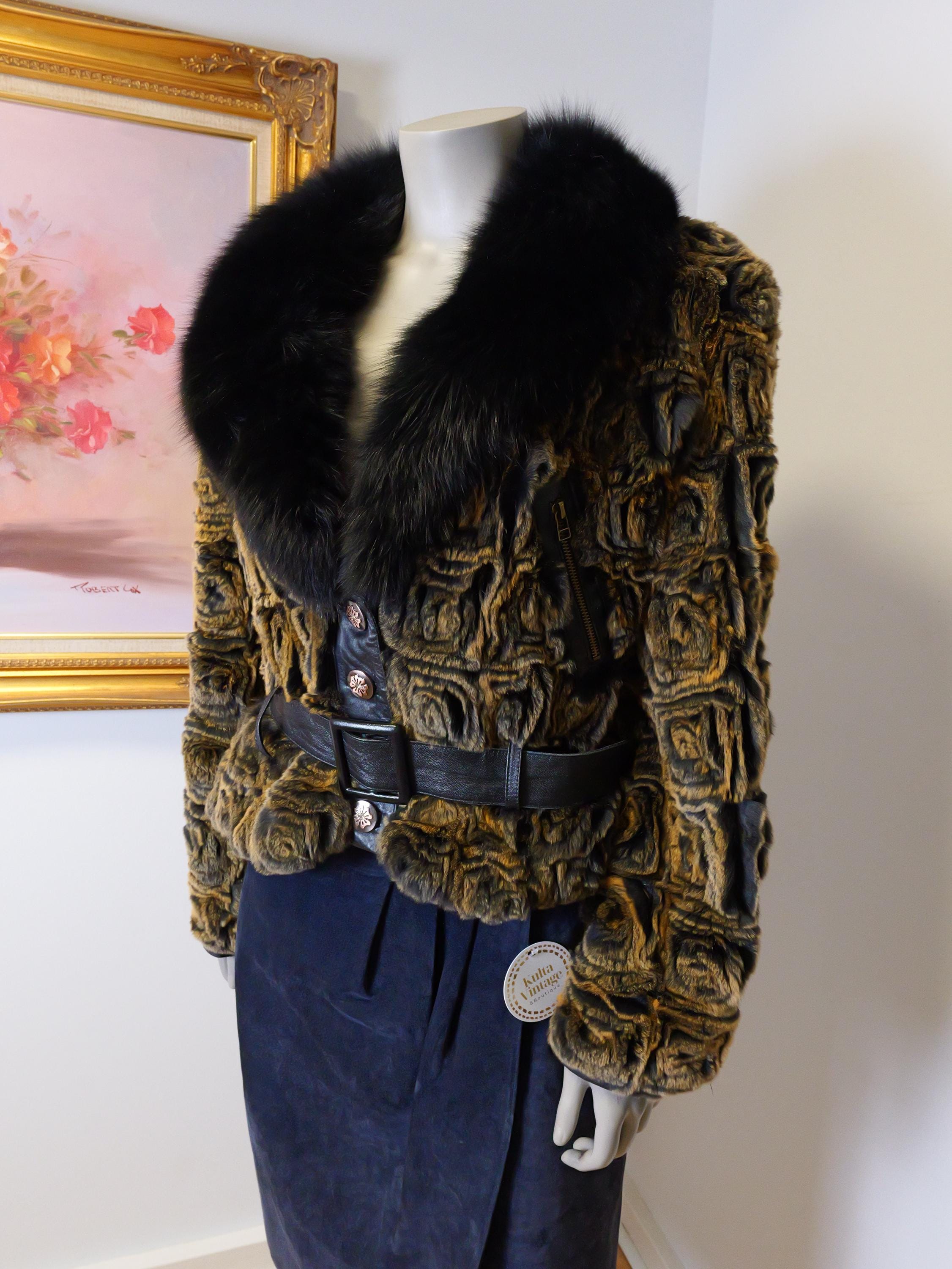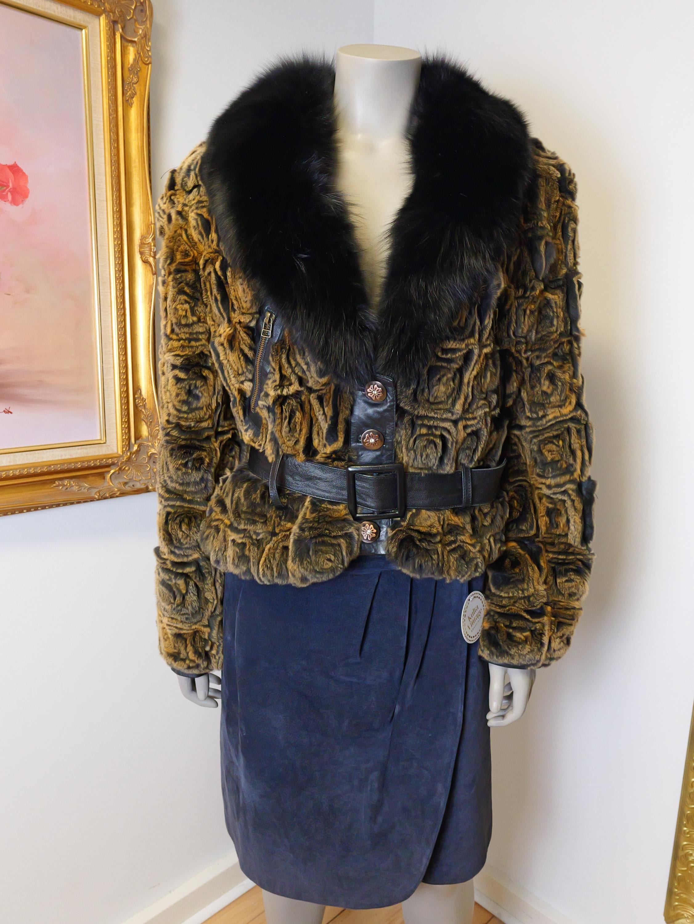 Stunning rabbit fur coat with fluffy black collar and butter soft black leather belt.