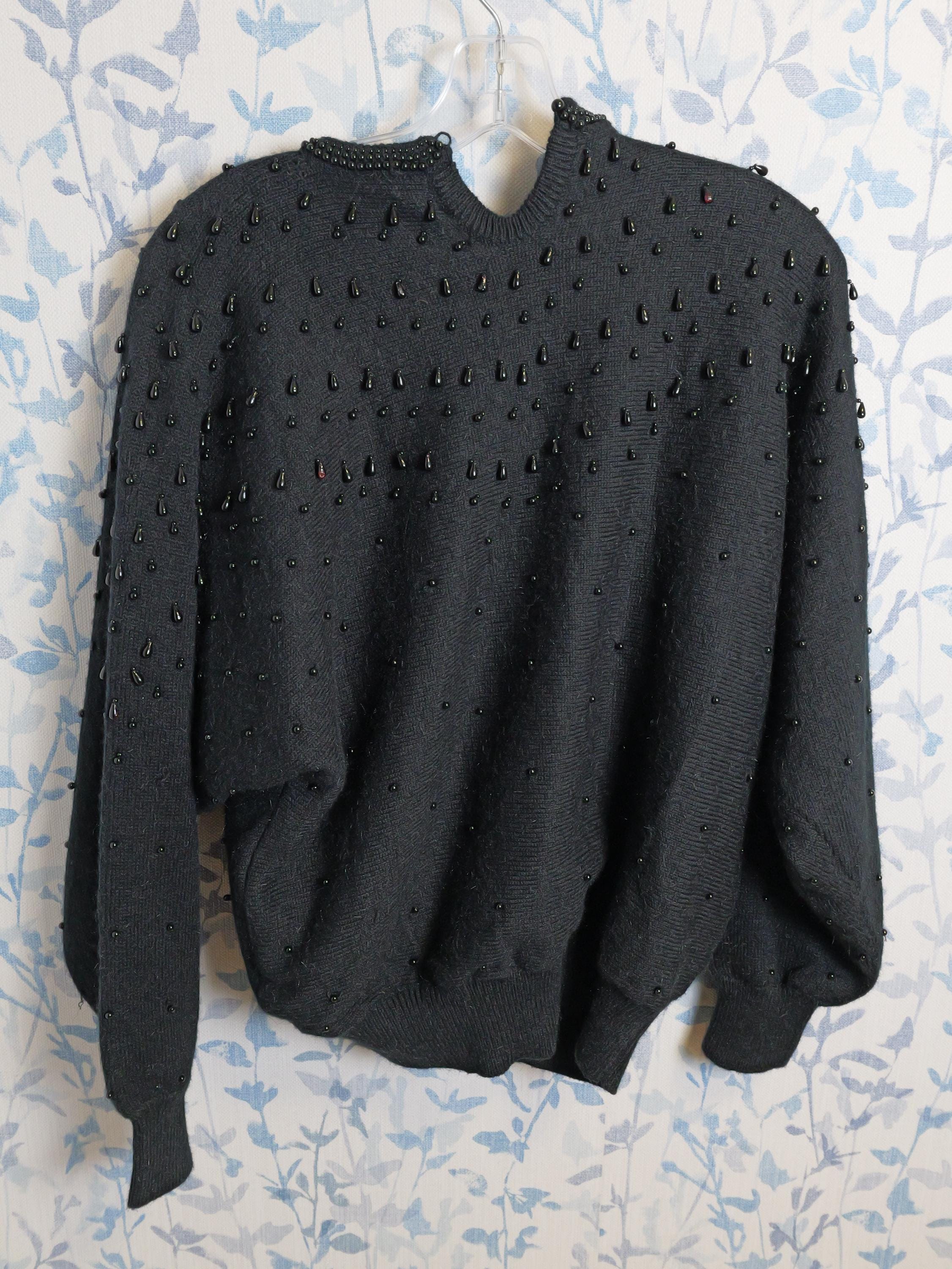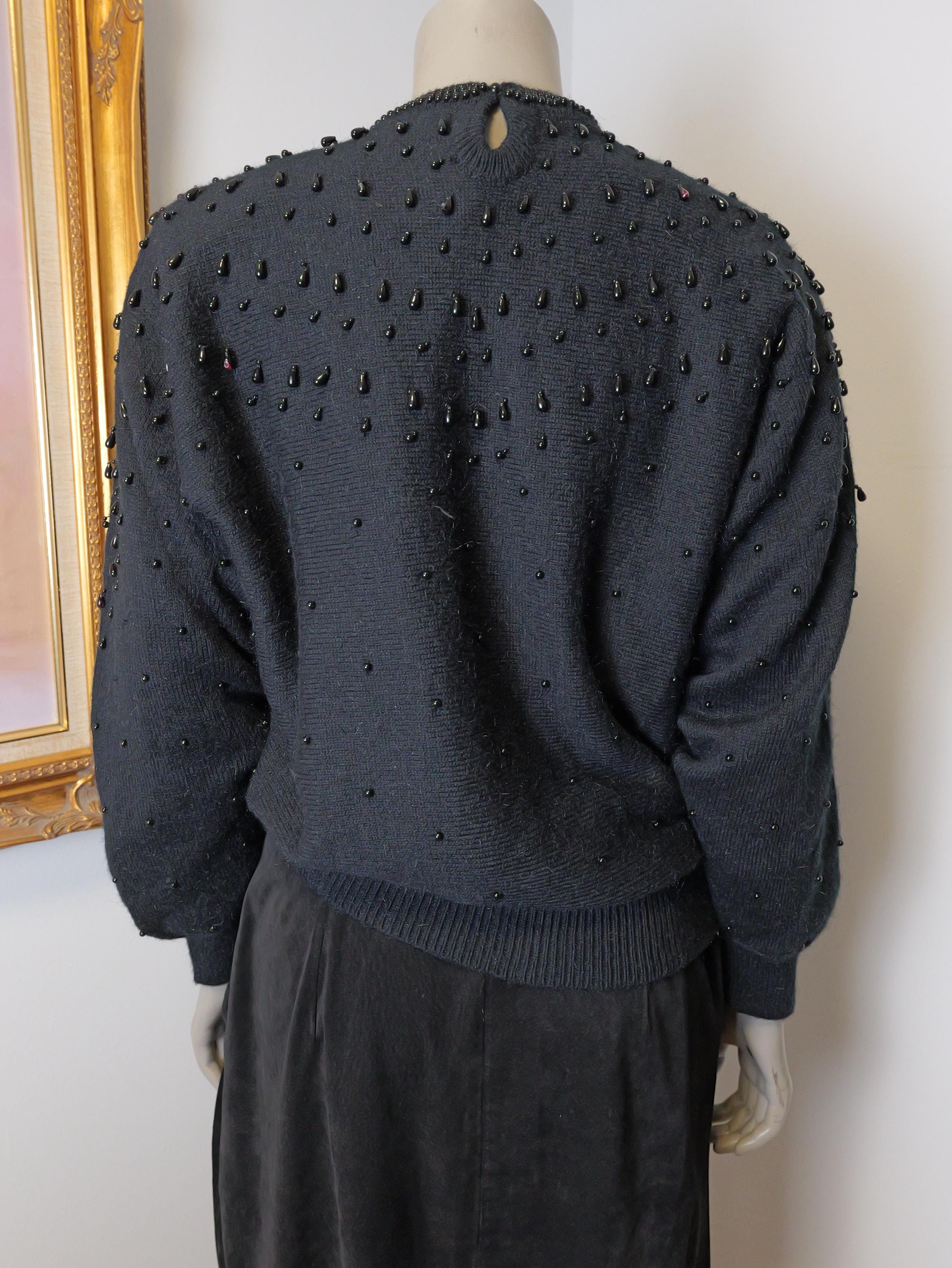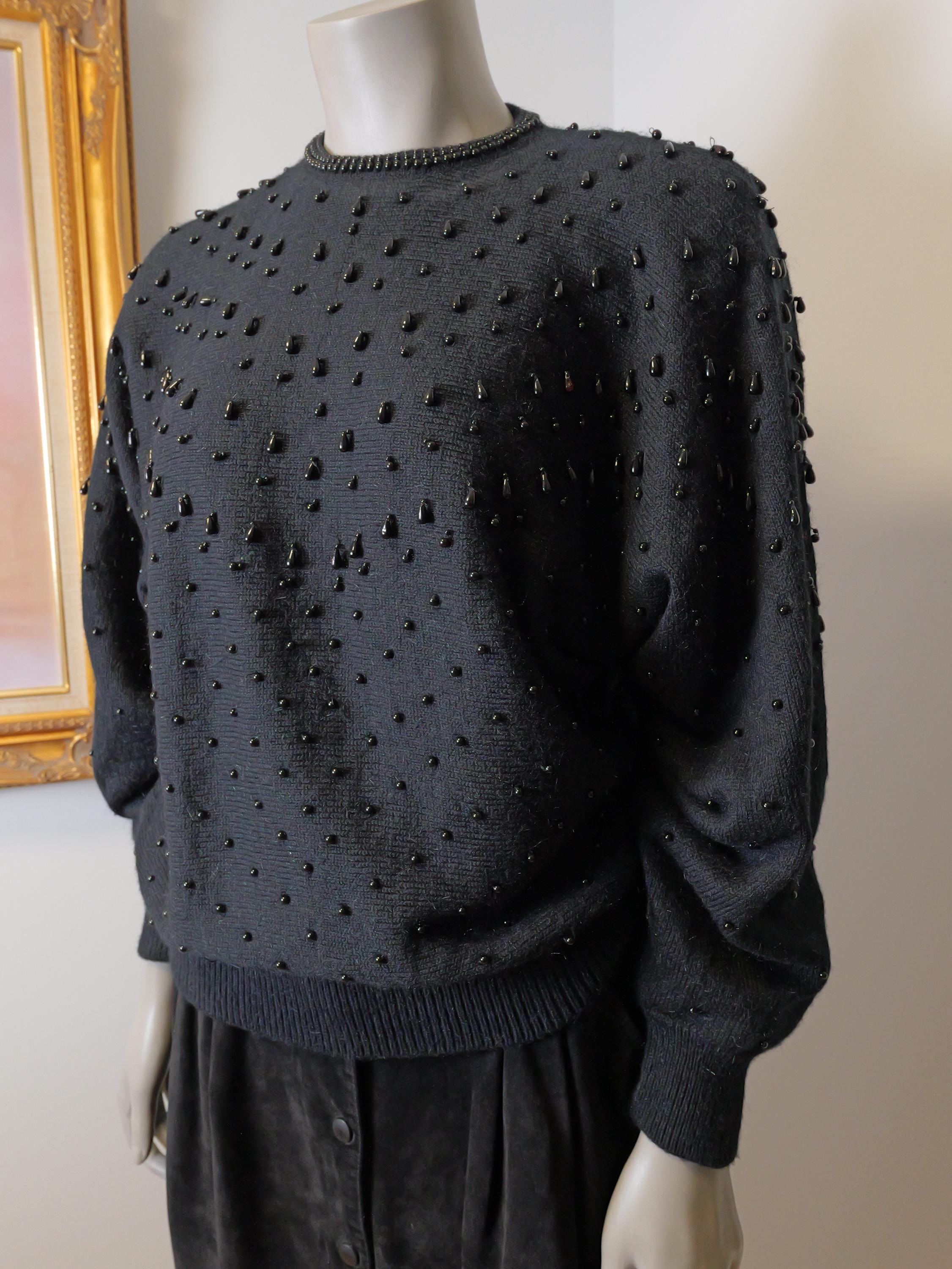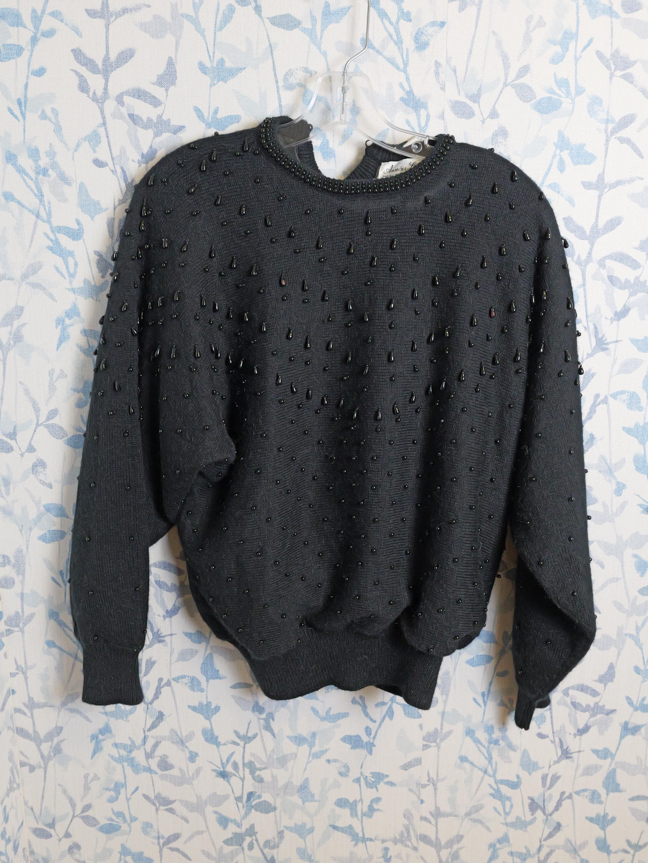 Women's 1980's black sweater with beaded neckline and a smattering of pretty tear drop shaped beads.