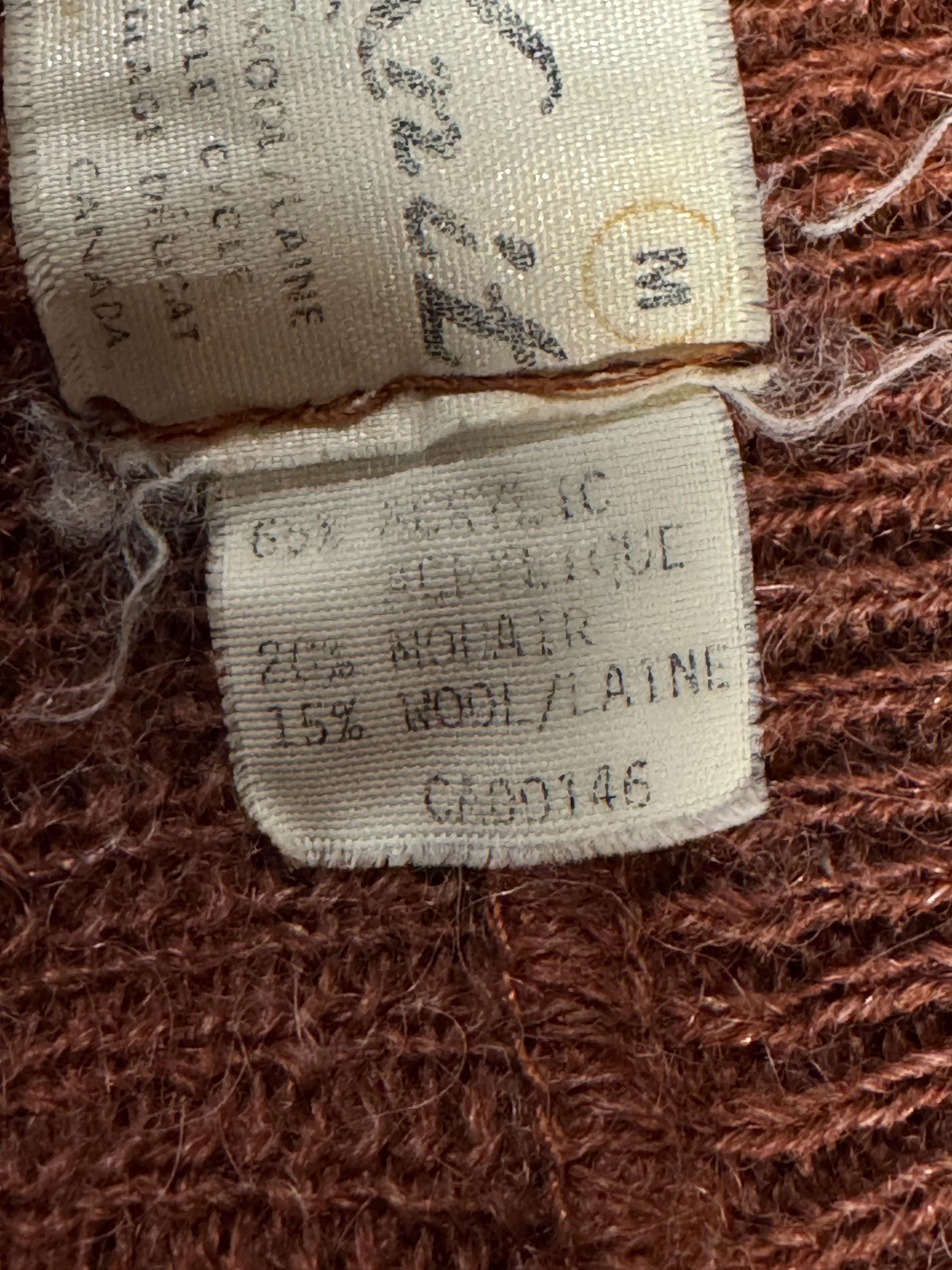 Mix of wool and mohair. Brand is Avon Knit from Stratford Canada.
