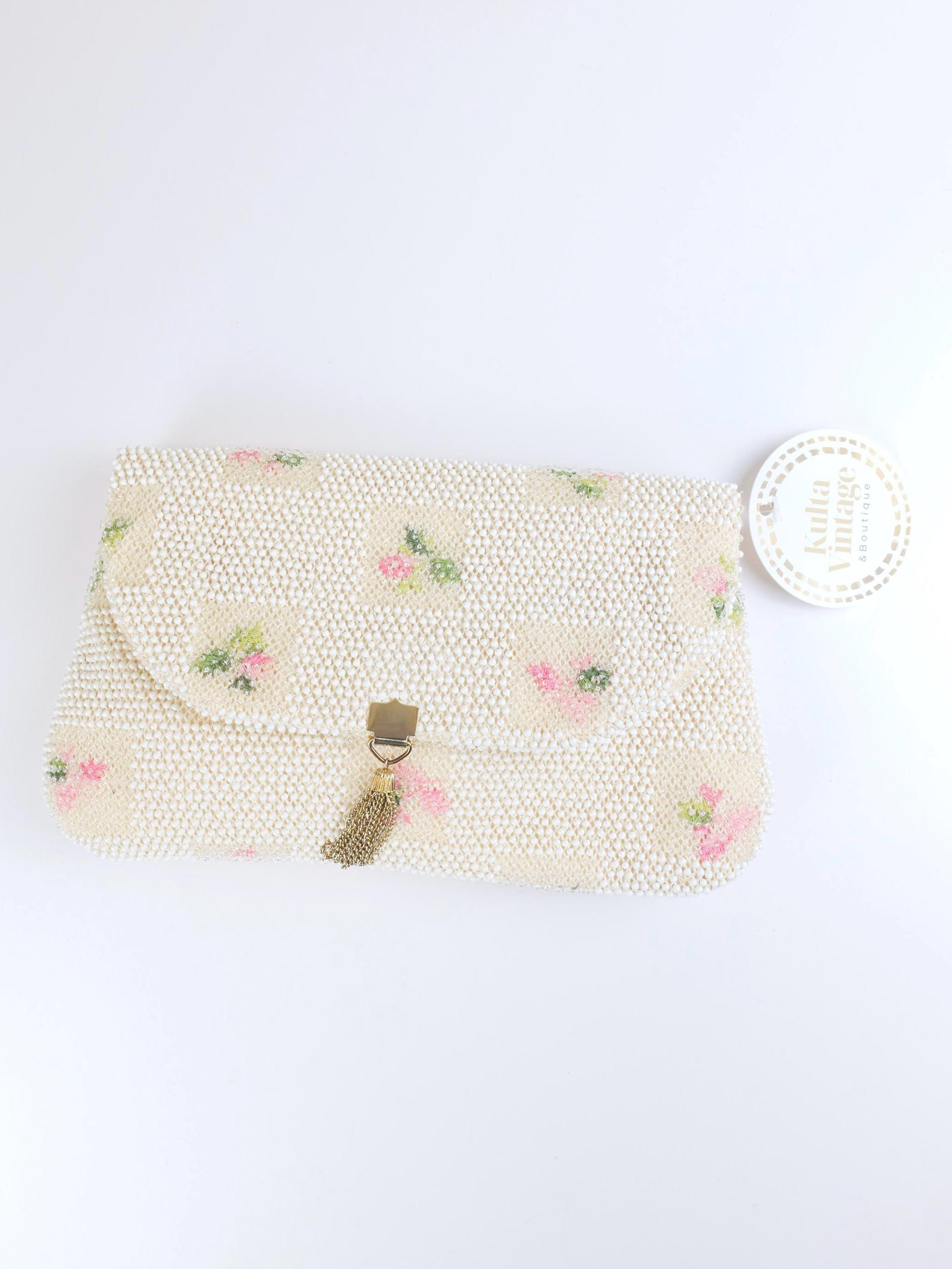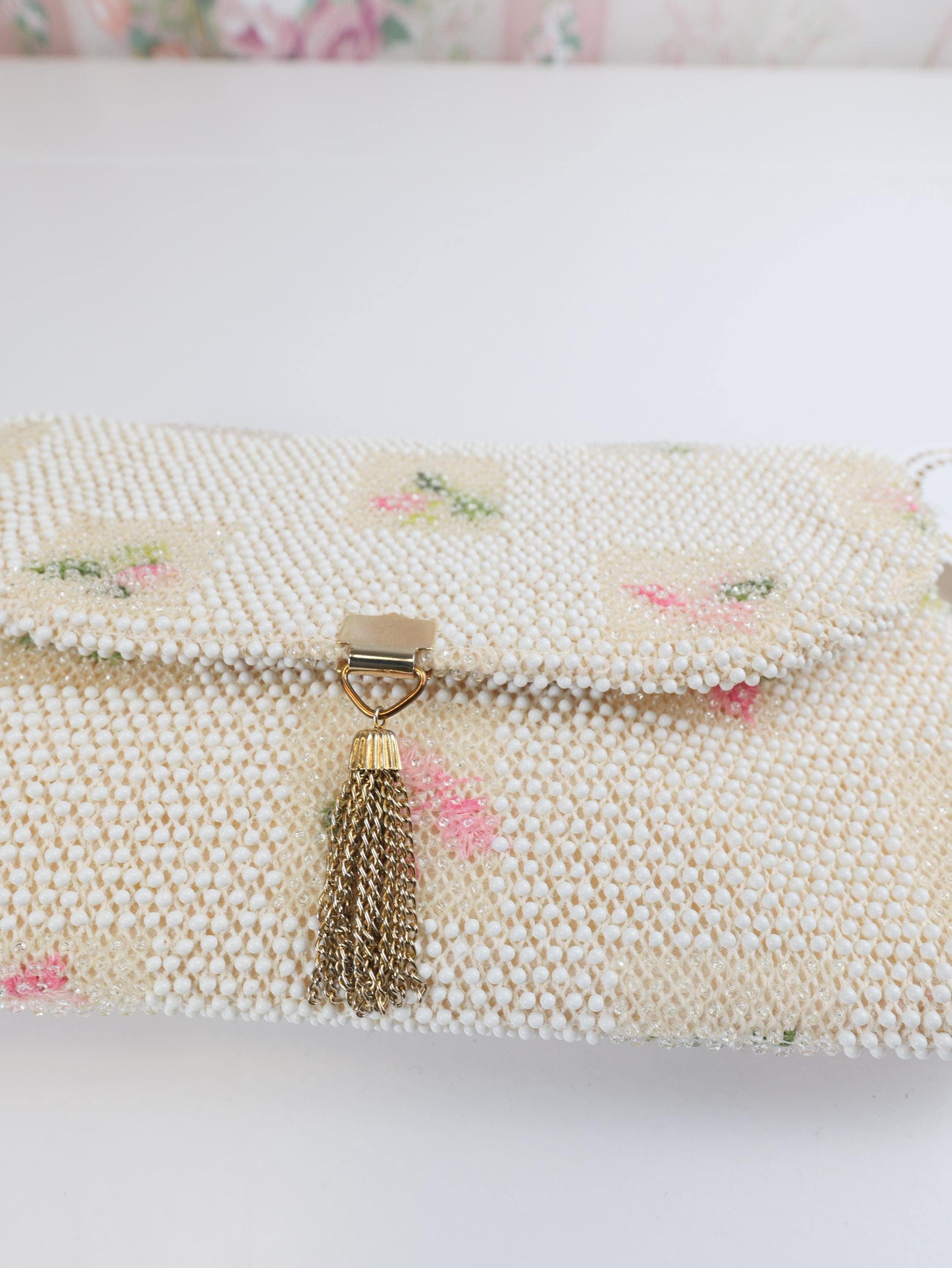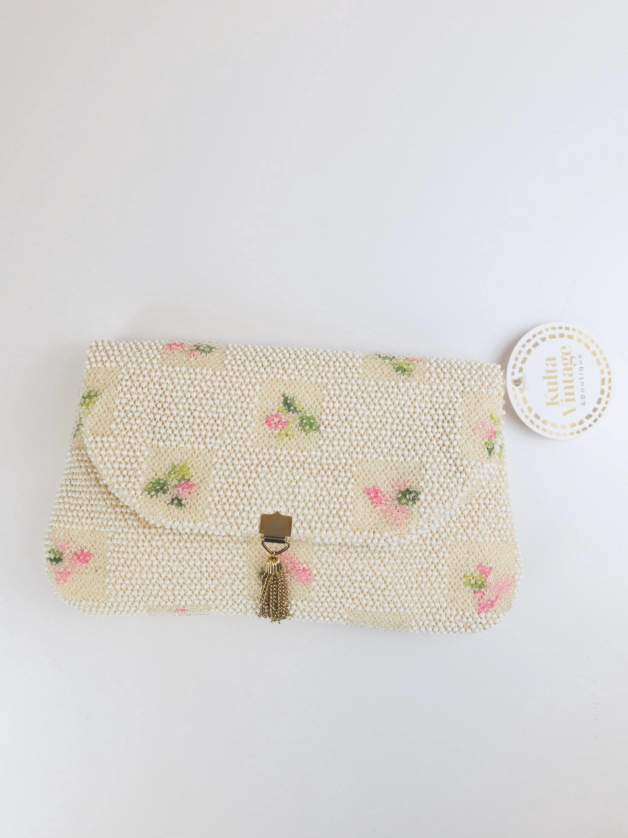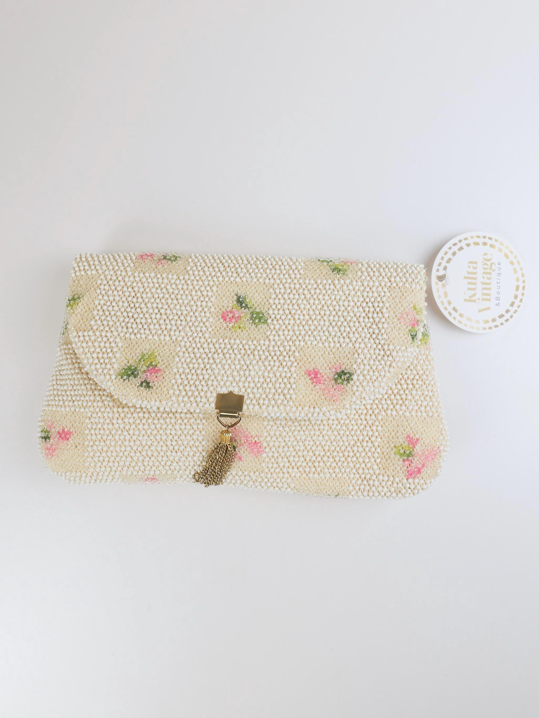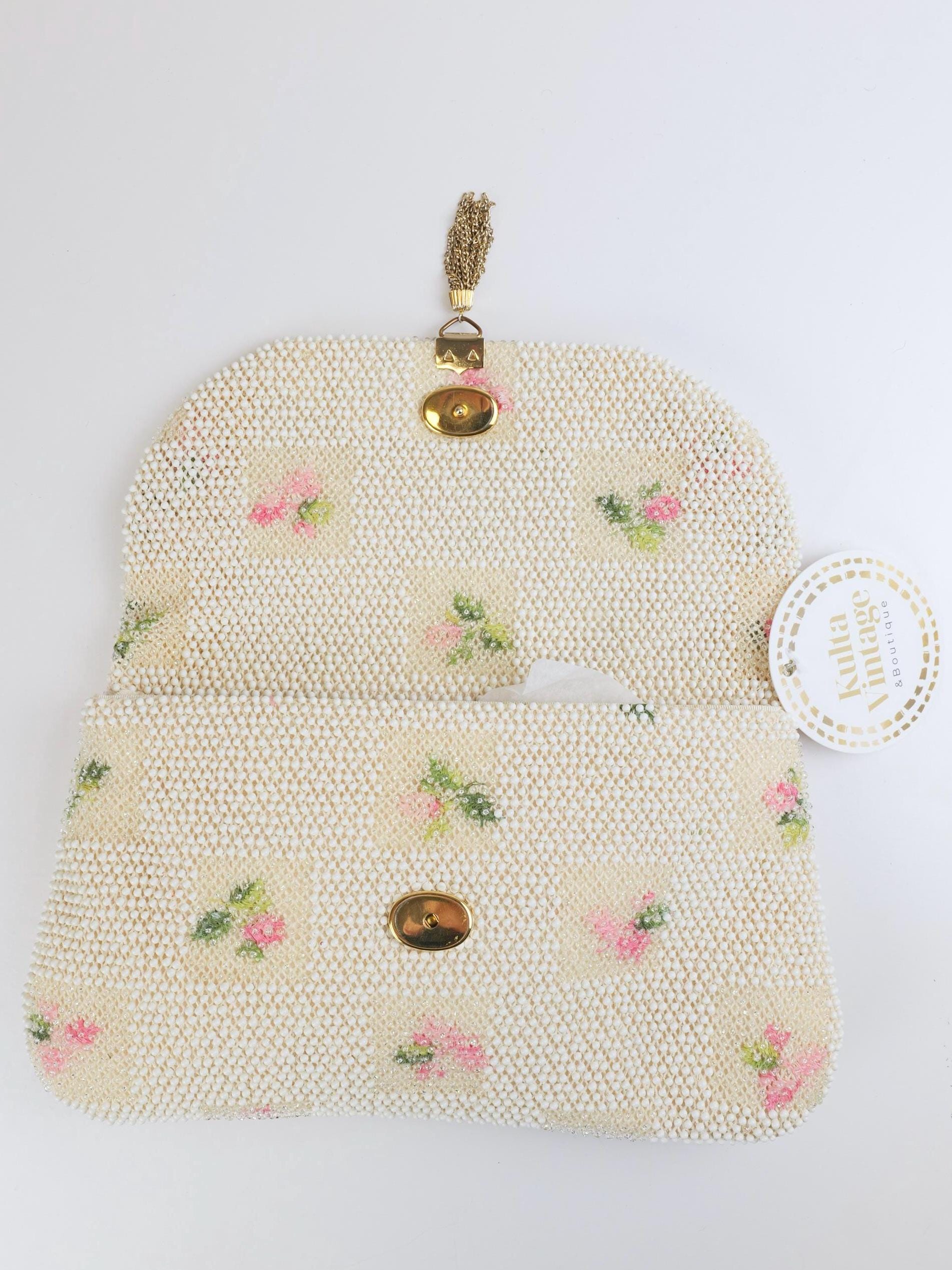 Fully beaded with pink and green little floral bouquets embroidered in to a checkered pattern and a gold tassel at the clasp.