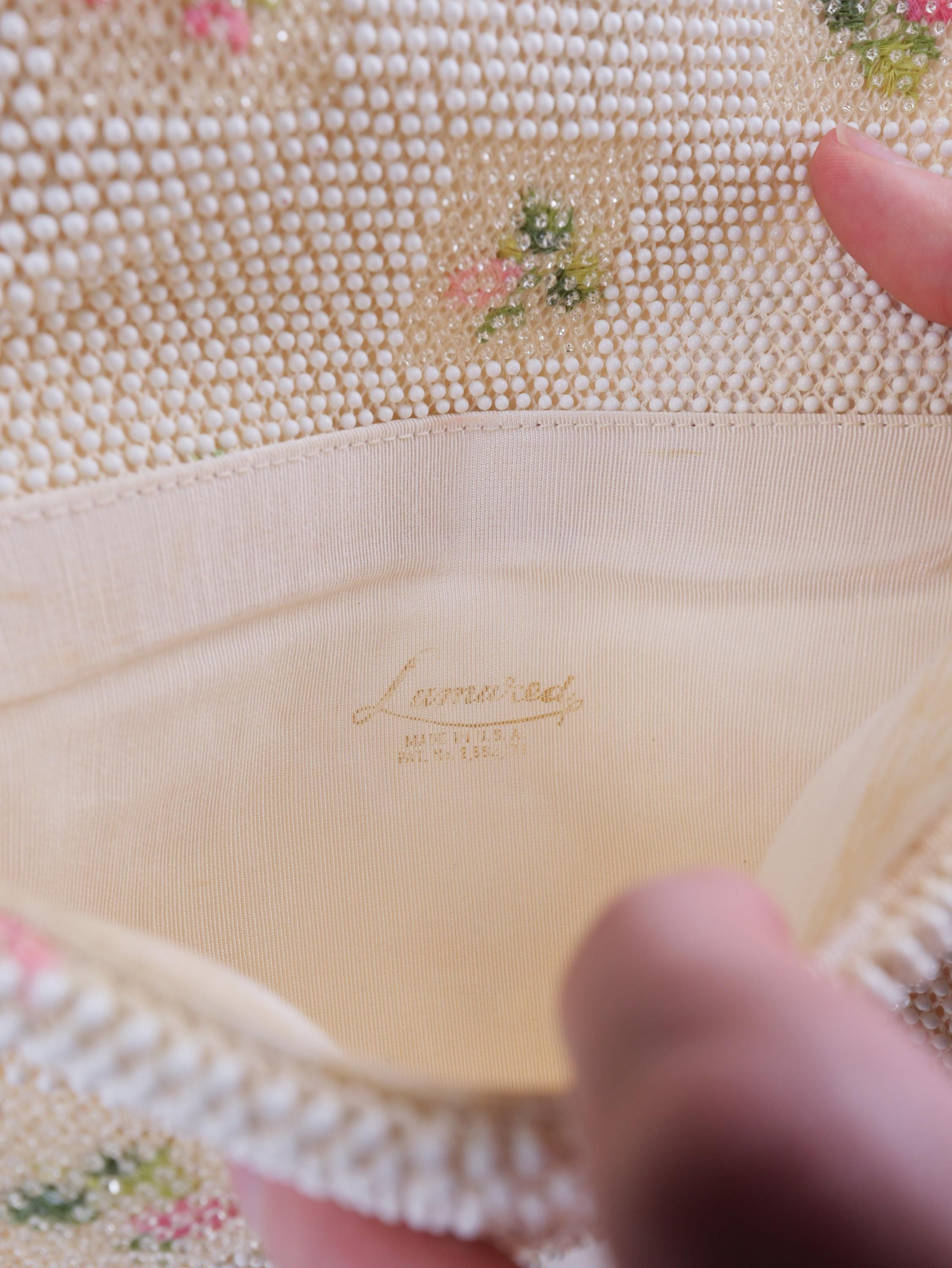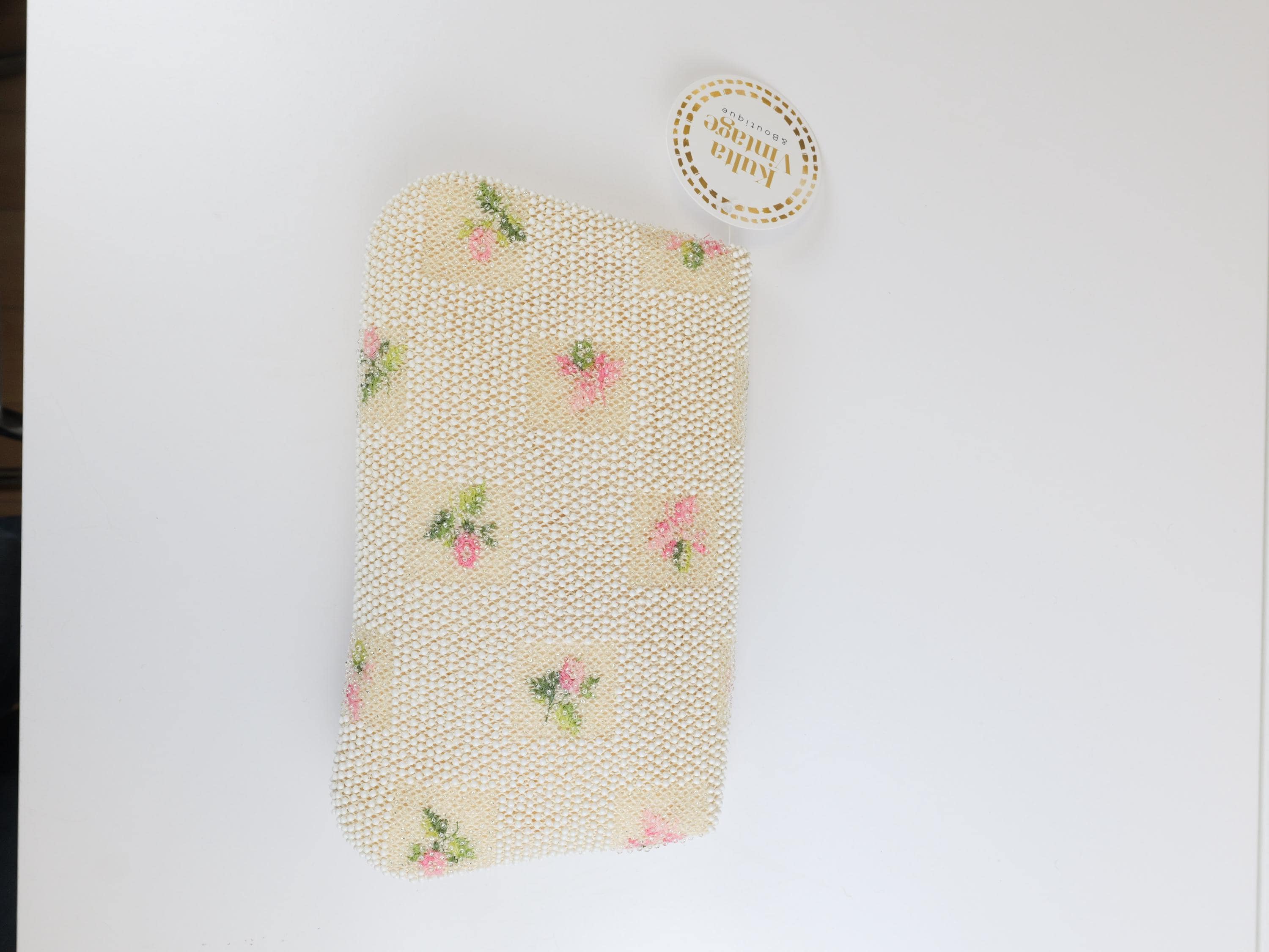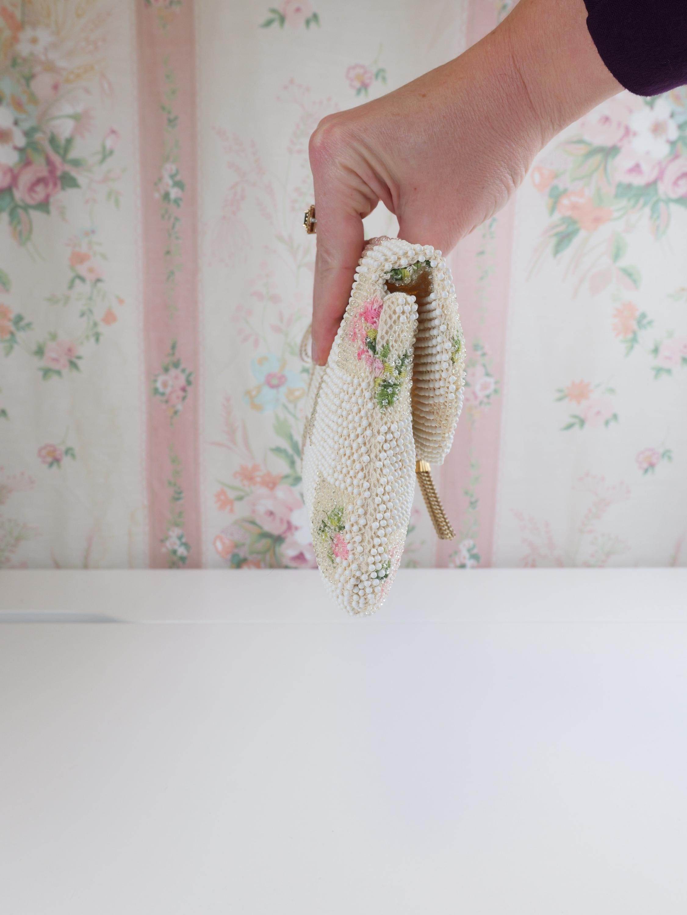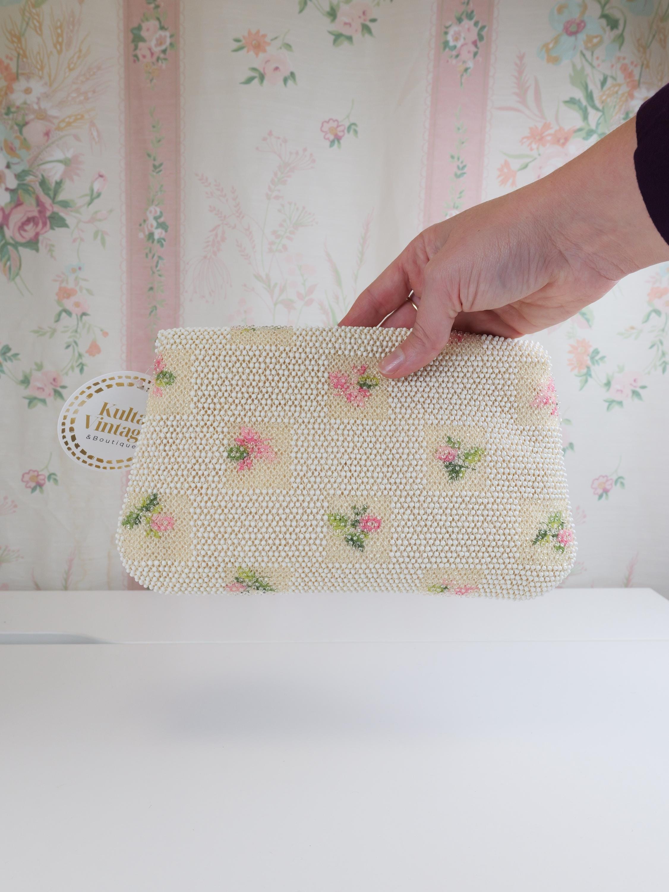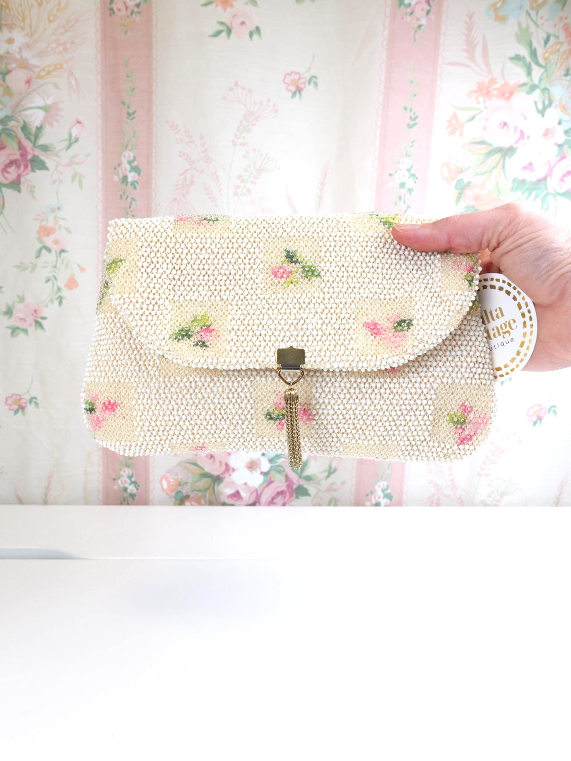 Fully beaded with pink and green little floral bouquets embroidered in to a checkered pattern and a gold tassel at the clasp.