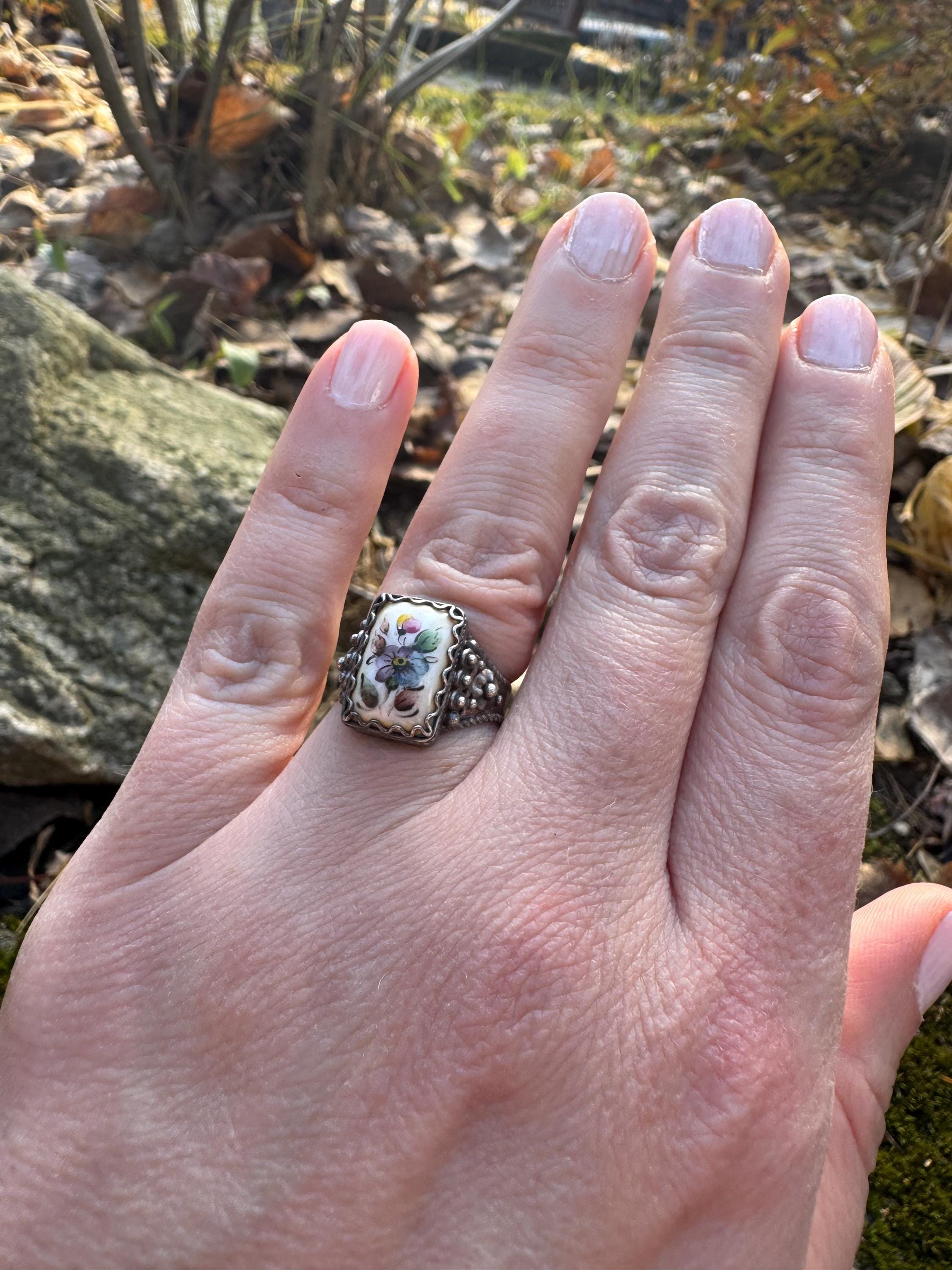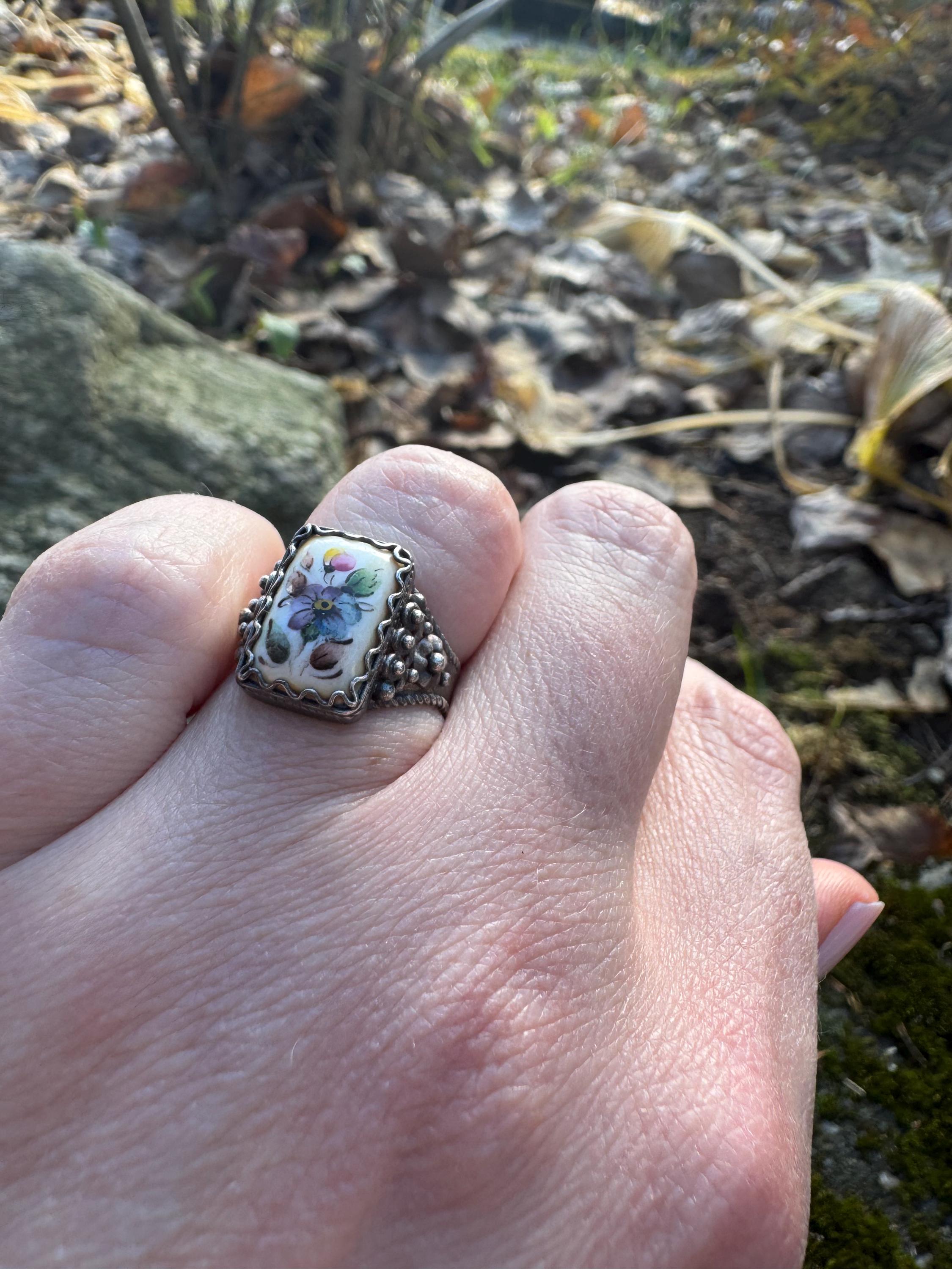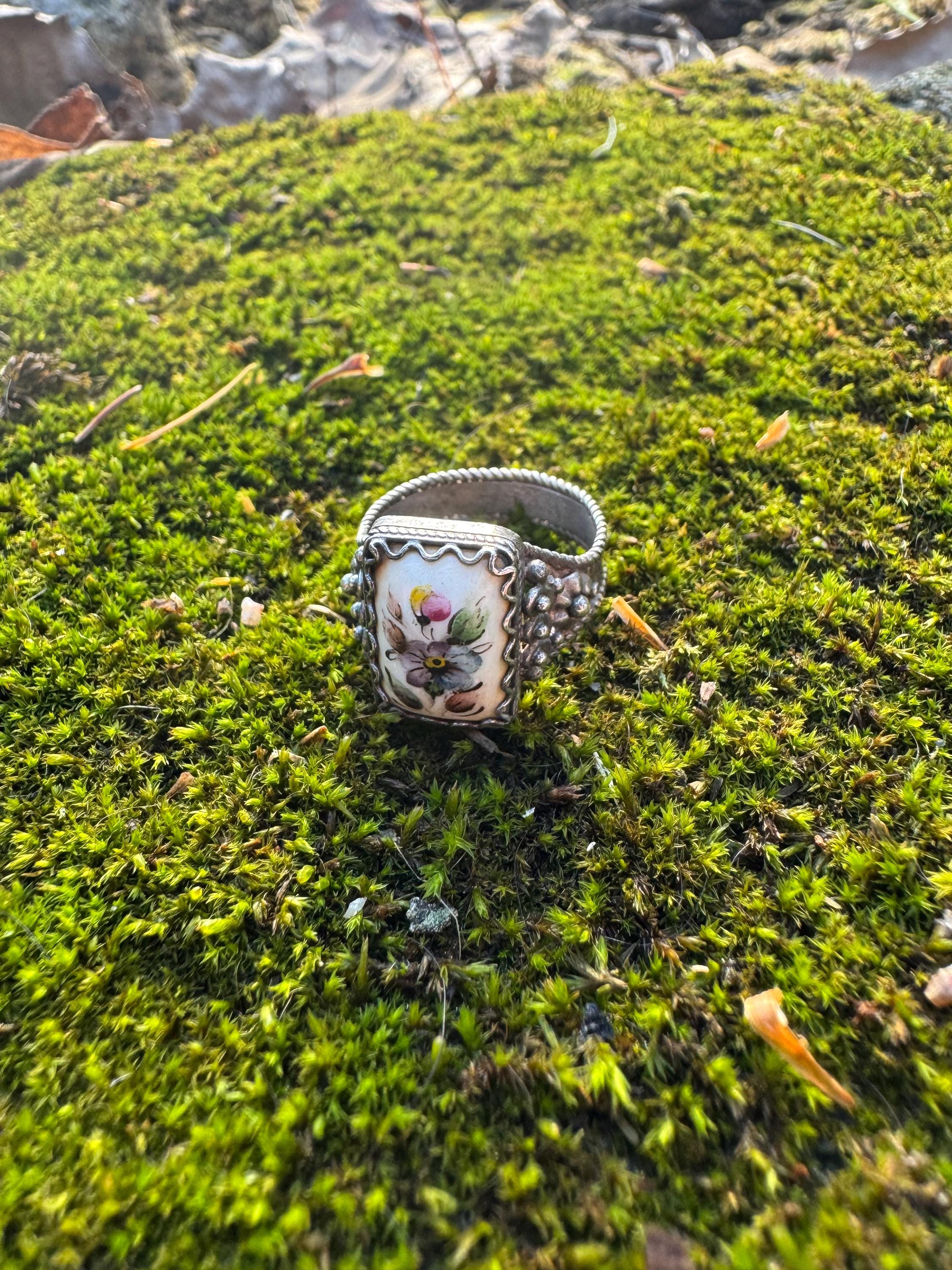 Hand painted floral bouquet on a cream colour cabochon. Romantic vintage women's silver tone ring.