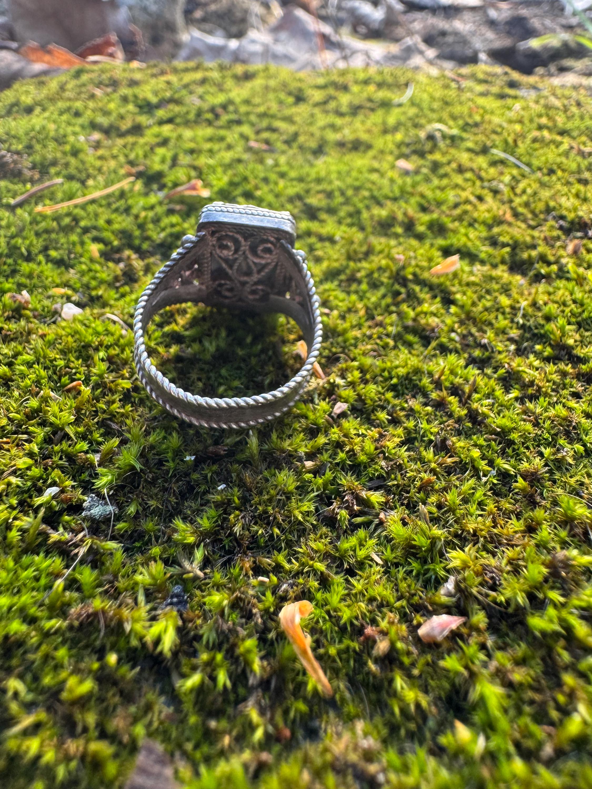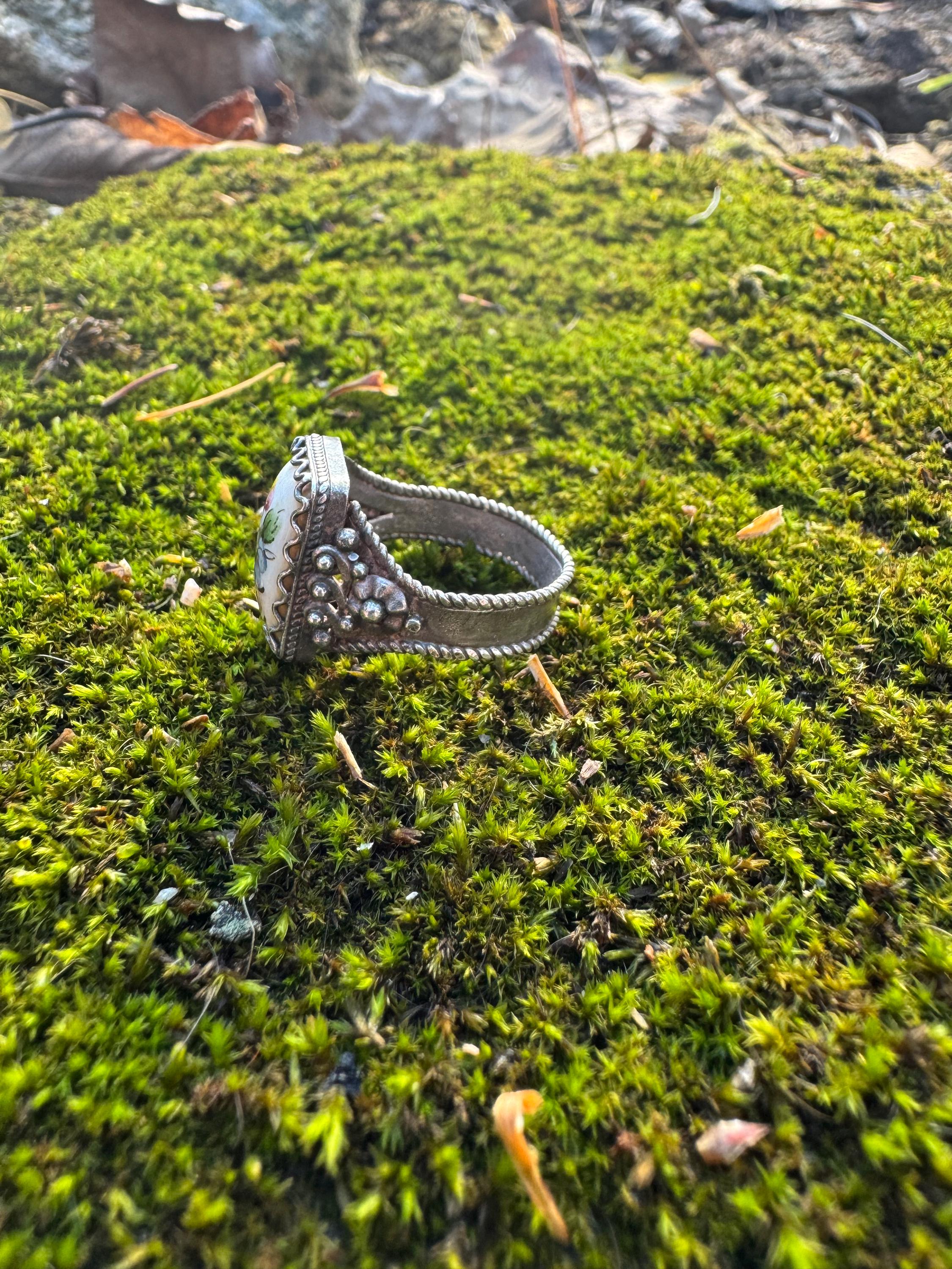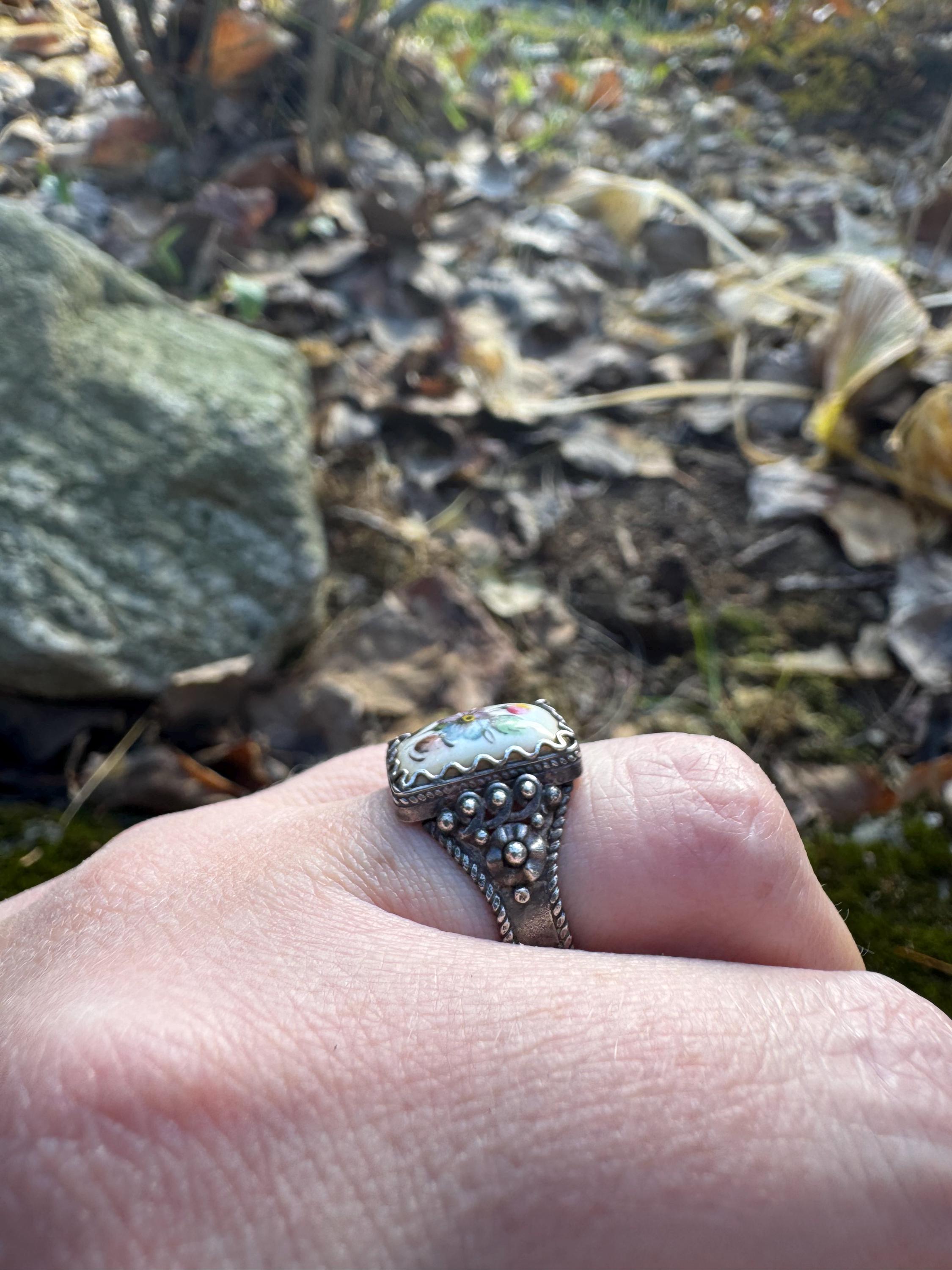 Hand painted floral bouquet on a cream colour cabochon. Romantic vintage women's silver tone ring.