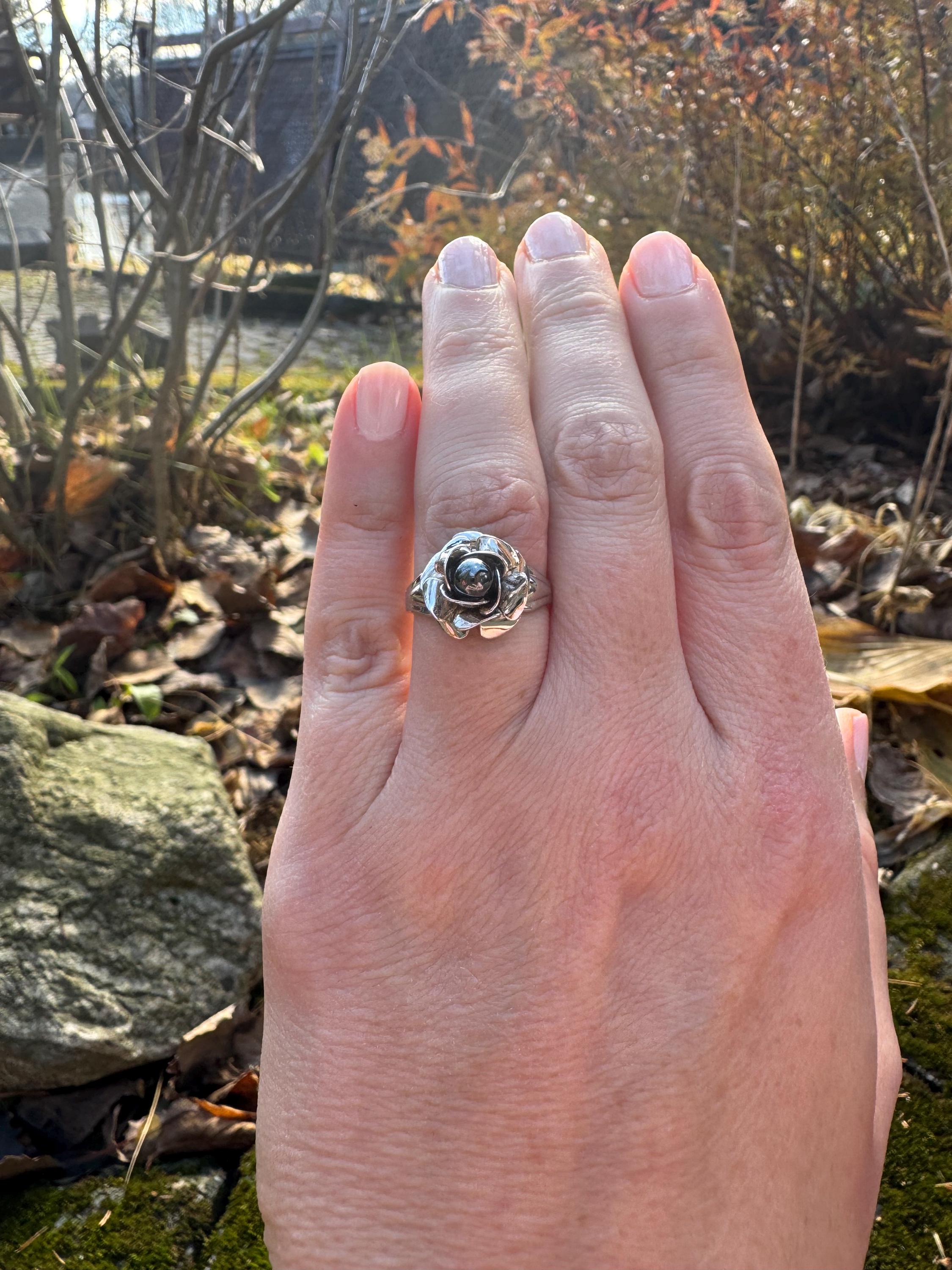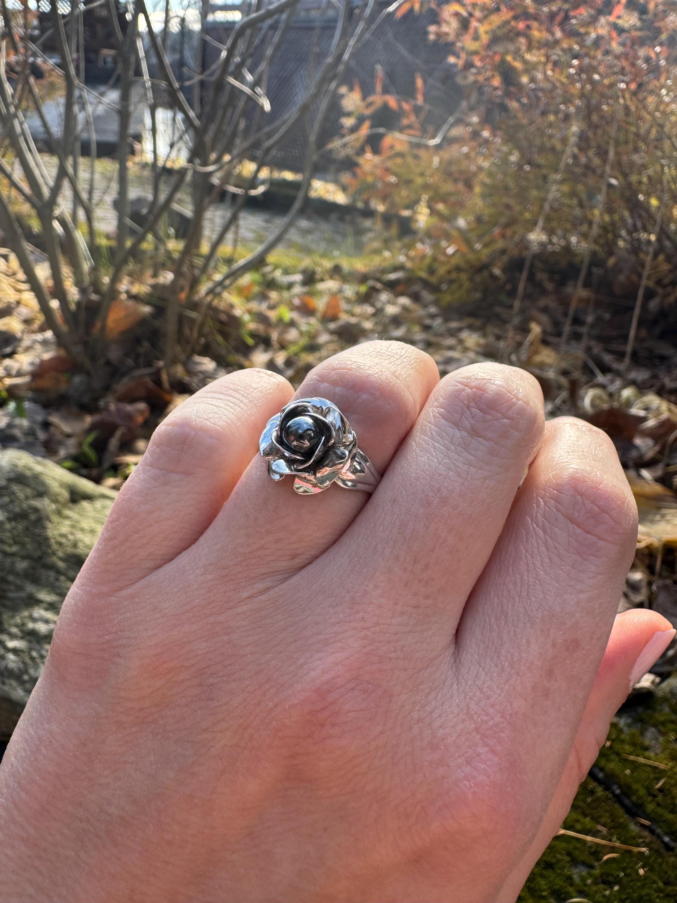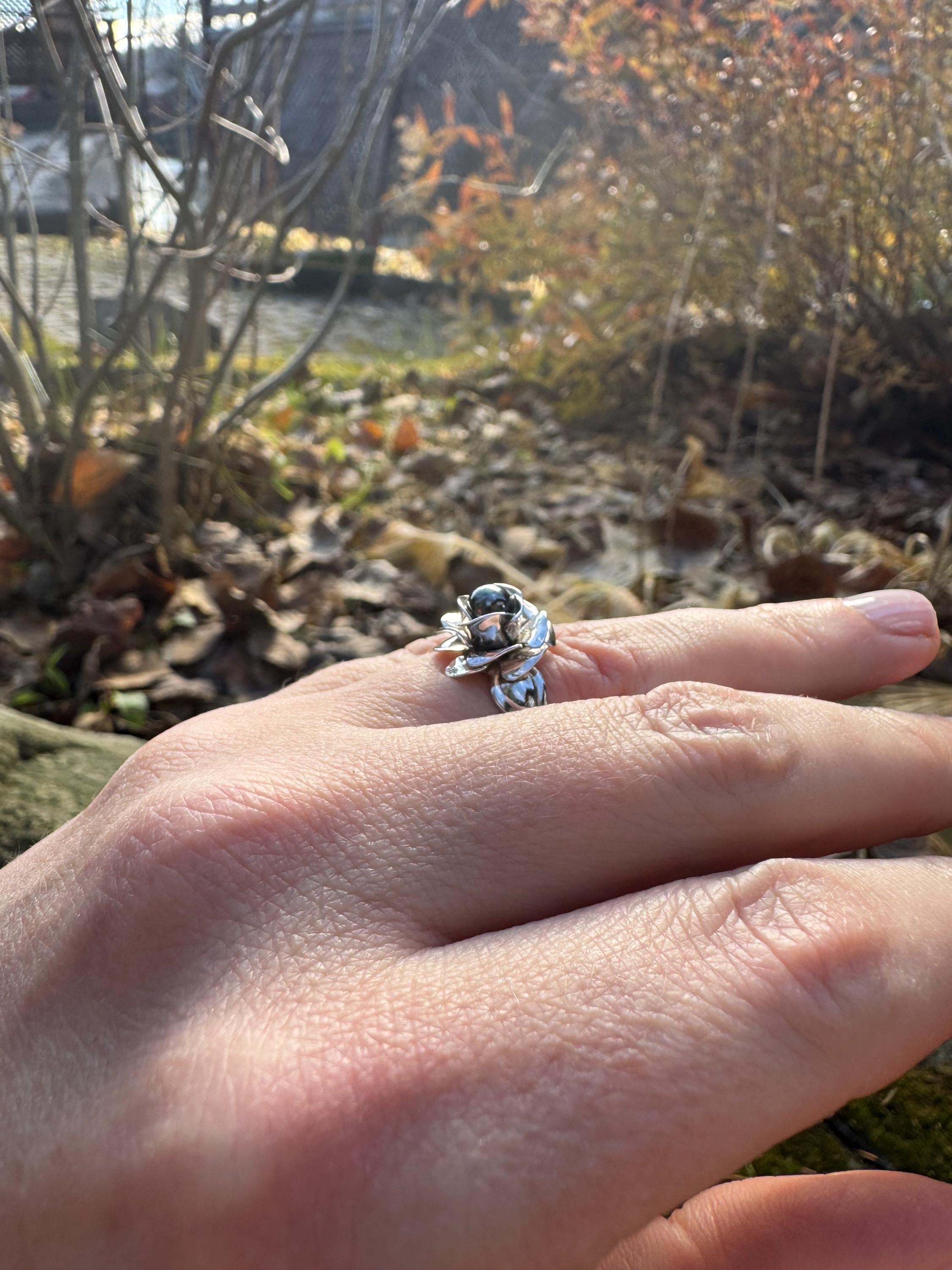 Amazing sculpted rose ring with black pearl centre.