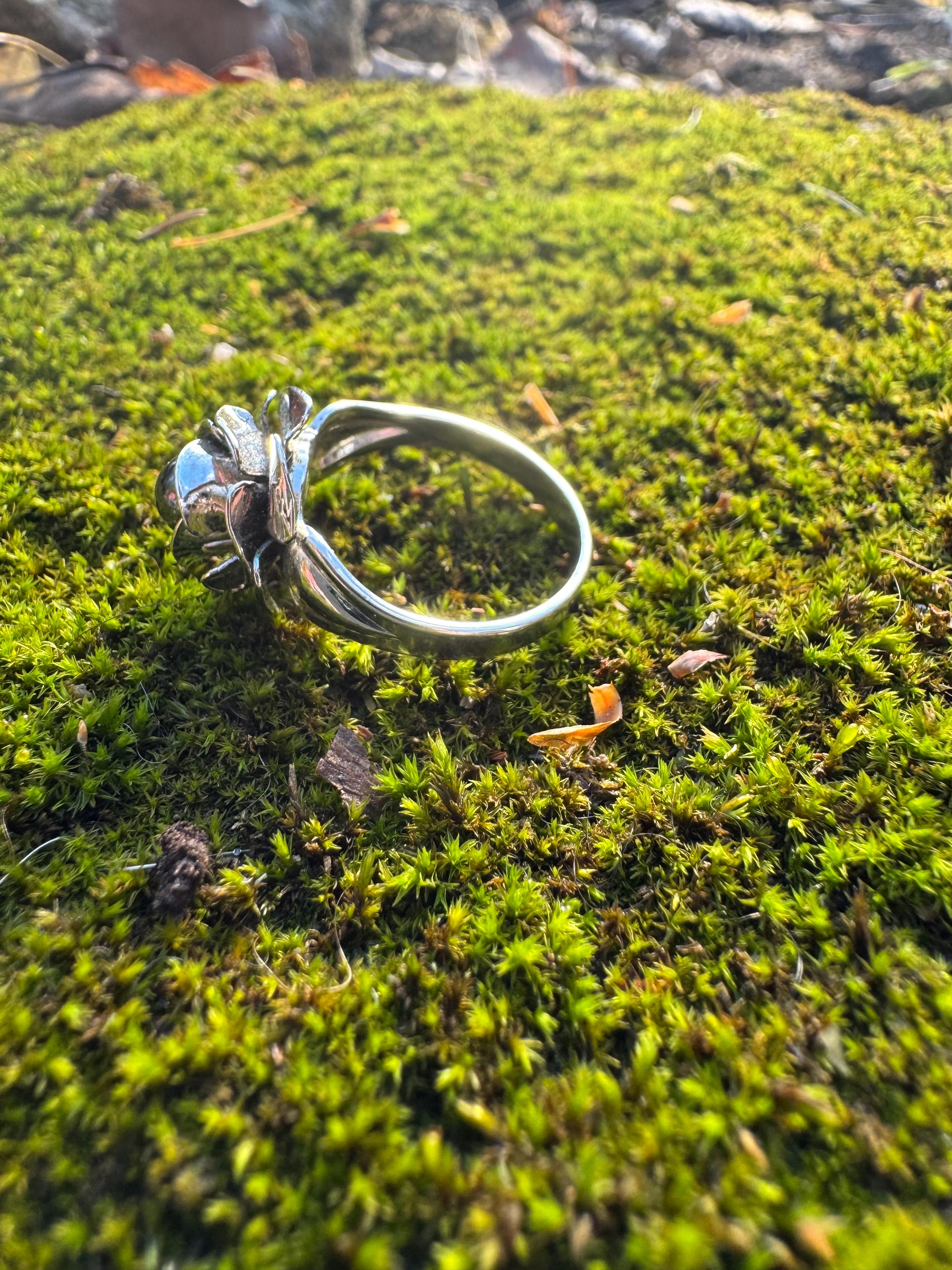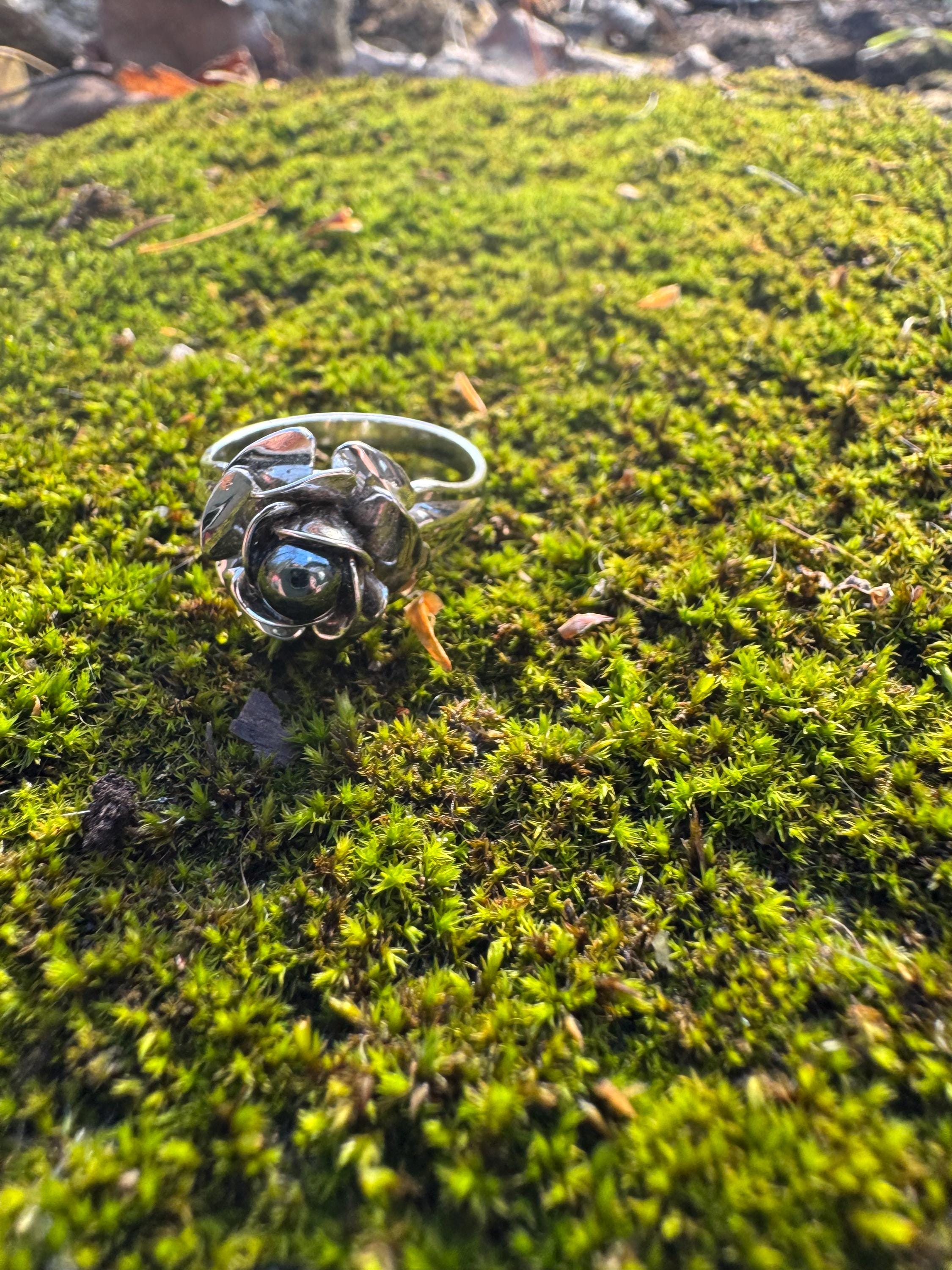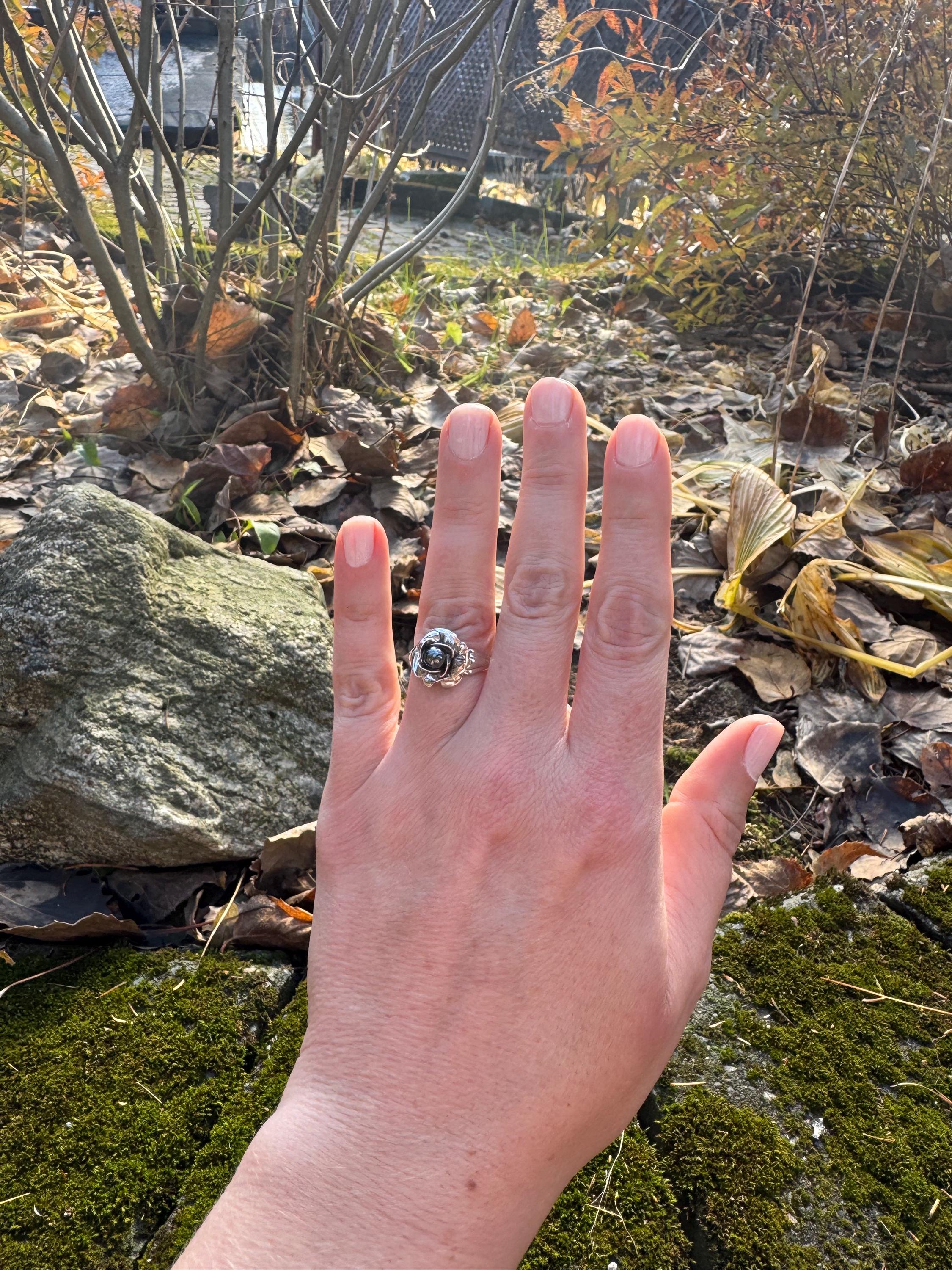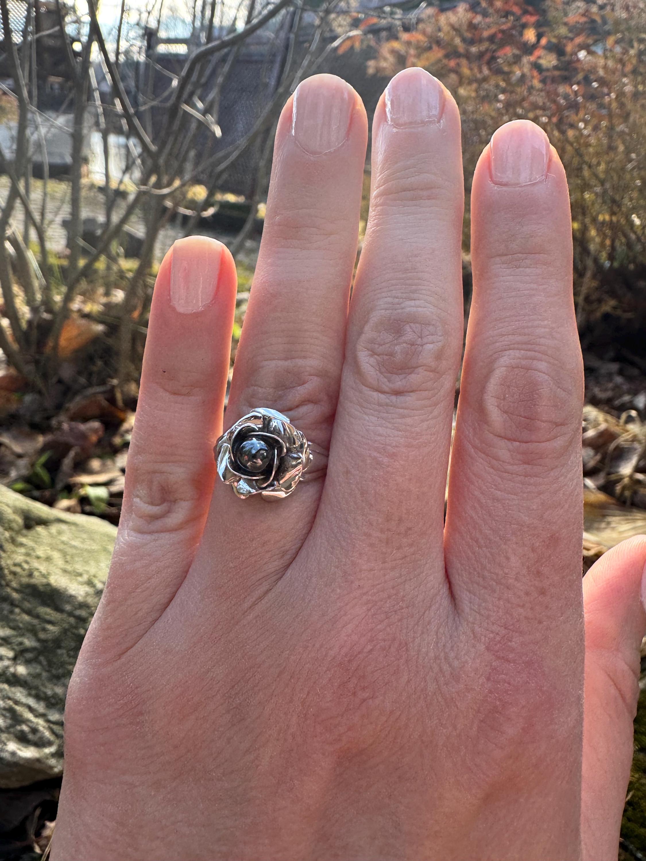 Amazing sculpted rose ring with black pearl centre.