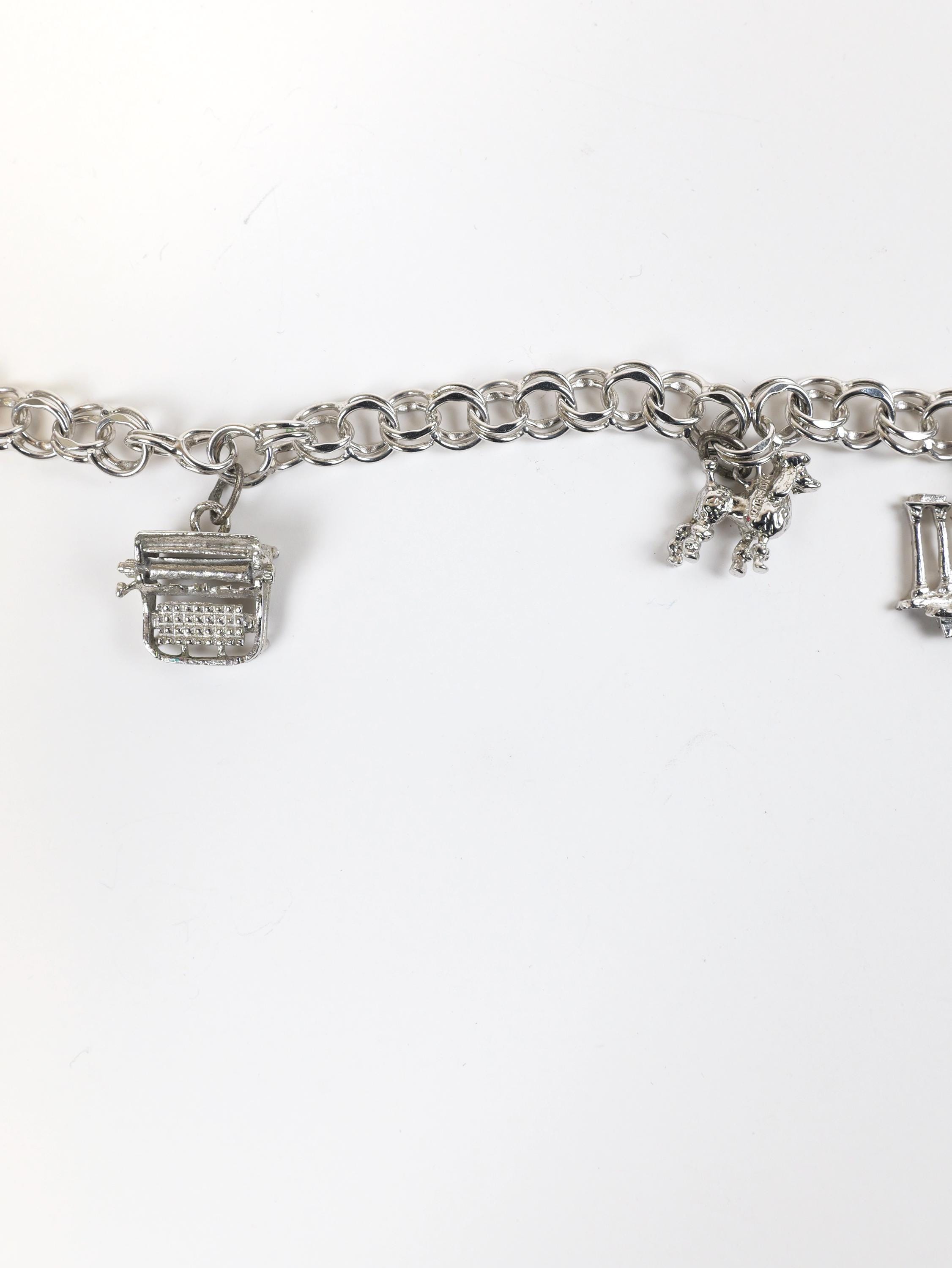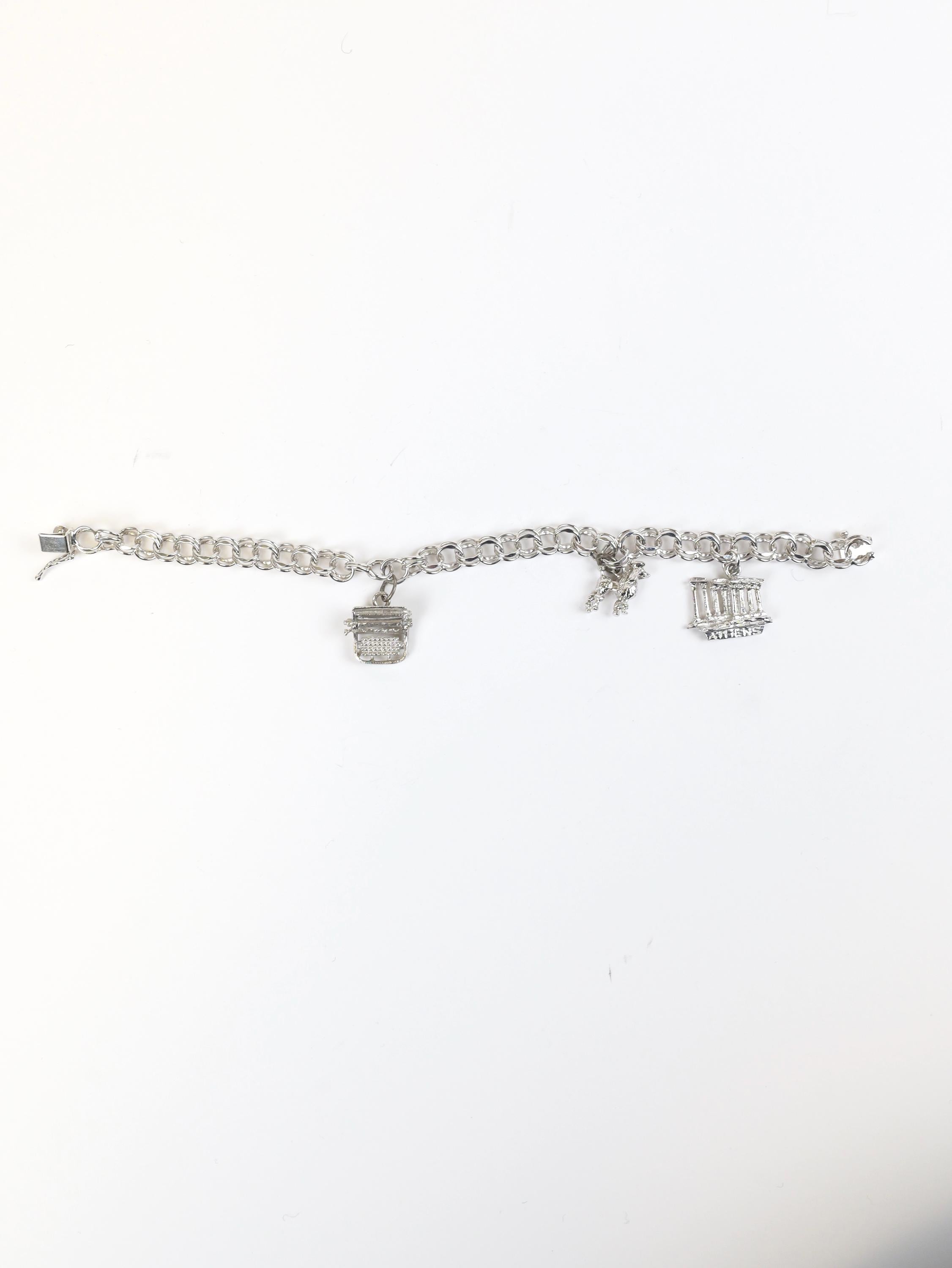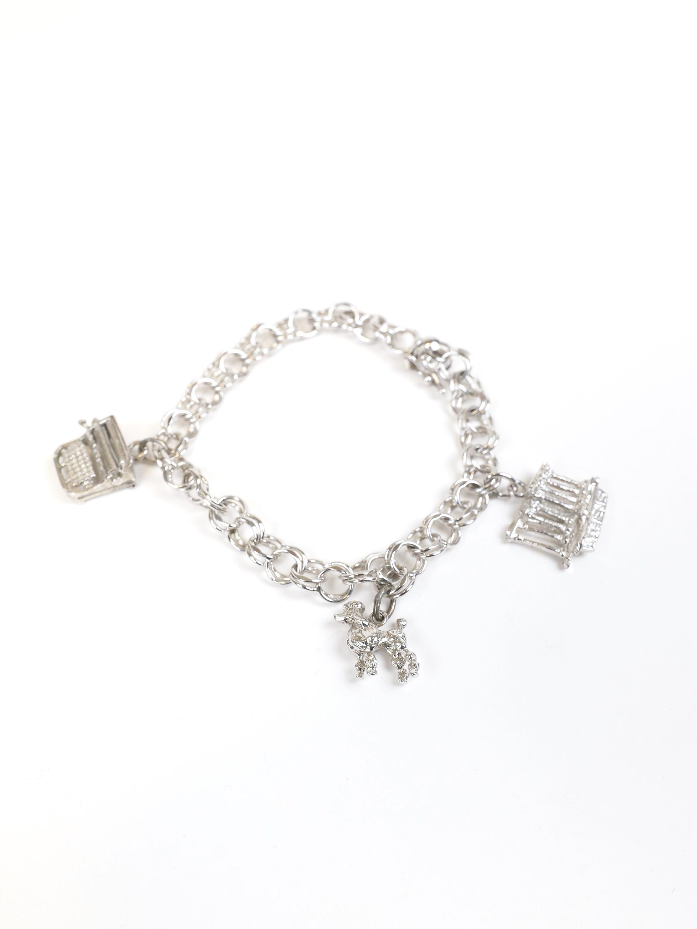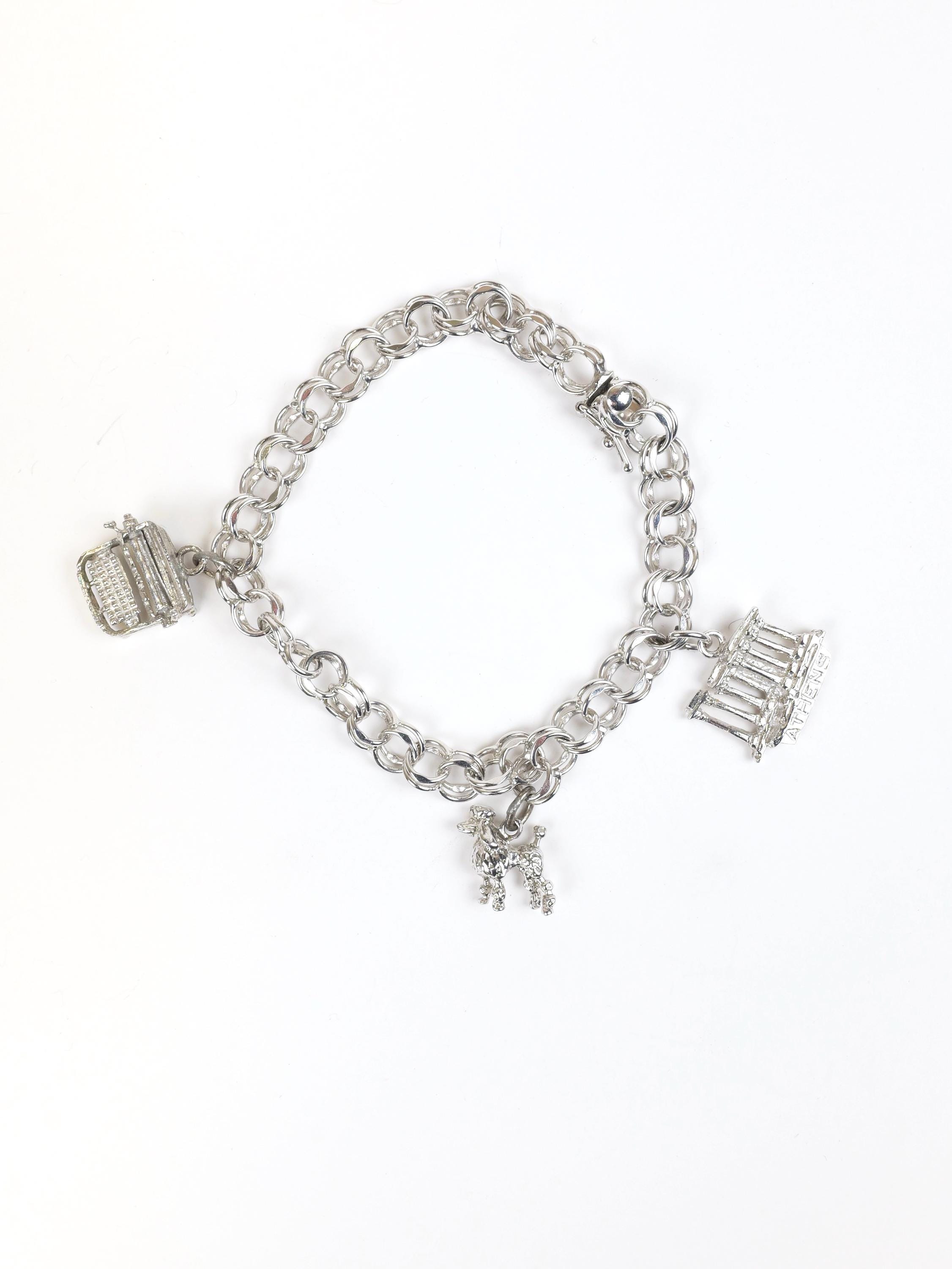 Vintage solid sterling silver chain link bracelet with three sterling charms.