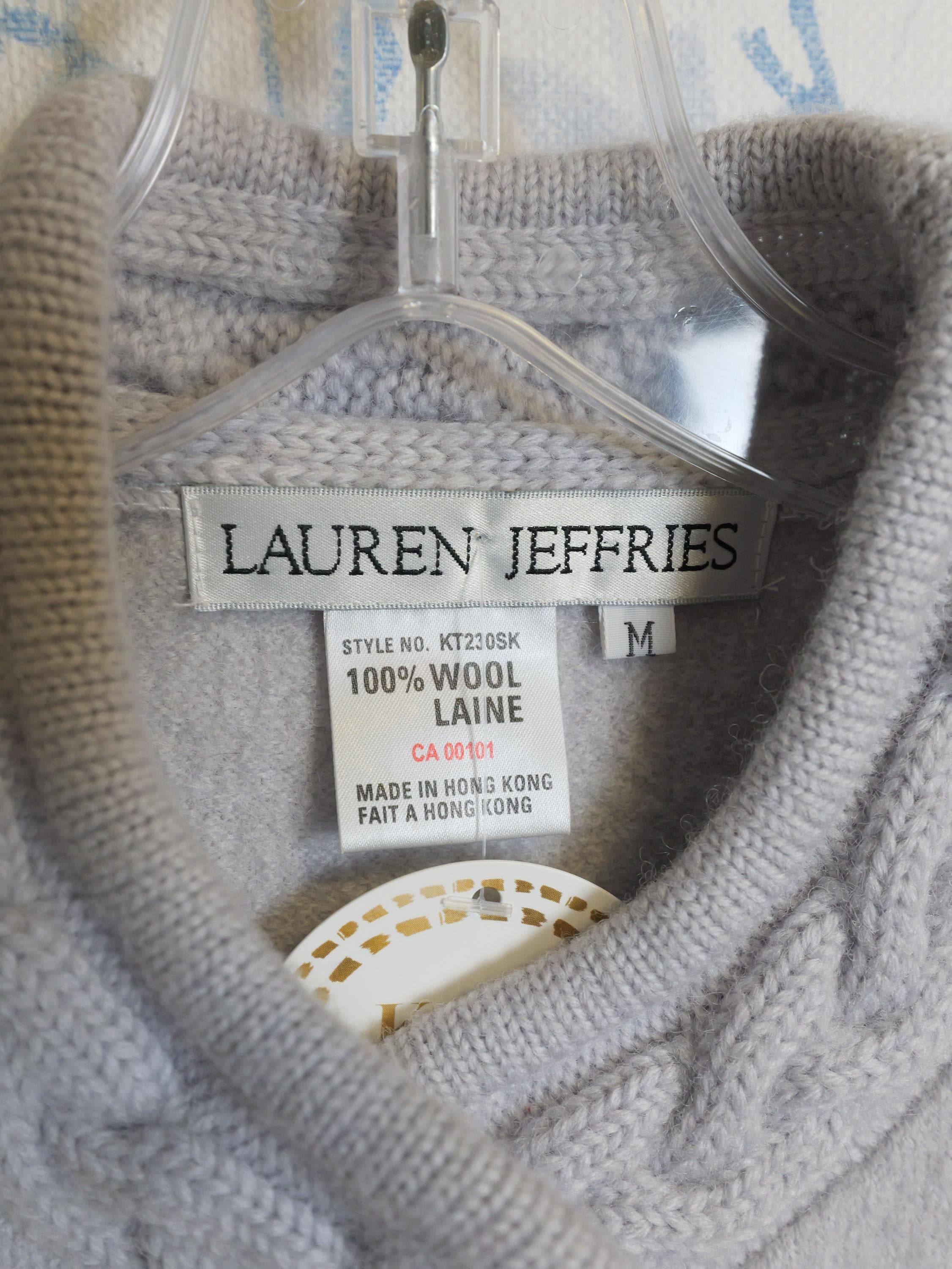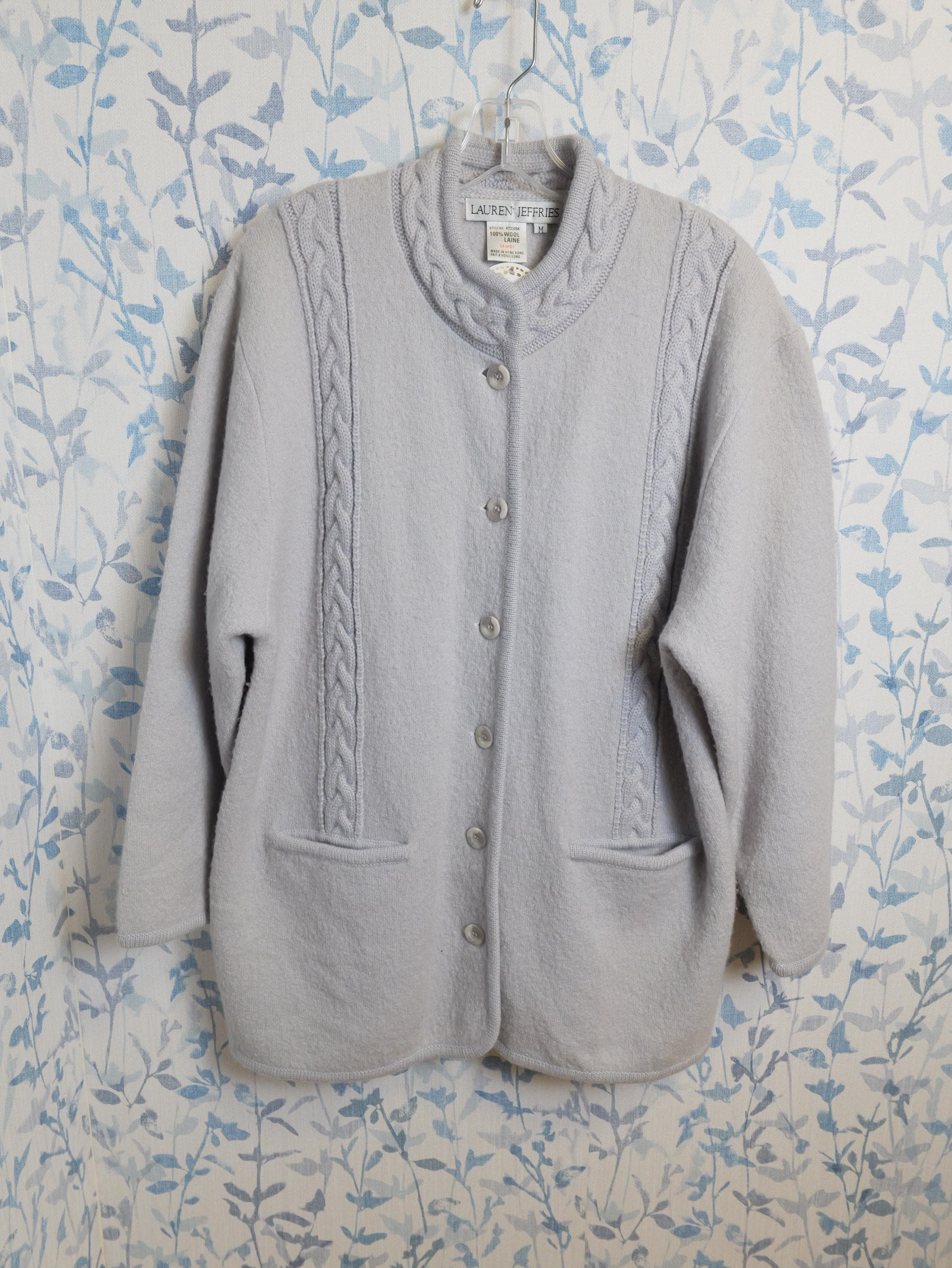 Gray with buttons down the front. Size medium. Fits oversized. Brand is Lauren Jeffries. Made in Hong Kong. Lovely quality.