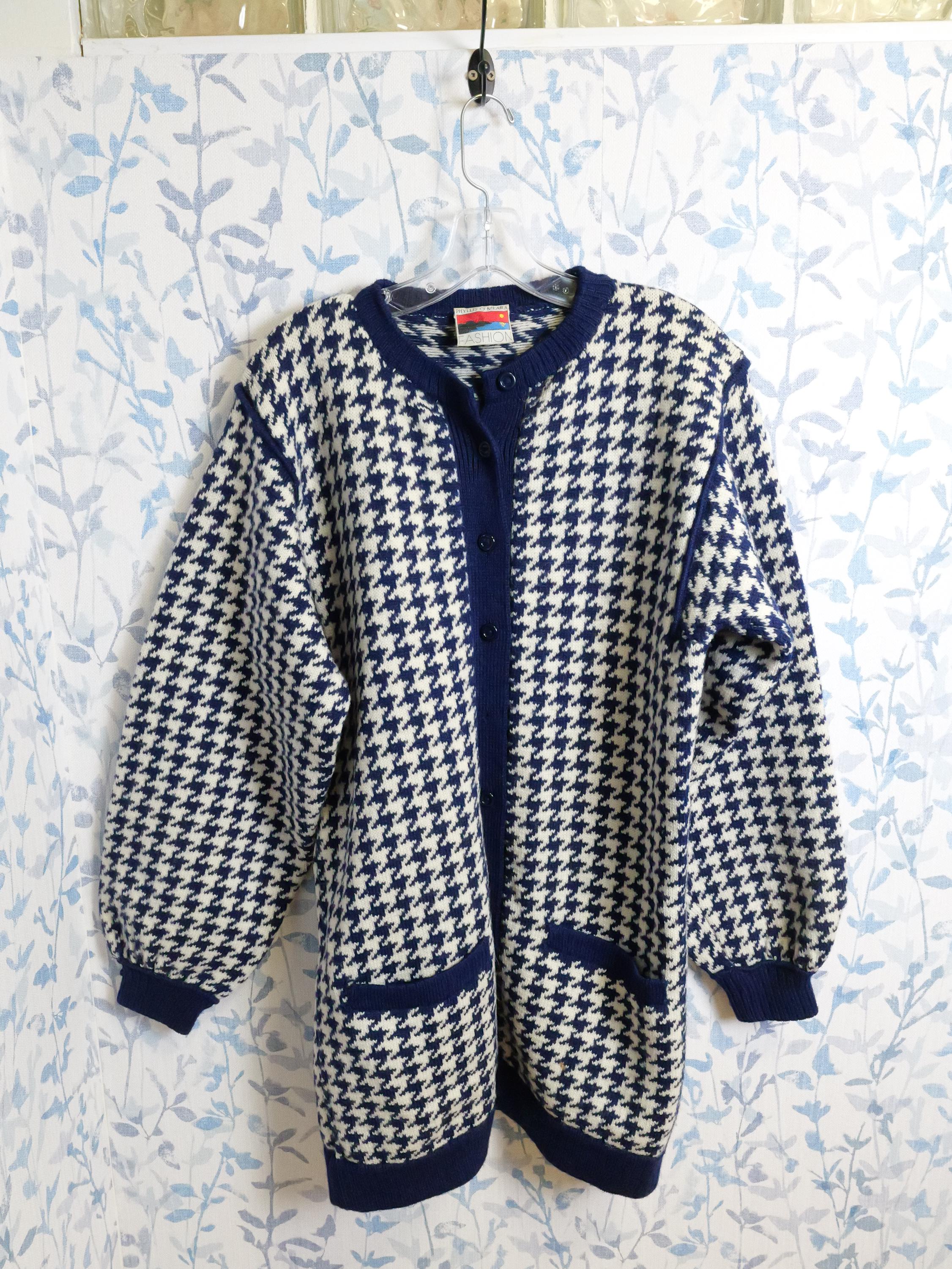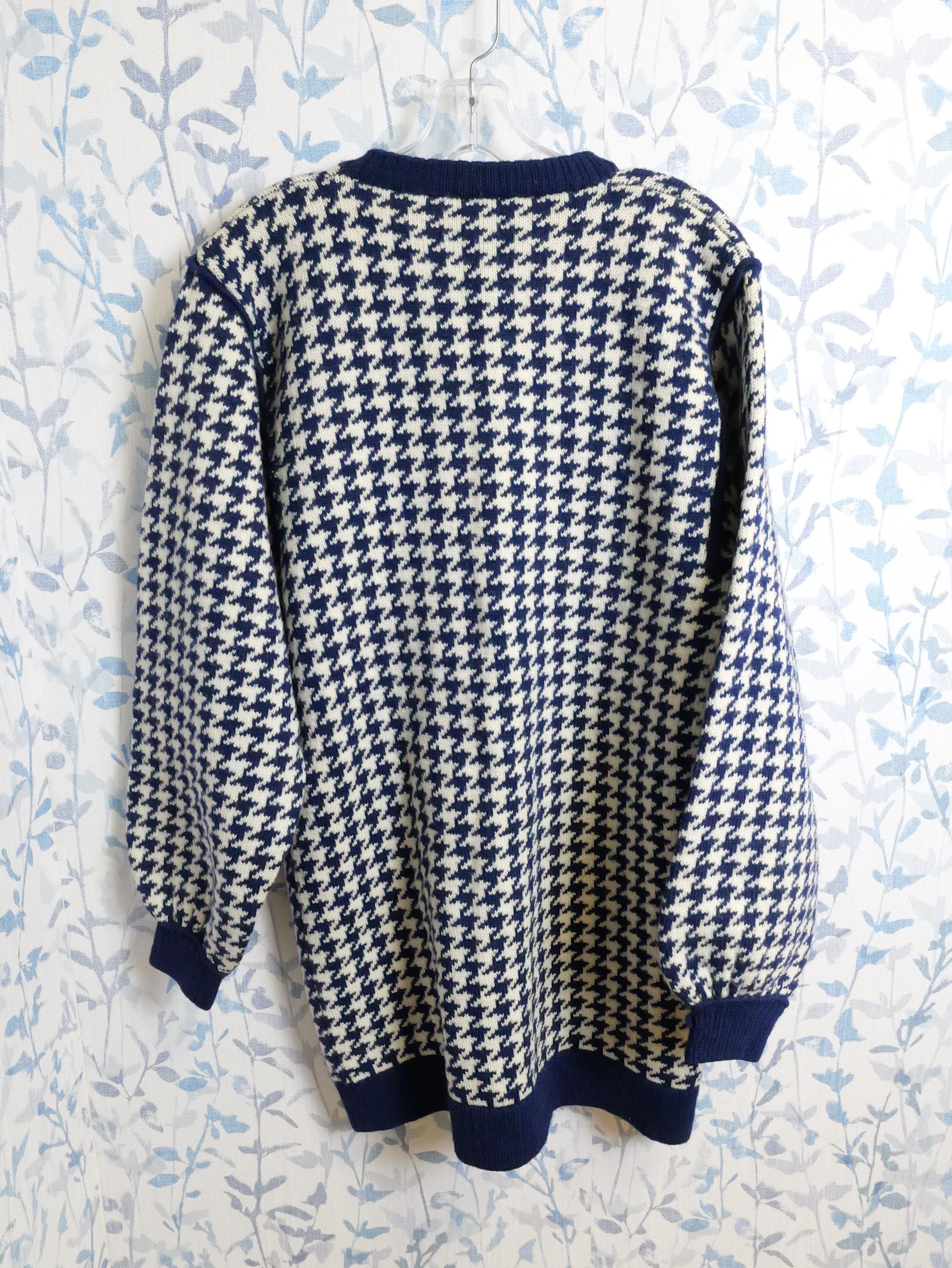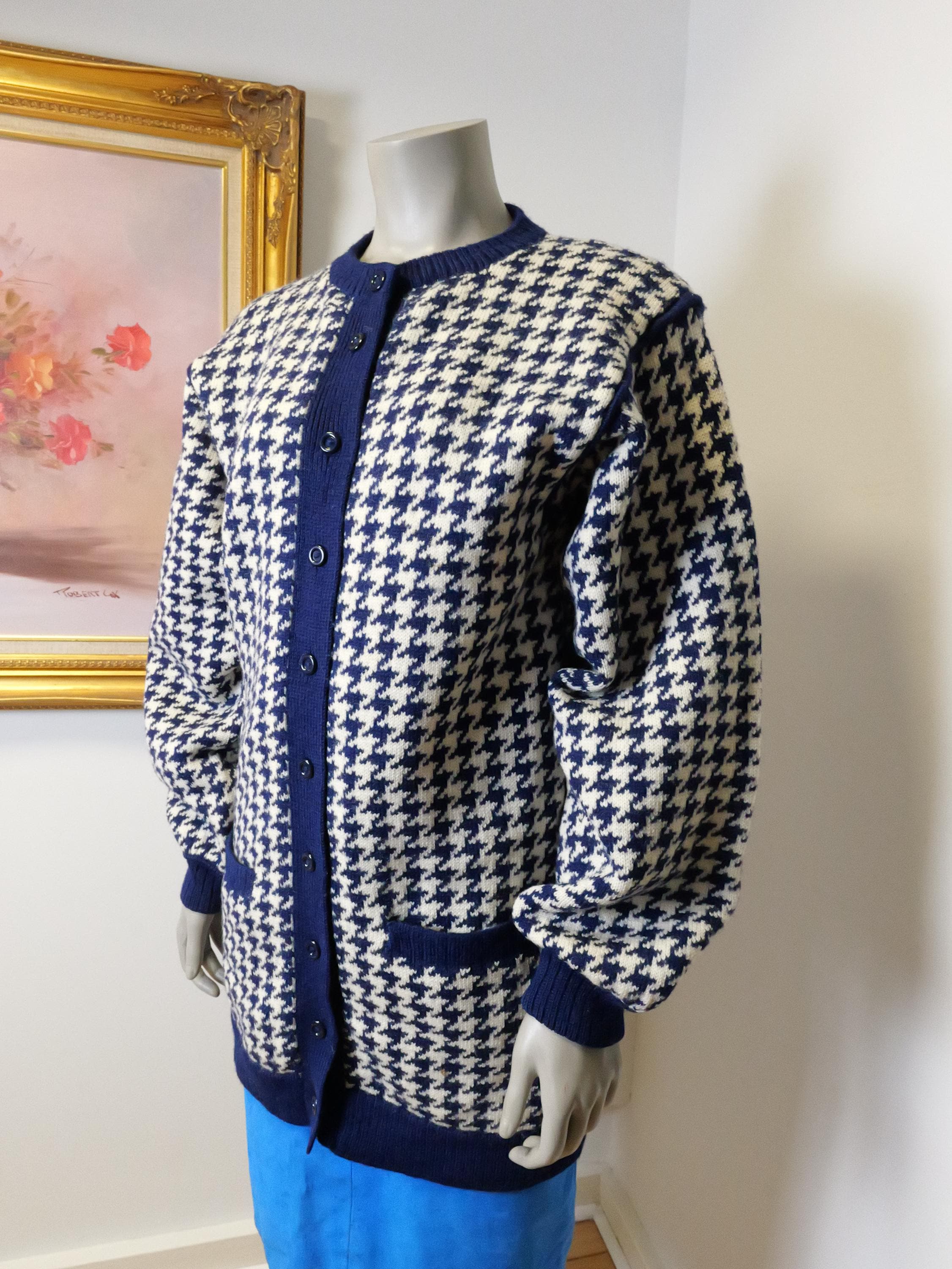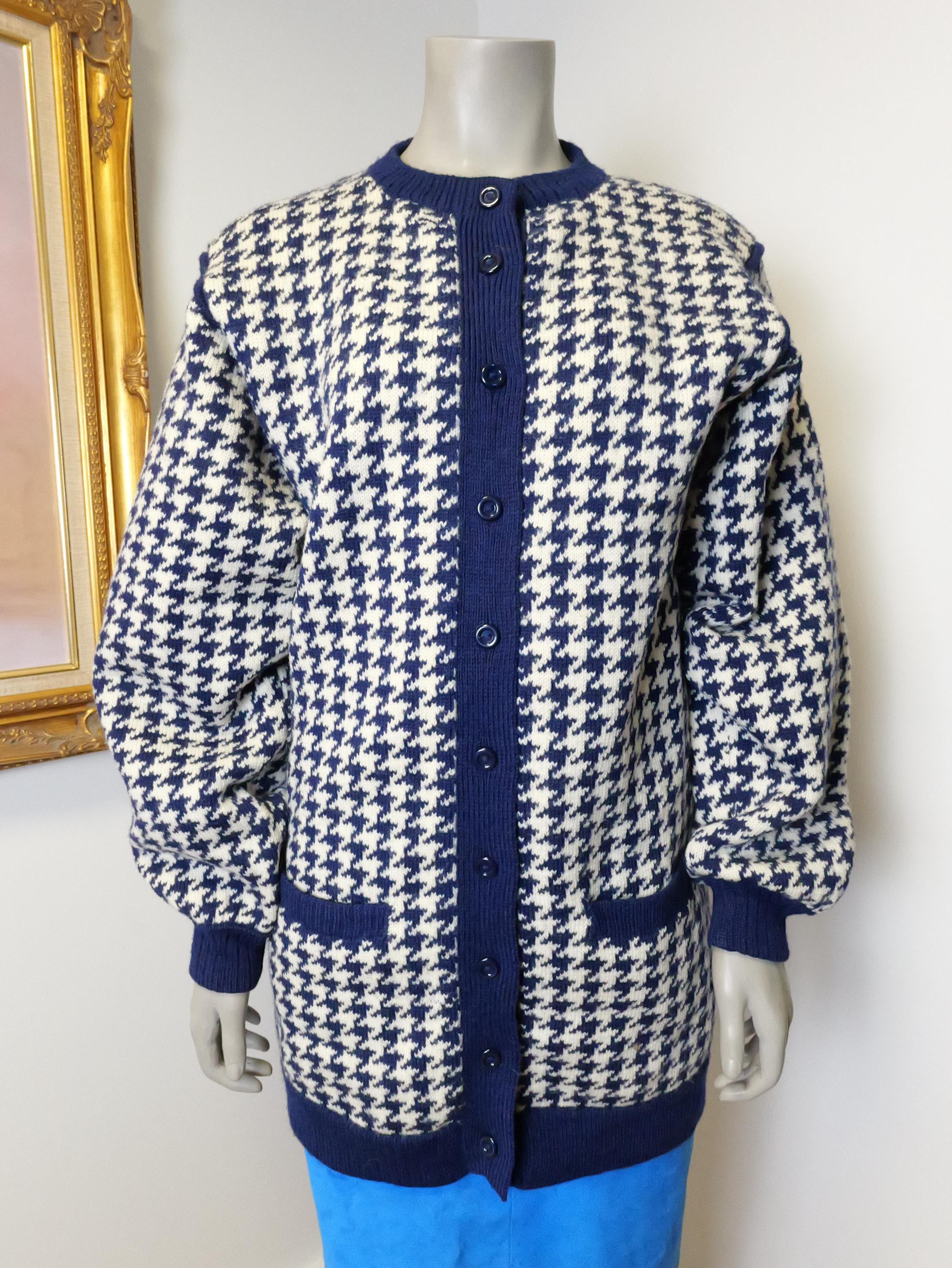 Navy blue and cream vintage wool cardigan sweater from the 1980’s.