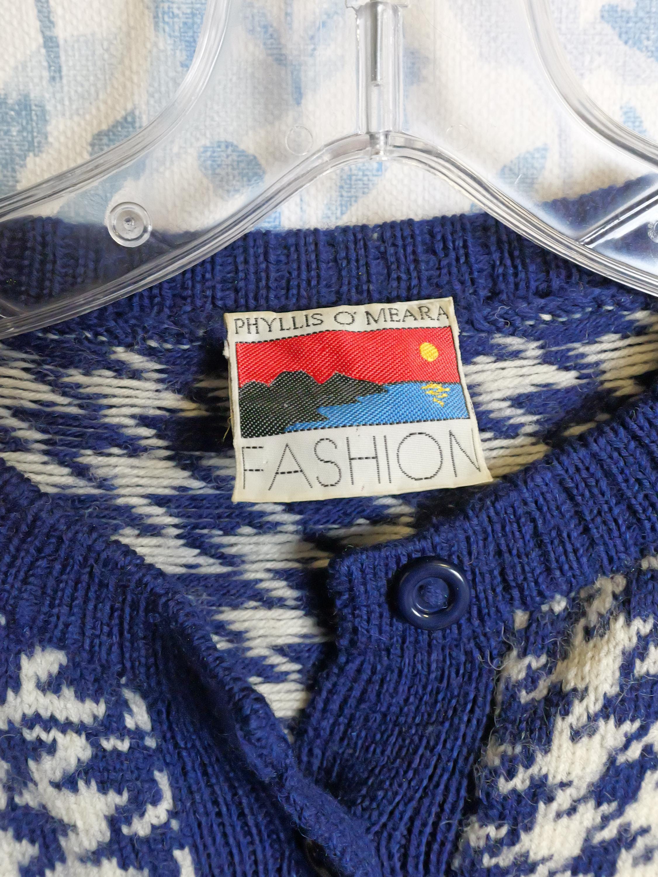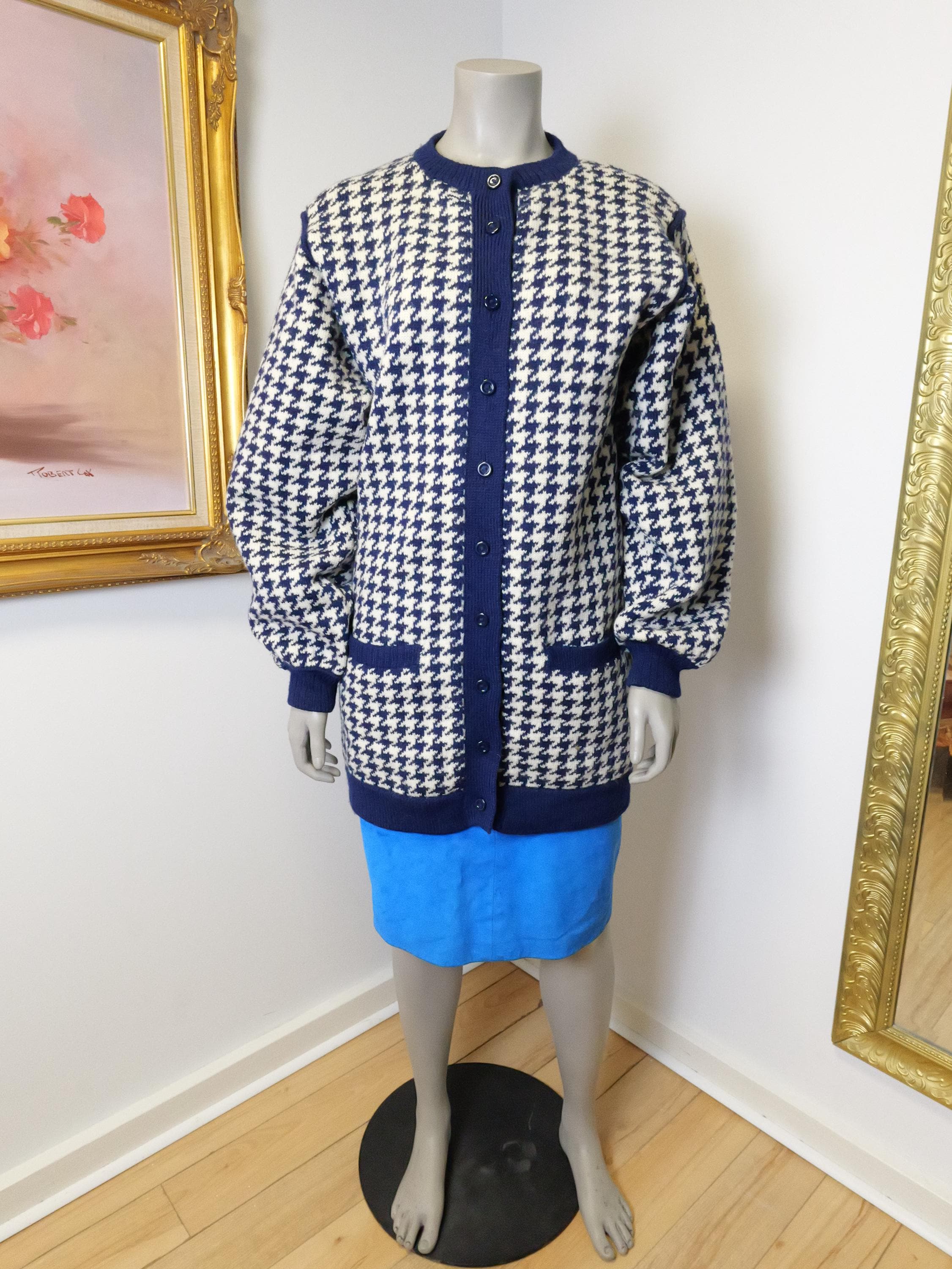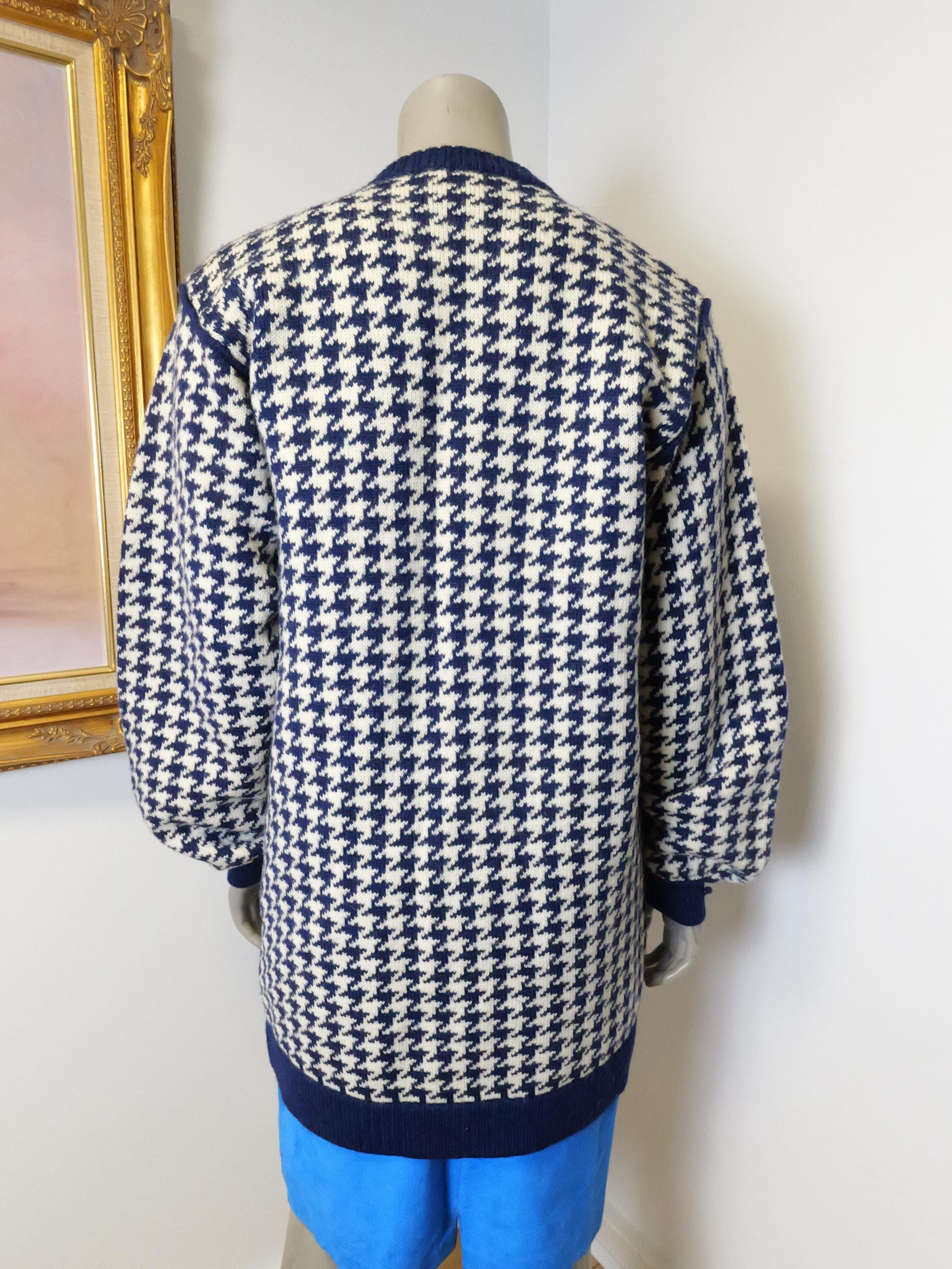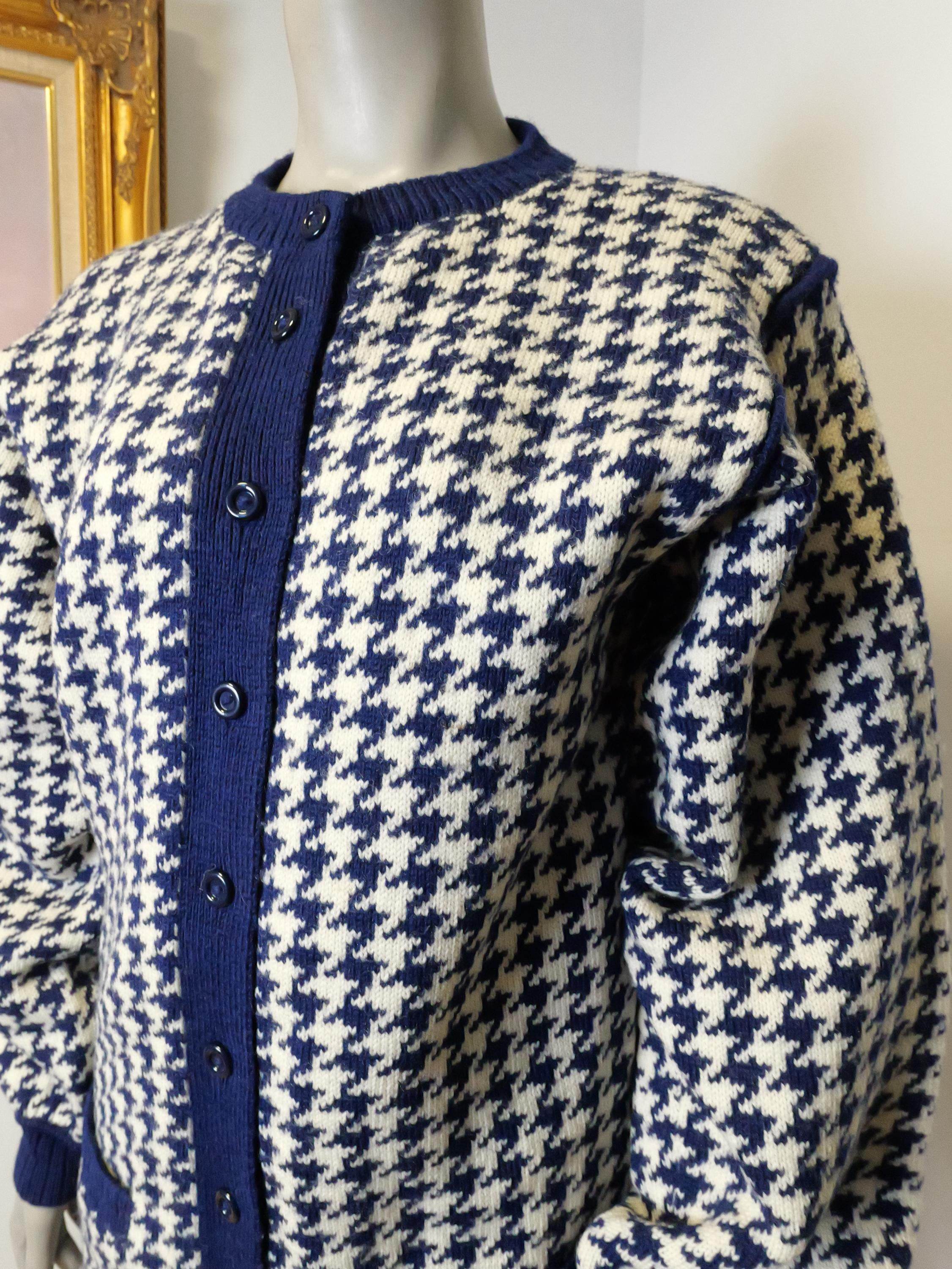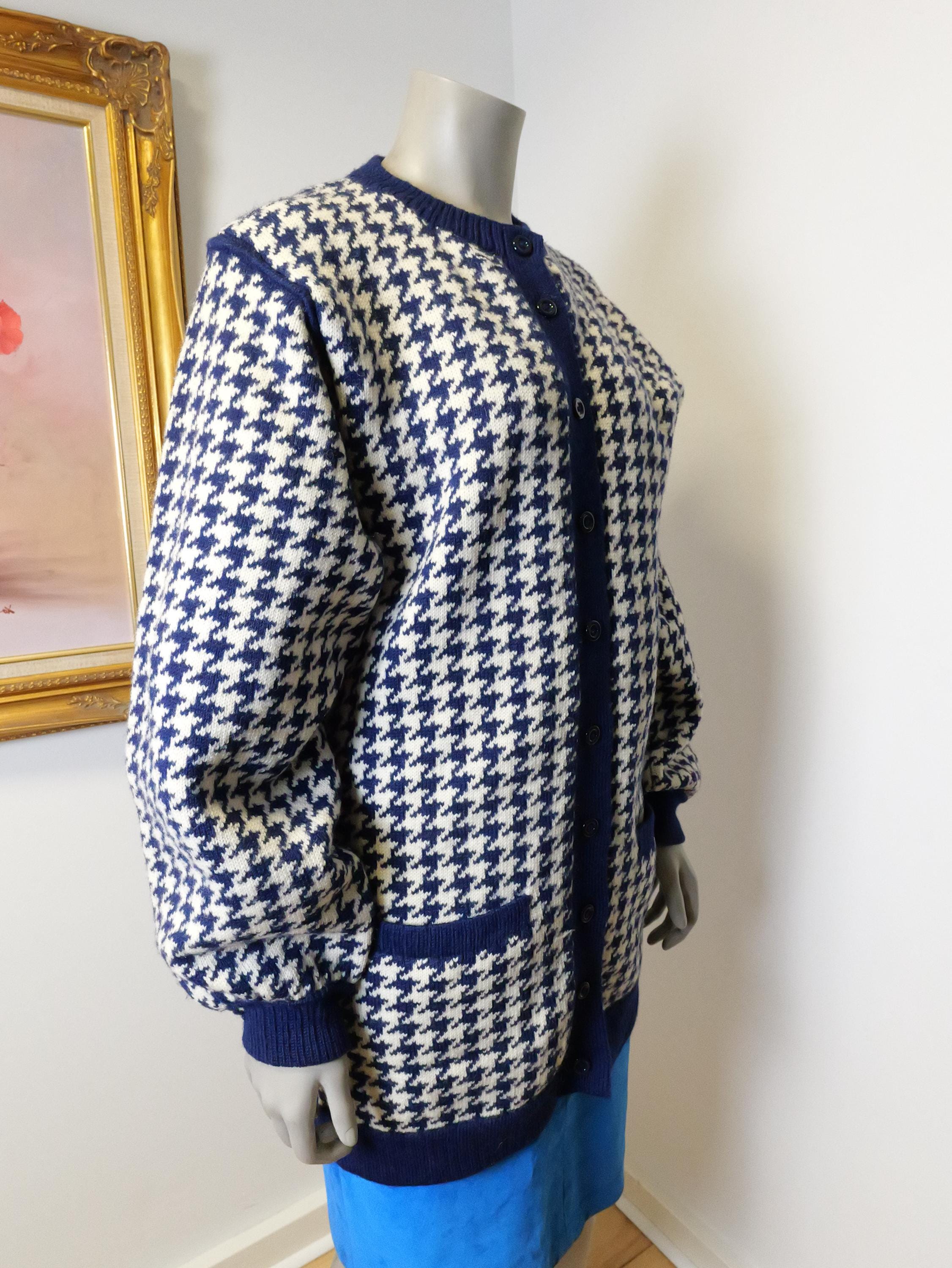 Navy blue and cream vintage wool cardigan sweater from the 1980’s.