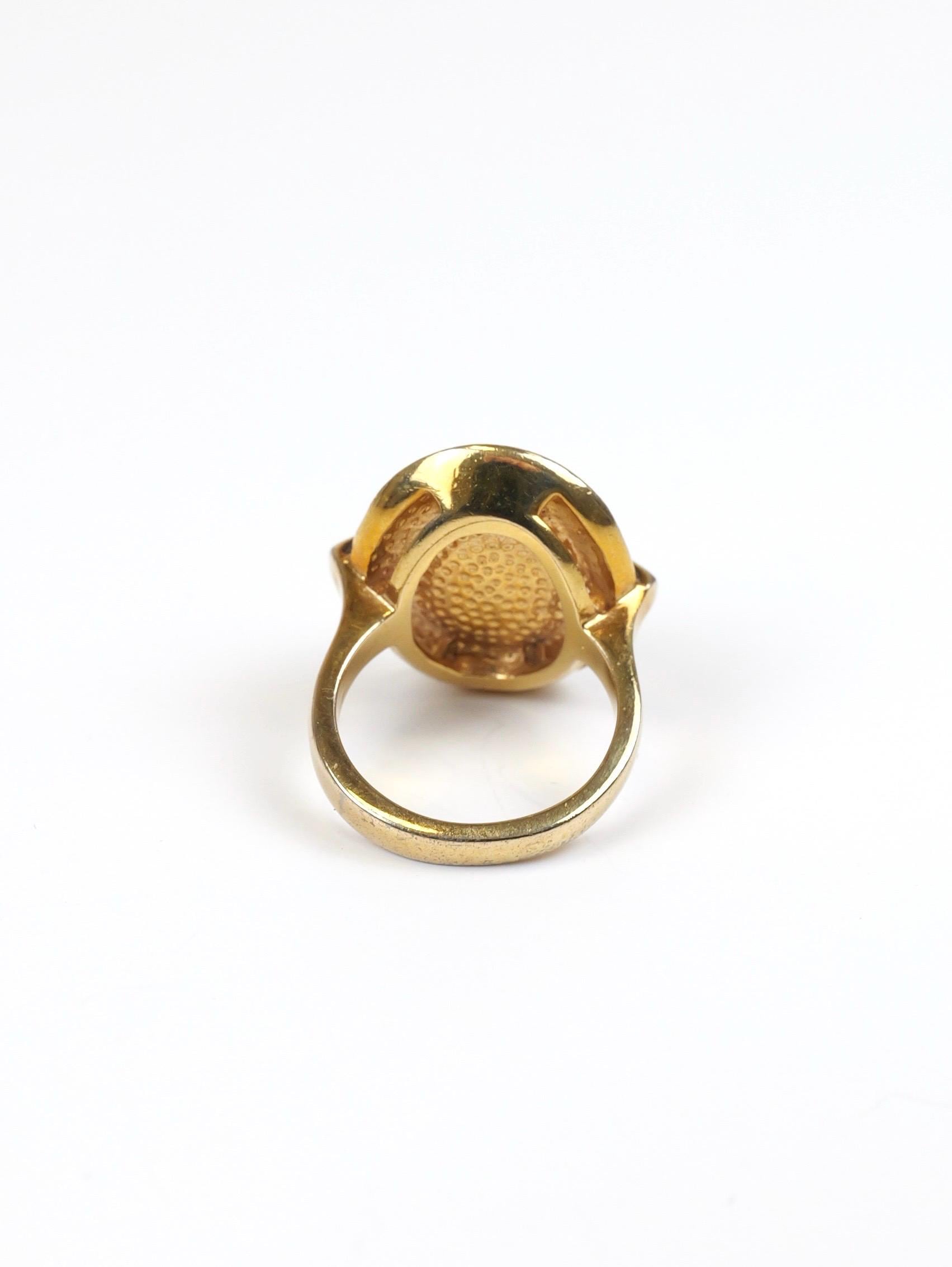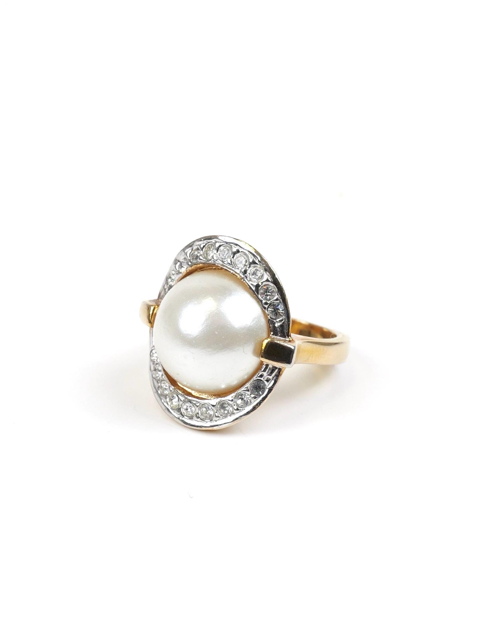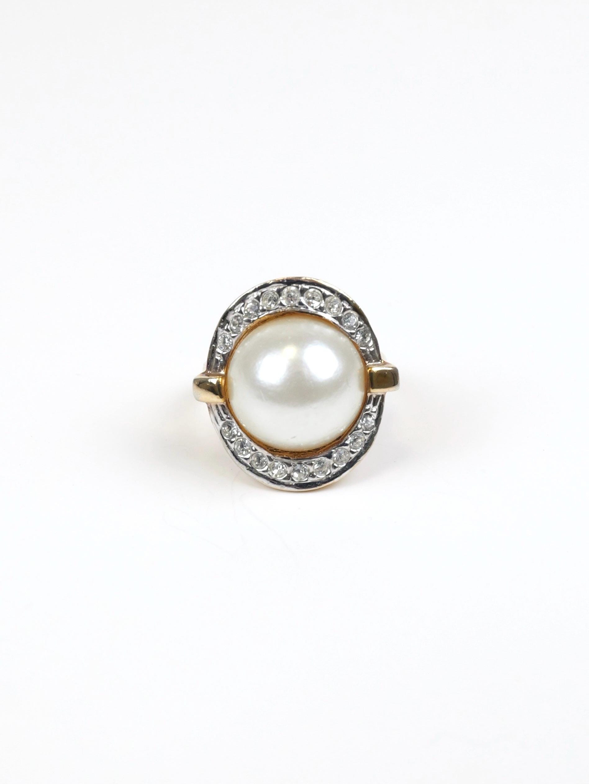 Costume cocktail ring from the 1980’s, features a gold tone band with a large statement pearl surrounded by CZ stones.
