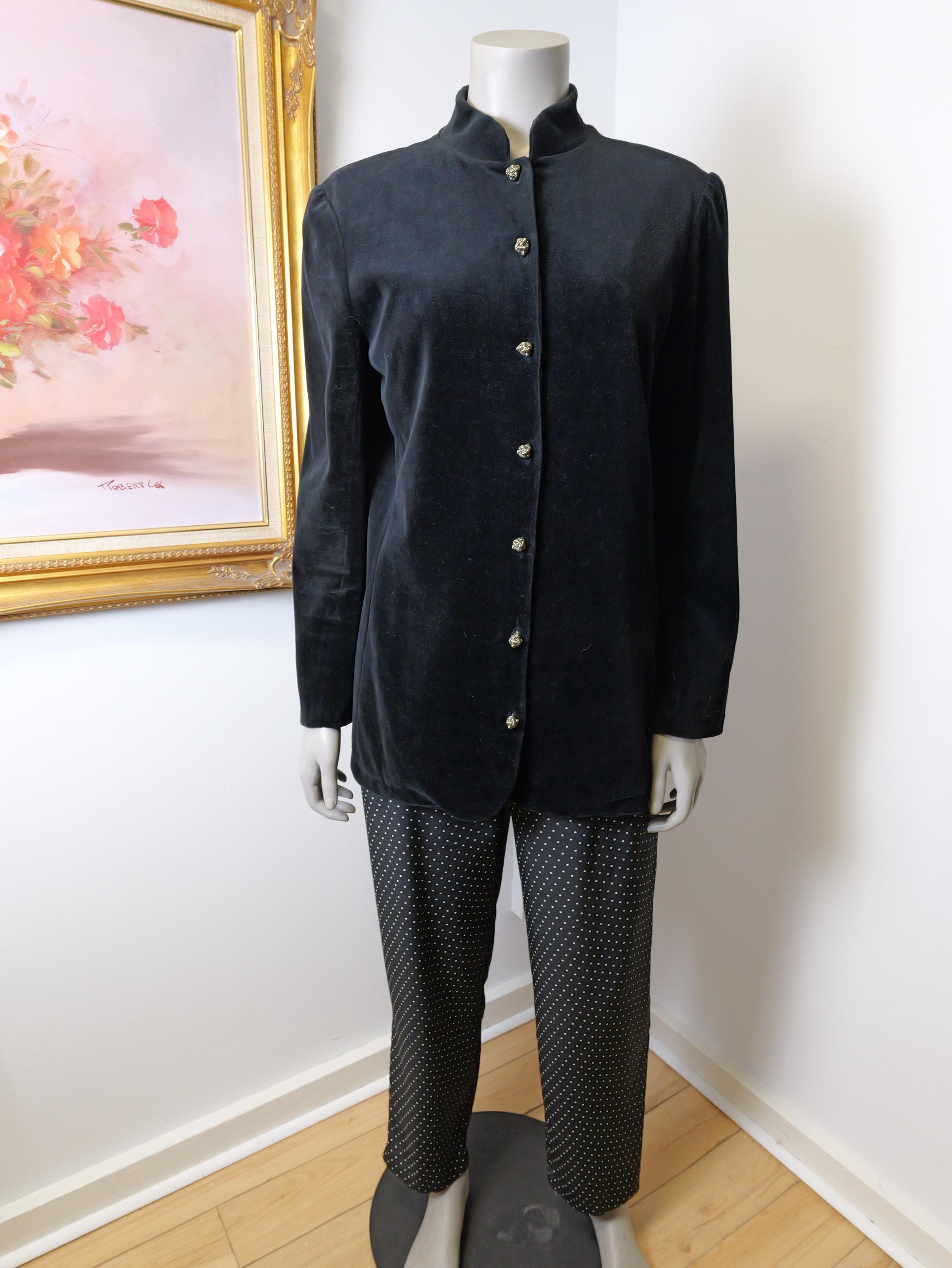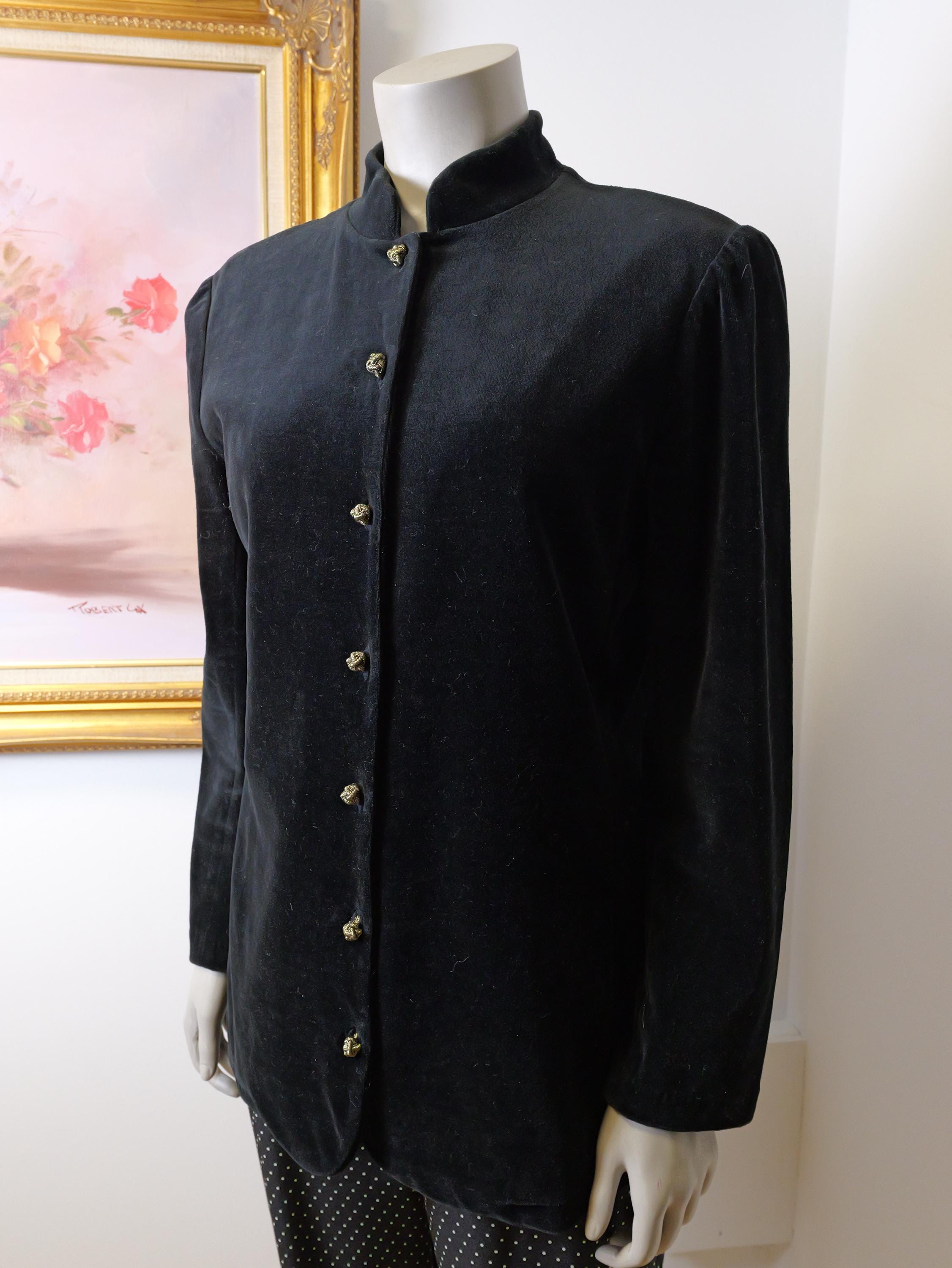 Nice plush black velvet women’s blazer top with gold love knot buttons.