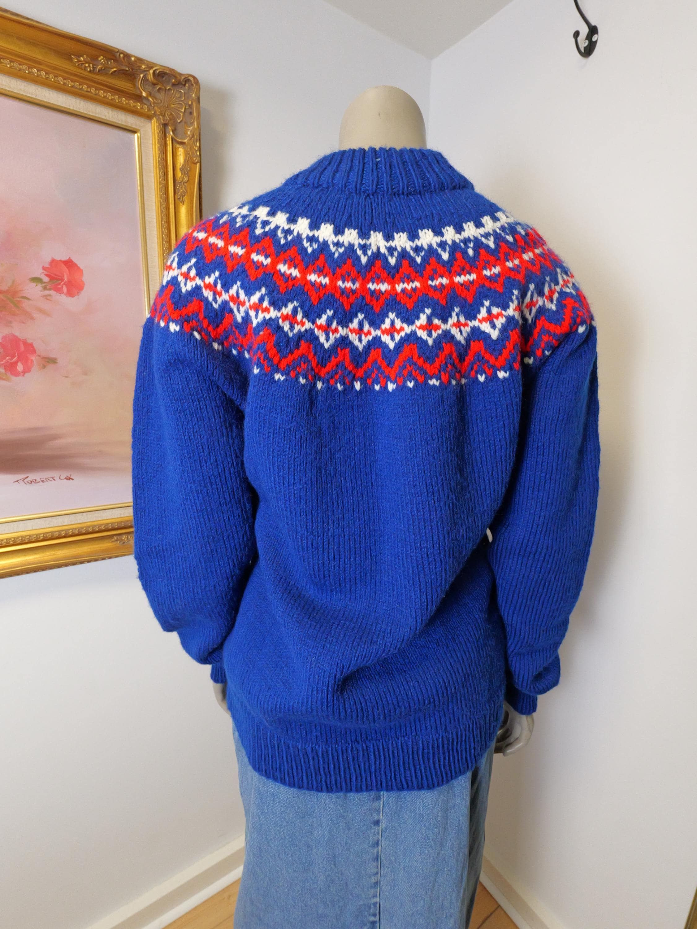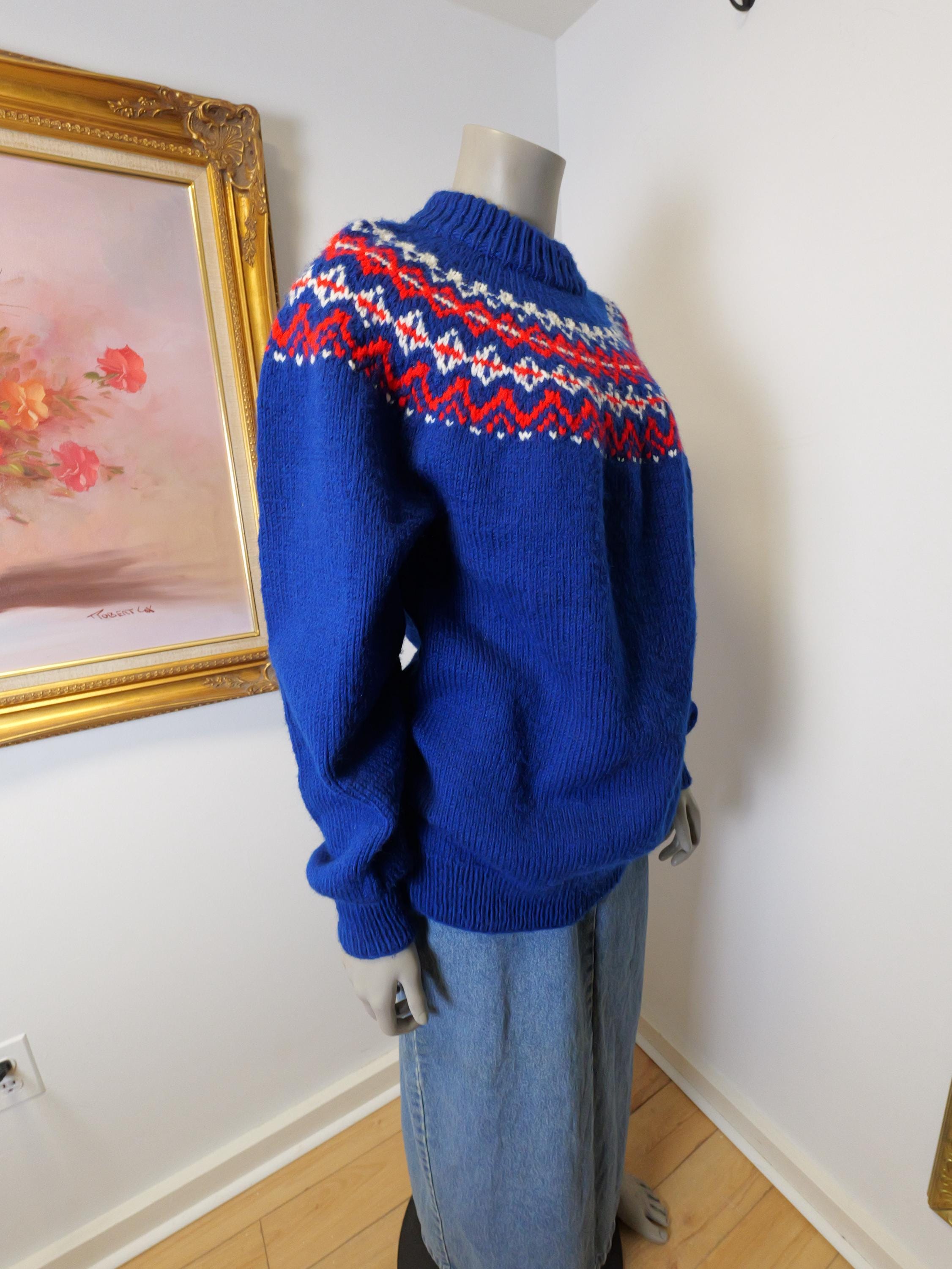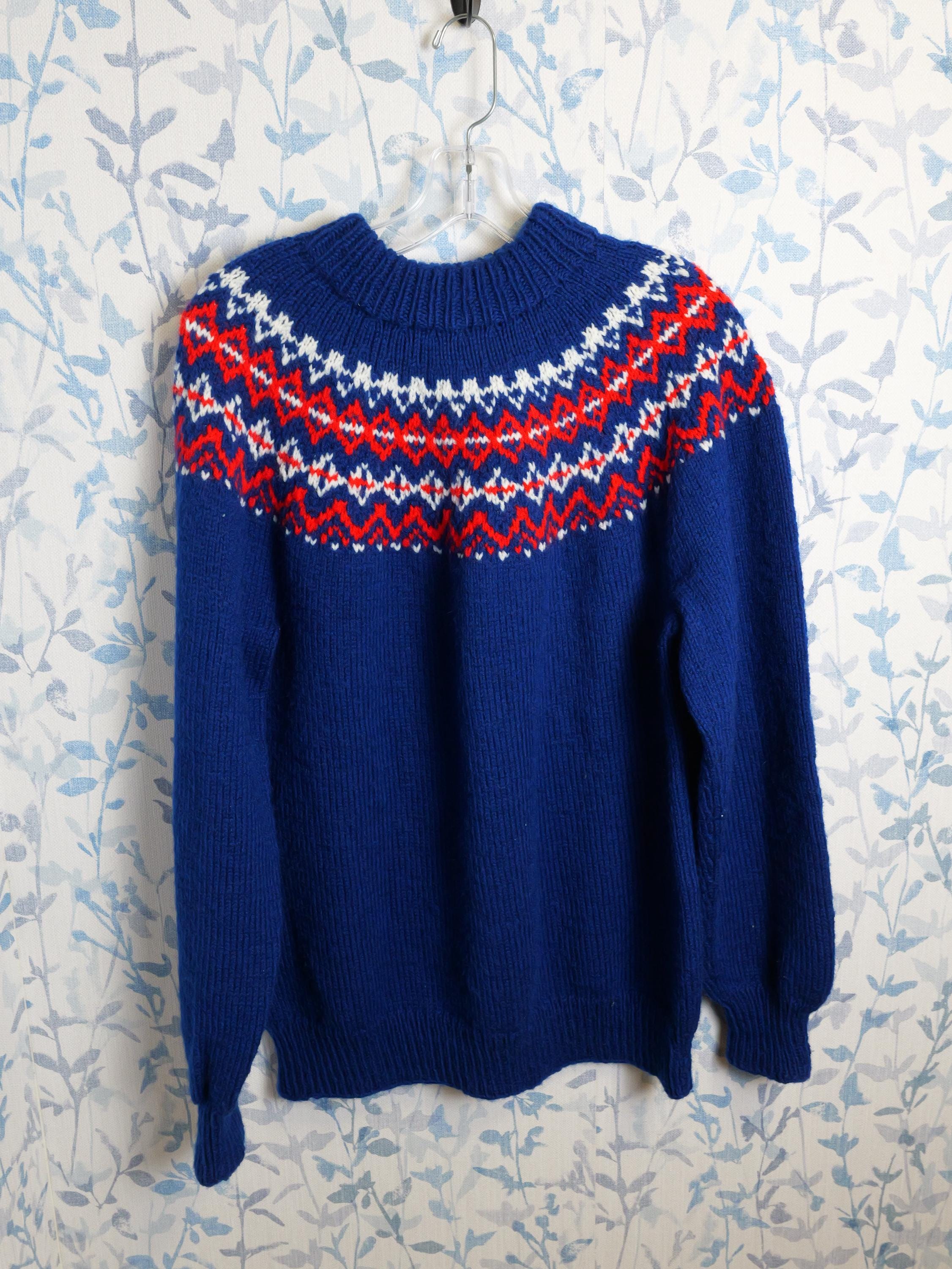 Pull over fair isle fisherman’s style winter knit in blue with red and white accents.