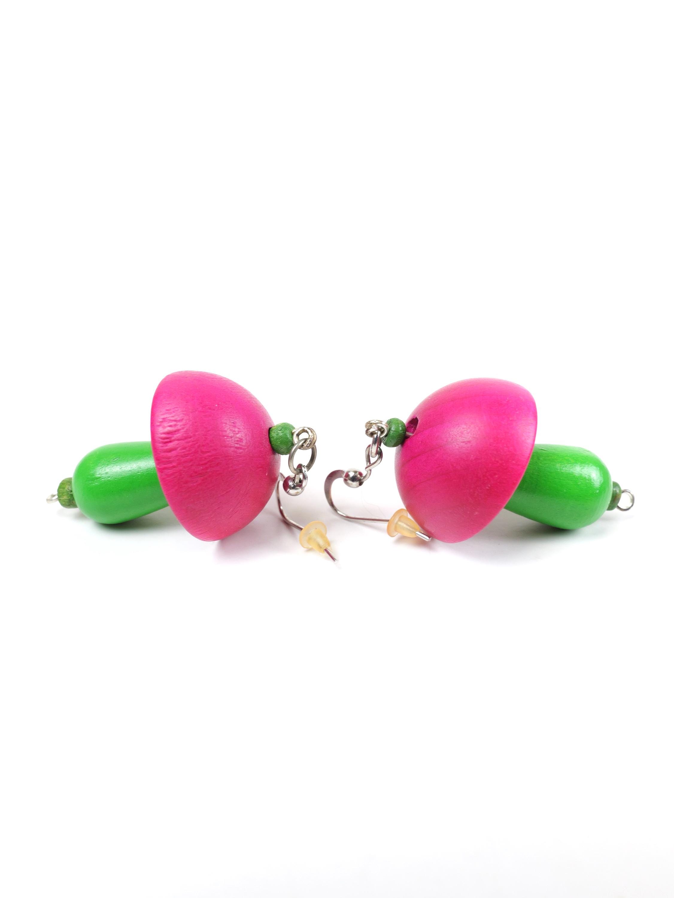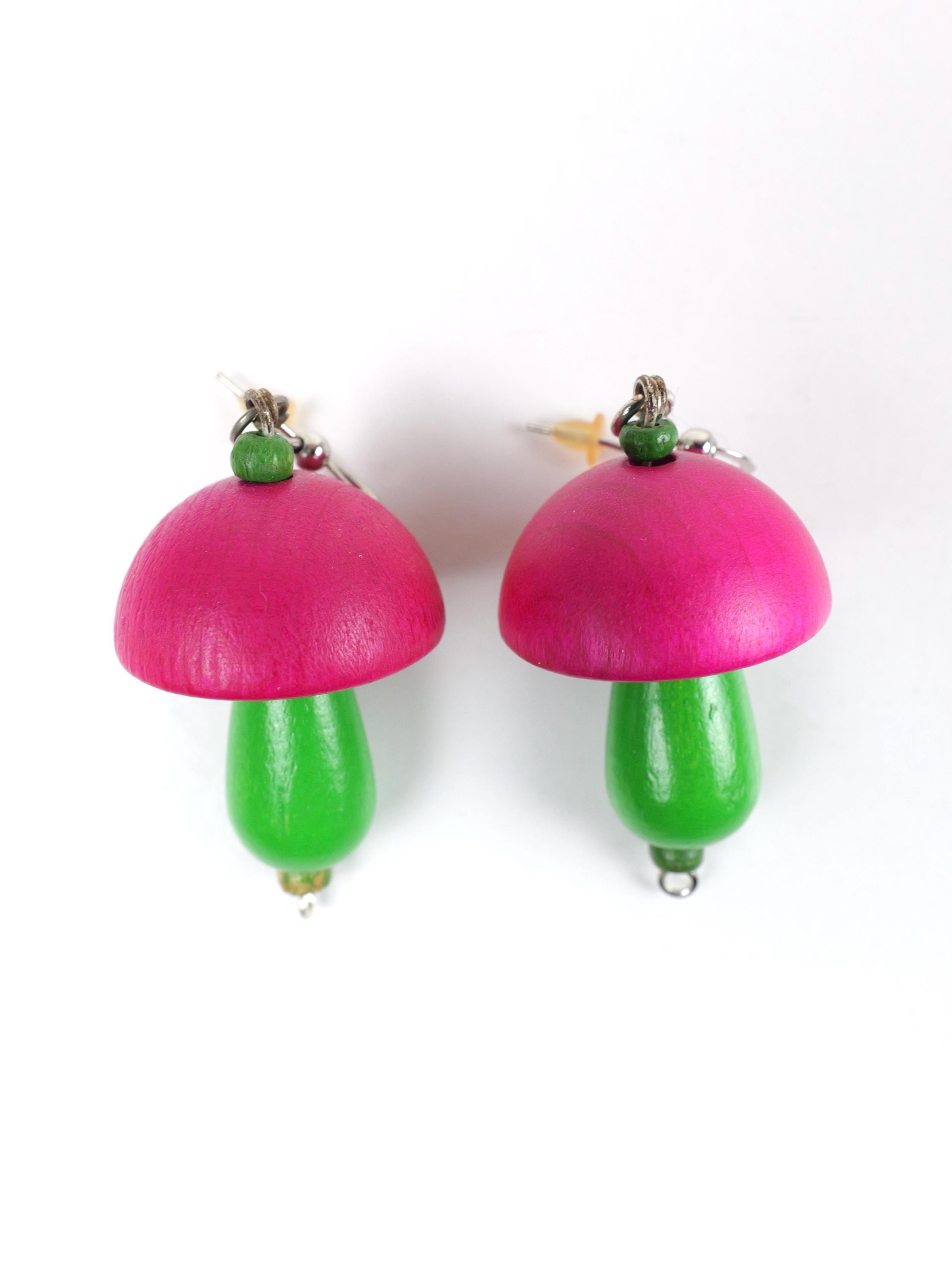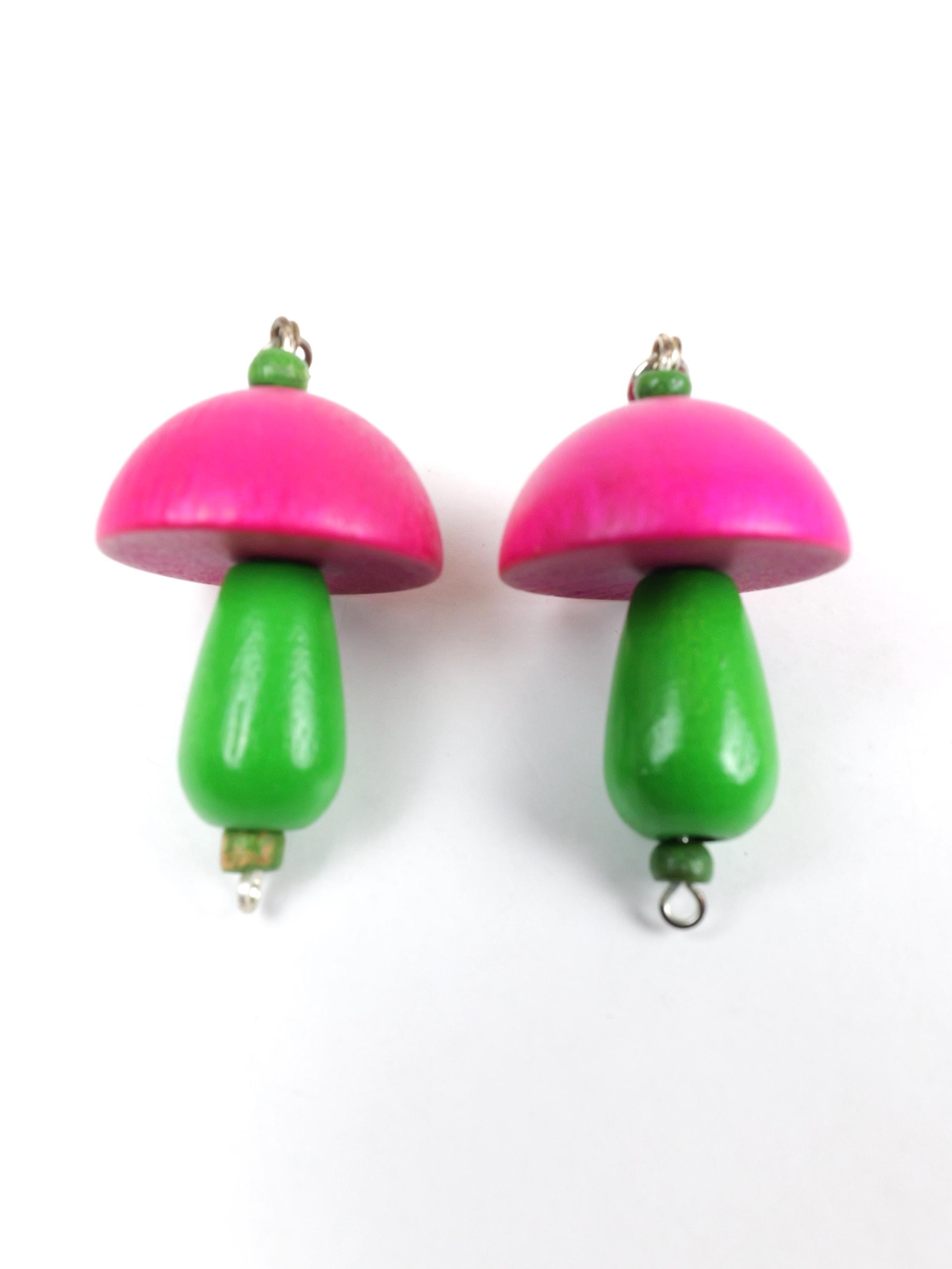 Aarikka brand wooden earrings in a cute little mushroom shape in pink and green. Comfy to wear!