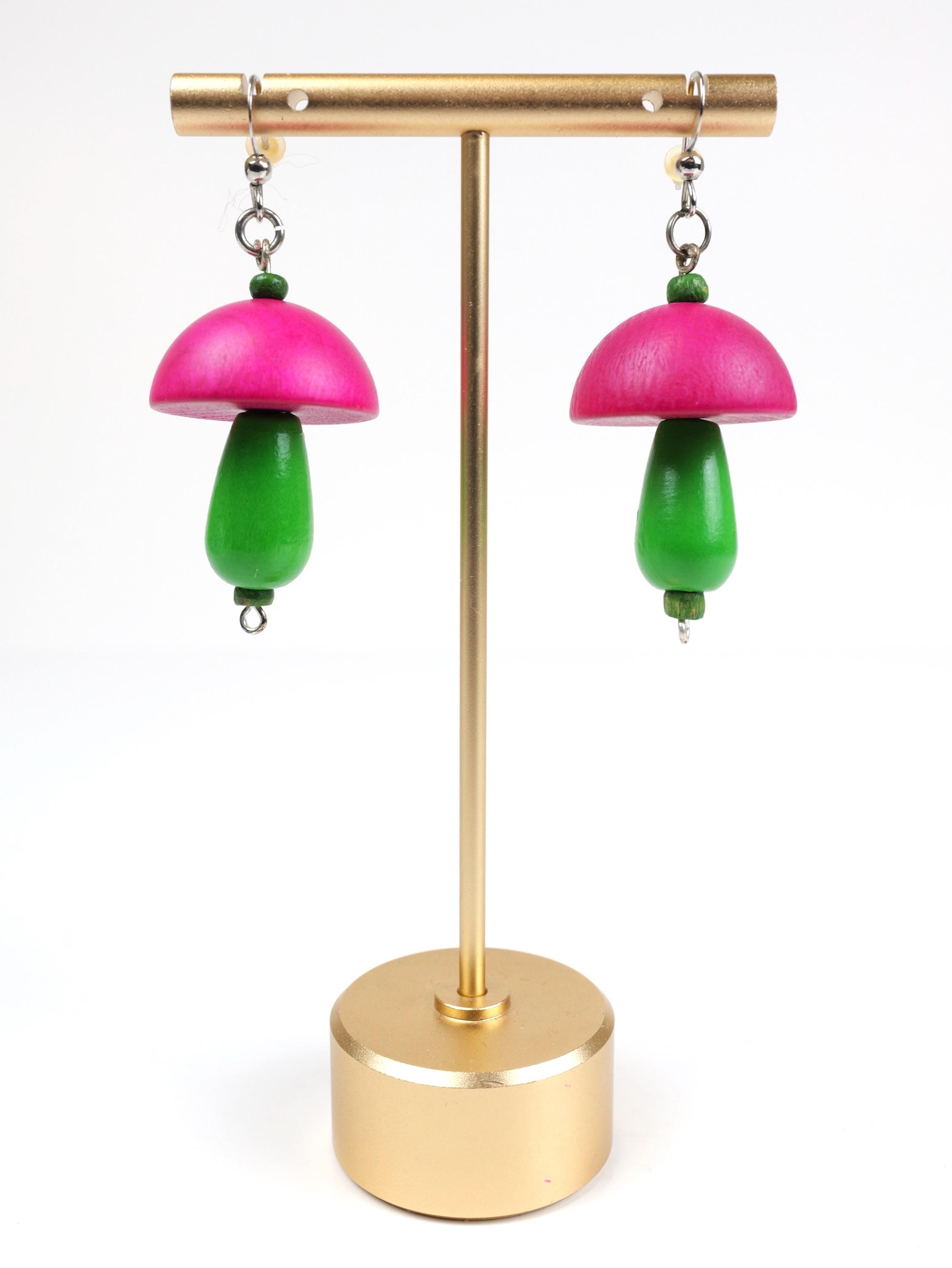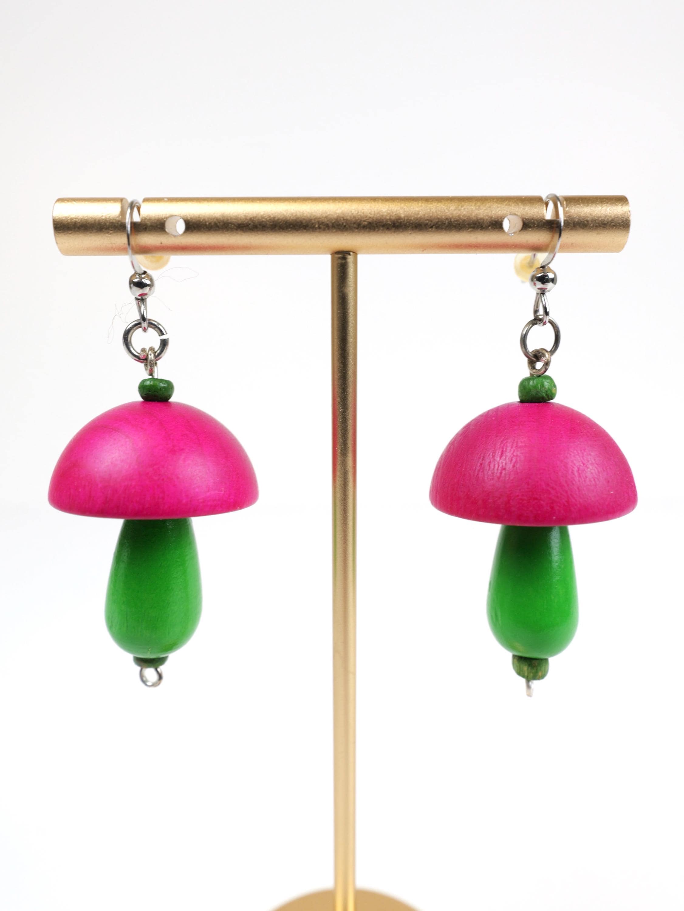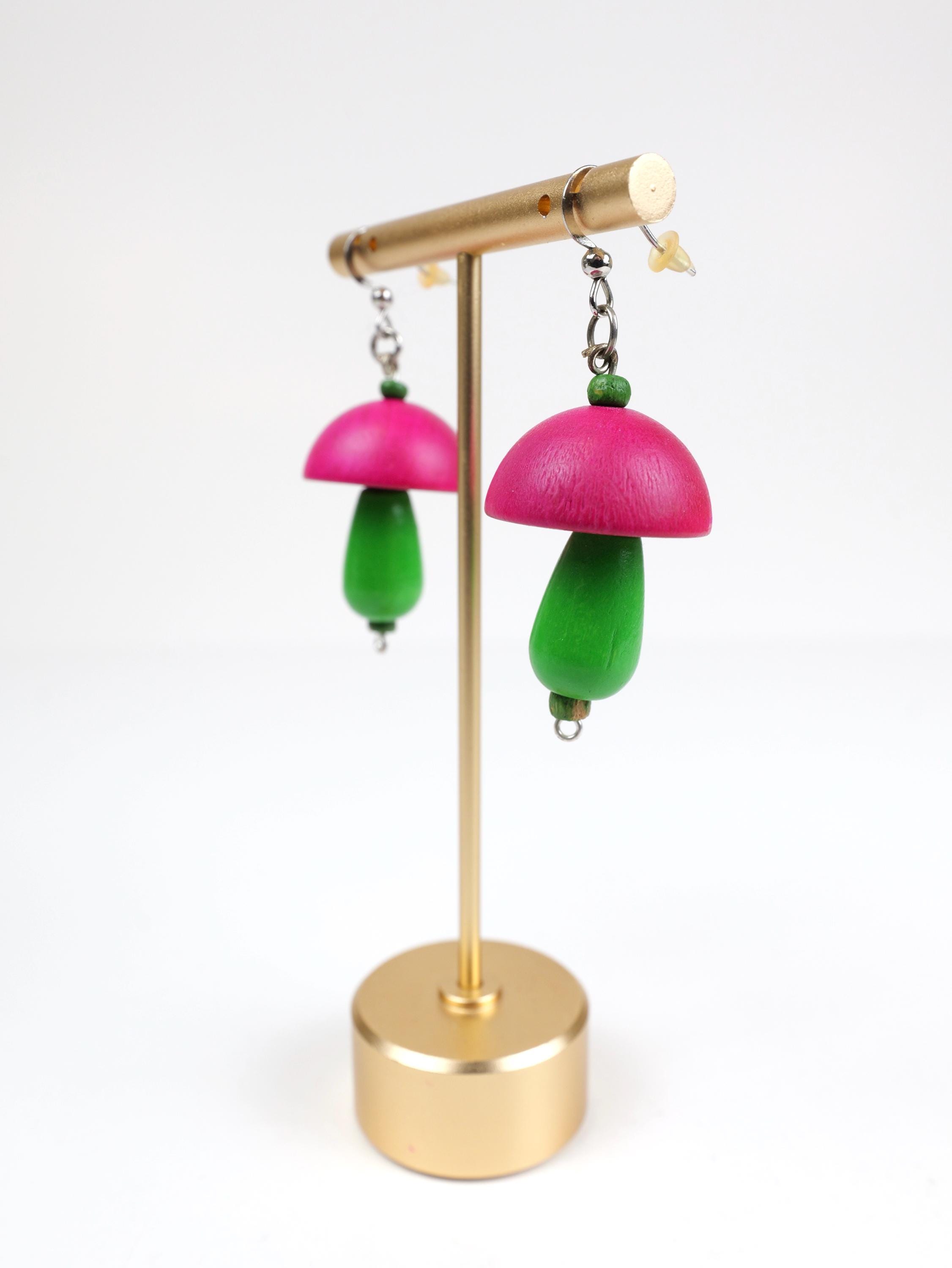 Aarikka brand wooden earrings in a cute little mushroom shape in pink and green. Comfy to wear!