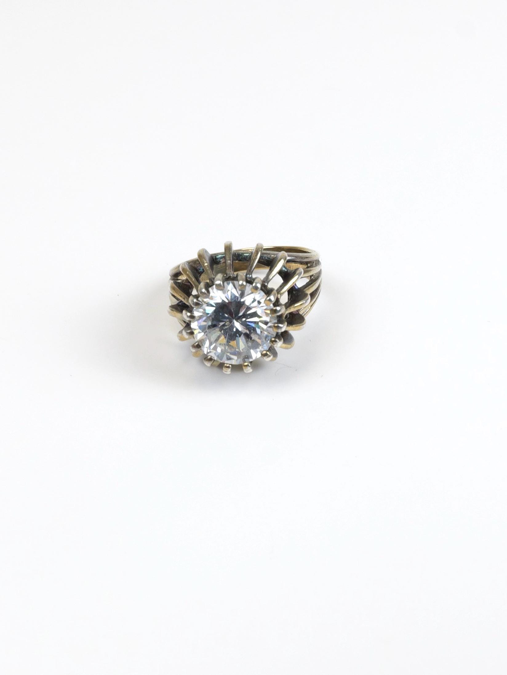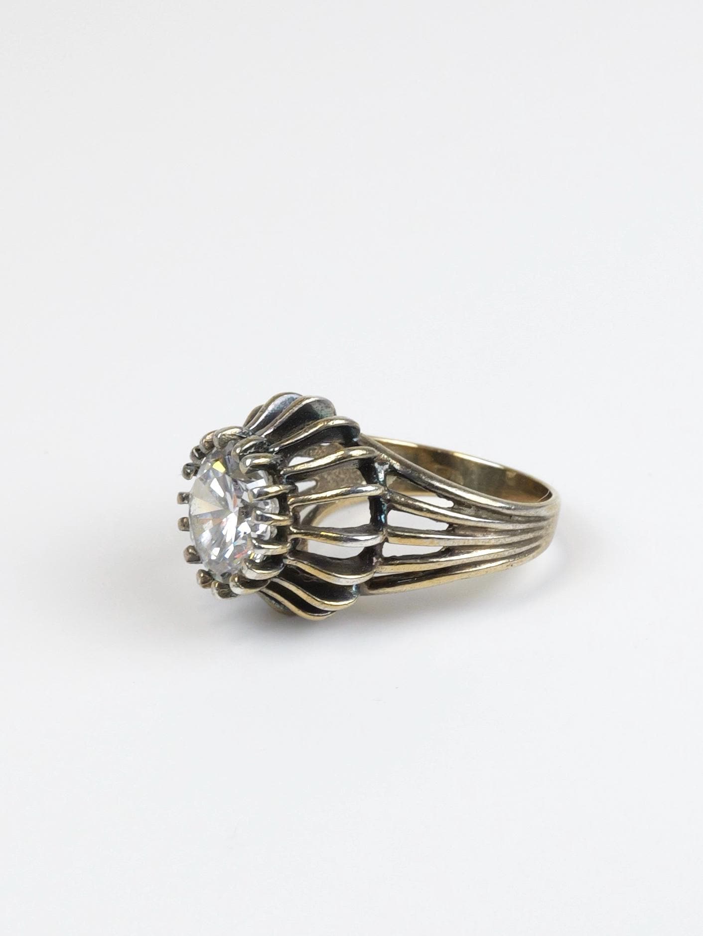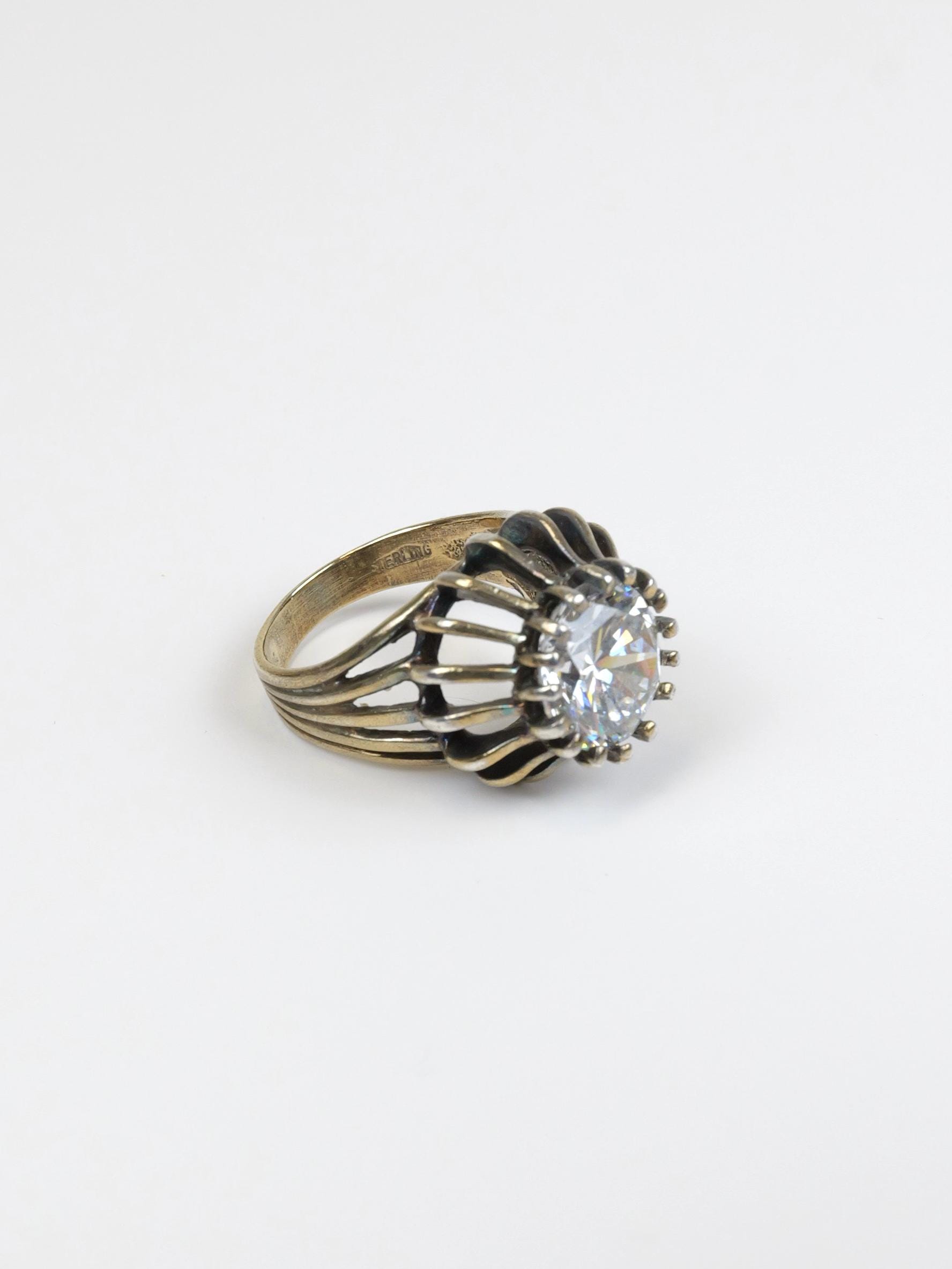 Unique and fun CZ set in sterling silver and gold plated. The gold plating has worn off over the years and the finish is antiqued and really pretty!