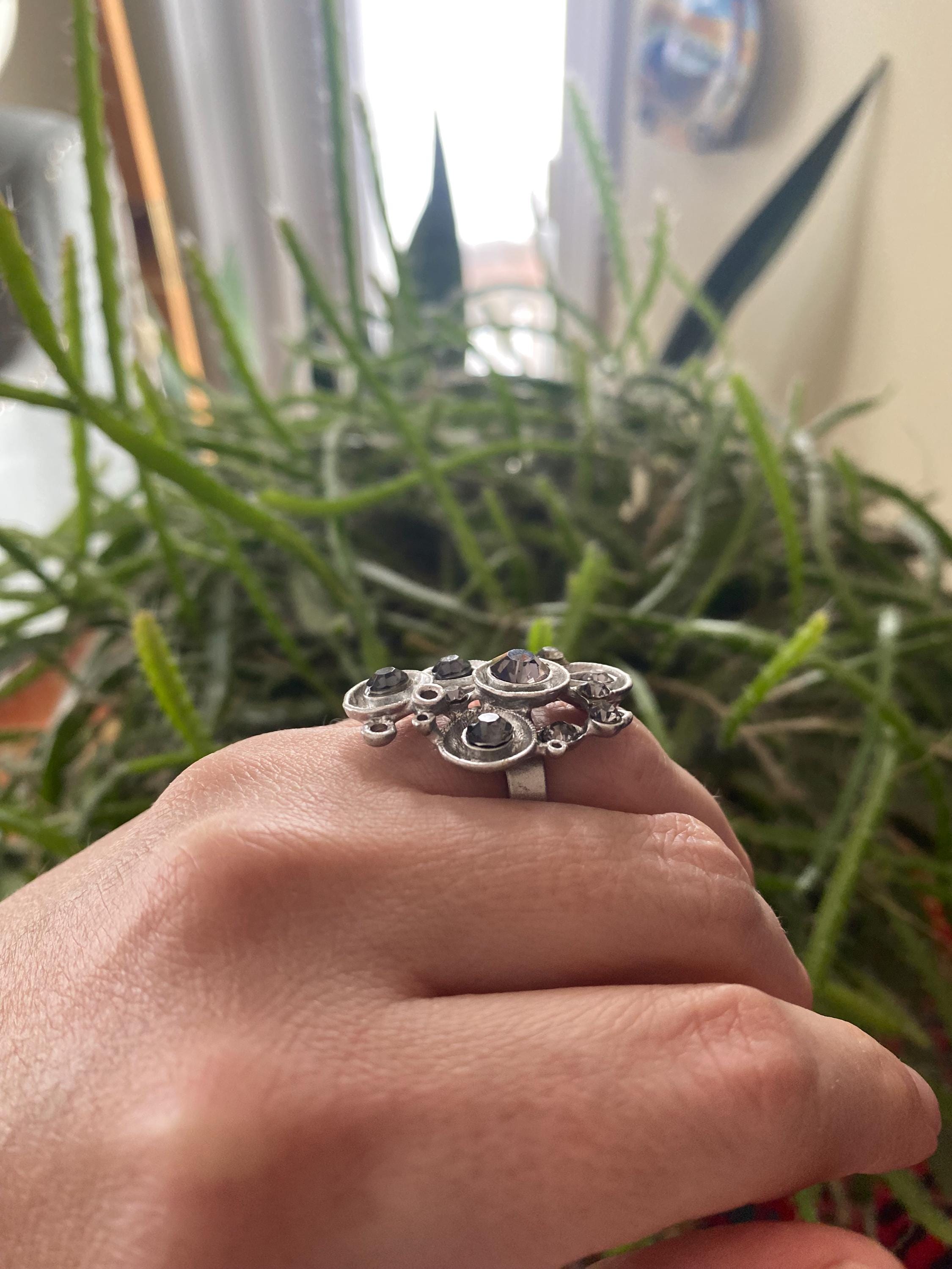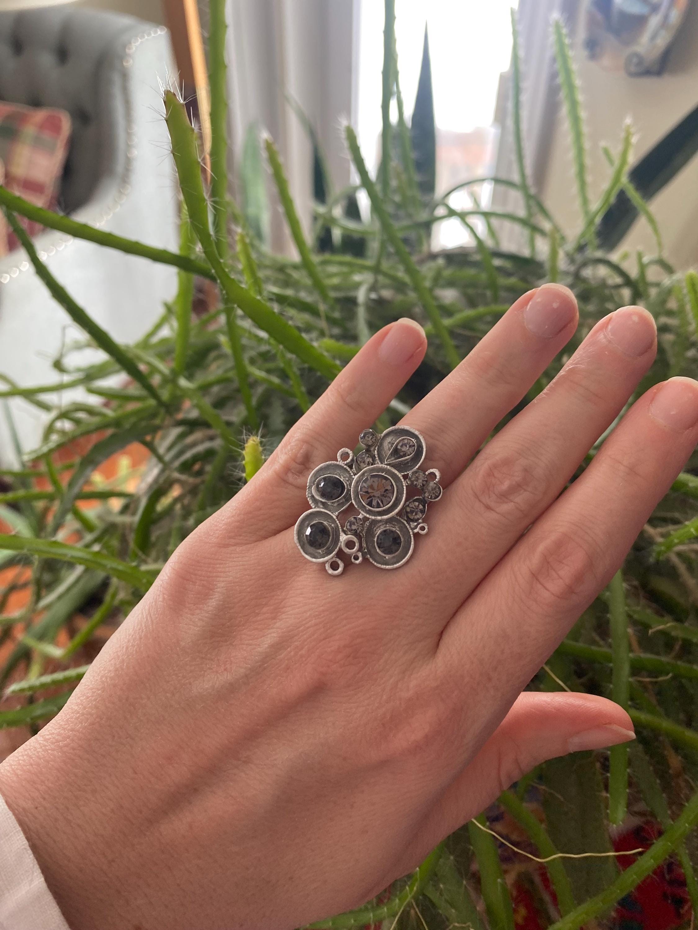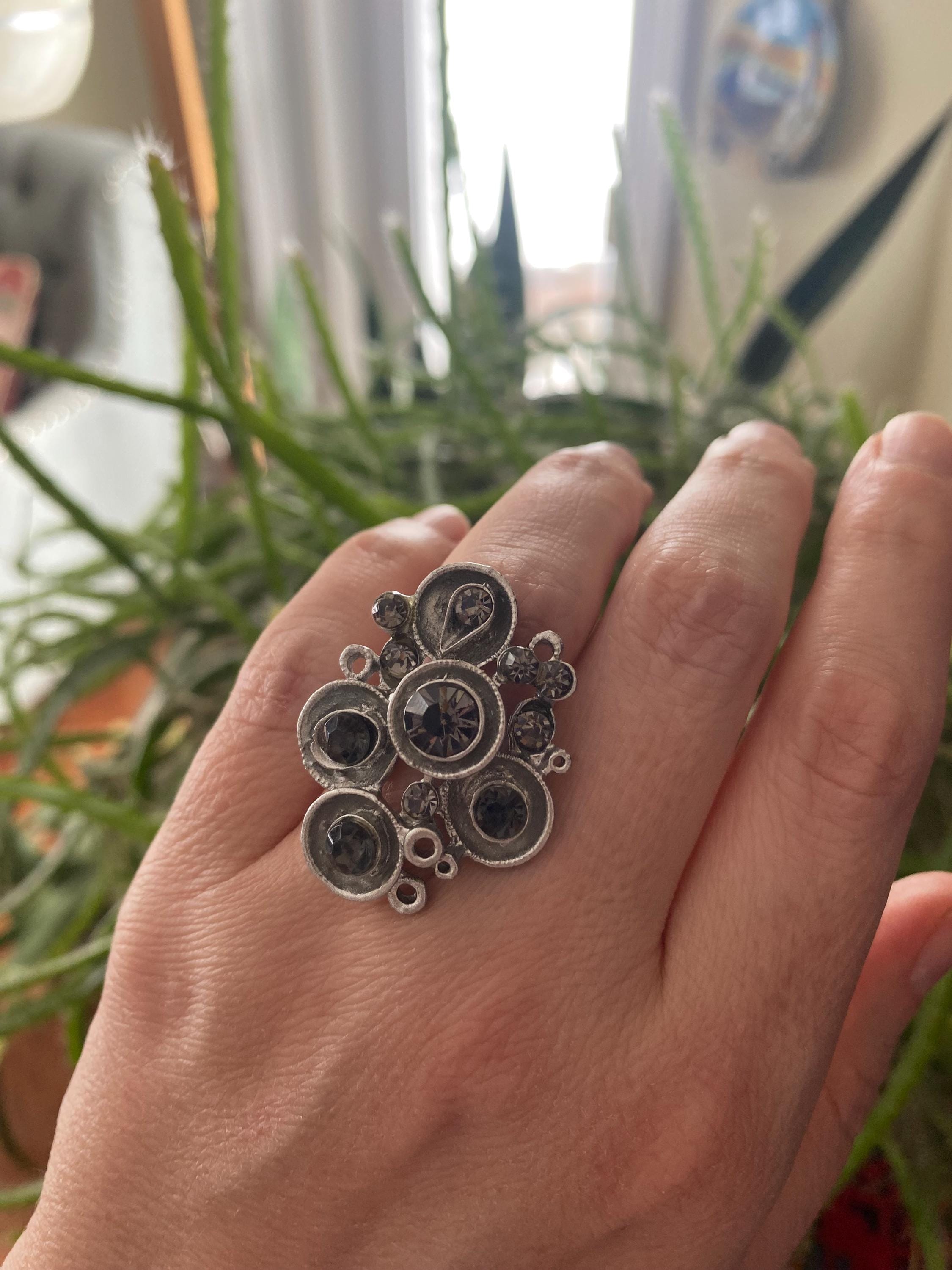 Large with a low profile, comfy to wear! Adjustable ring fit around a size 7 and larger.