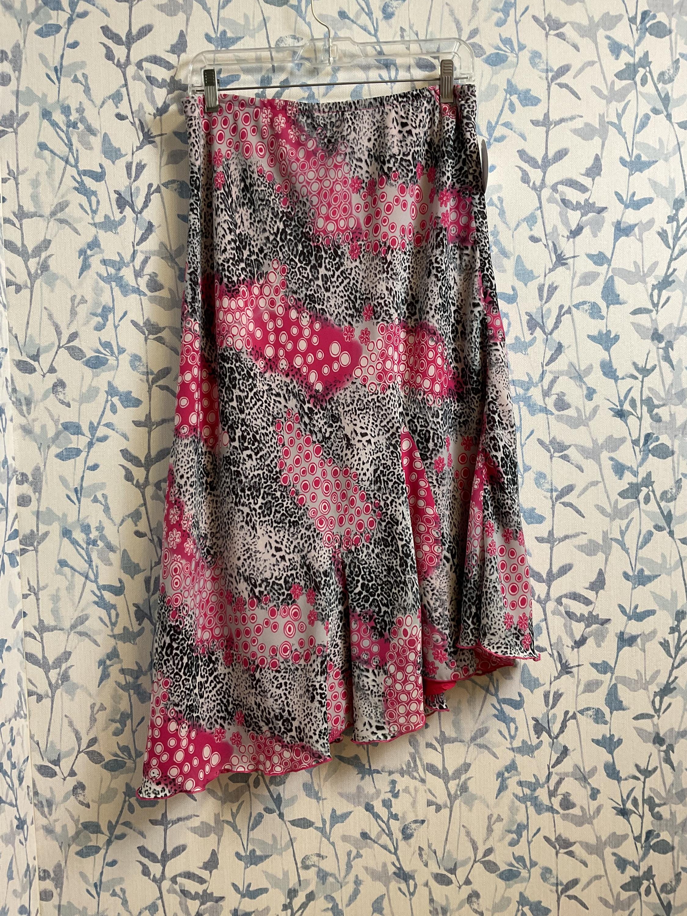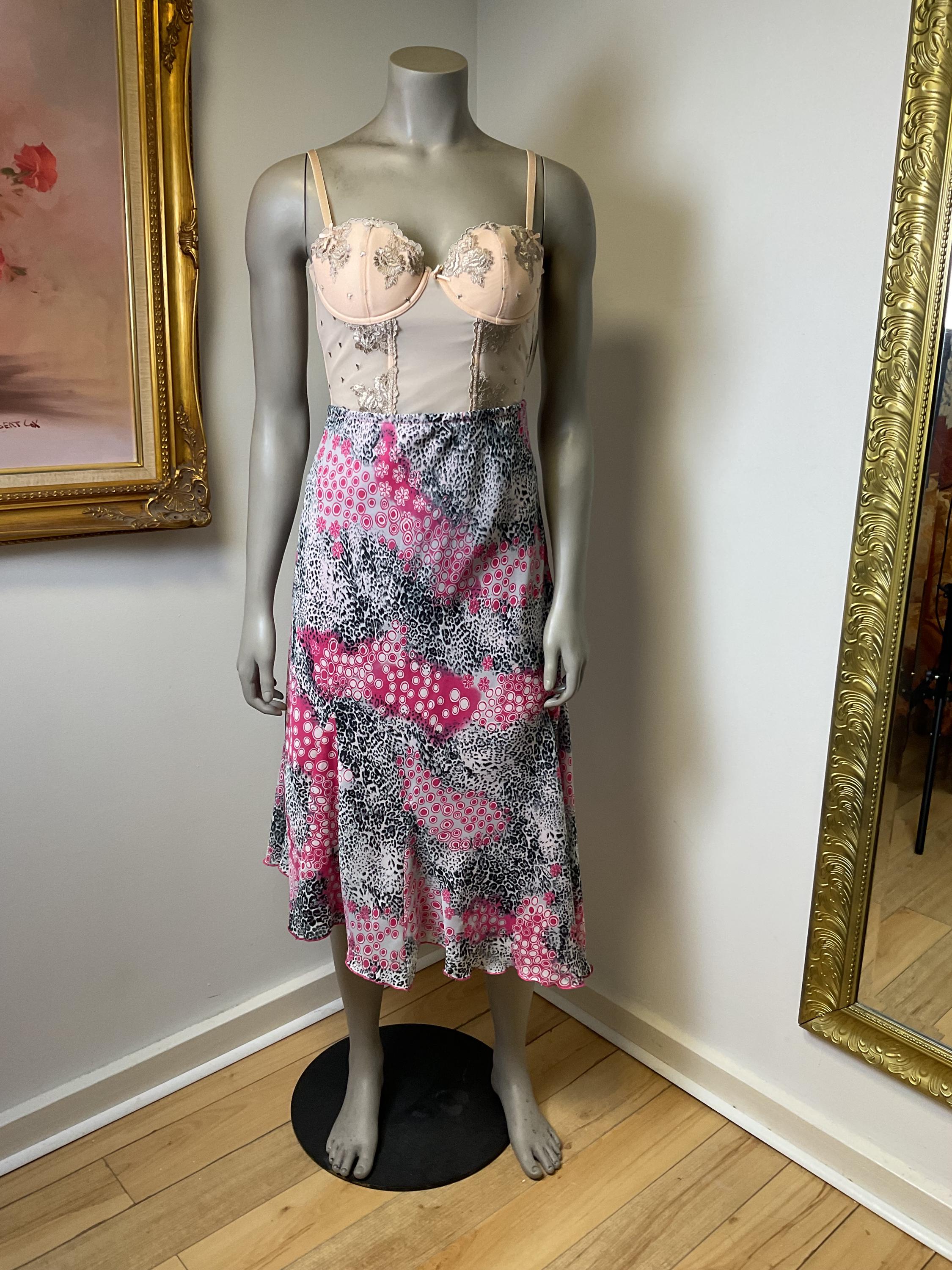 Y2K cute floral skirt, animal print, polka dots, and daisy flower pattern. Lined in hot pink with a handkerchief hem.